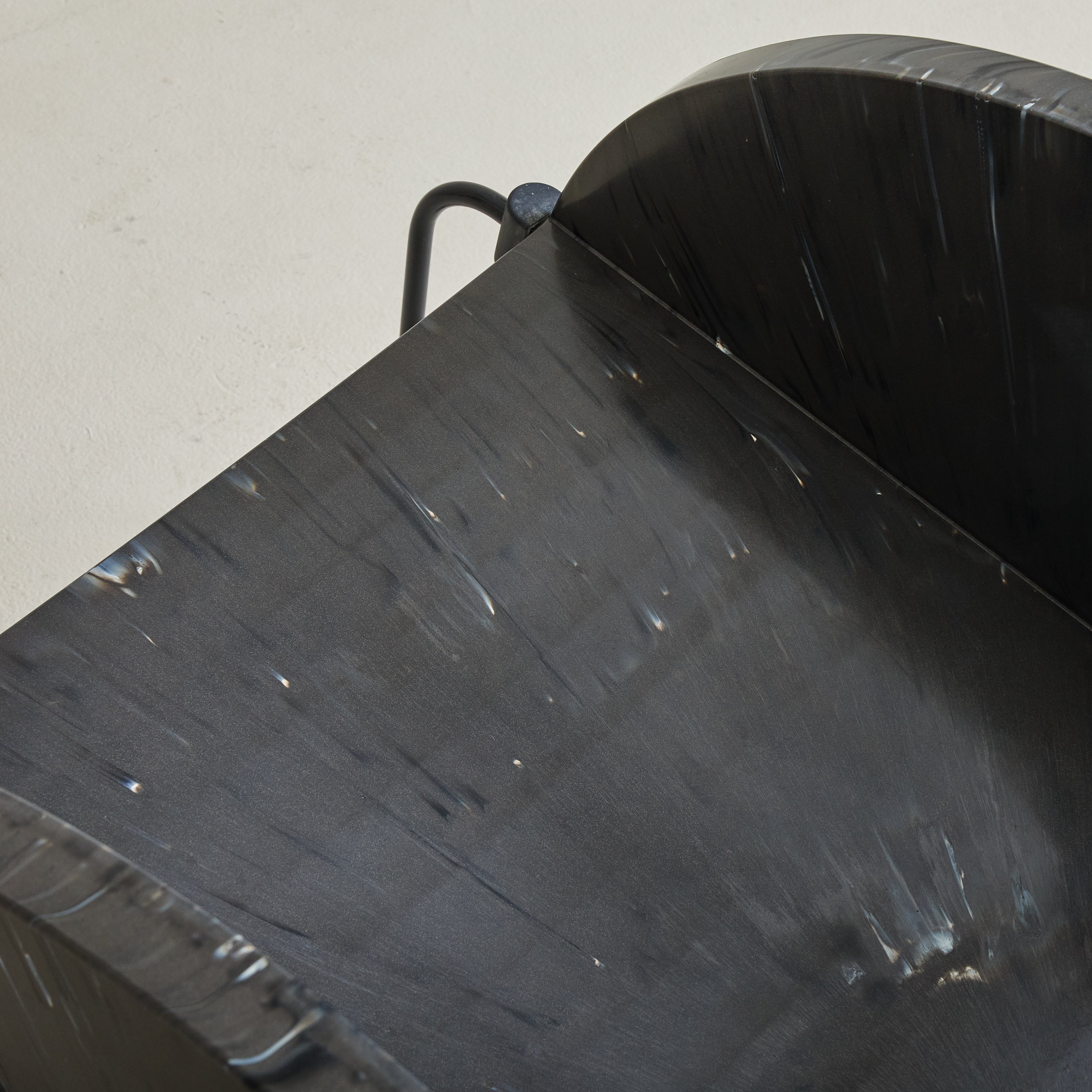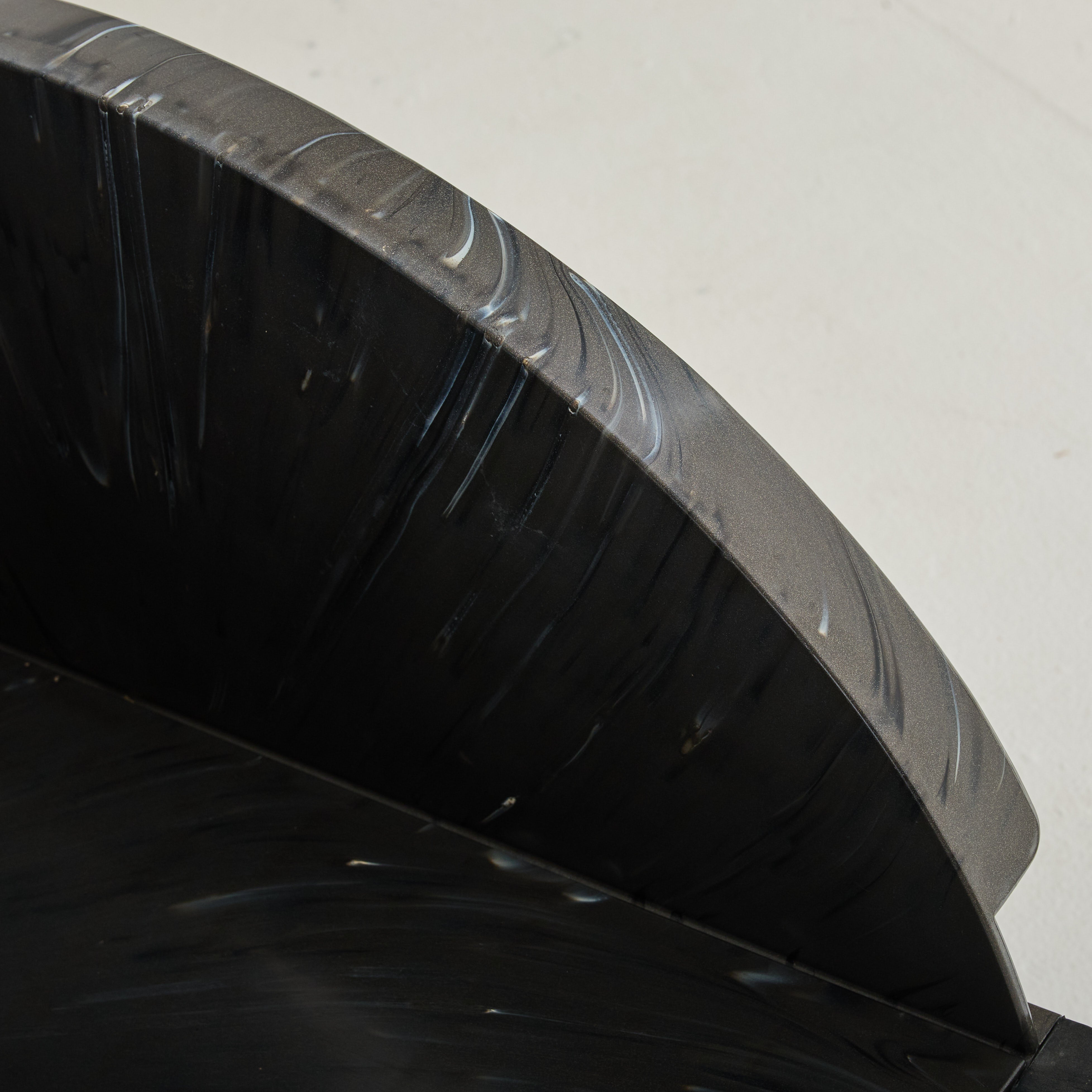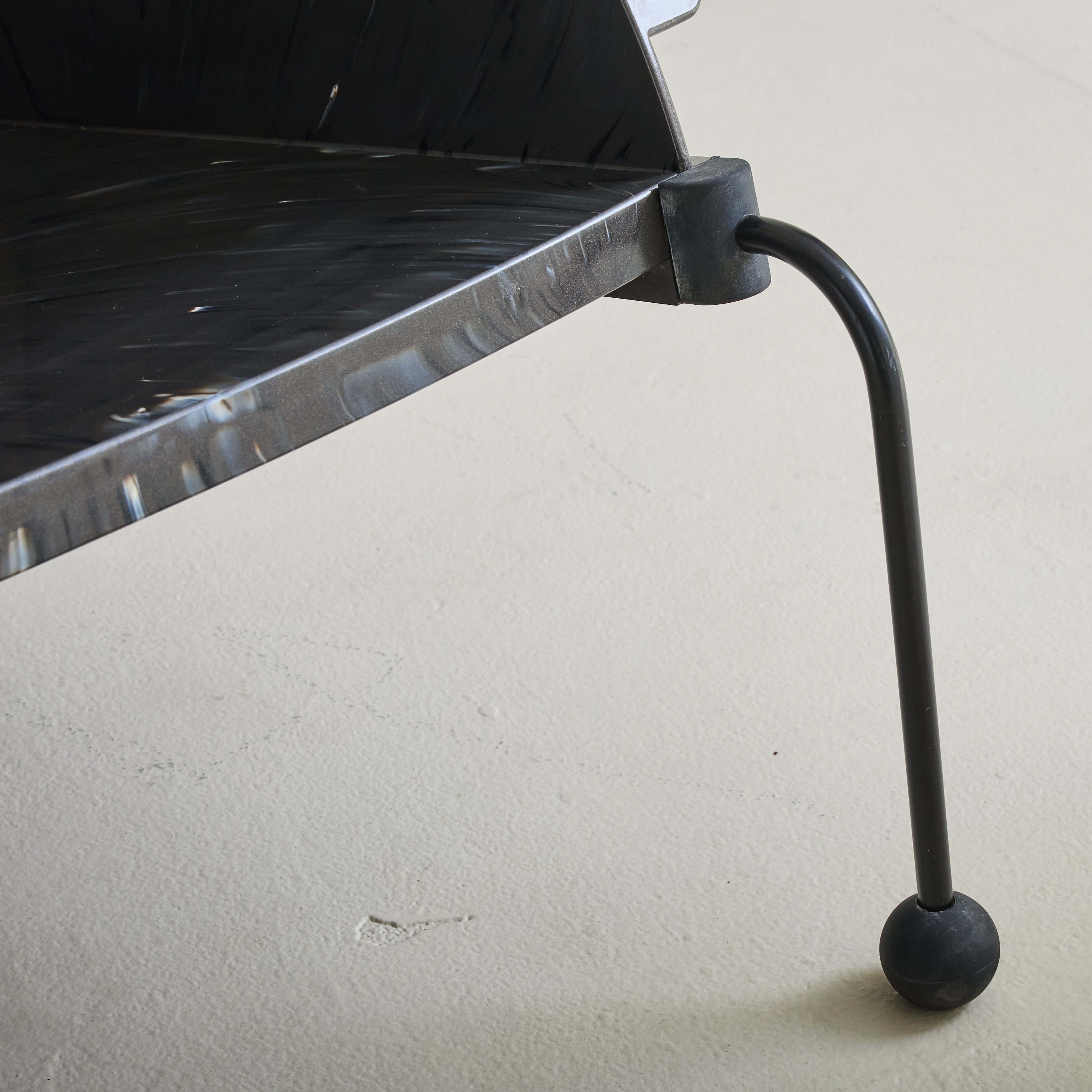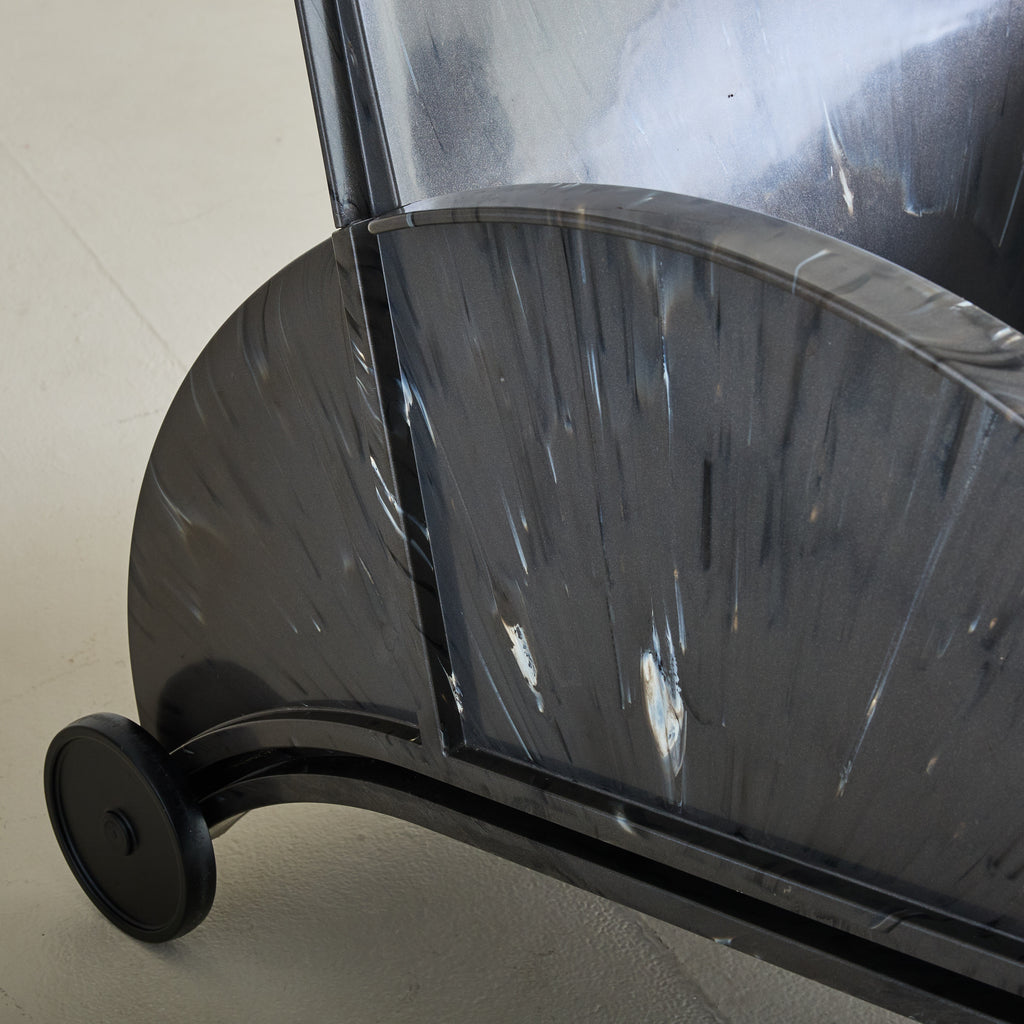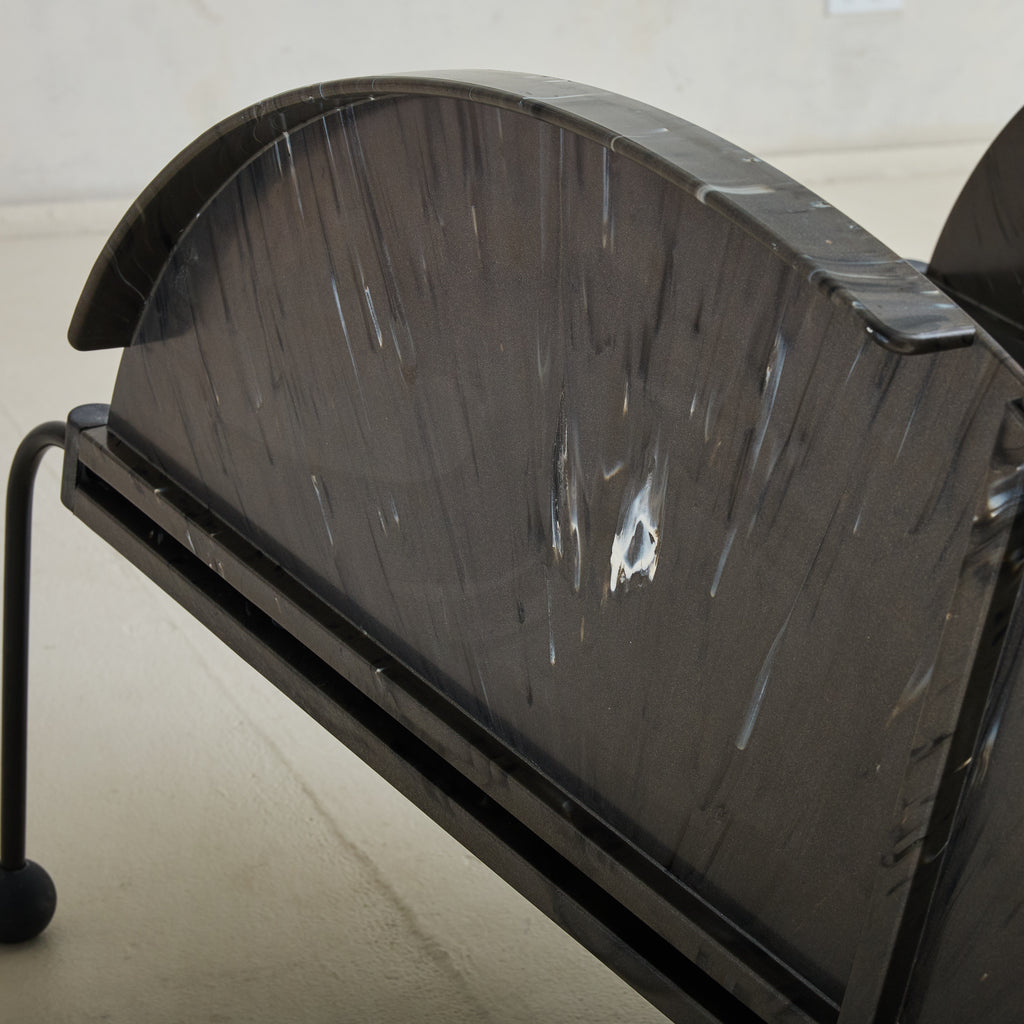 This low-slung lounger, crafted from a blend of recycled plastics, features a black marbled finish that enhances its sleek, modern aesthetic. Its clean-lined silhouette balances simplicity with a sense of ease, while discreet wheels on the back legs provide a thoughtful, functional detail. The 4814 is a study in progressive design, where material and form exist in effortless harmony.