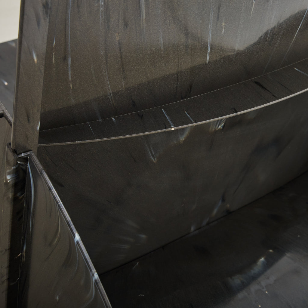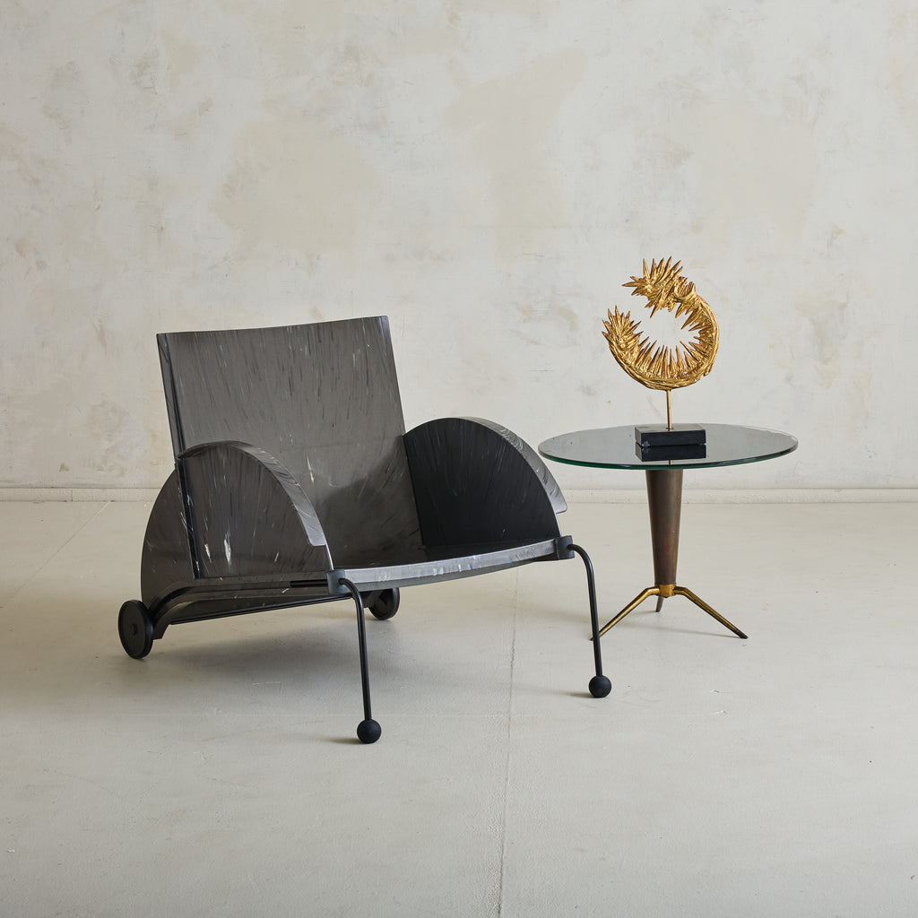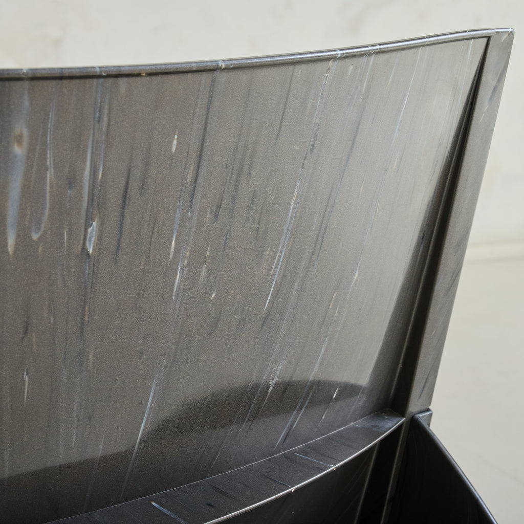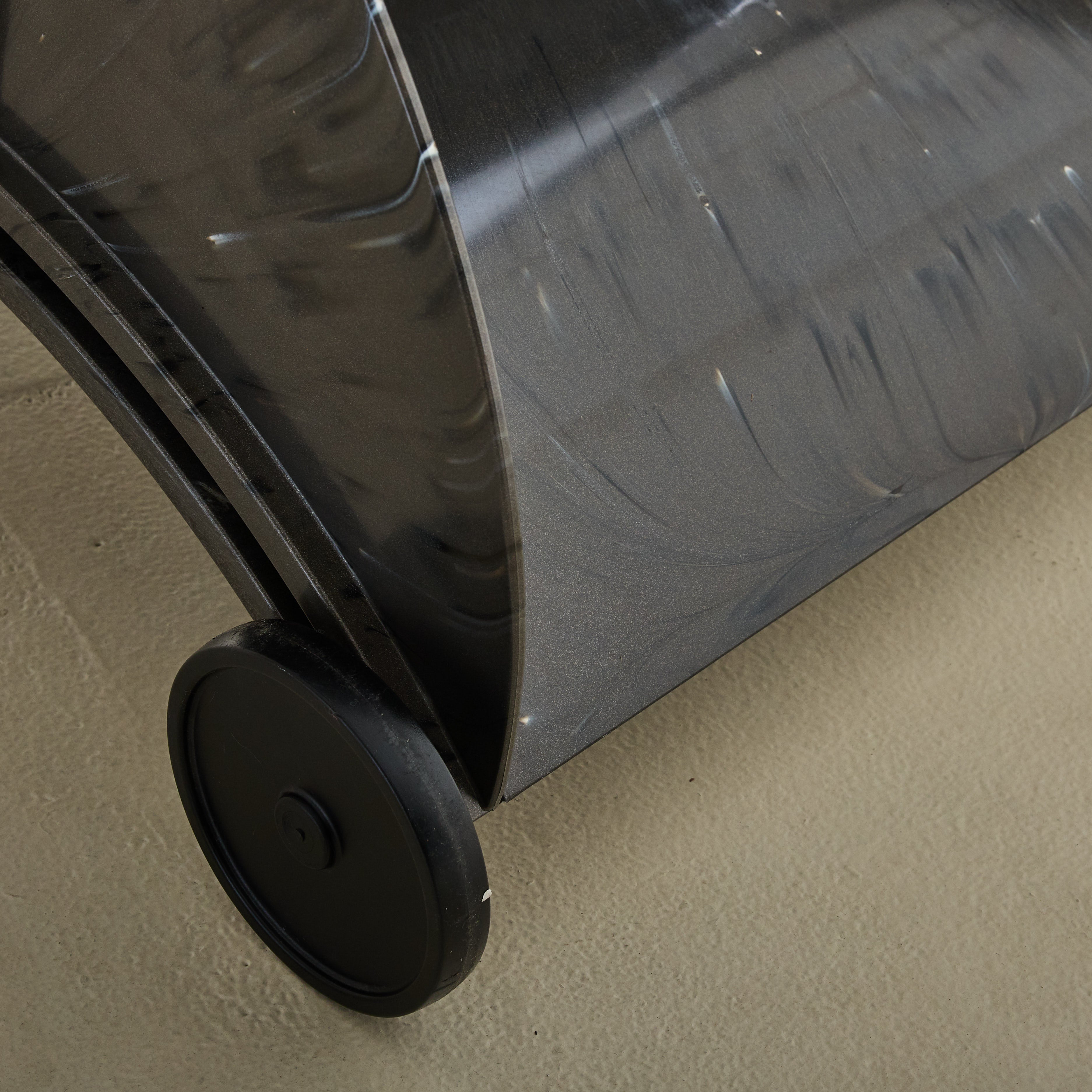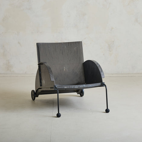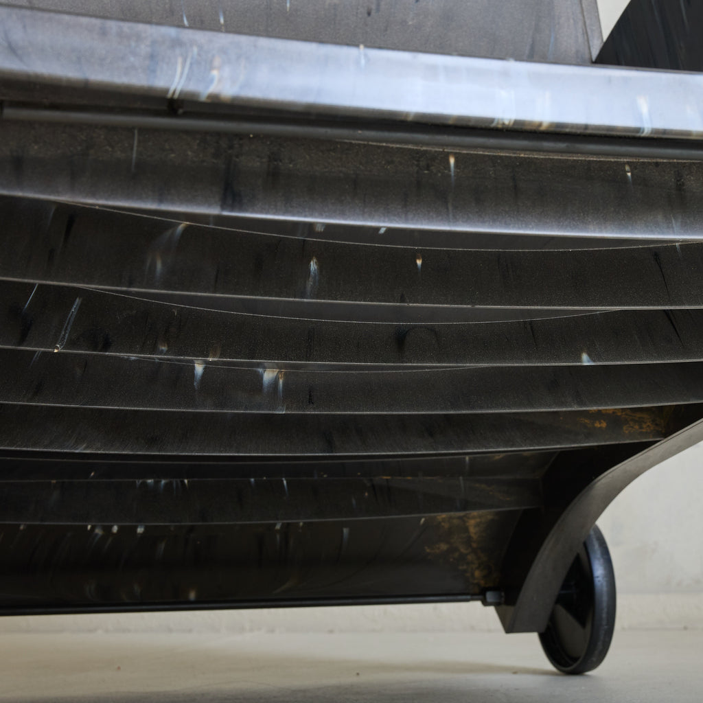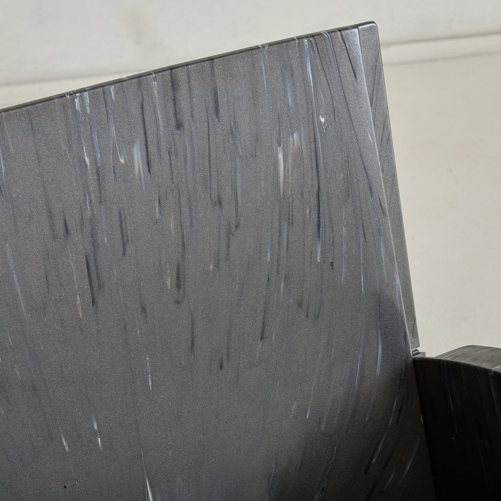 This low-slung lounger, crafted from a blend of recycled plastics, features a black marbled finish that enhances its sleek, modern aesthetic. Its clean-lined silhouette balances simplicity with a sense of ease, while discreet wheels on the back legs provide a thoughtful, functional detail. The 4814 is a study in progressive design, where material and form exist in effortless harmony.