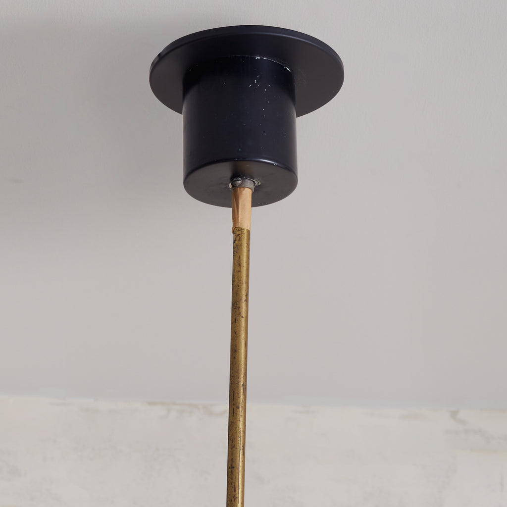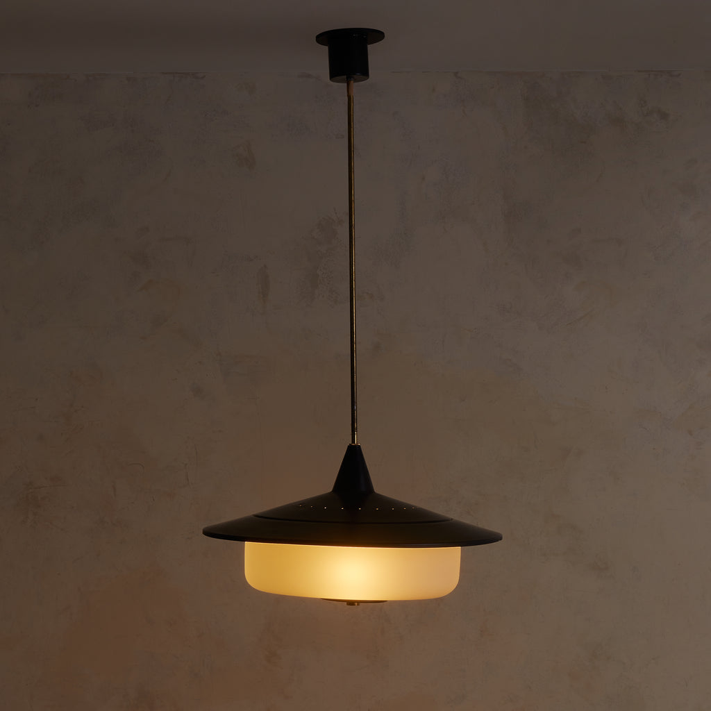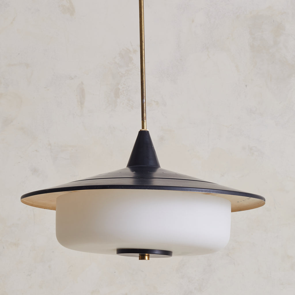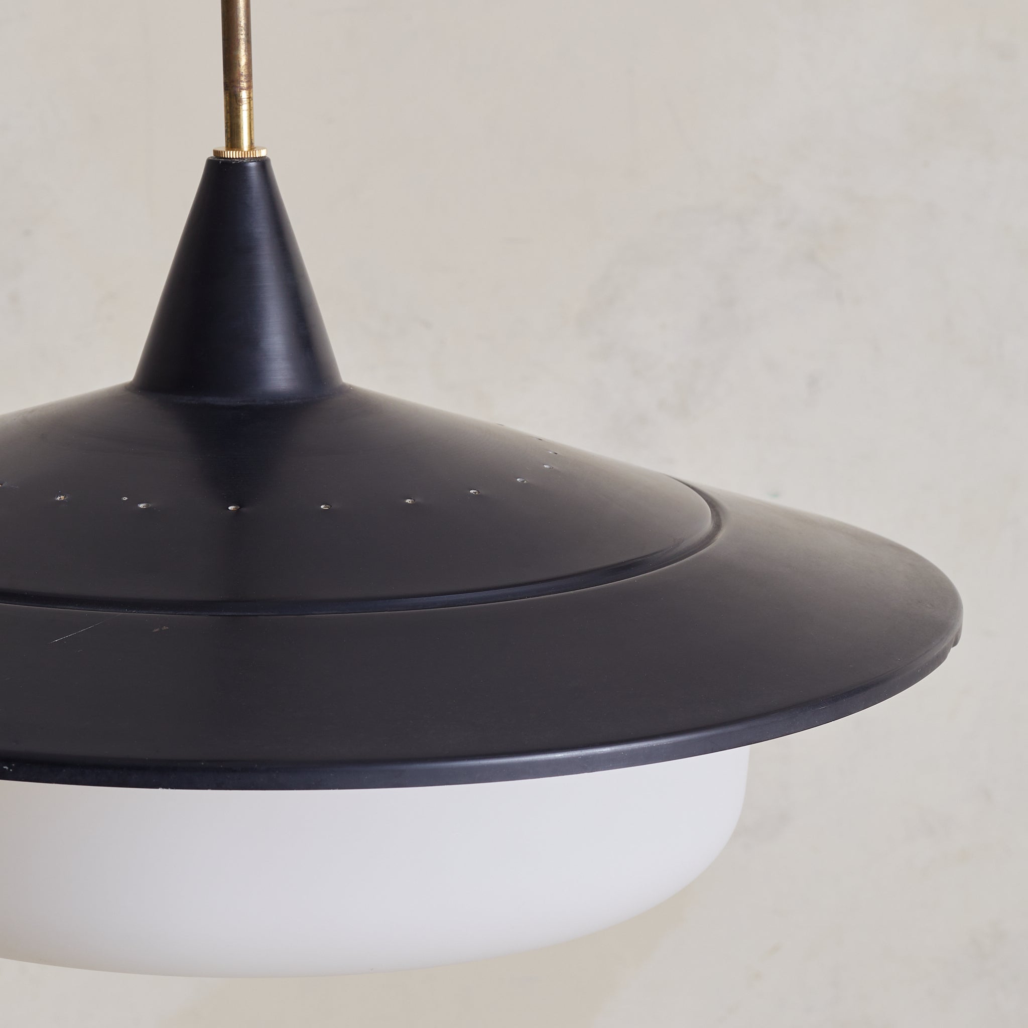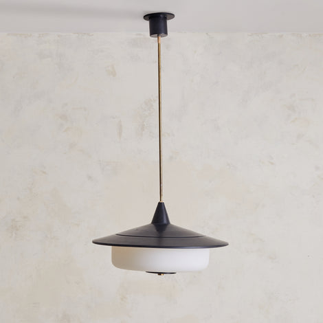 A 1950s Italian pendant light in the style of Stilnovo. This sculptural fixture features a wide, black metal shade with a conical top, paired with a white opaline glass diffuser that casts a soft, ambient glow. Suspended from a brass rod and black ceiling canopy, its sleek form embodies mid-century Italian design.