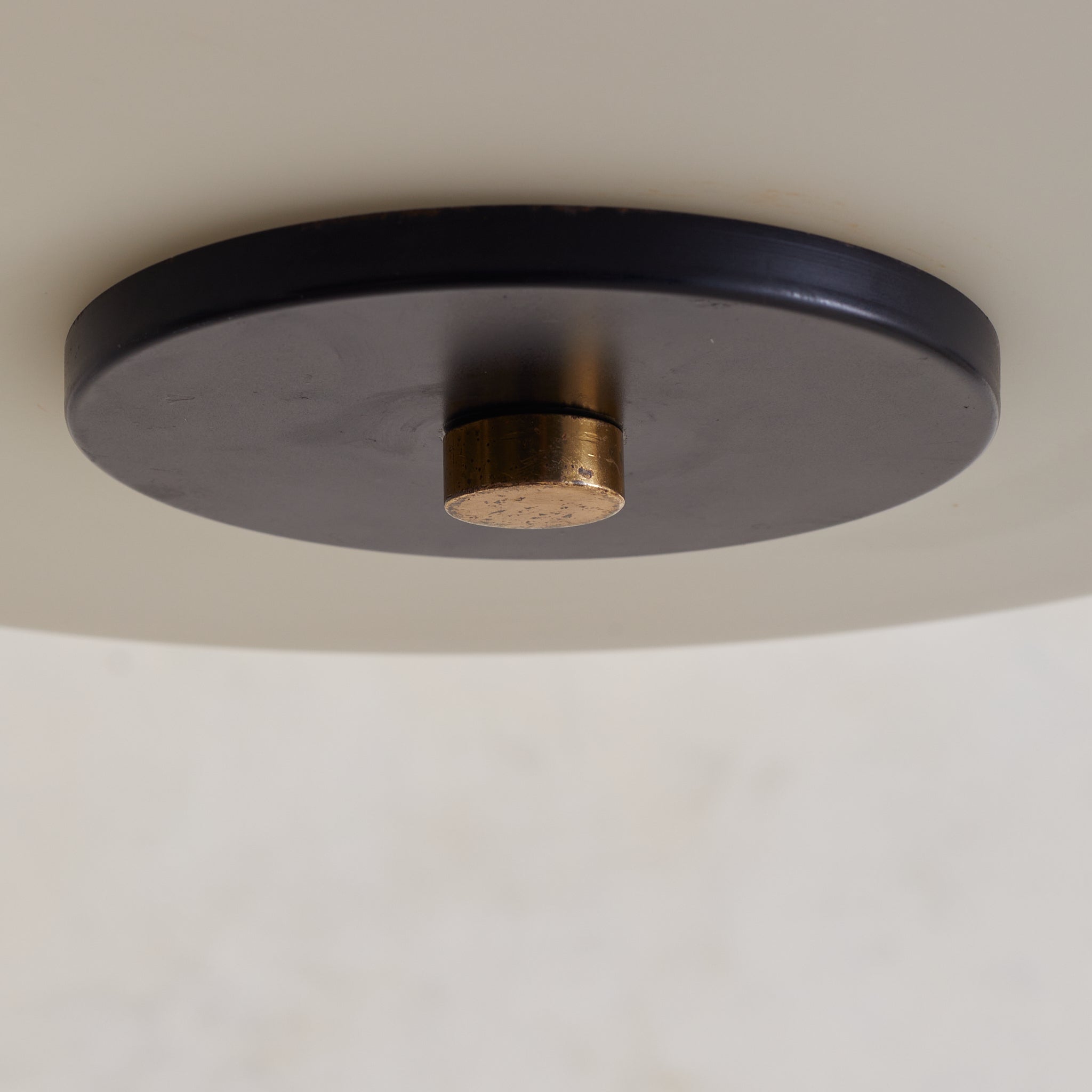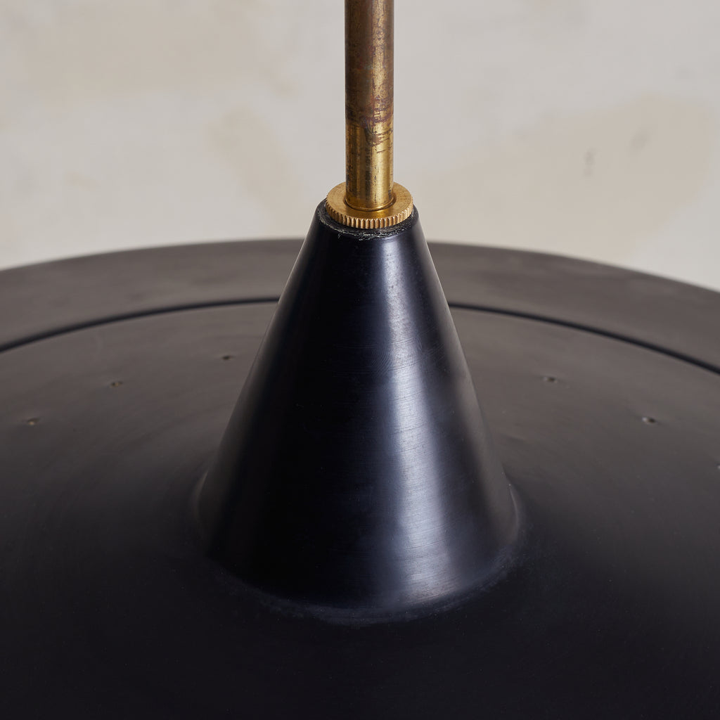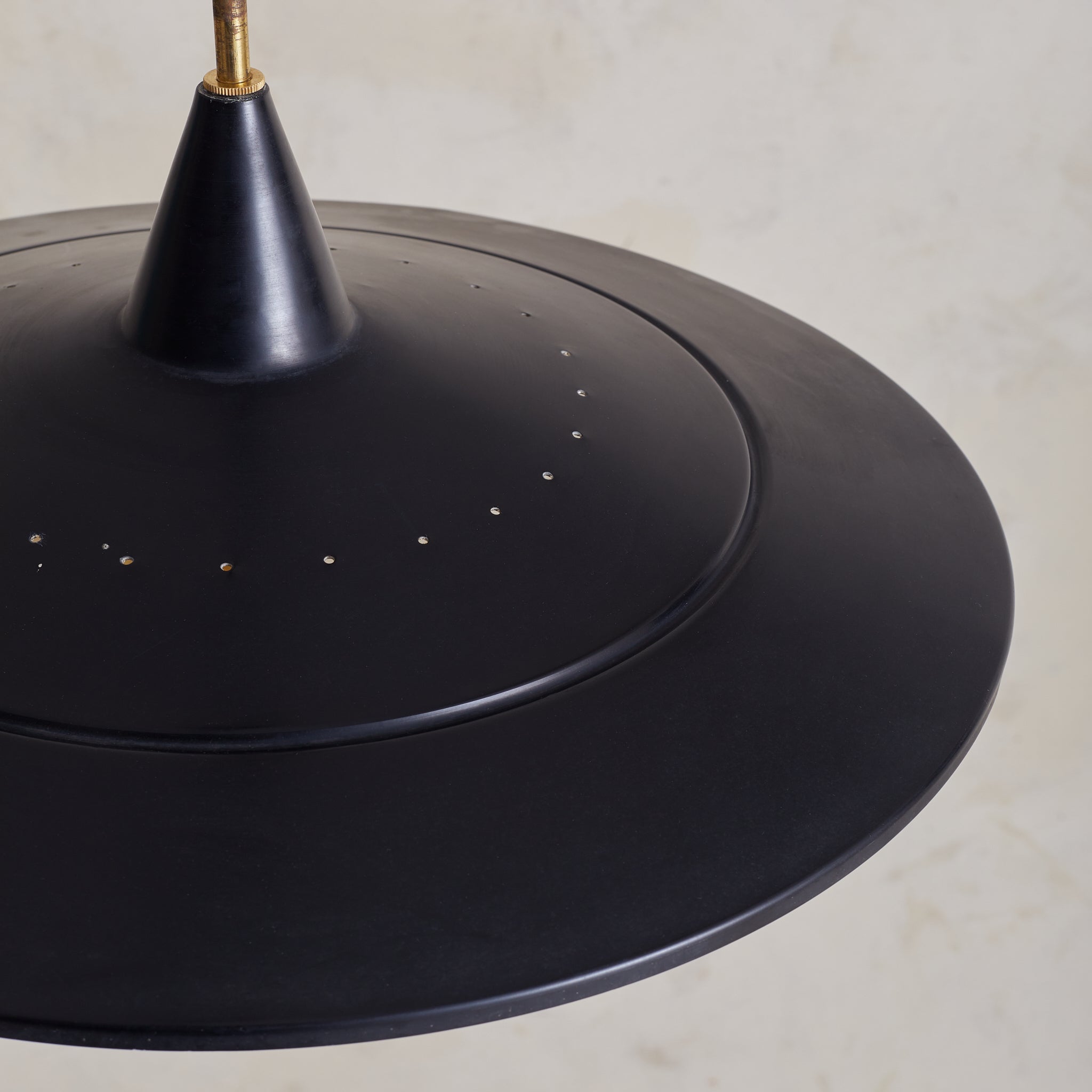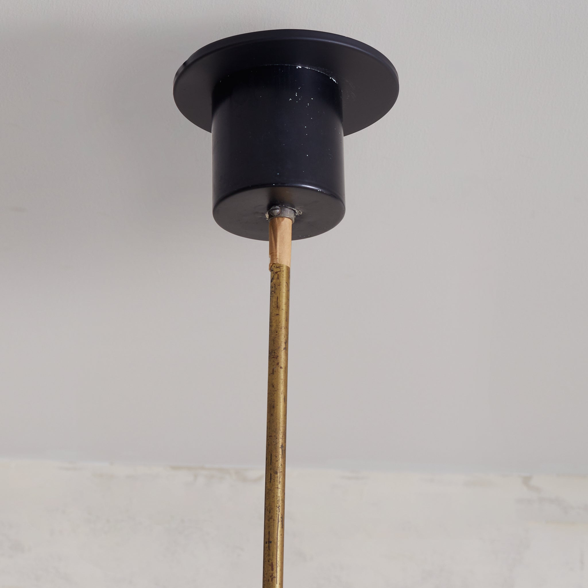 A 1950s Italian pendant light in the style of Stilnovo. This sculptural fixture features a wide, black metal shade with a conical top, paired with a white opaline glass diffuser that casts a soft, ambient glow. Suspended from a brass rod and black ceiling canopy, its sleek form embodies mid-century Italian design.