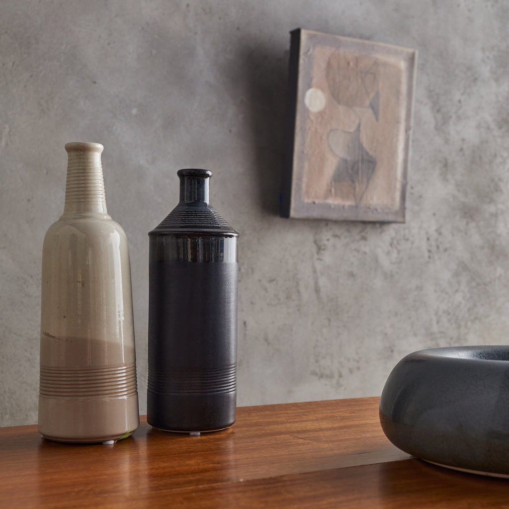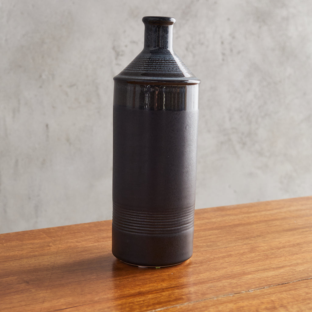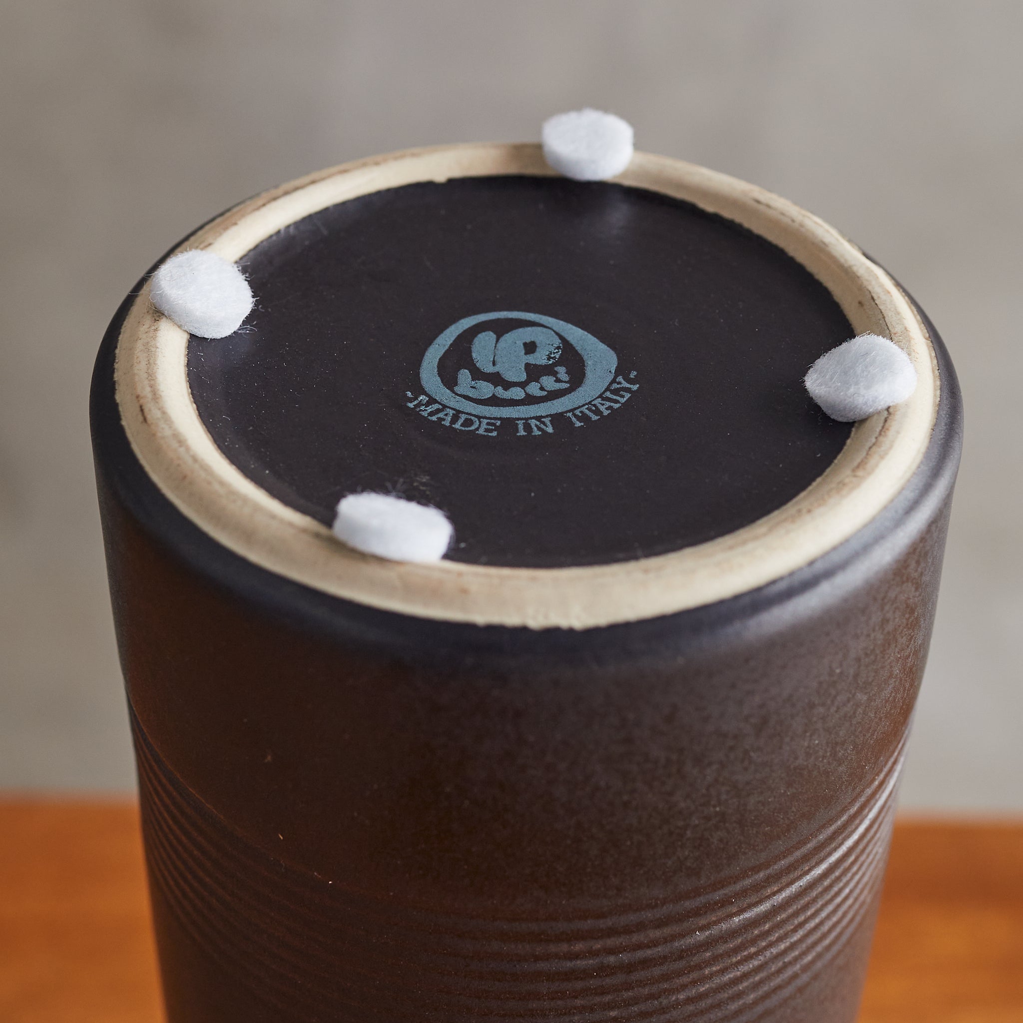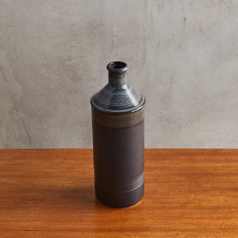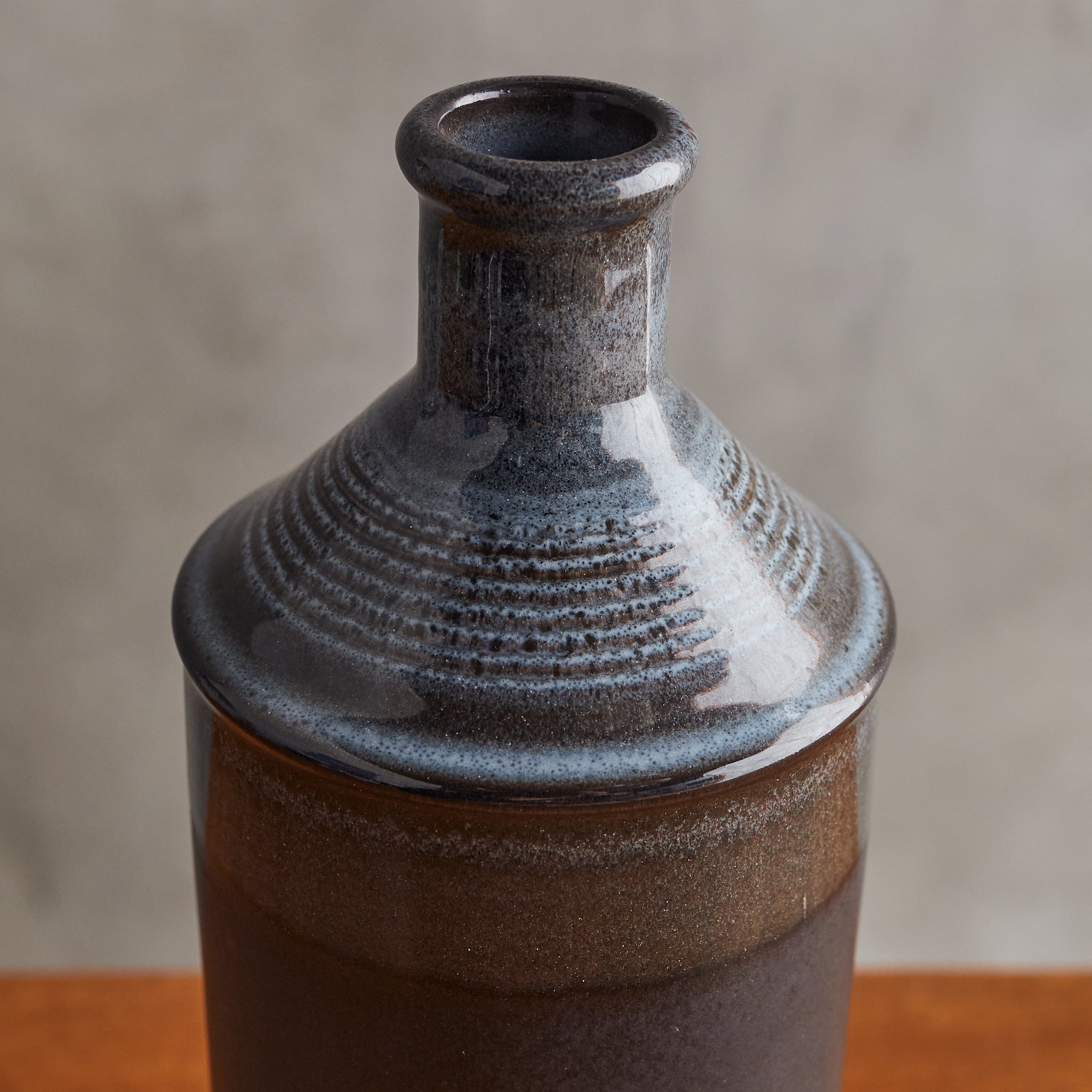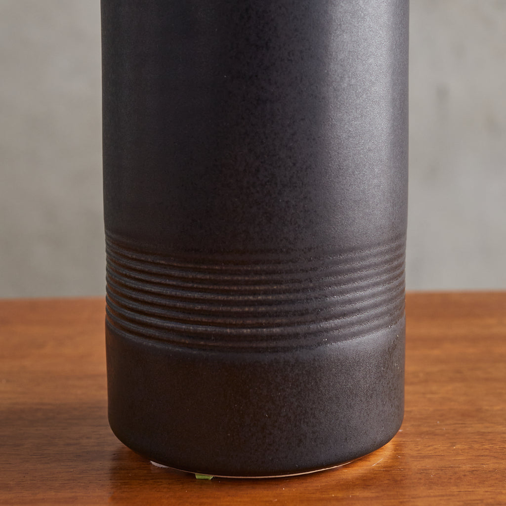 An Italian ceramic vase designed by Franco Bucci for Laboratorio Pesaro in the 1960s. The tall, angular silhouette is accentuated by a rich, velvety black glaze that transitions into a soft, speckled blue at the neck. Subtly ridged detailing complements the base. Signed on the underside.