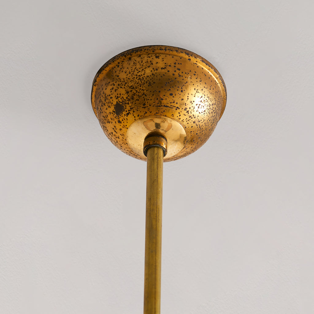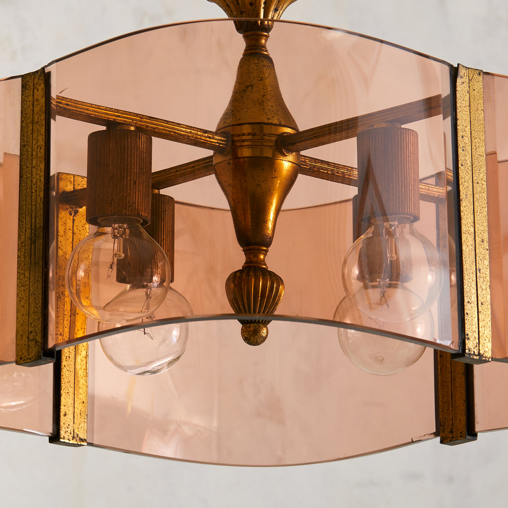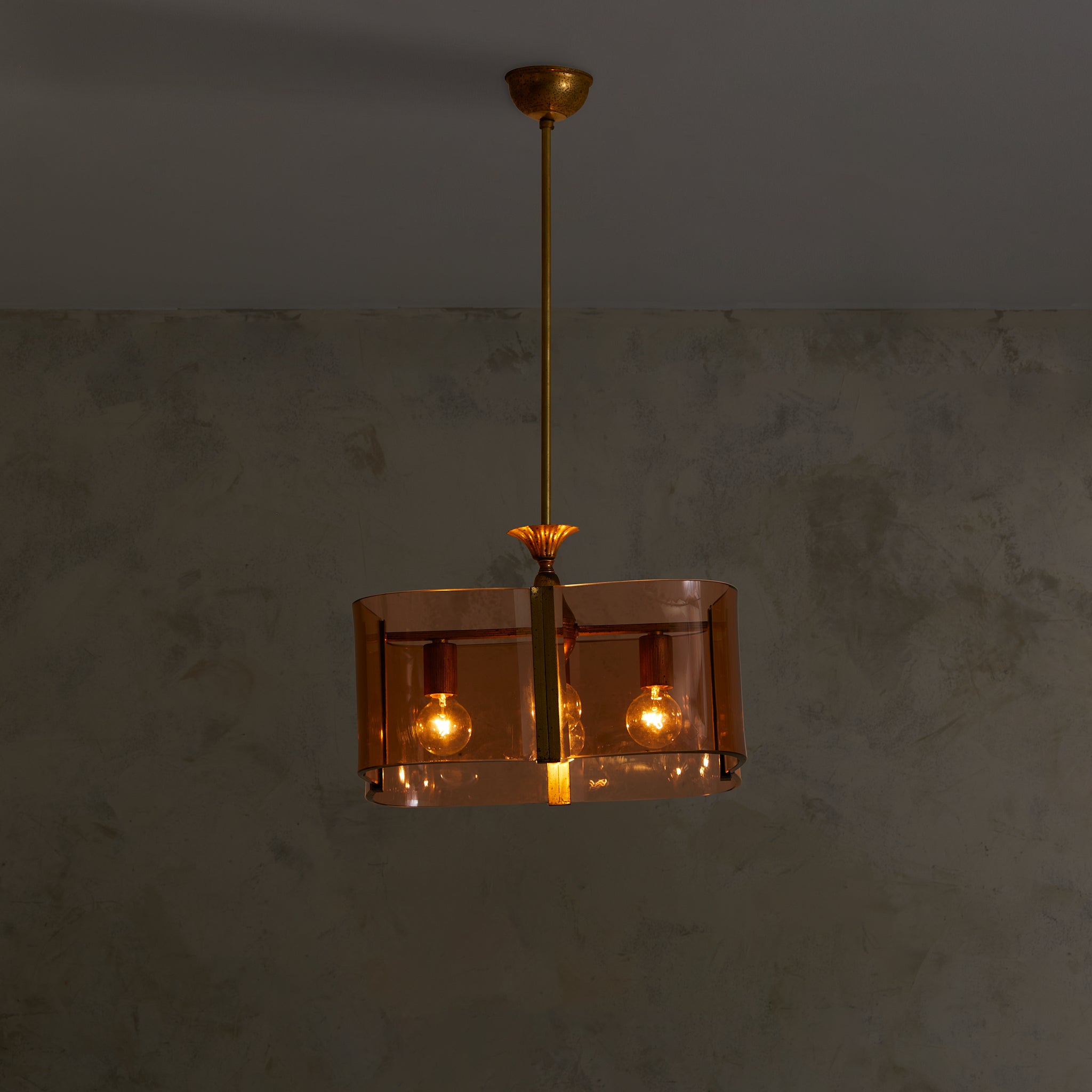 Italian Brass + Curved Amber Smoked Glass Pendant Light, 1970s