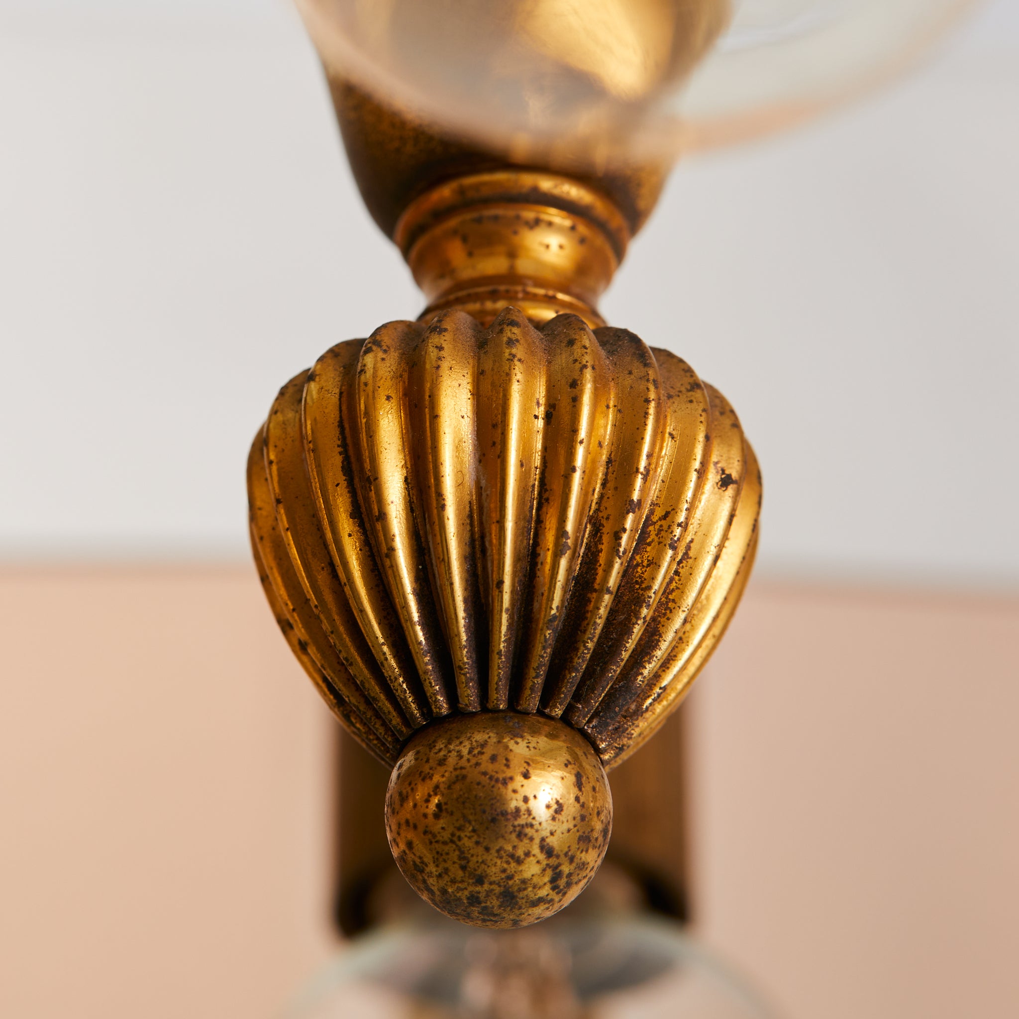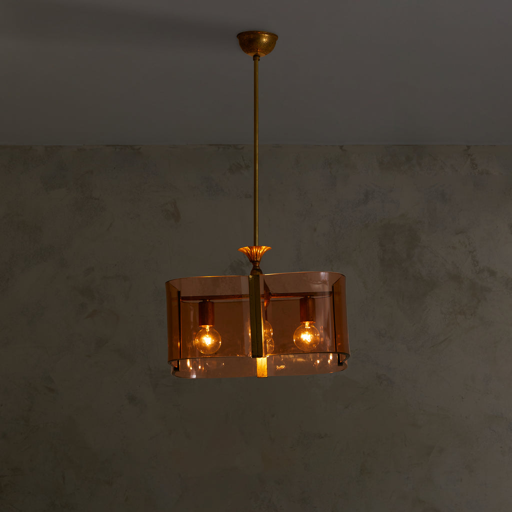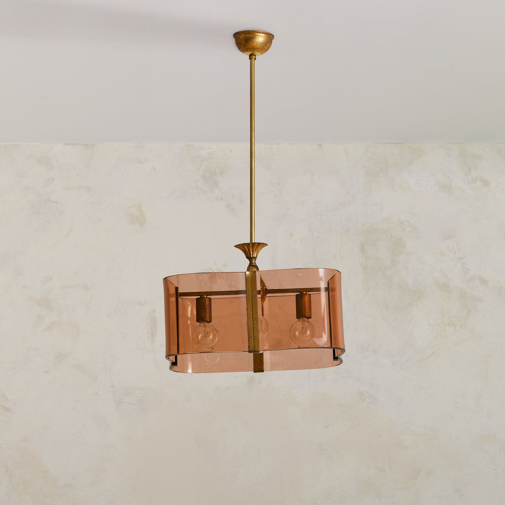 This expressive yet restrained pendant light from 1970s Italy is defined by a band of curved smoked glass encircling a four‑bulb interior. The tinted amber shade is delicately sculpted, its softened rectangular form hovering with architectural elegance. Suspended from its original patinated brass canopy and stem, the fixture strikes a harmonious balance between transparency and structure.
