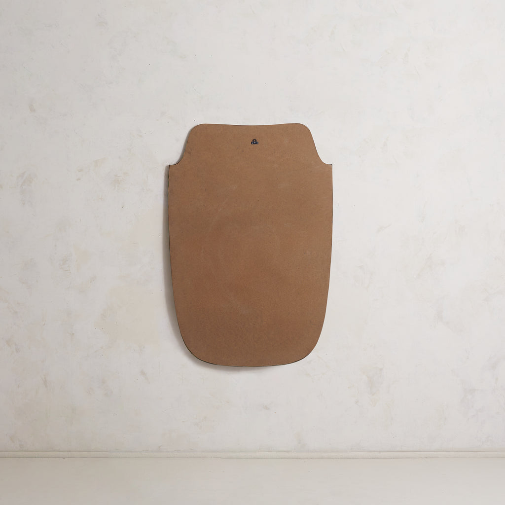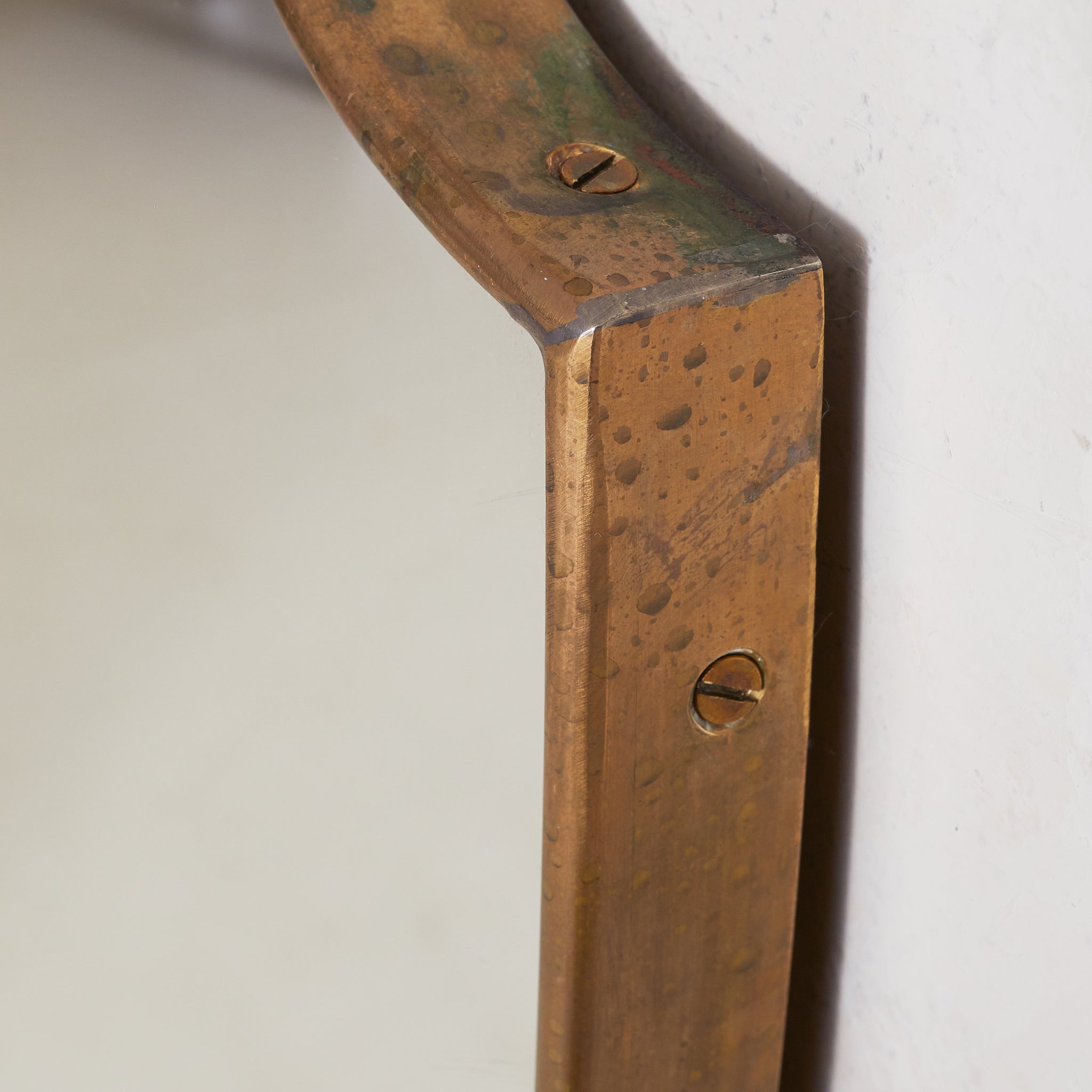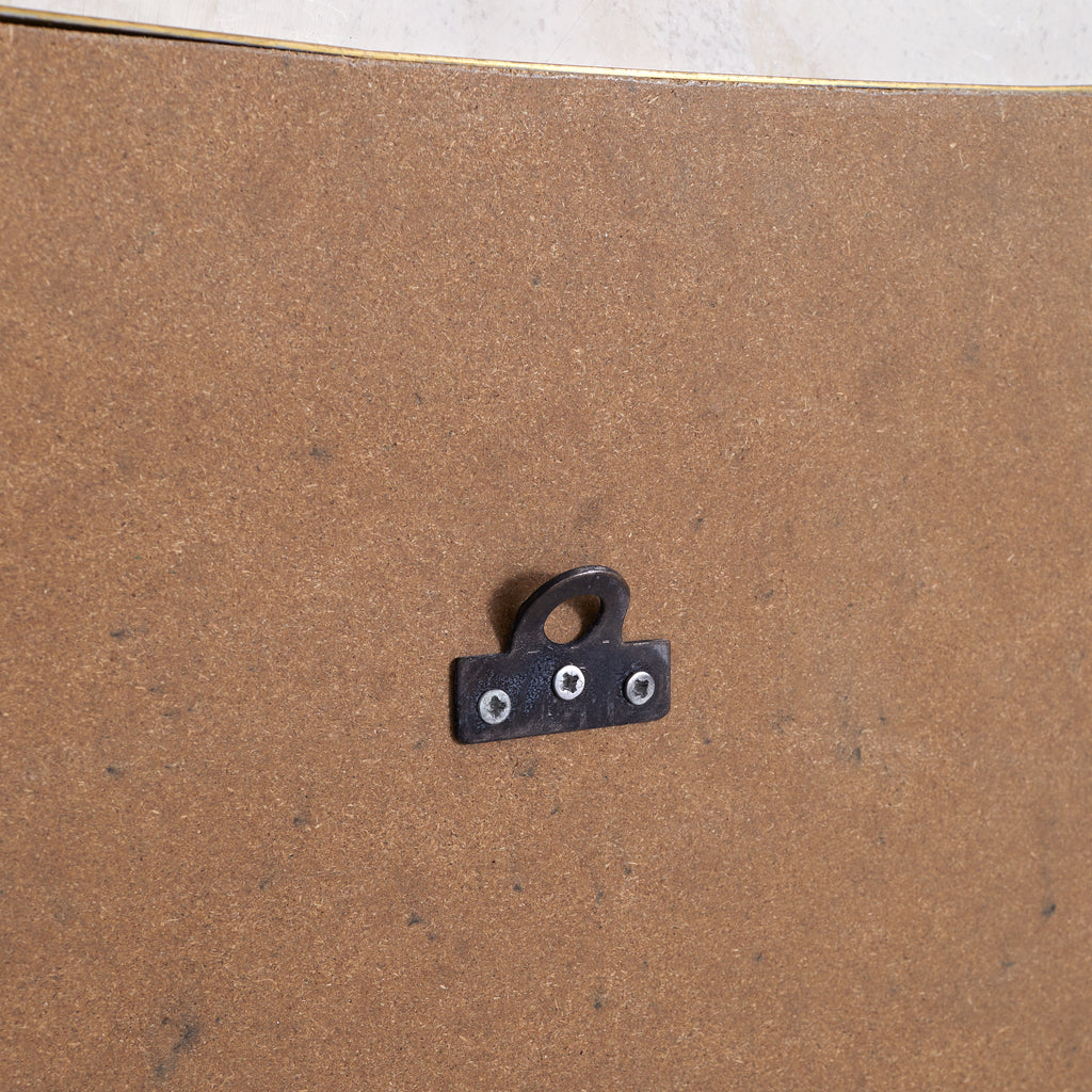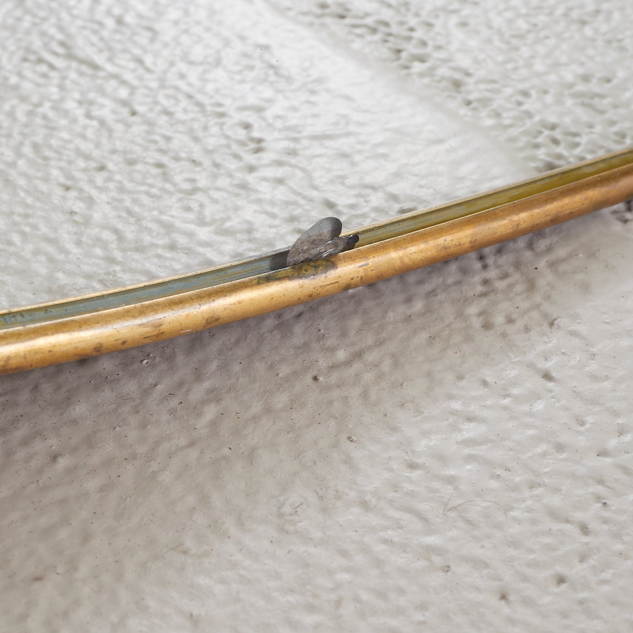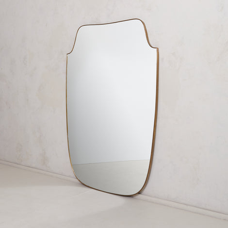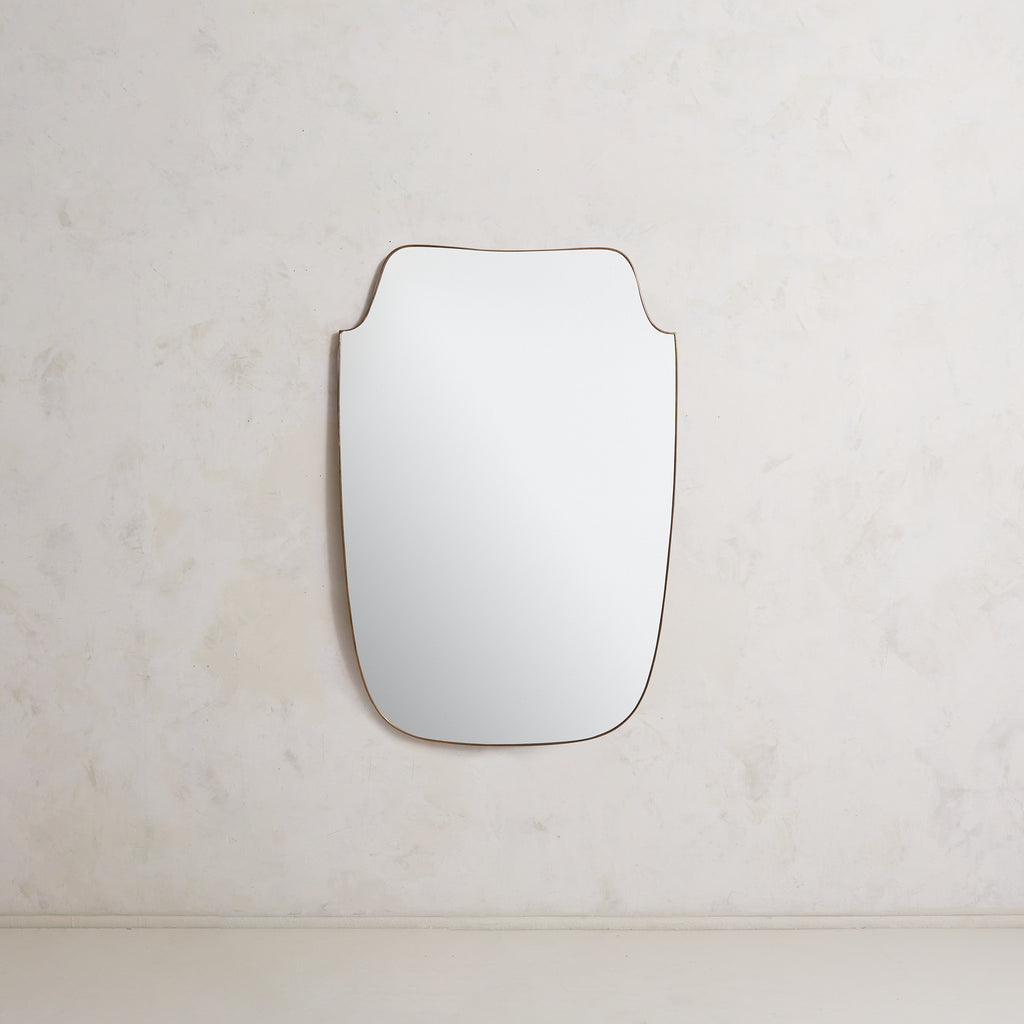A 1970s Italian notched wall mirror featuring elegant curves along the top and a subtly tapered silhouette. This mirror has a delicate brass frame with a beautiful aged patina. A wooden backing supports the mirror, and hardware for hanging is present on the backside.