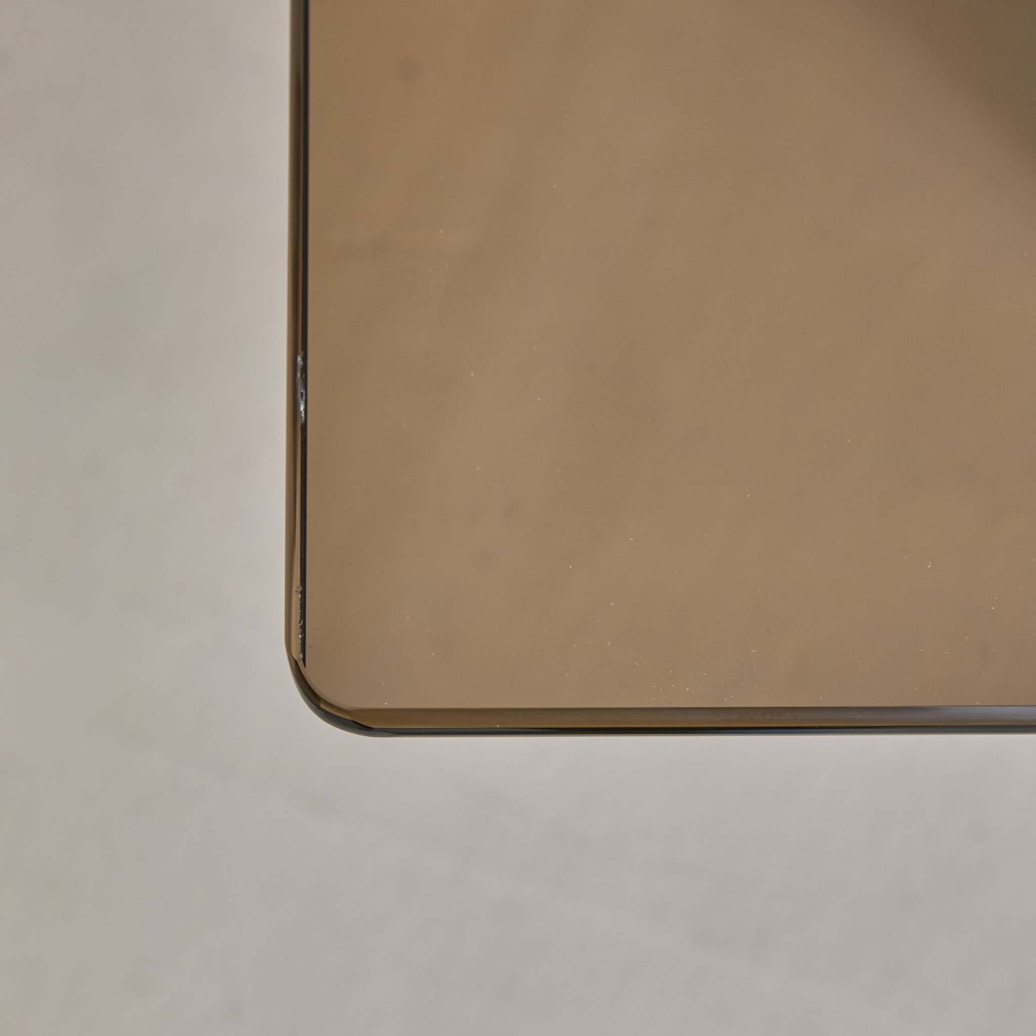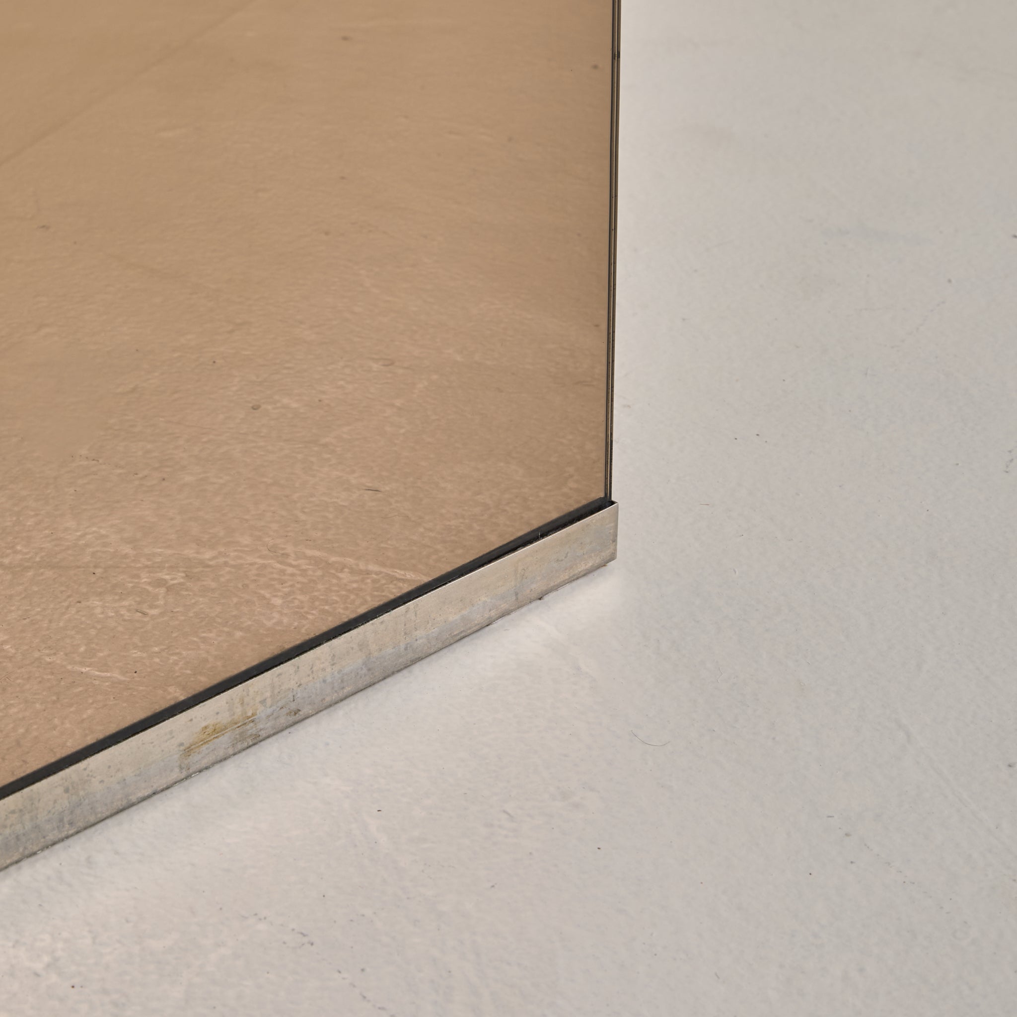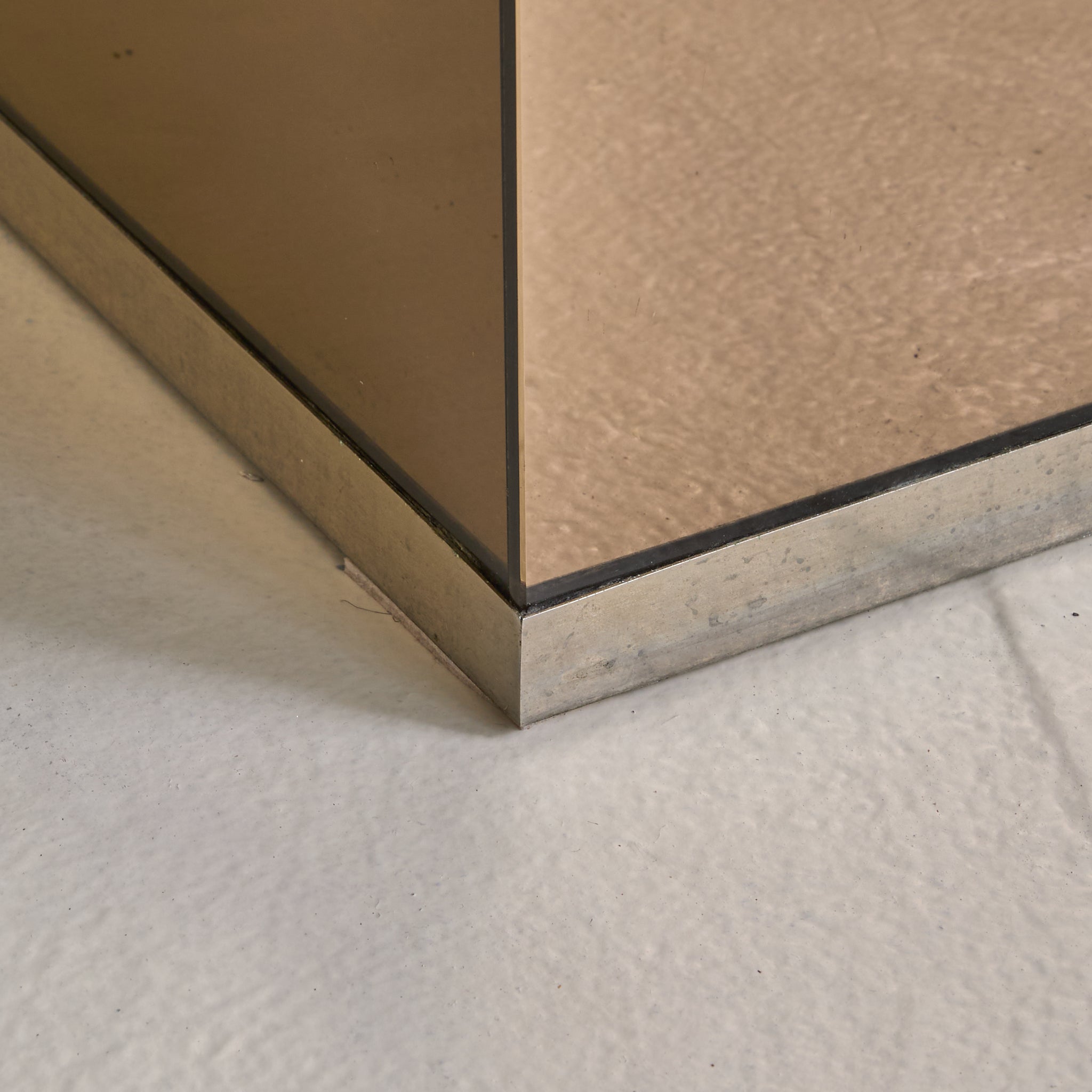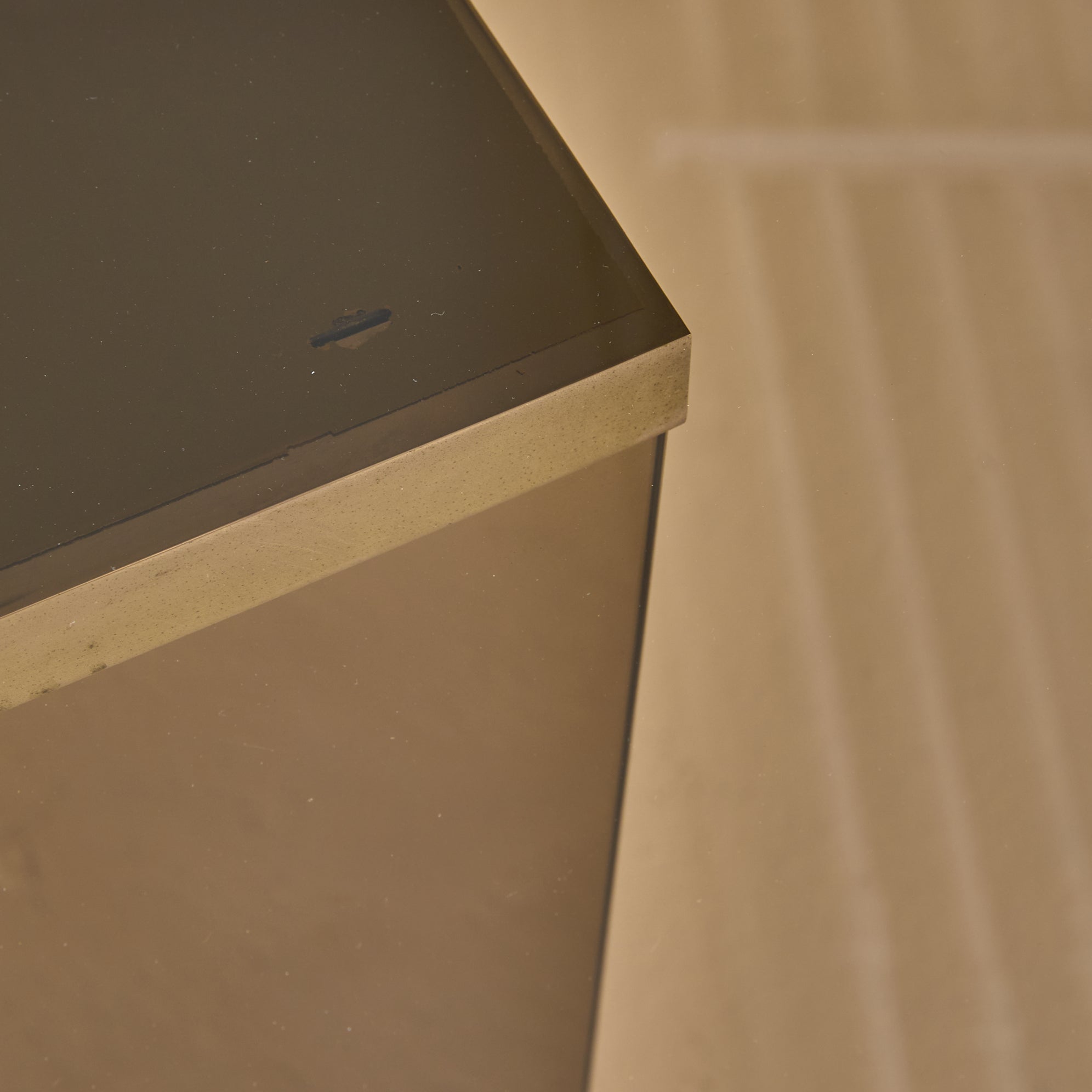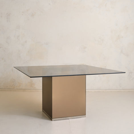An Italian mirror and glass dining table attributed to Gavina, designed in 1975. A thick rectangular glass top, with subtly rounded edges, rests just above a mirrored pedestal base, its proportions measured and grounded. The pedestal is clad in bronze-toned mirrored panels, softly reflective with a subtle haze that bends light and shadow.