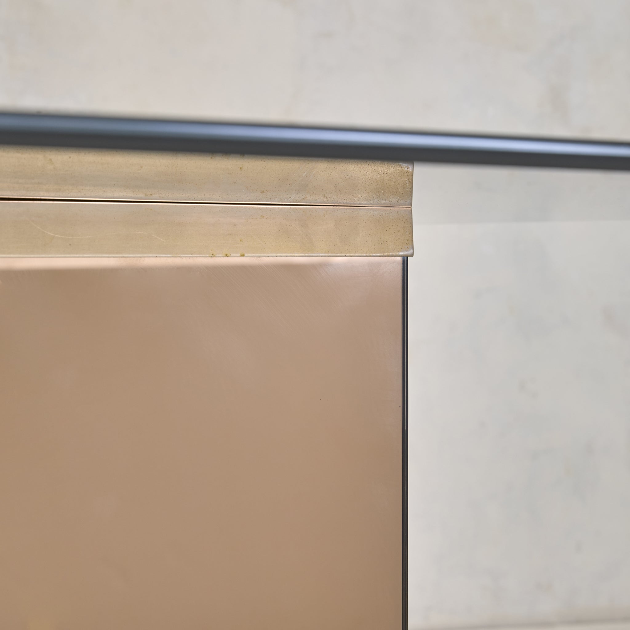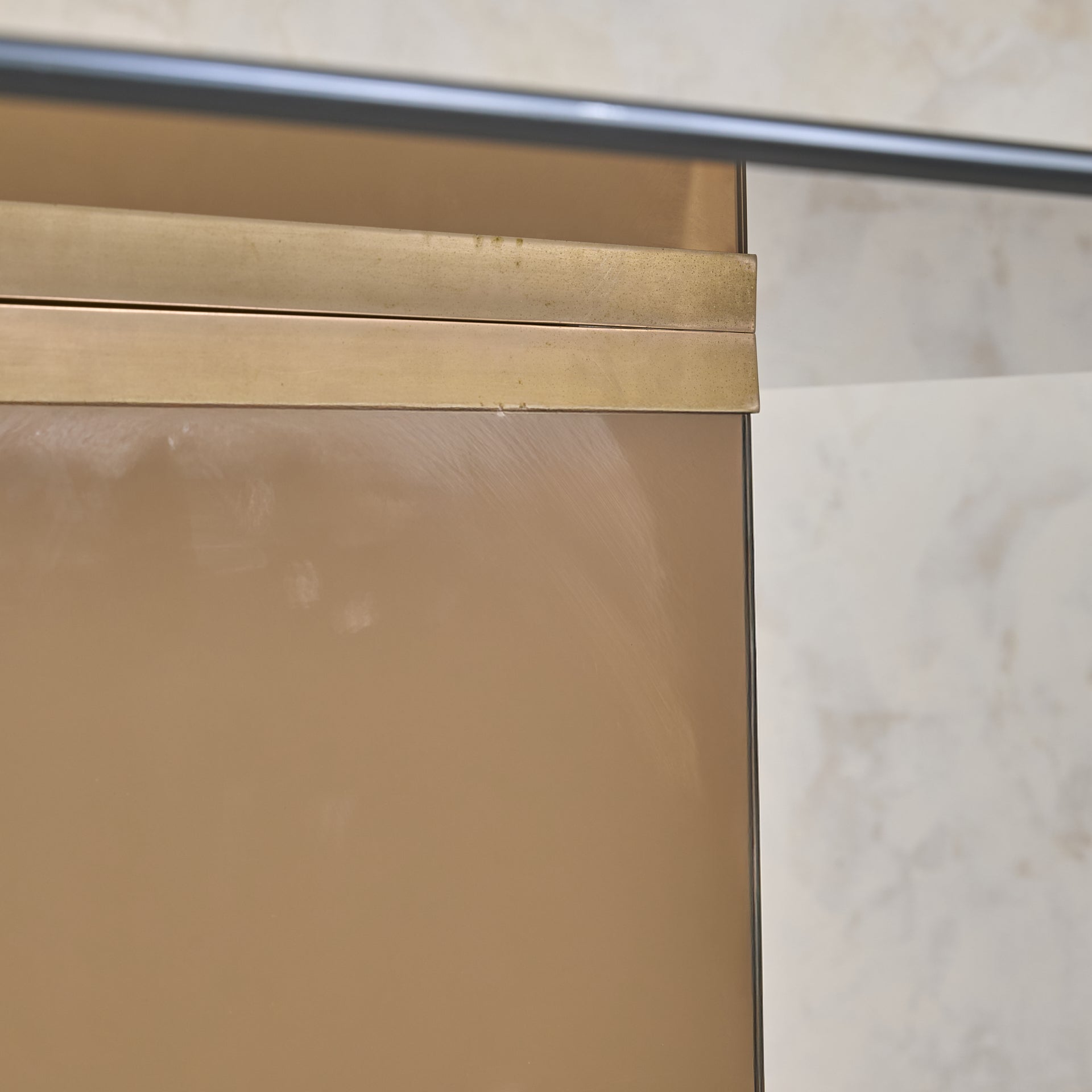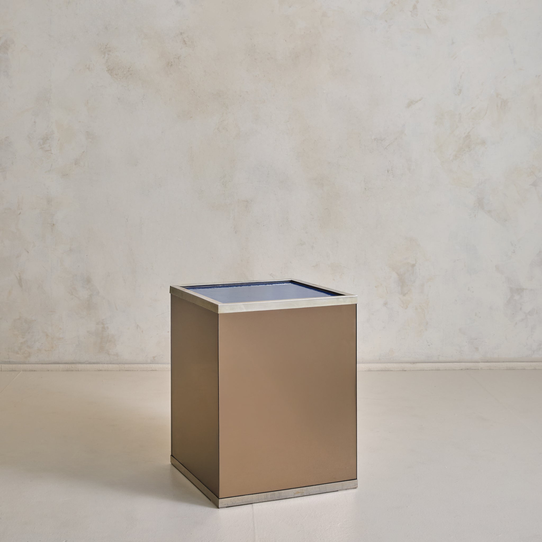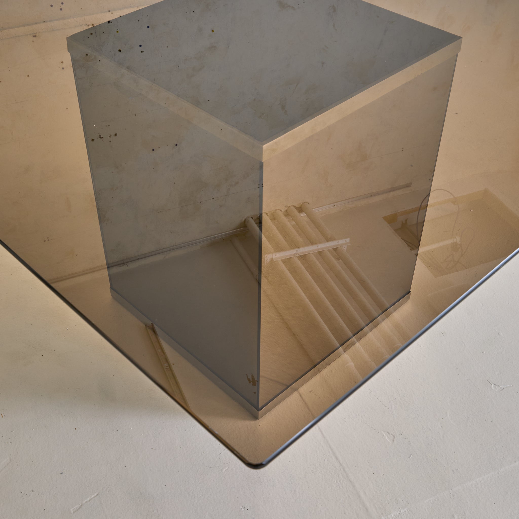 An Italian mirror and glass dining table attributed to Gavina, designed in 1975. A thick rectangular glass top, with subtly rounded edges, rests just above a mirrored pedestal base, its proportions measured and grounded. The pedestal is clad in bronze-toned mirrored panels, softly reflective with a subtle haze that bends light and shadow.