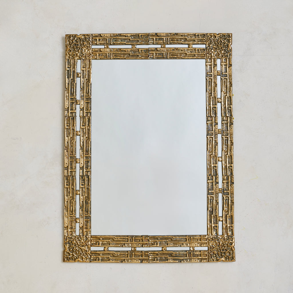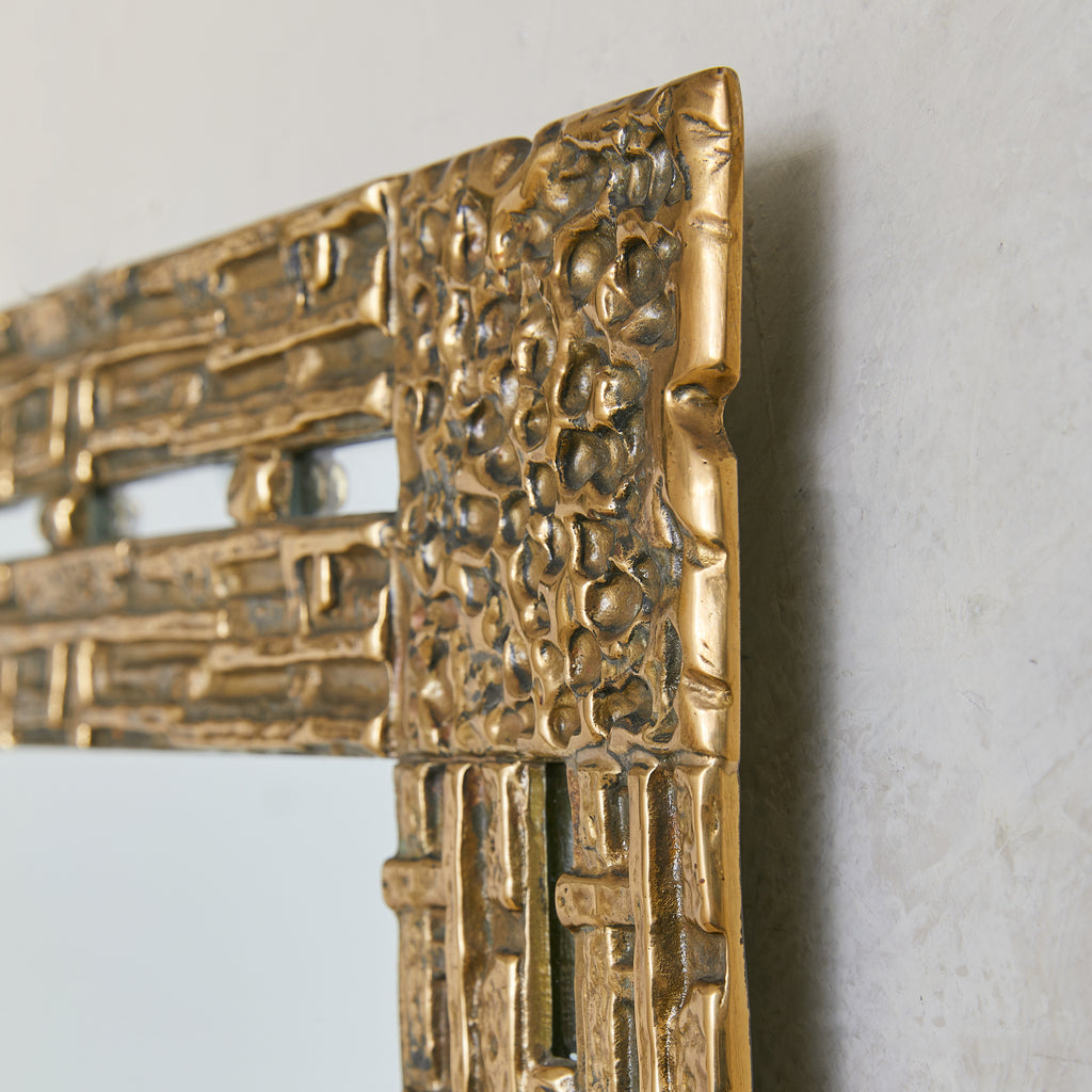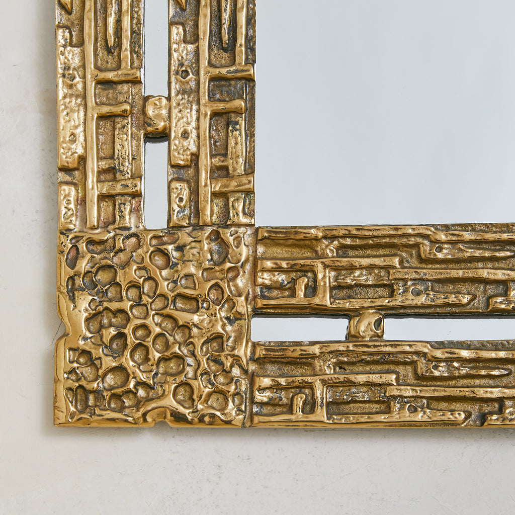 An Italian wall mirror by Luciano Frigerio, cast in bronze during the 1970s. The rectangular frame is sculpted in Frigerio’s signature relief—an interplay of textured bronze fields and grid-like segments. Each section is cast with irregularities, from pebble-like clusters to chiseled bands, creating a surface that shifts subtly with the light.