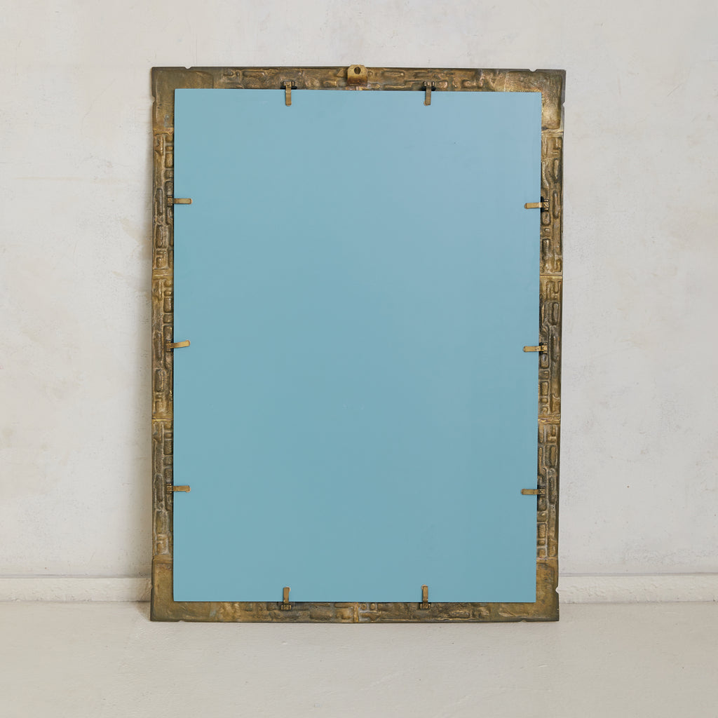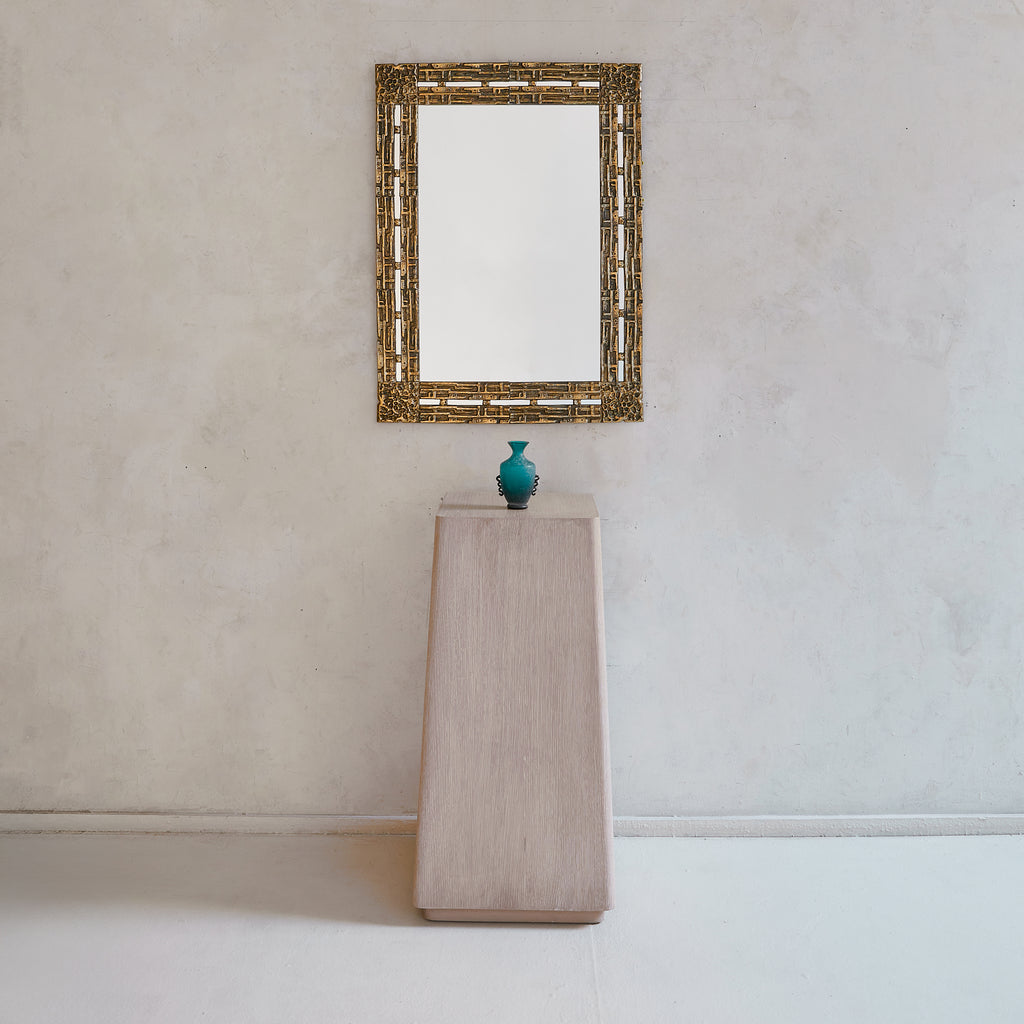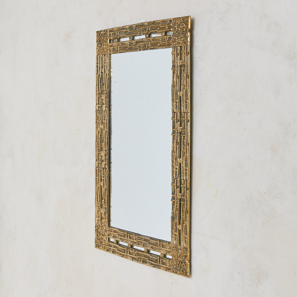 An Italian wall mirror by Luciano Frigerio, cast in bronze during the 1970s. The rectangular frame is sculpted in Frigerio’s signature relief—an interplay of textured bronze fields and grid-like segments. Each section is cast with irregularities, from pebble-like clusters to chiseled bands, creating a surface that shifts subtly with the light.