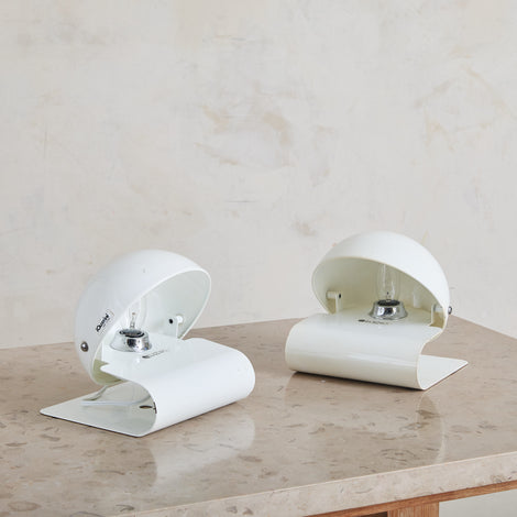 The ‘Bugia’ table lamp was designed by Giuseppe Cormio for the 1975 Milan Fair and produced by Harvey Guzzini in 1976. Reflecting the Space Age aesthetic that defined Harvey Guzzini's designs, the lamp features a base crafted from curved ivory sheet metal, supporting a tiltable half-globe shade for adjustable lighting. Its minimalist yet fascinating form made it a standout piece of its time and a highly collectible design today.