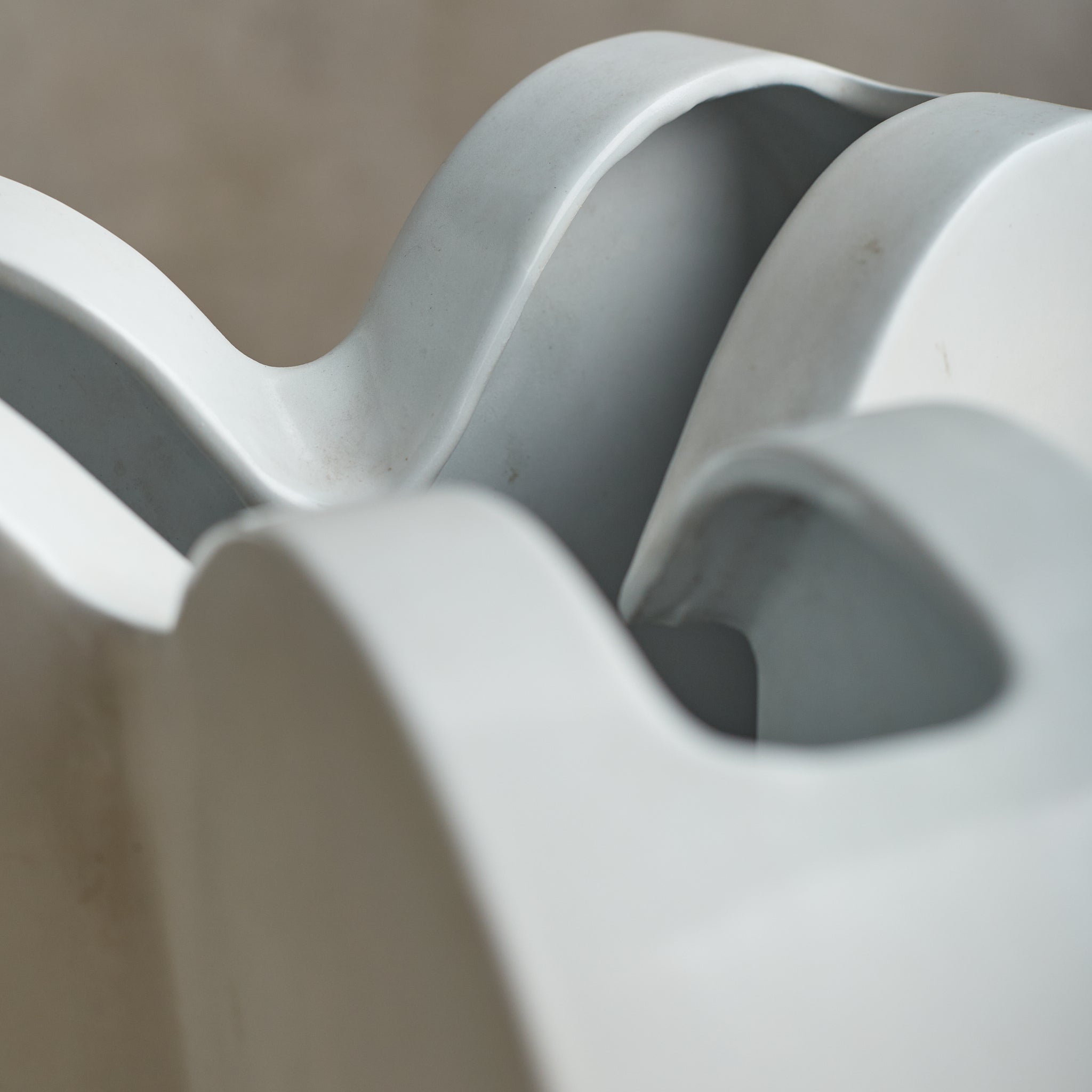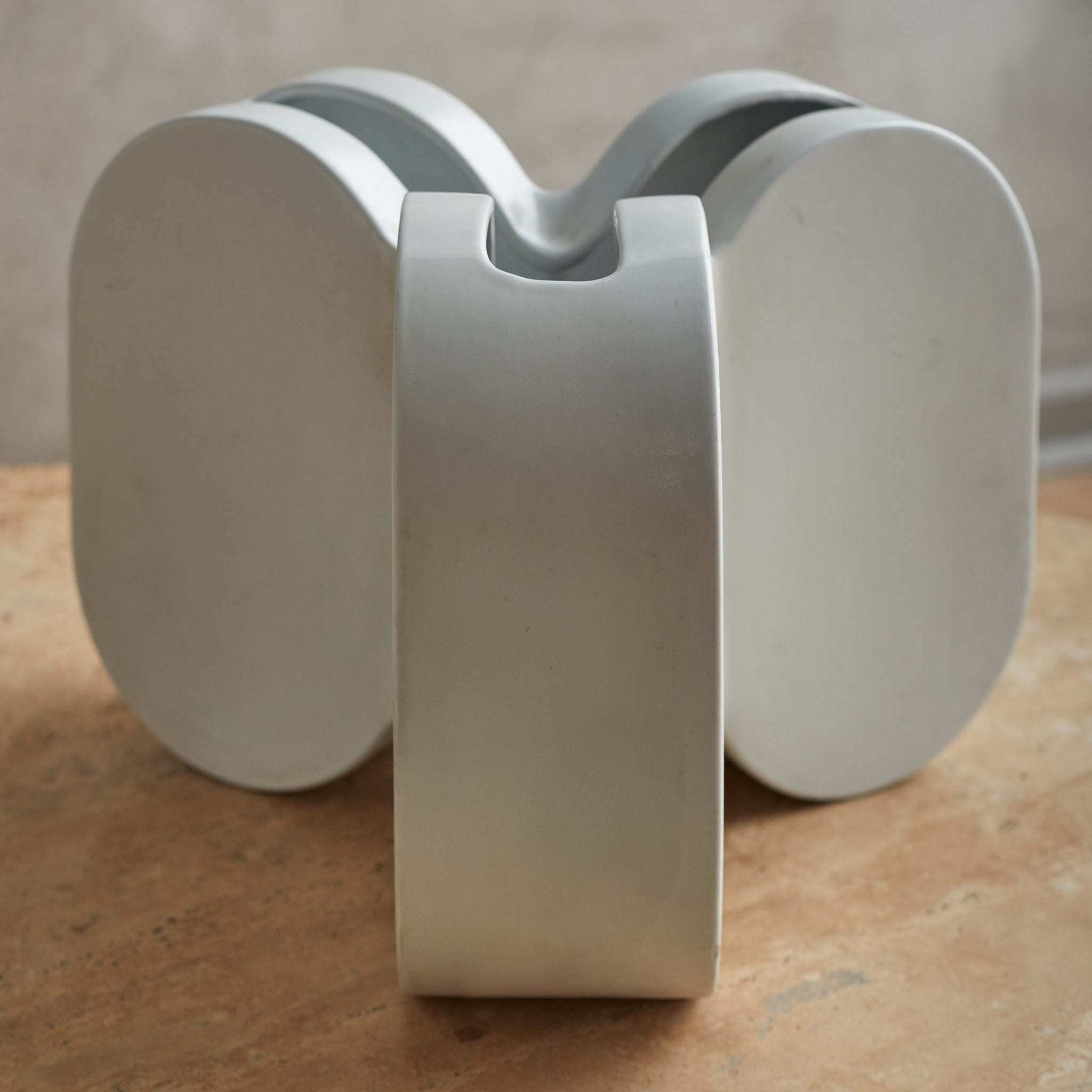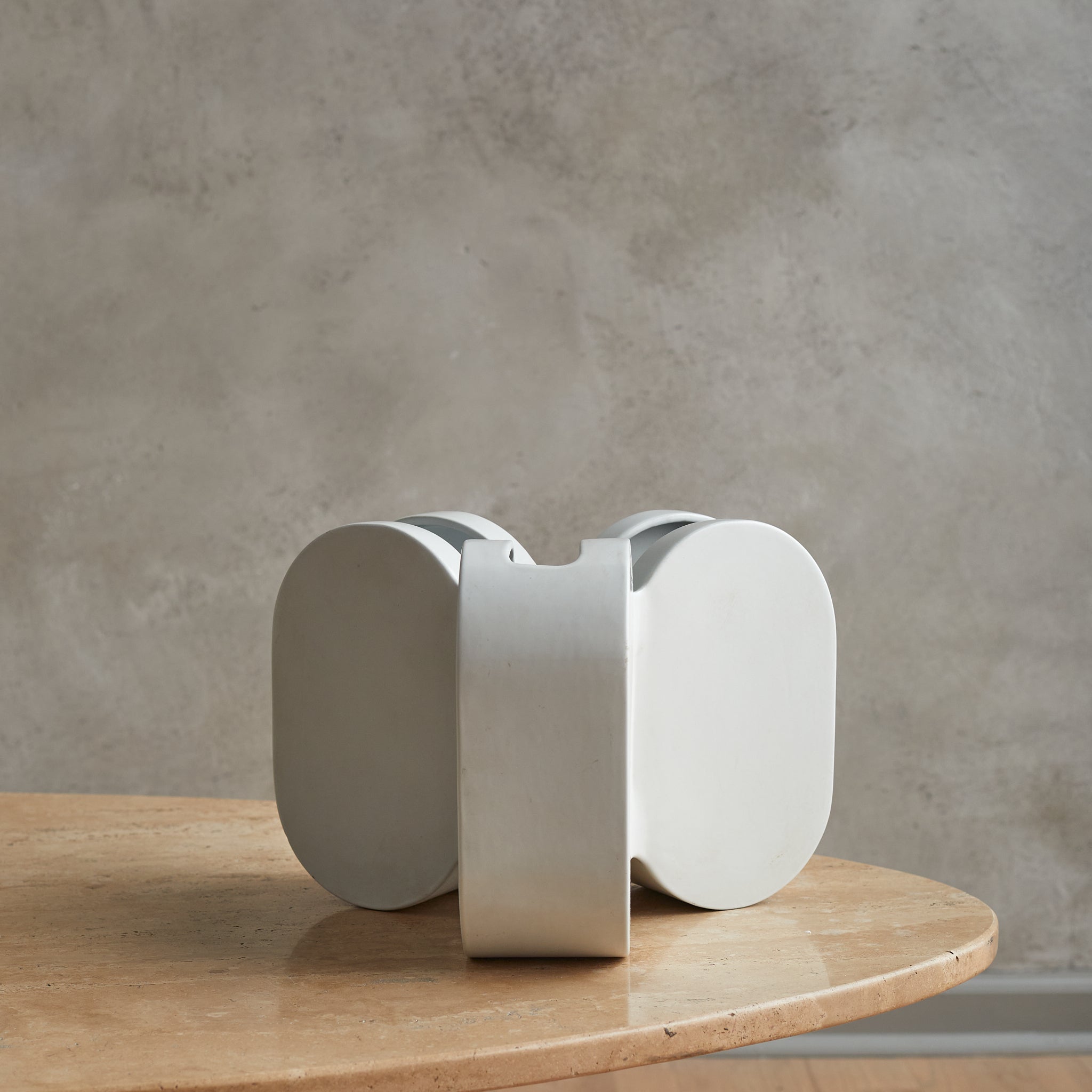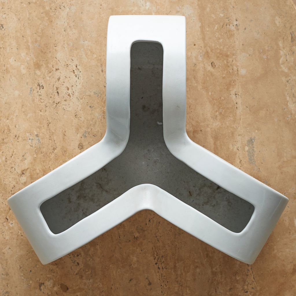 This sculptural ceramic vase by Ambrogio Pozzi for Ceramica Franco Pozzi epitomizes the avant-garde spirit of 1960s Italian design. Defined by its bold, architectural form, the piece explores the interplay of symmetry and negative space, resulting in a strikingly modern object that transcends its functional purpose. Crafted in a matte white glaze, the vase’s precise, almost industrial contours create a Y-shaped opening, demonstrating Pozzi’s innovative approach to materiality.