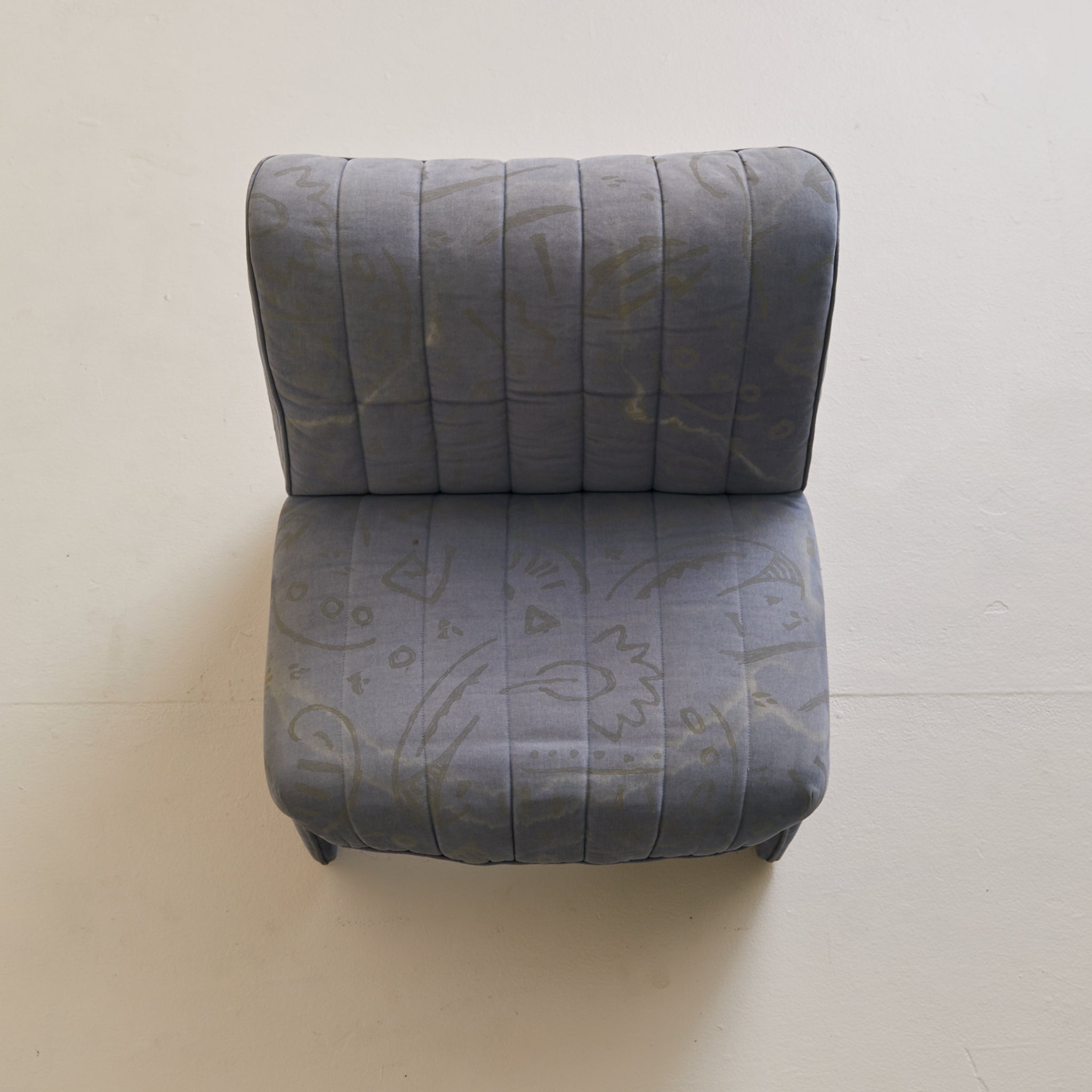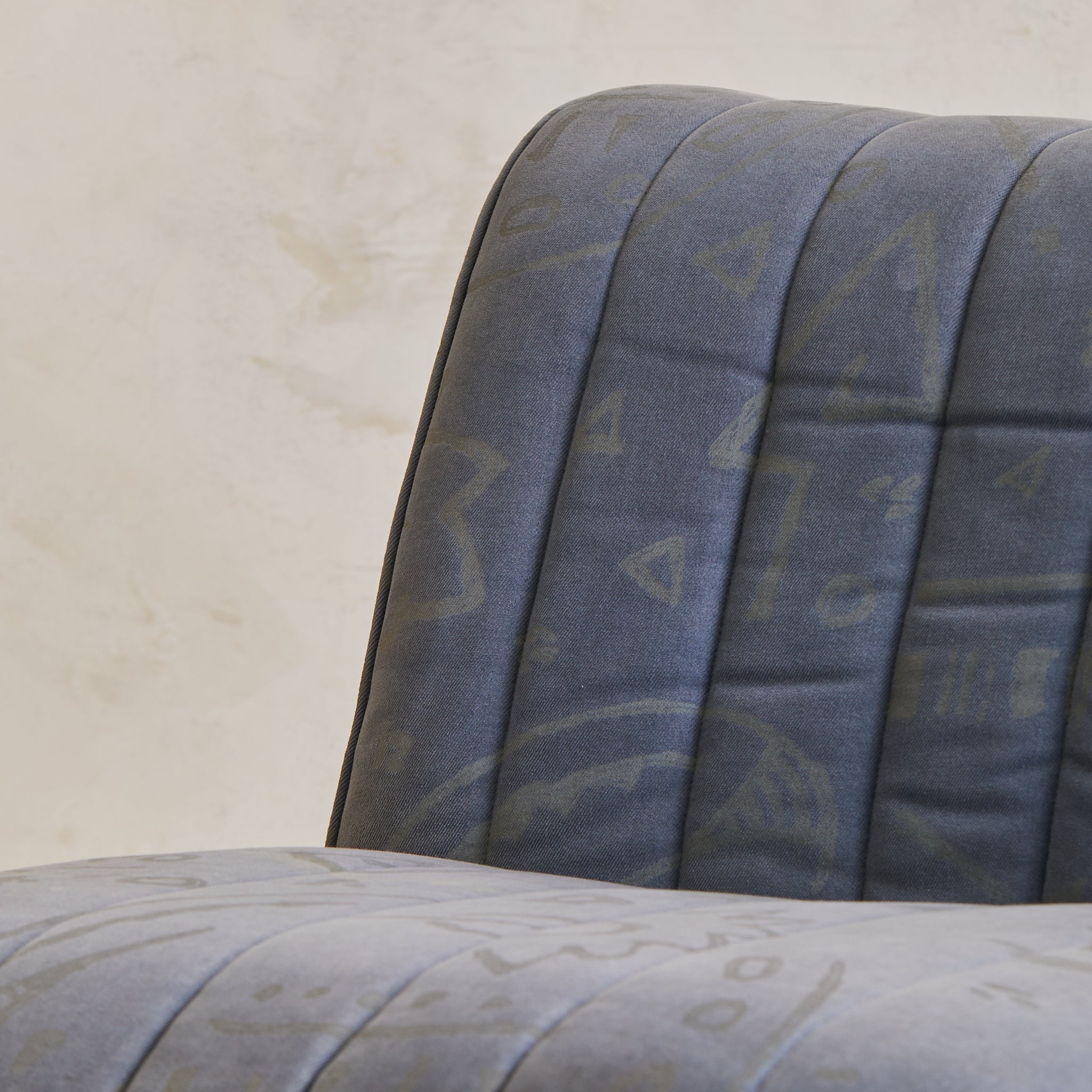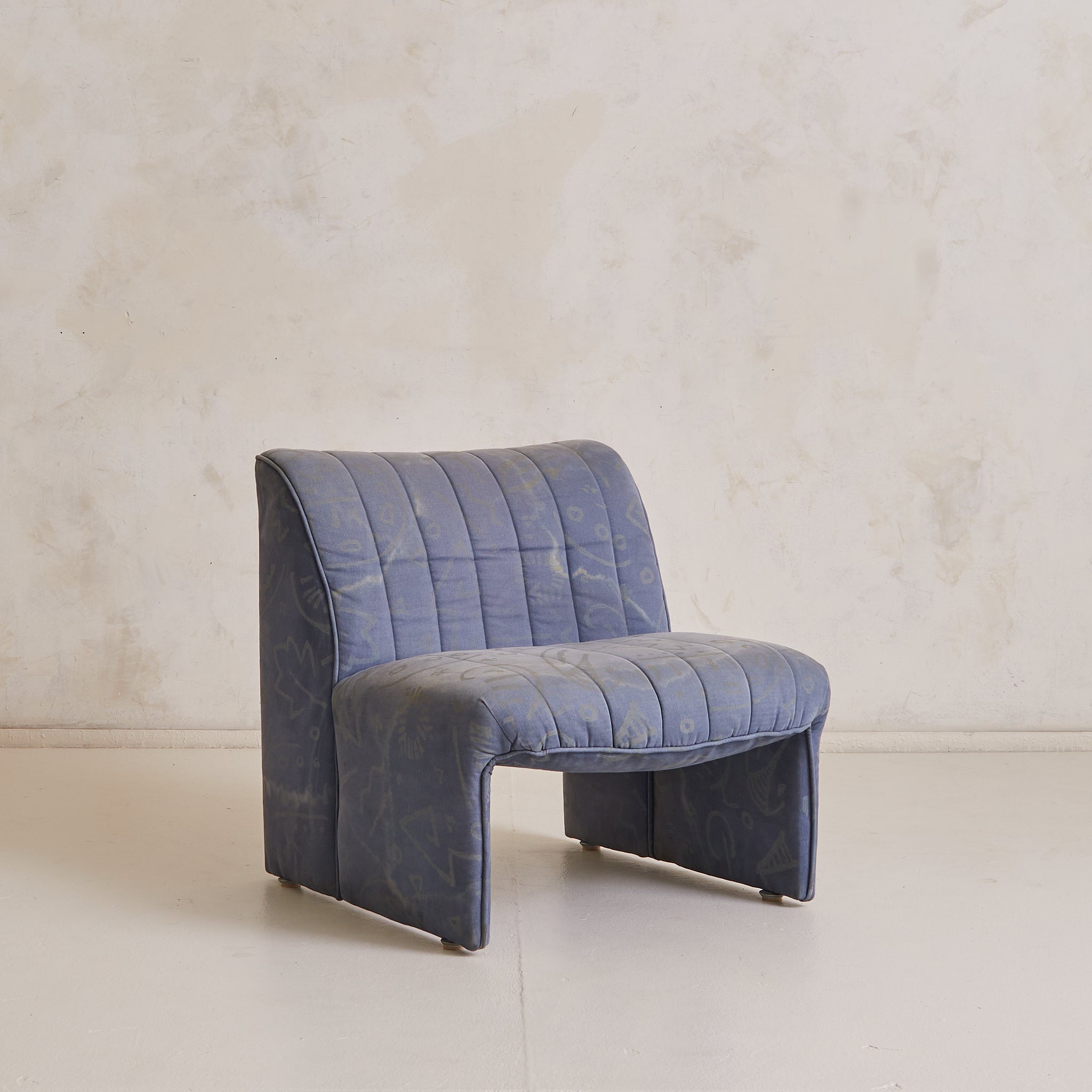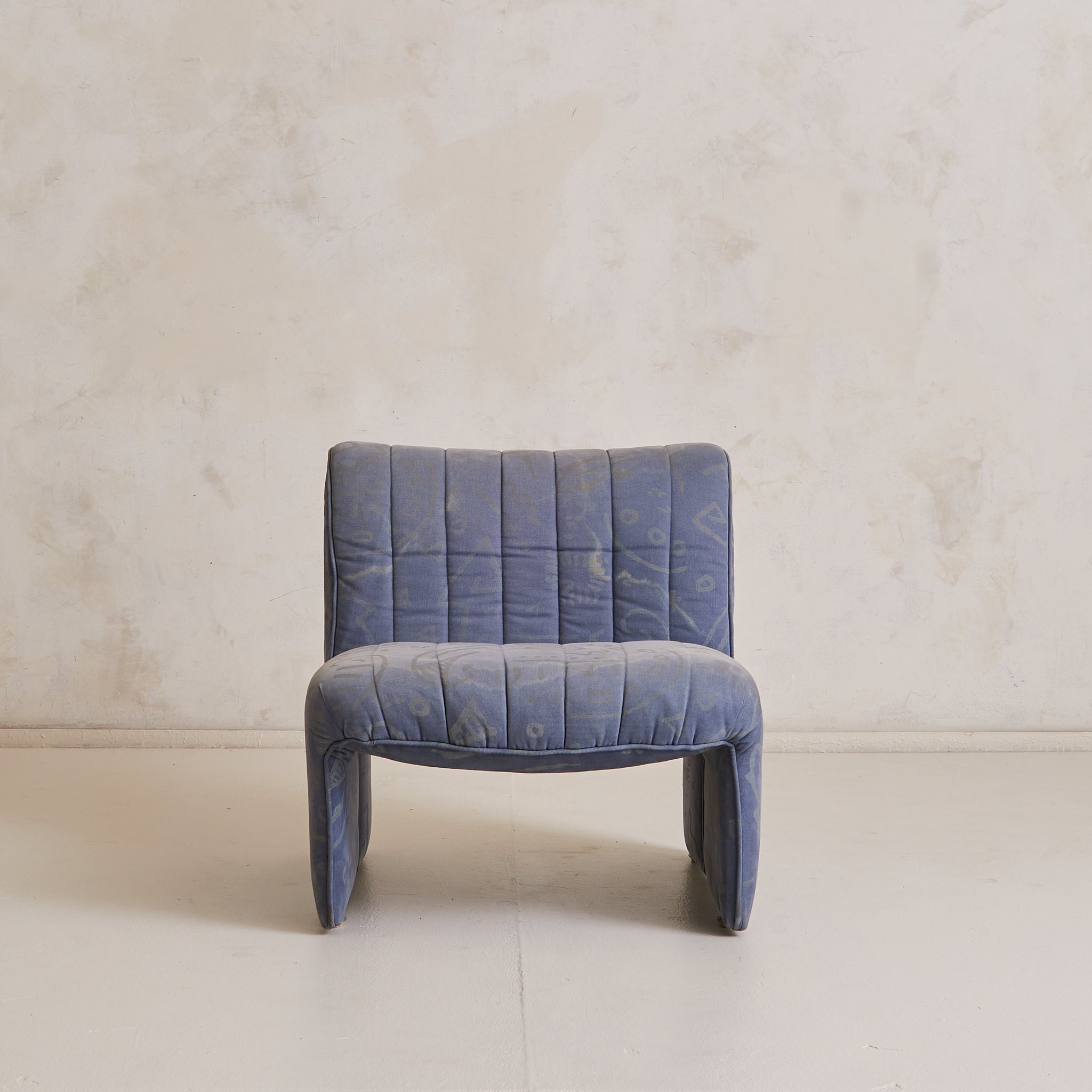 A 1970s Italian lounge chair, defined by its fluid silhouette and low, grounding proportions. The design features a wide seat and subtly flared back, upholstered in channel-stitched fabric over a deep, architectural frame. With no visible legs, it appears to float just above the floor, anchored by discreet feet.