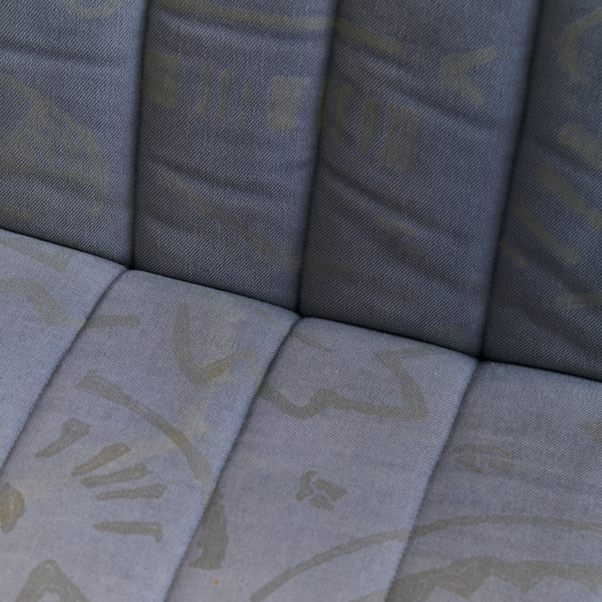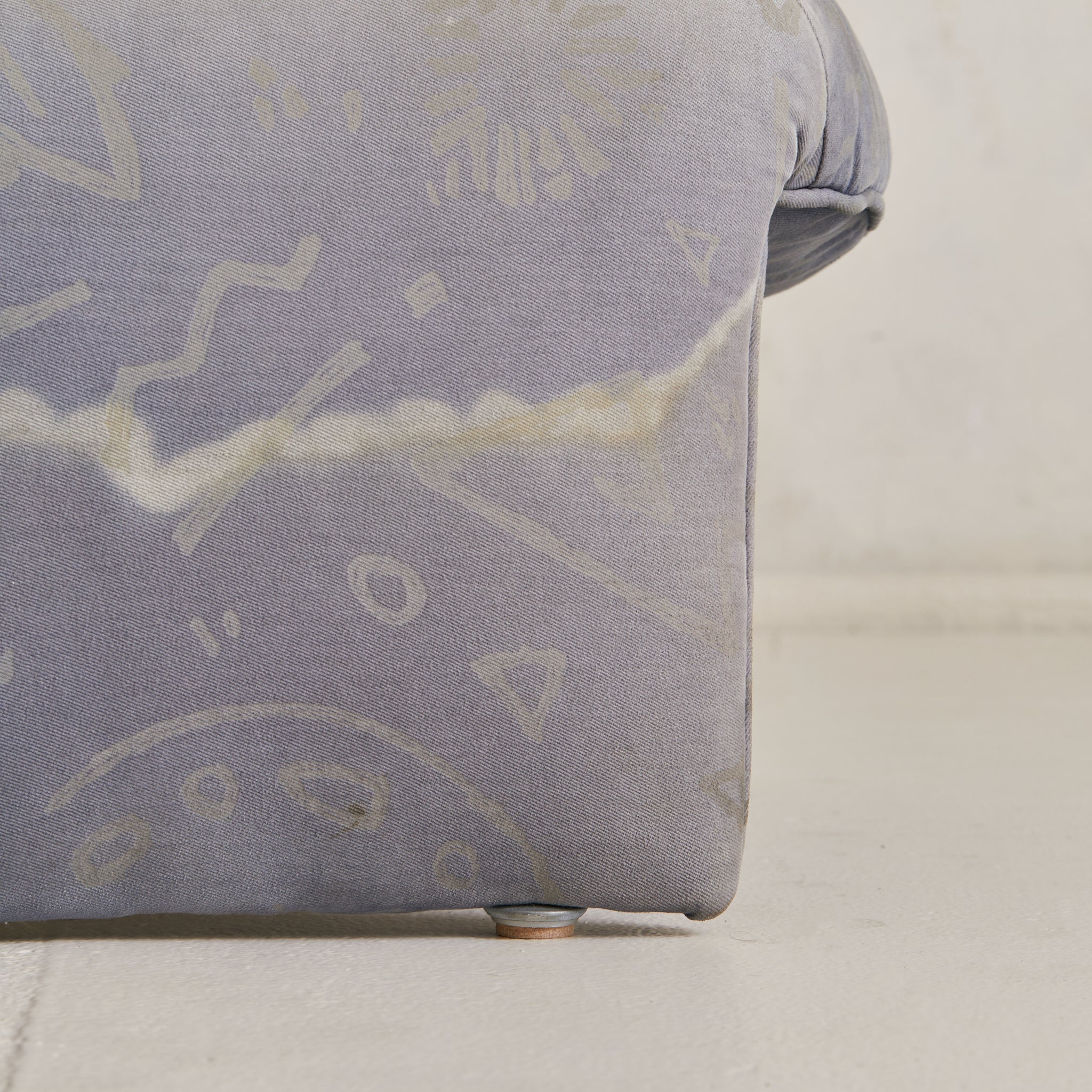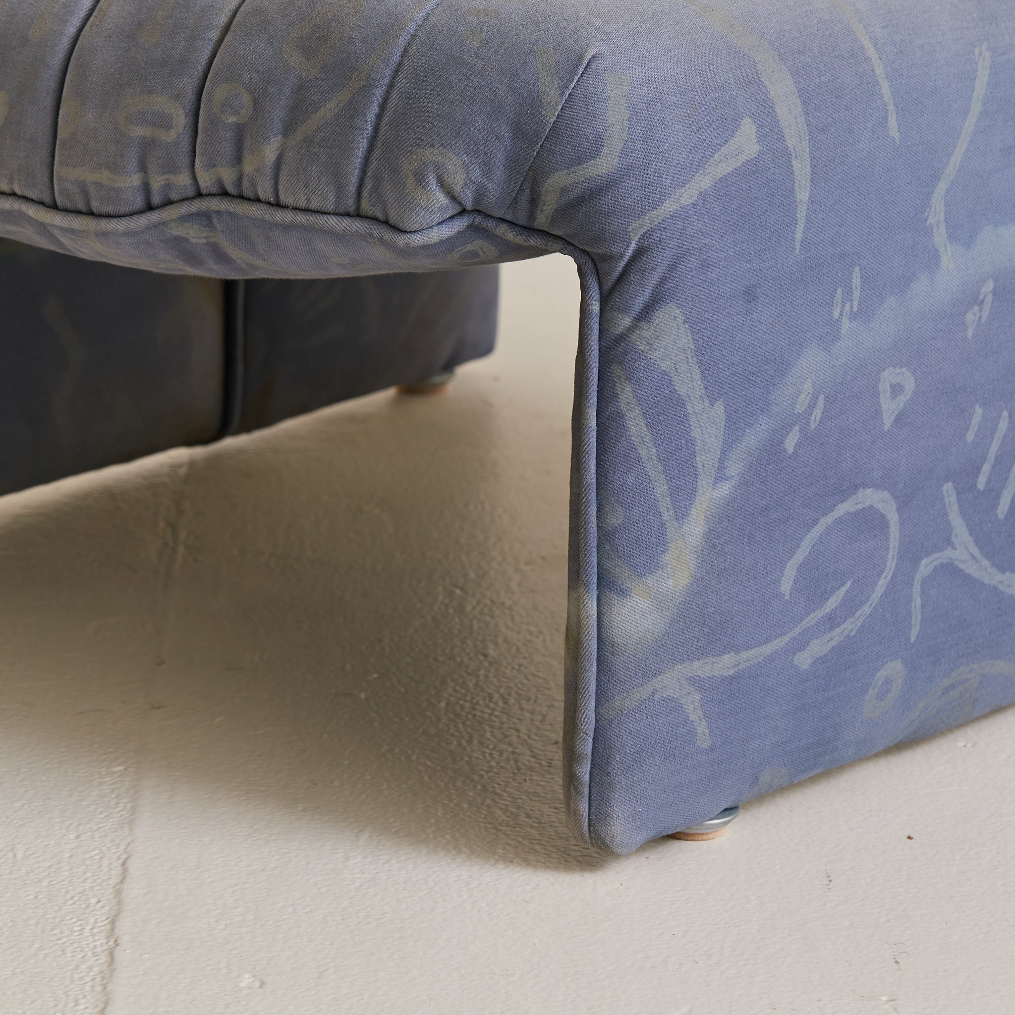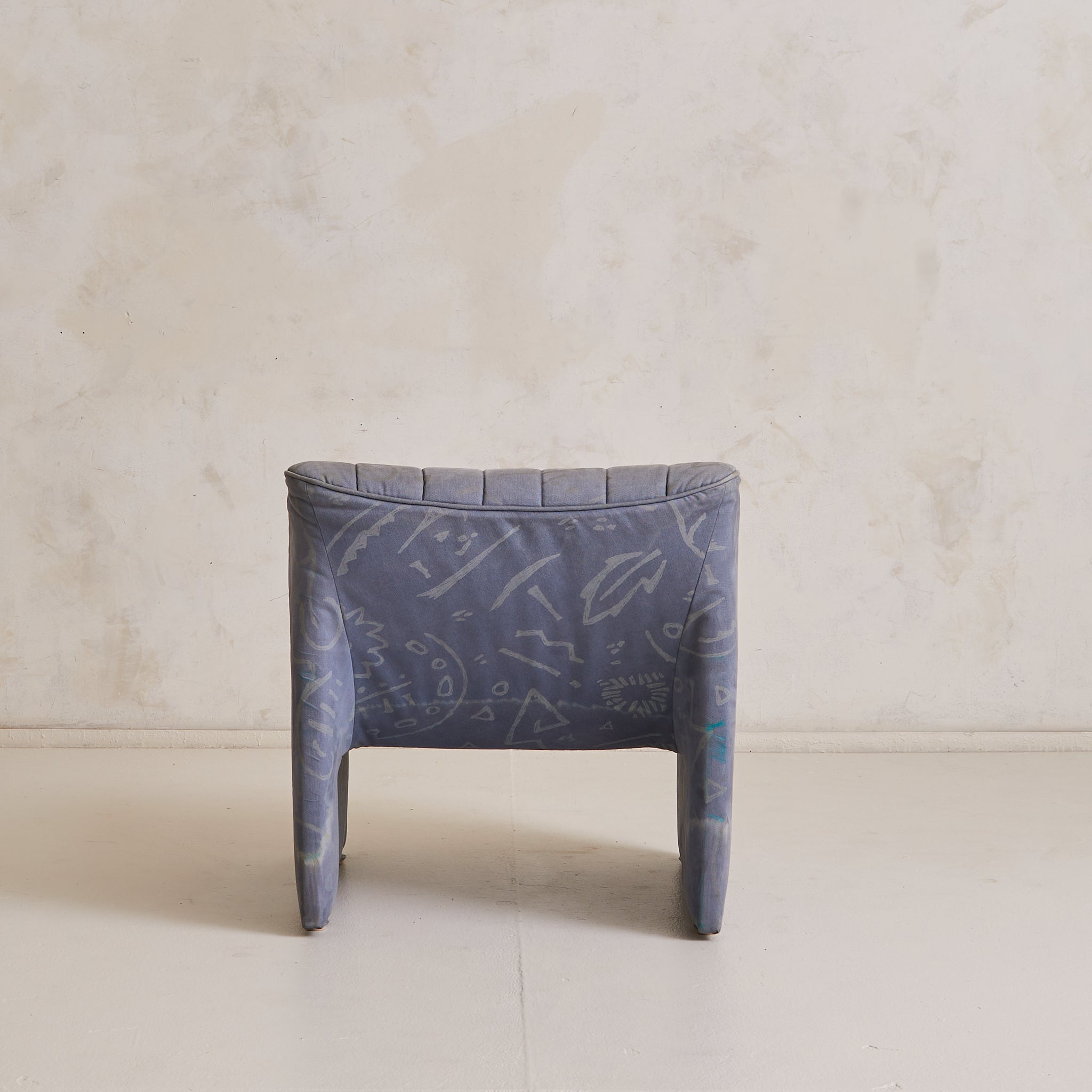 A 1970s Italian lounge chair, defined by its fluid silhouette and low, grounding proportions. The design features a wide seat and subtly flared back, upholstered in channel-stitched fabric over a deep, architectural frame. With no visible legs, it appears to float just above the floor, anchored by discreet feet.