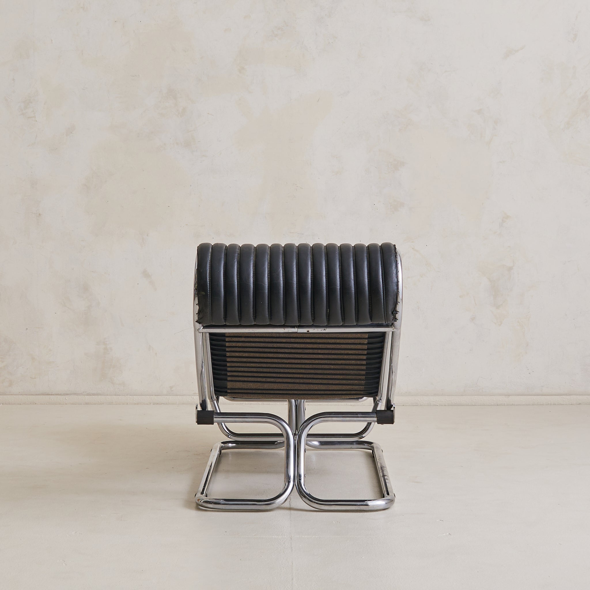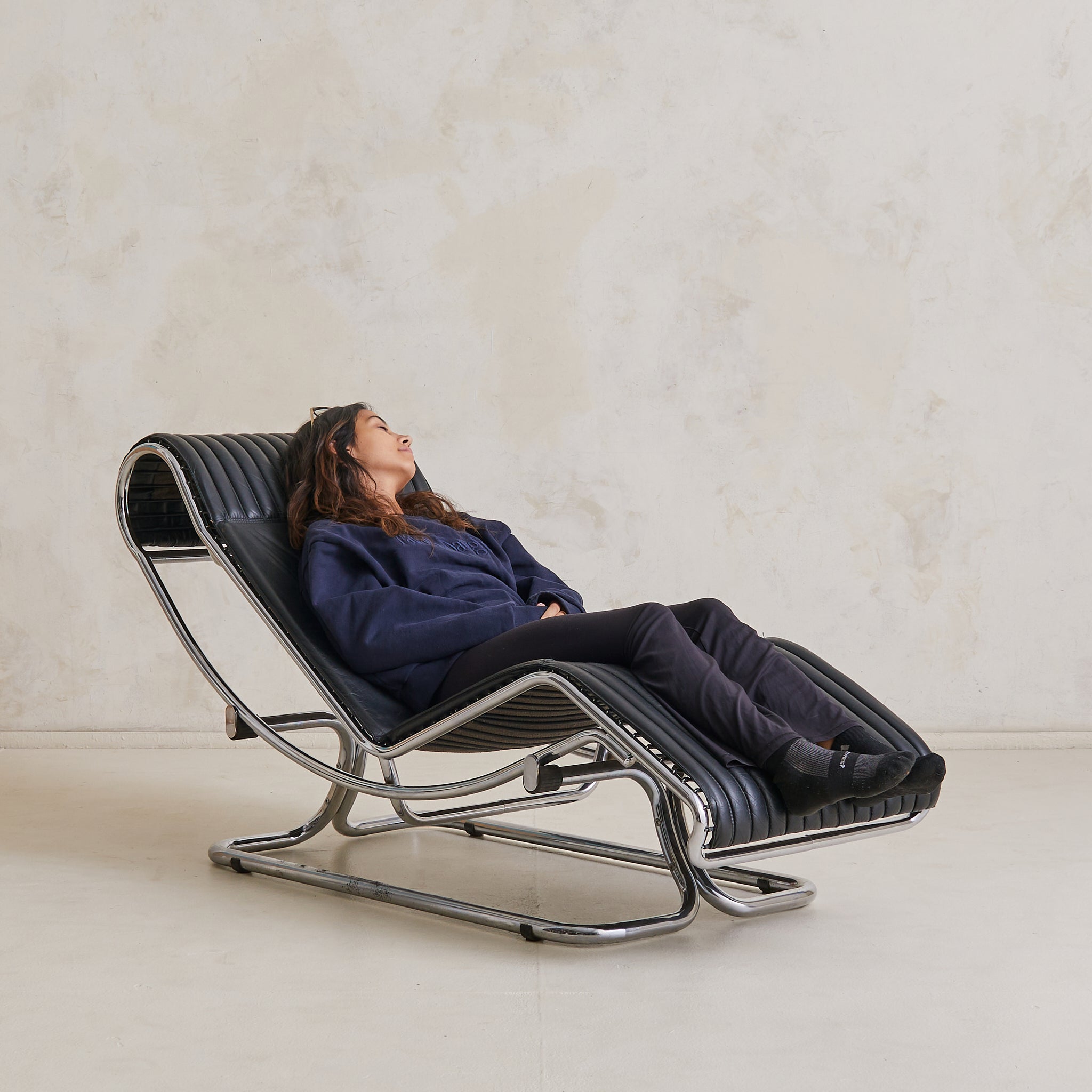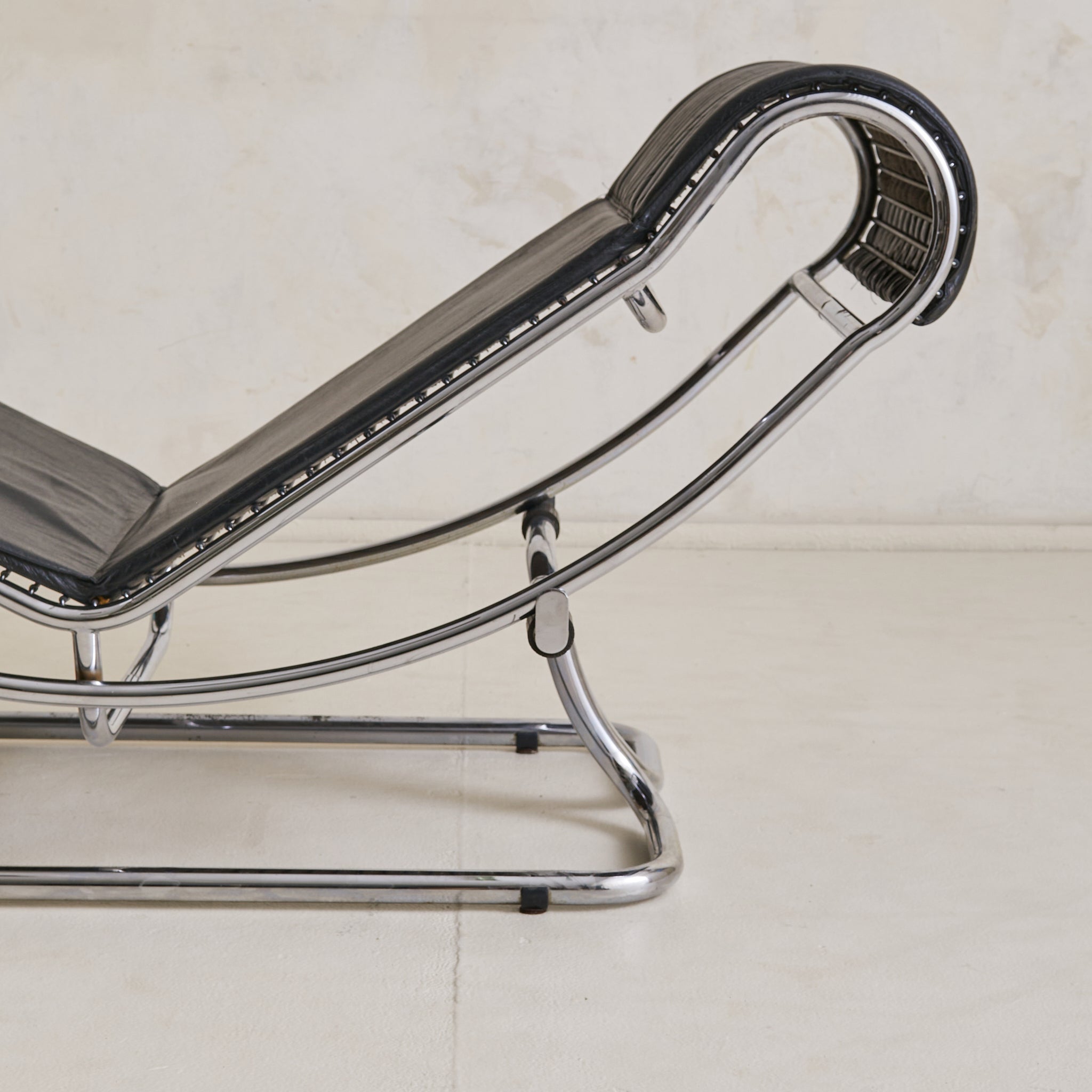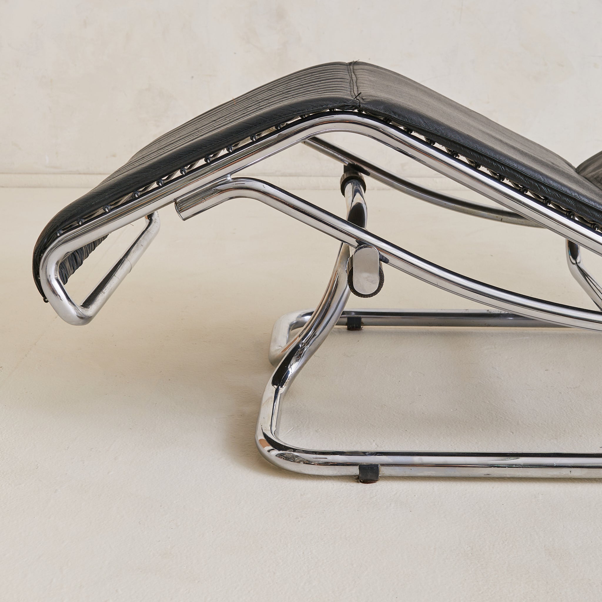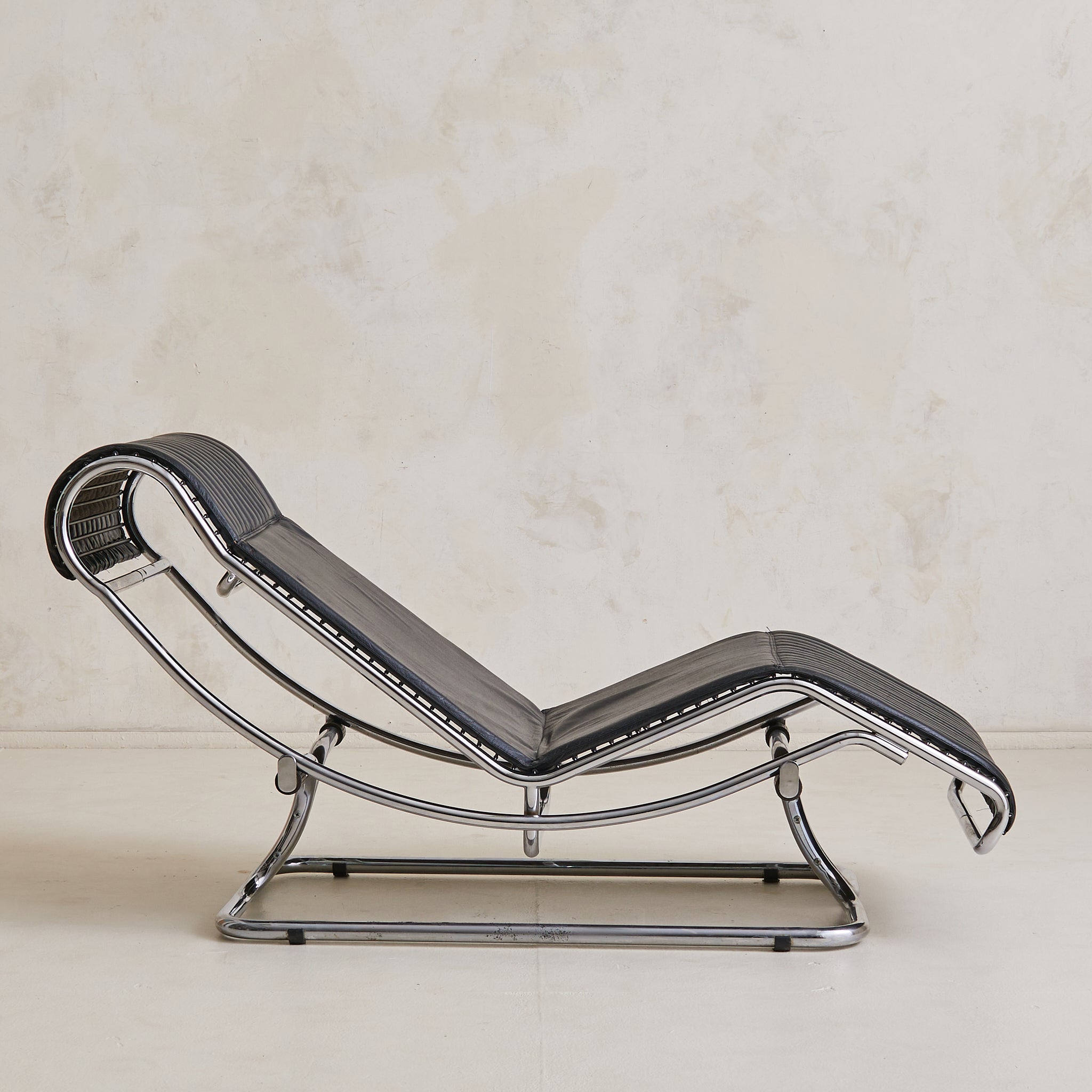 A sculptural Italian chaise lounge designed by Guido Faleschini in the 1970s. The adjustable, fluid form is anchored by a polished chrome-plated steel frame that arcs in a continuous loop, elevating the lounger in a moment of suspended ease. Upholstered in ribbed black leather, the seat appears to float just above its tubular base, offering a subtle recline.