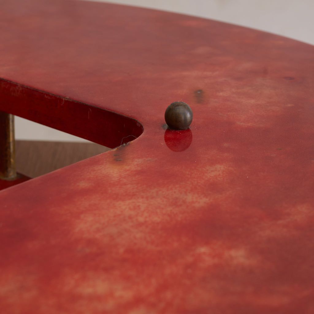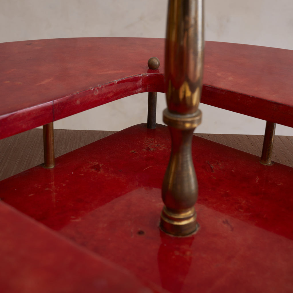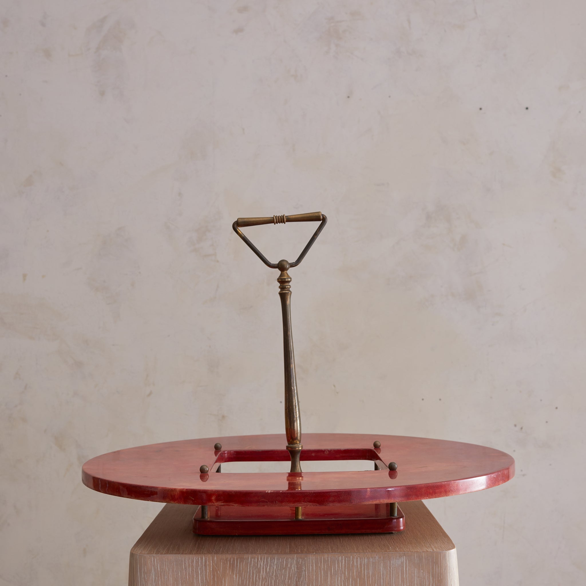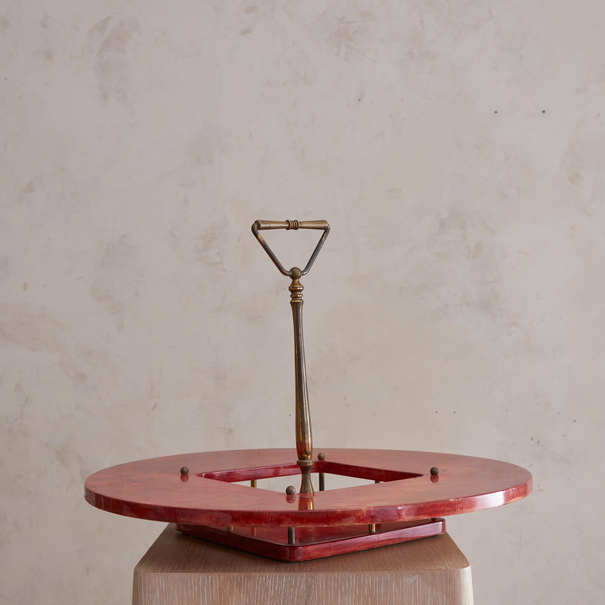 A 1960s Italian serving tray attributed to Aldo Tura, crafted in lacquered crimson goatskin parchment with a sculptural brass handle. The circular form features a square cutout at the center, anchored by spherical brass studs and a stepped base. Boldly saturated and finely detailed—an alluring piece of midcentury Italian design with undeniable presence.