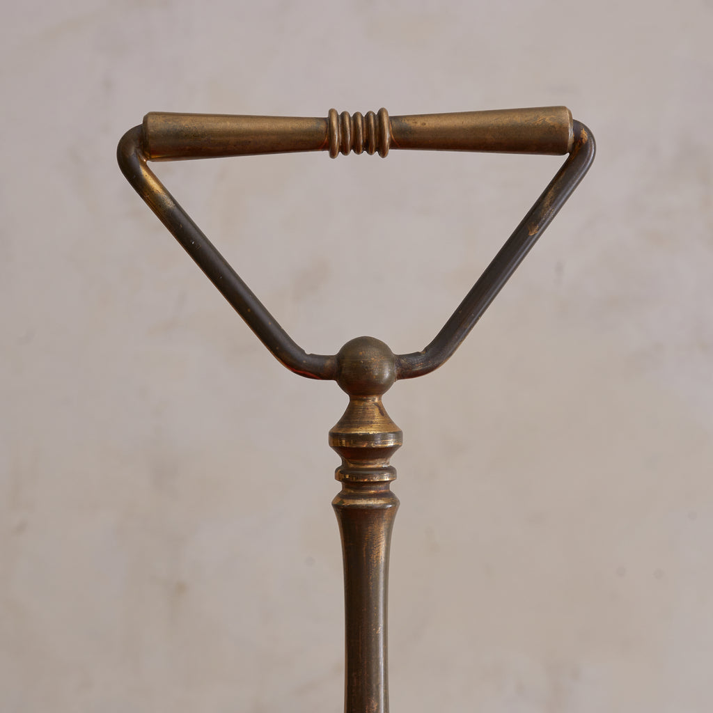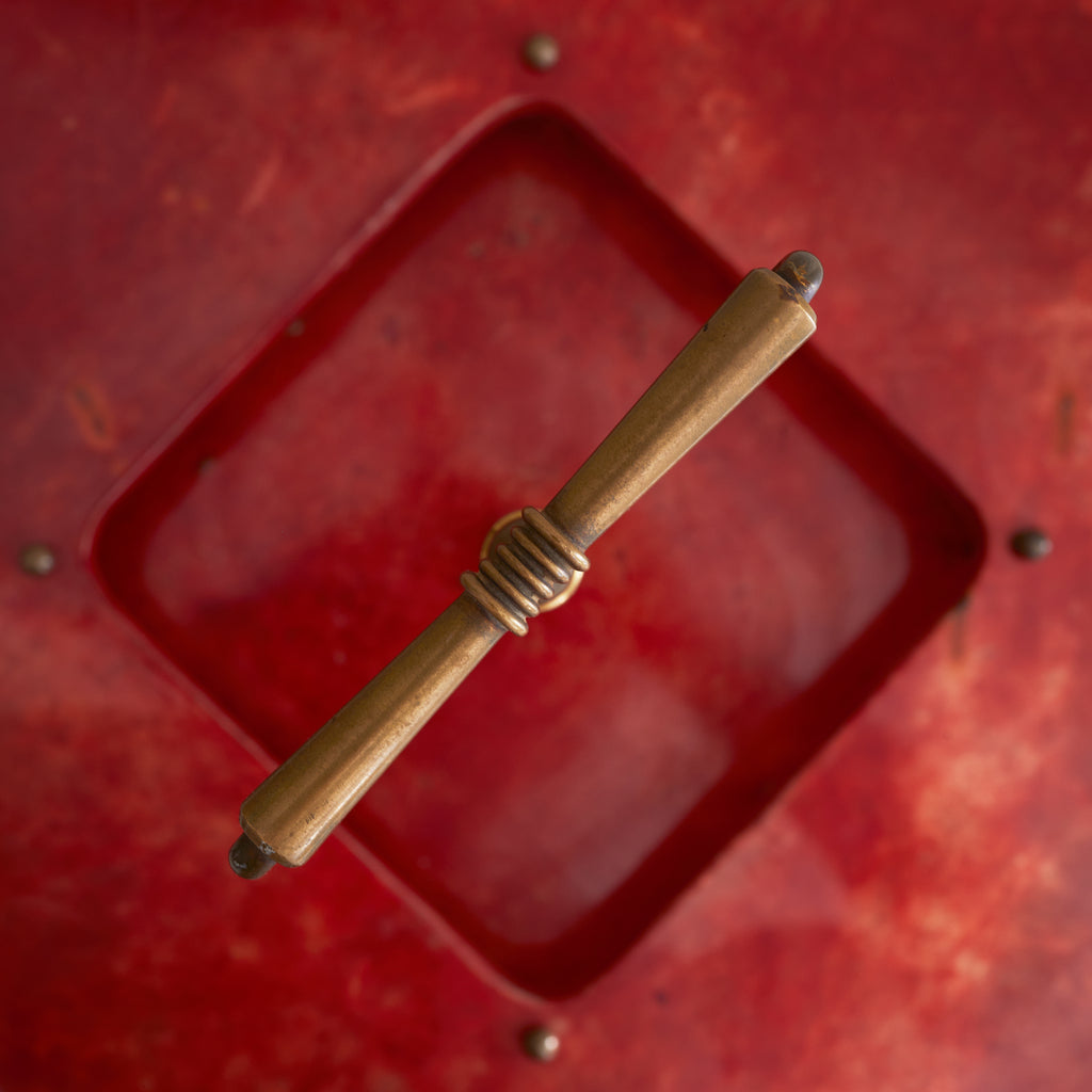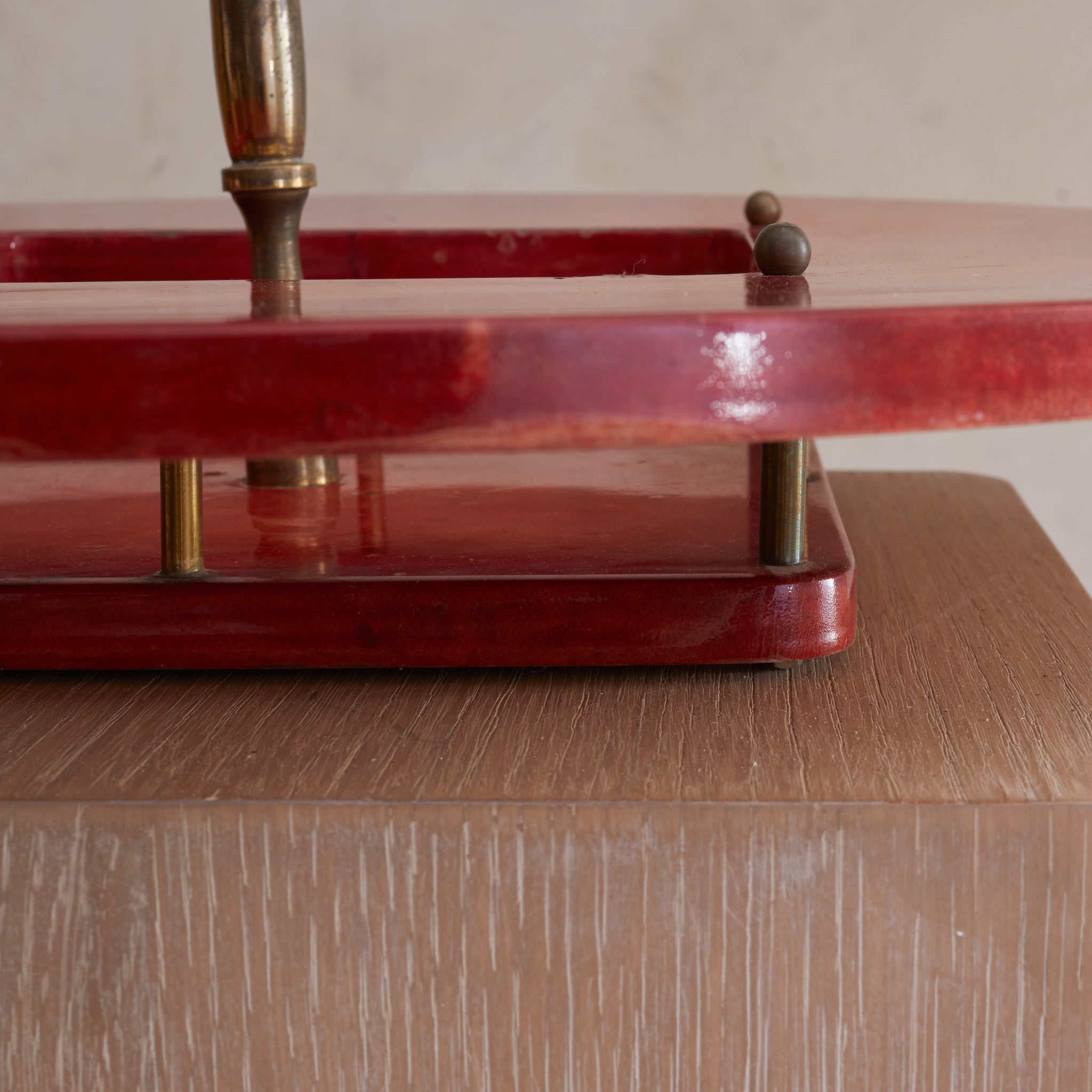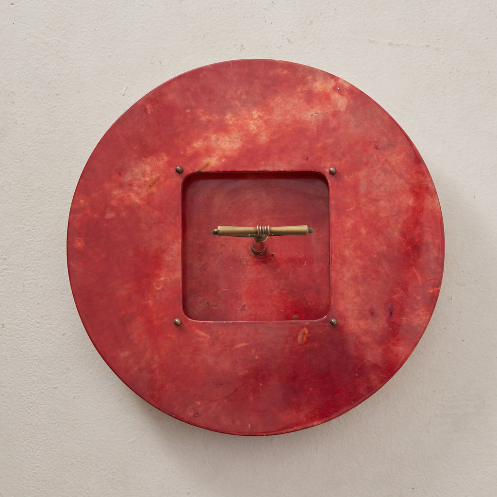 A 1960s Italian serving tray attributed to Aldo Tura, crafted in lacquered crimson goatskin parchment with a sculptural brass handle. The circular form features a square cutout at the center, anchored by spherical brass studs and a stepped base. Boldly saturated and finely detailed—an alluring piece of midcentury Italian design with undeniable presence.
