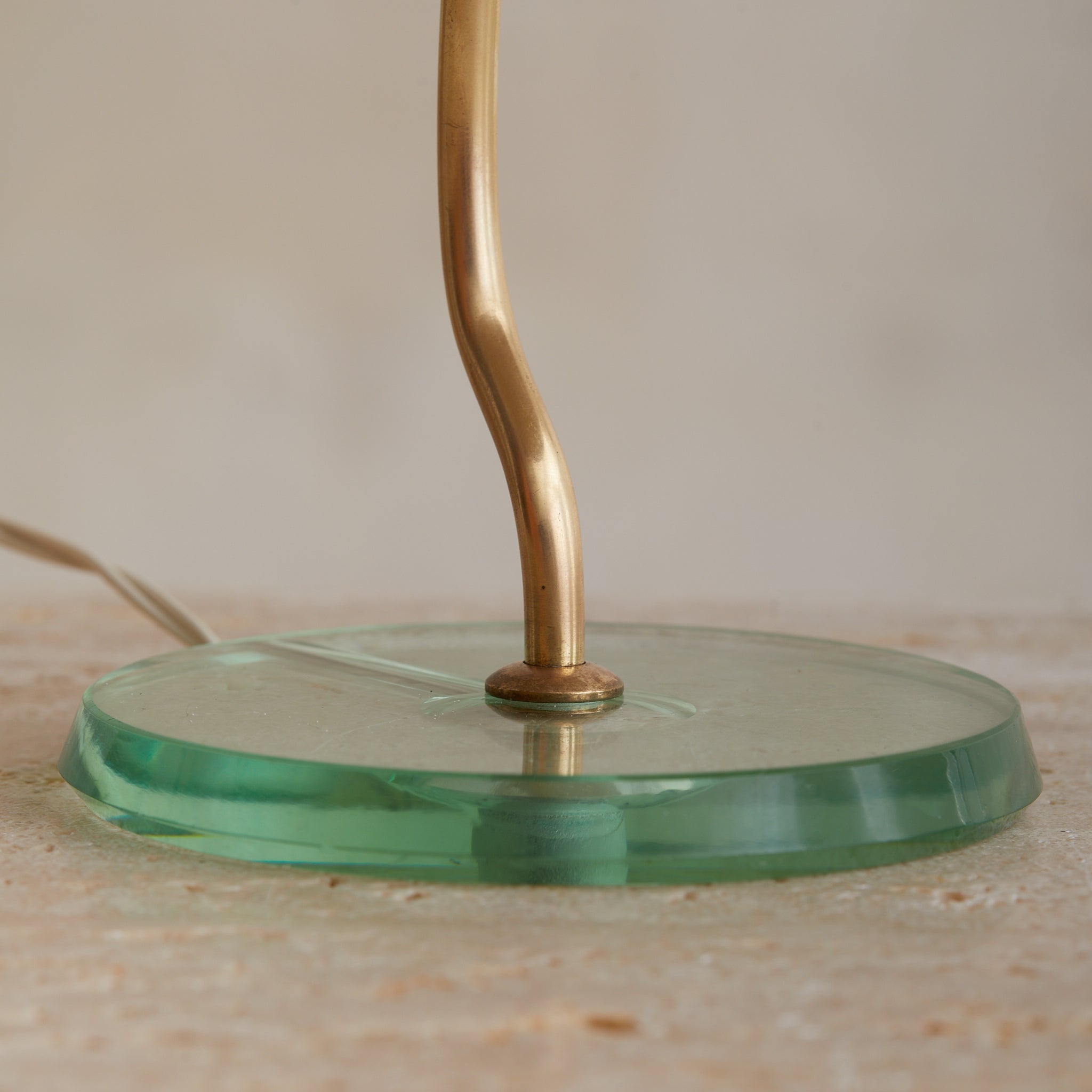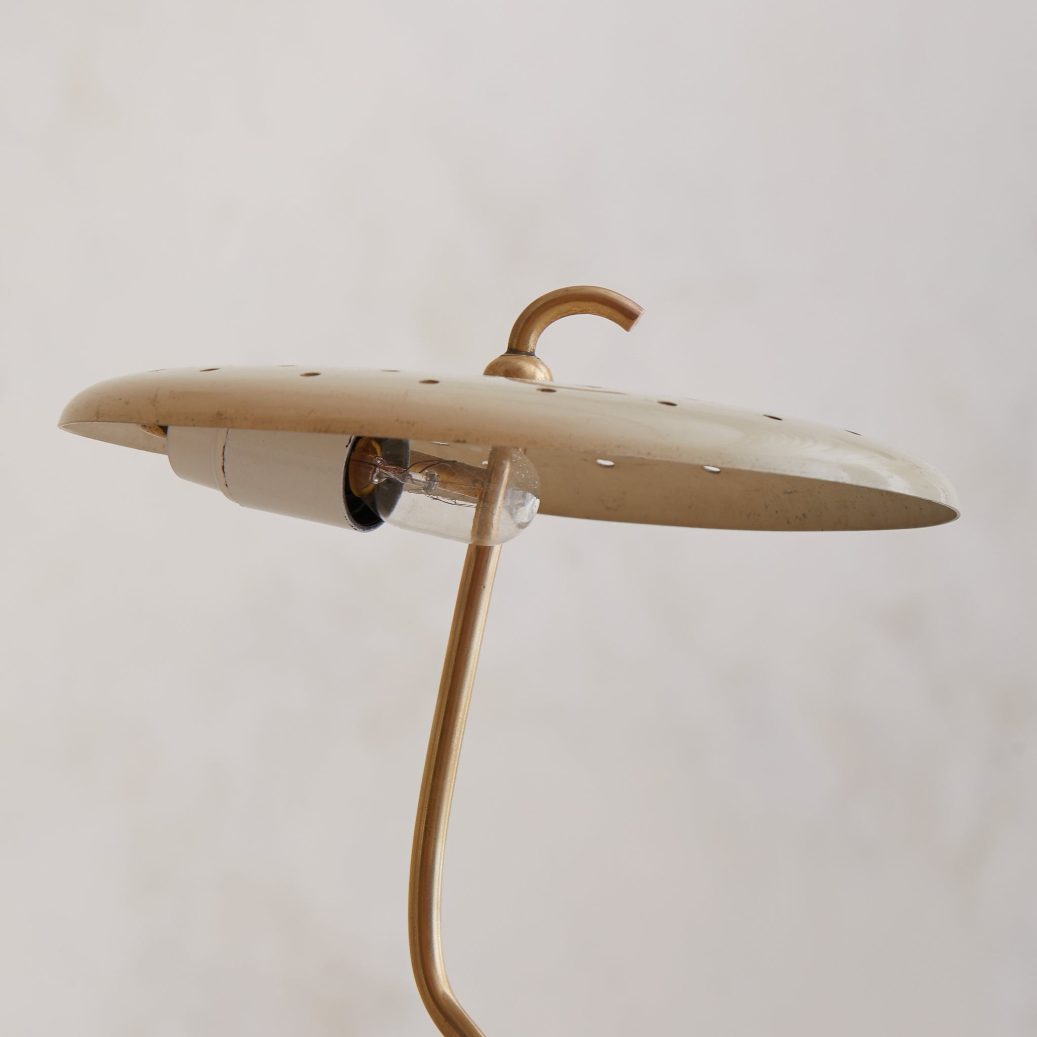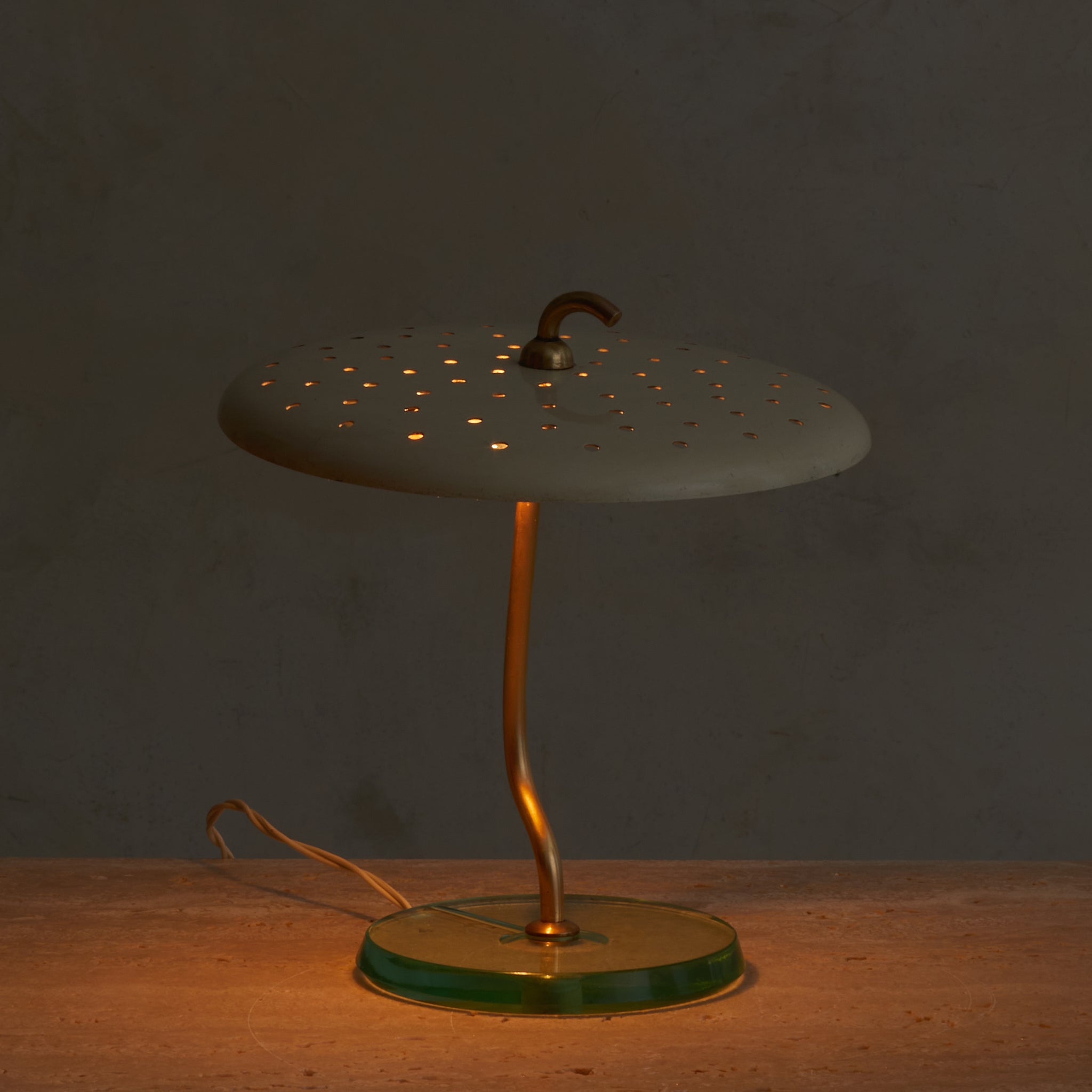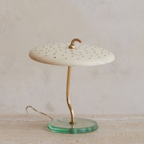 A petite 1950s Italian table lamp attributed to Arteluce. Just 7.5 inches tall, the lamp features an ivory-enameled aluminum shade, gently domed and perforated throughout, mounted off-center on a curved, brushed brass stem. The stem’s subtle twist introduces a sense of motion, complemented by a thick, round-cut glass base.