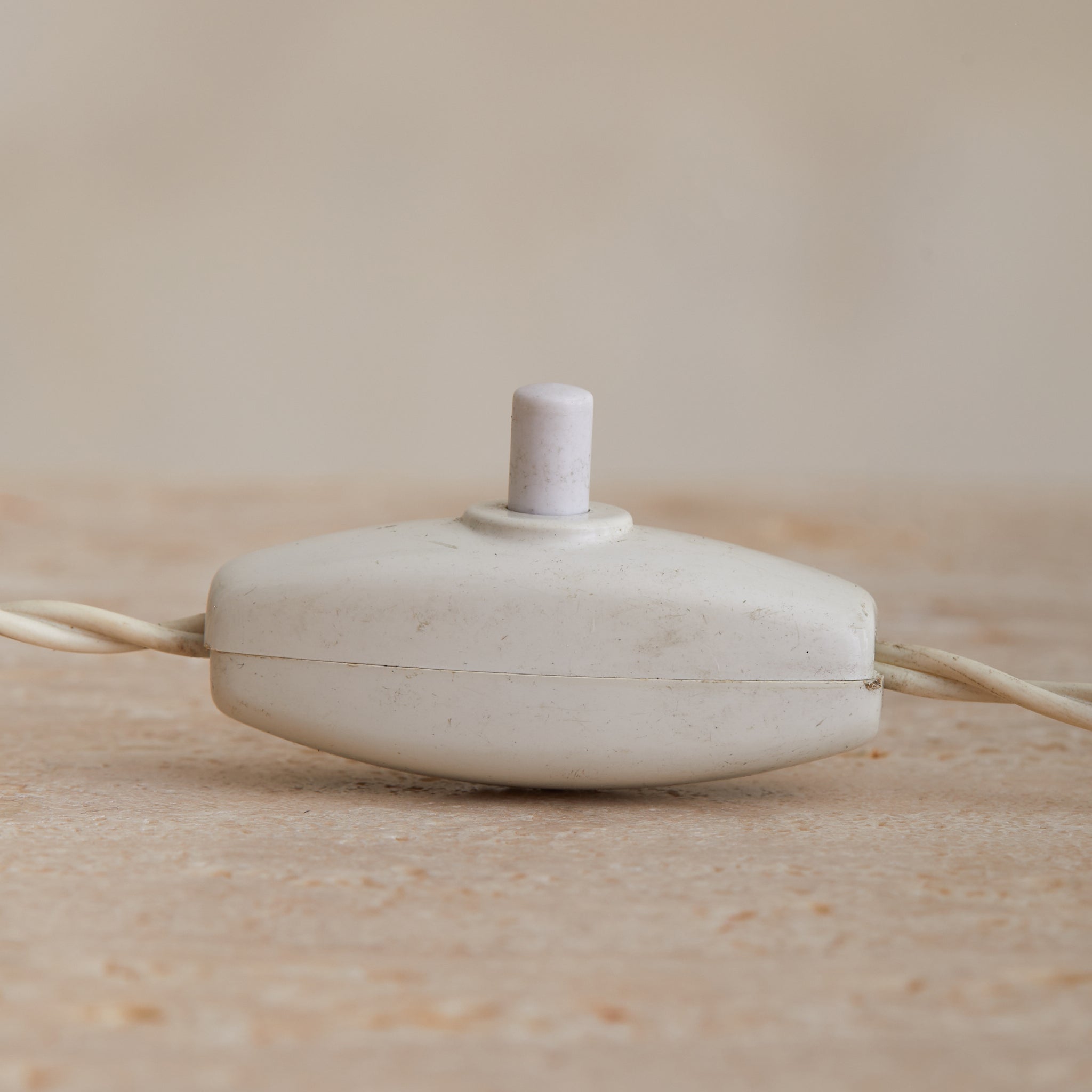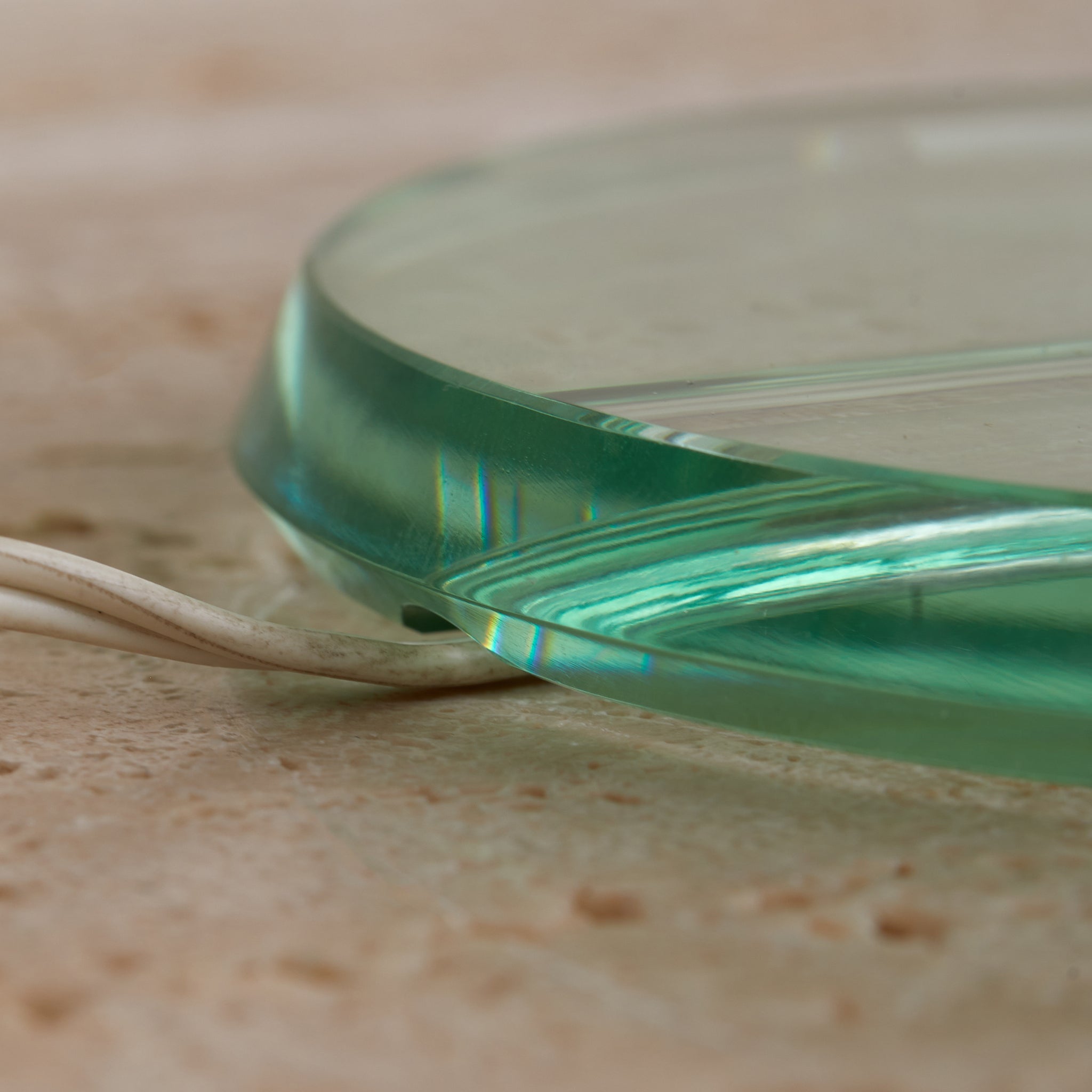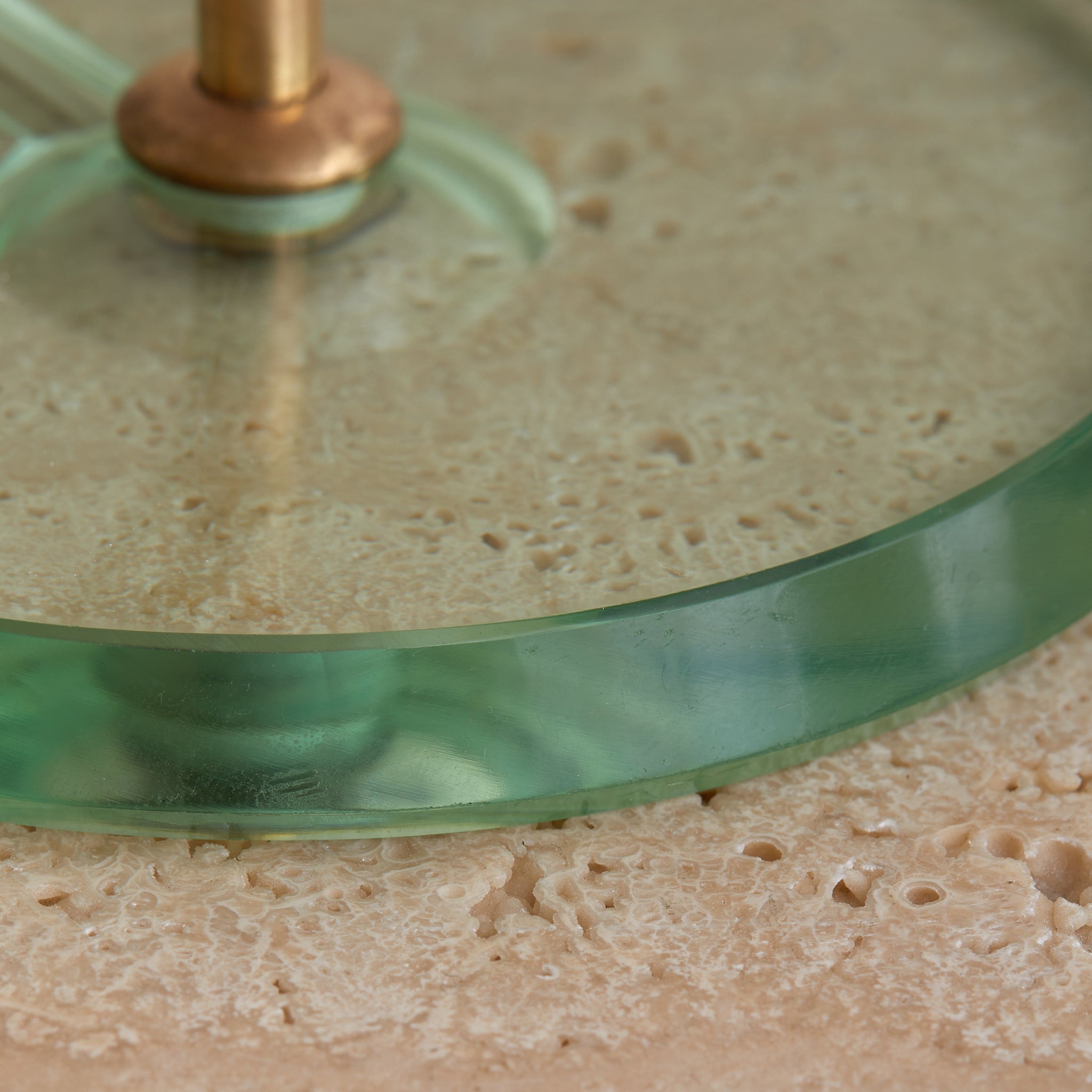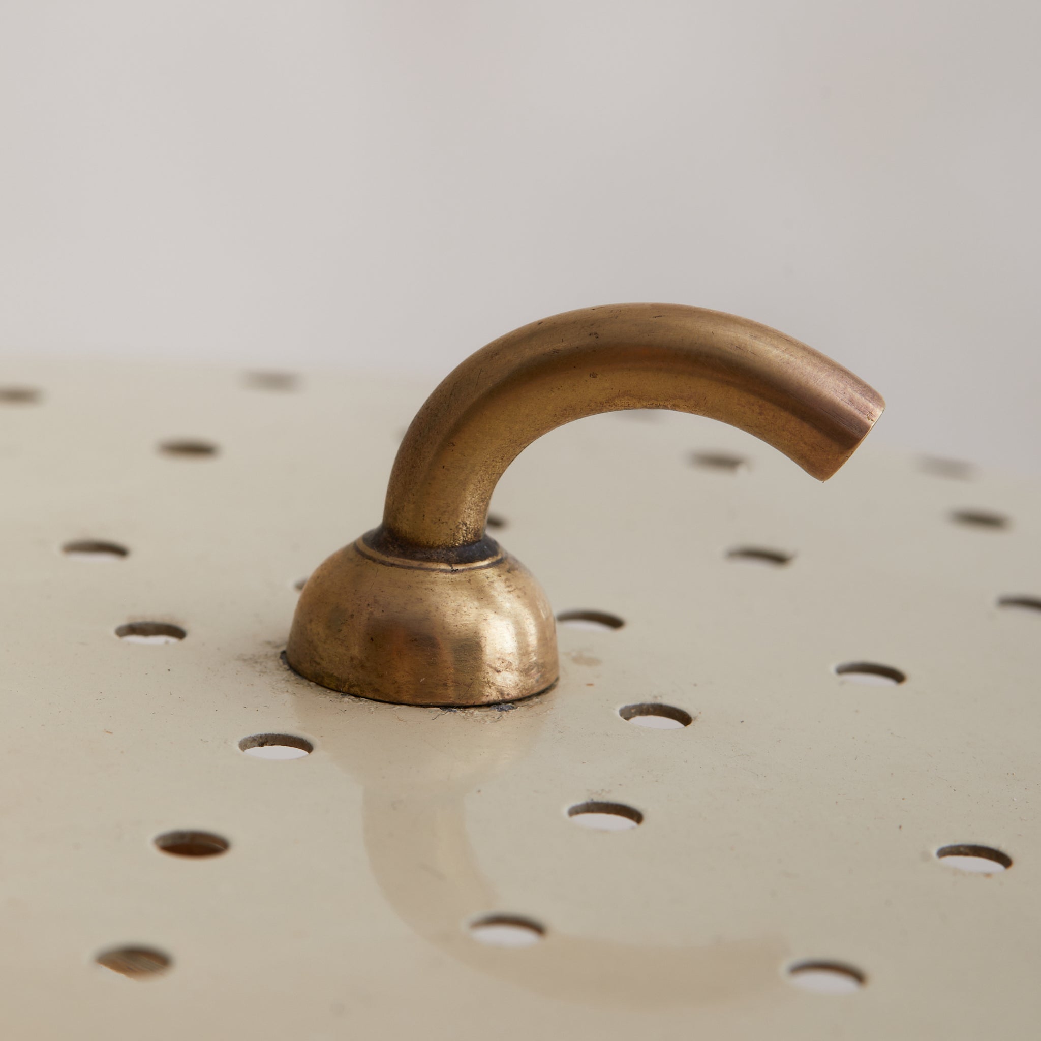 A petite 1950s Italian table lamp attributed to Arteluce. Just 7.5 inches tall, the lamp features an ivory-enameled aluminum shade, gently domed and perforated throughout, mounted off-center on a curved, brushed brass stem. The stem’s subtle twist introduces a sense of motion, complemented by a thick, round-cut glass base.