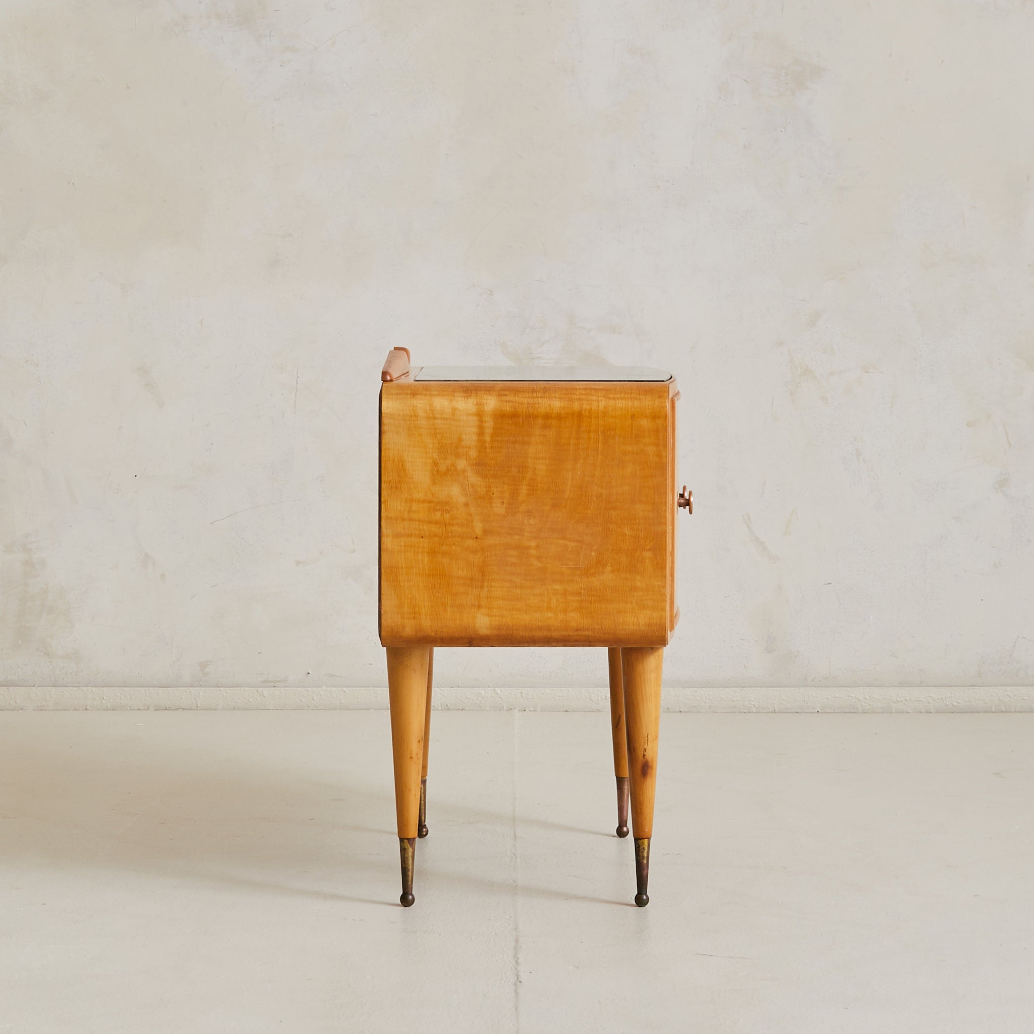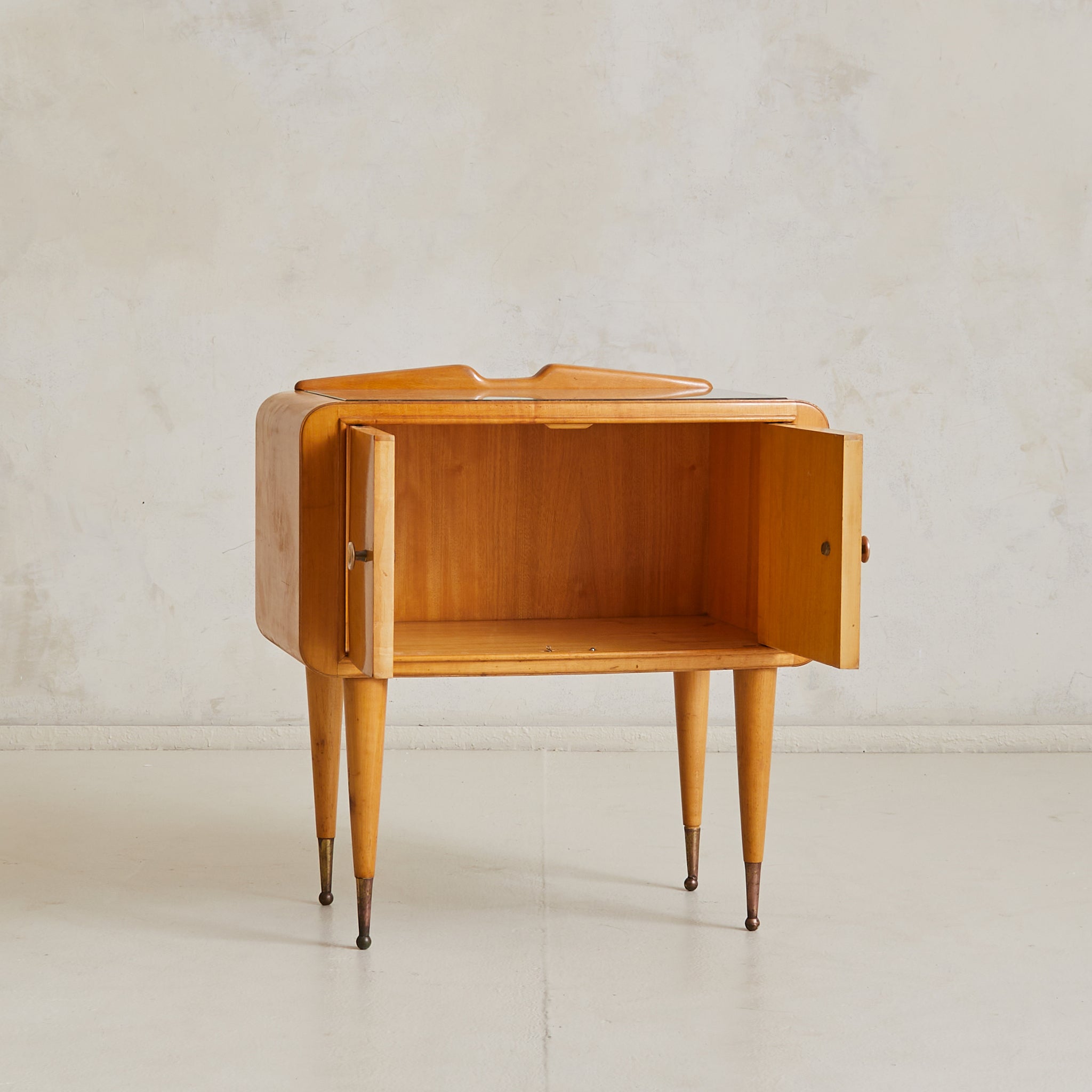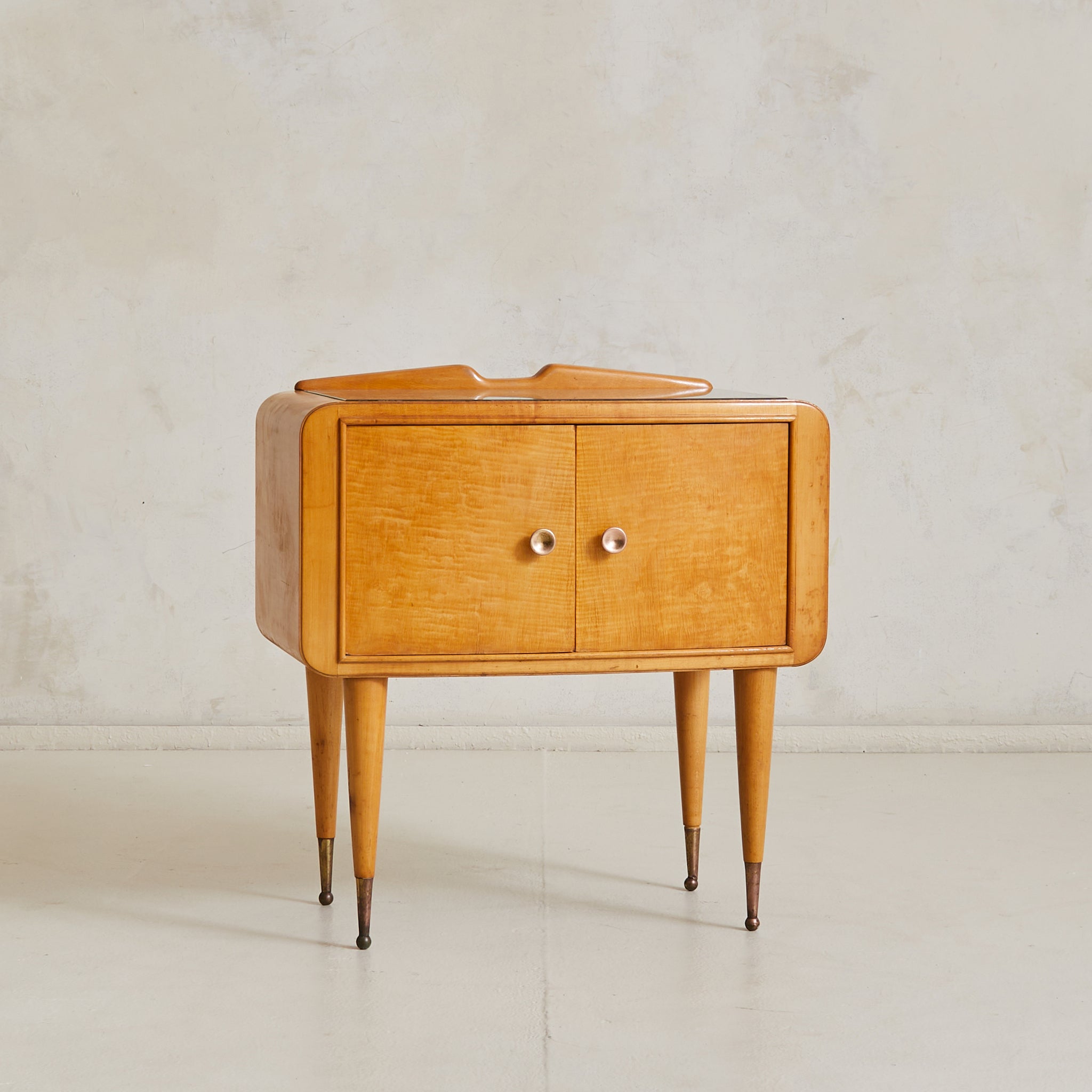 A honeyed Italian nightstand from the 1950s with softly rounded corners and an inset glass top. The frame is crafted from richly figured wood with a light, lustrous finish—its grain subtly shifting in tone. Two doors with petite round pulls conceal an open interior, while tapered legs capped in patinated brass ground the silhouette.