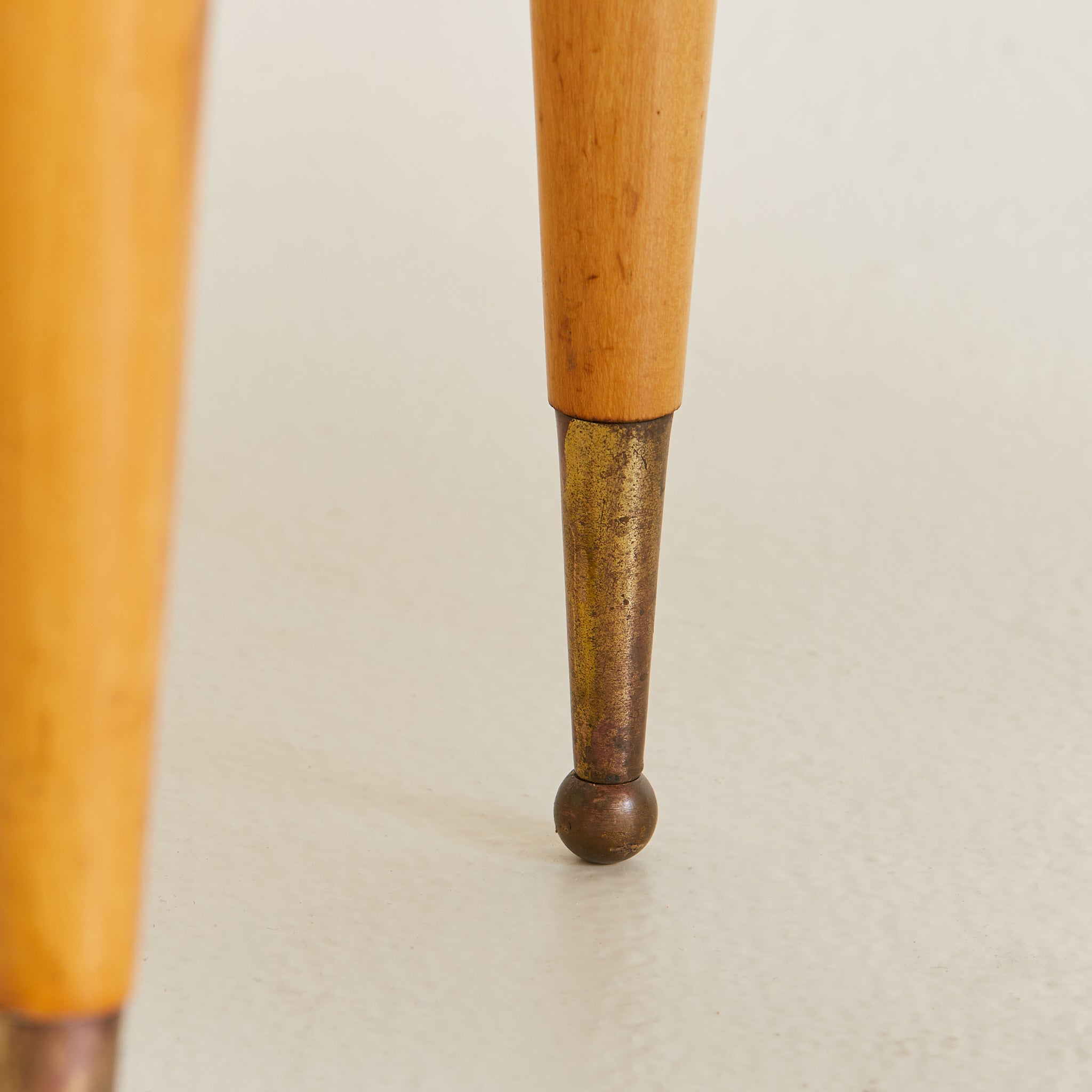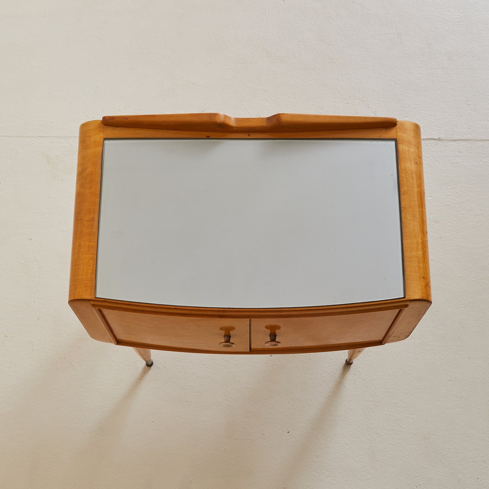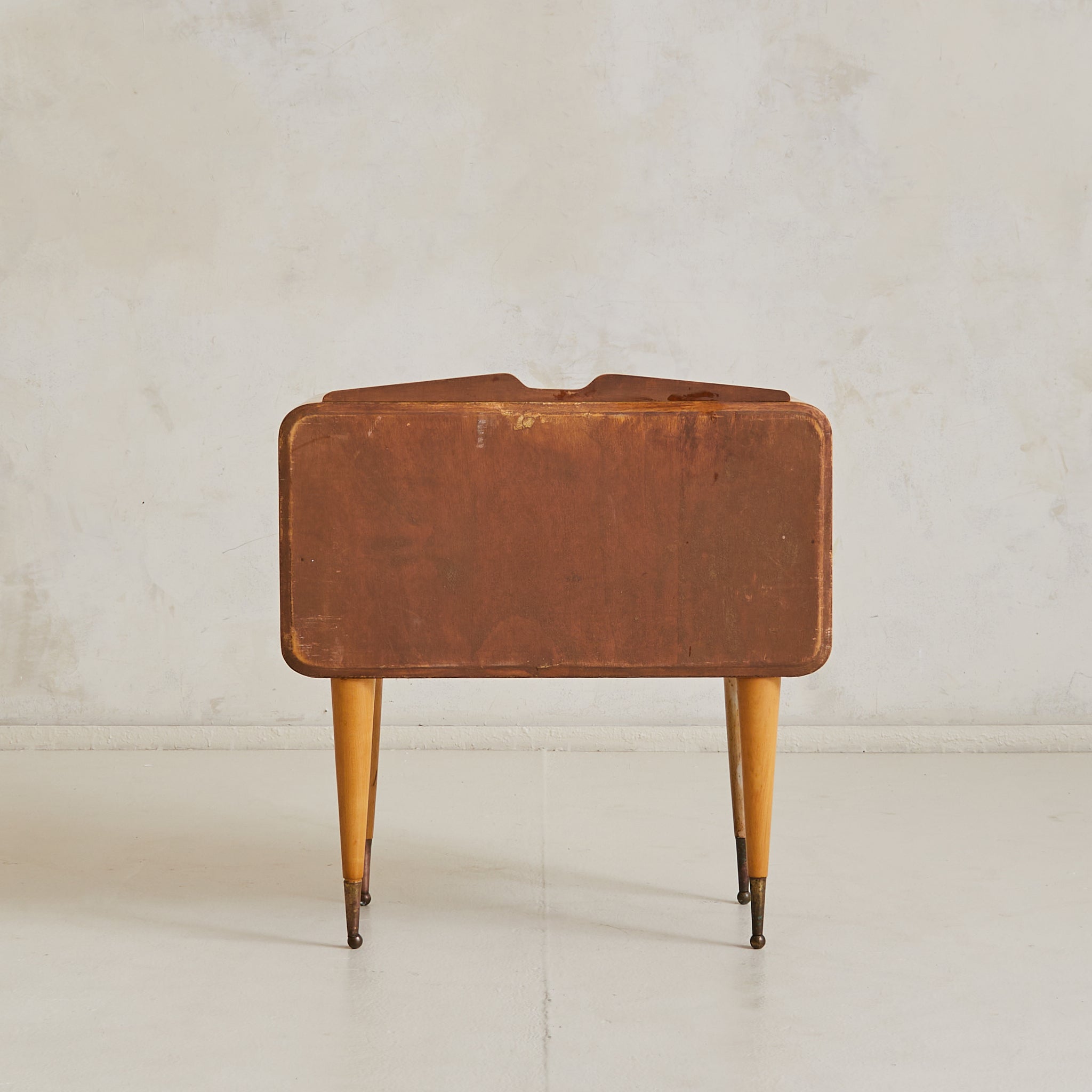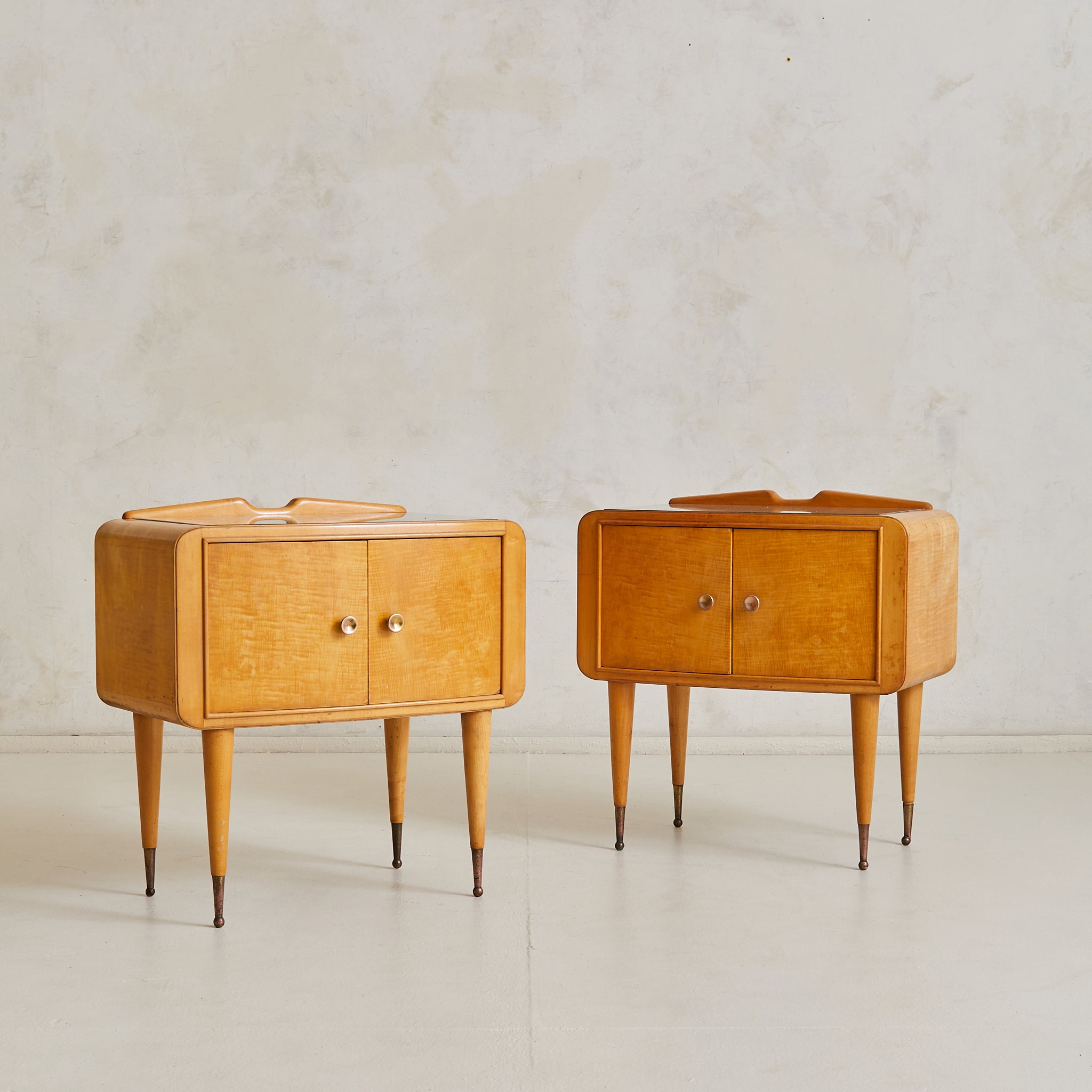 A honeyed Italian nightstand from the 1950s with softly rounded corners and an inset glass top. The frame is crafted from richly figured wood with a light, lustrous finish—its grain subtly shifting in tone. Two doors with petite round pulls conceal an open interior, while tapered legs capped in patinated brass ground the silhouette.