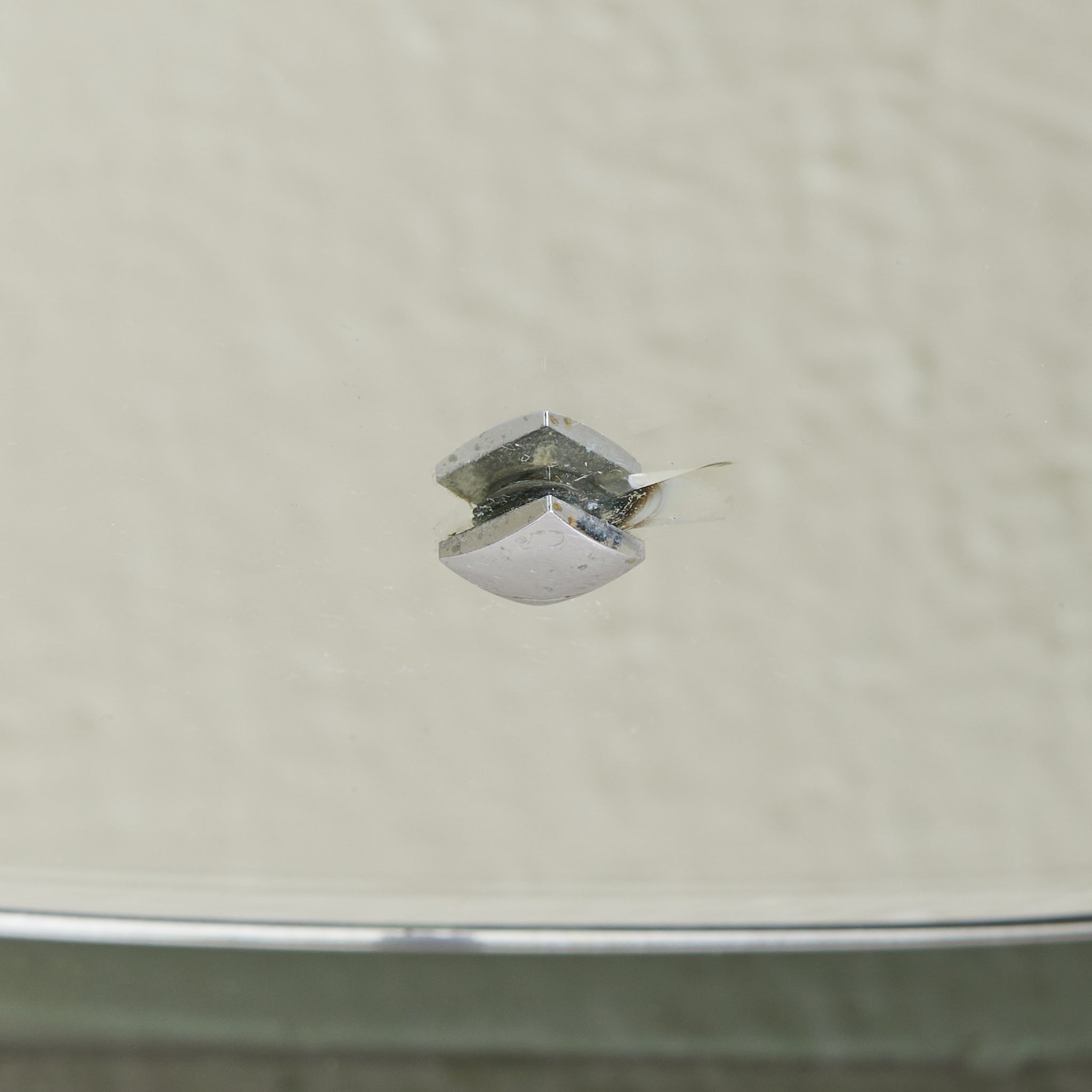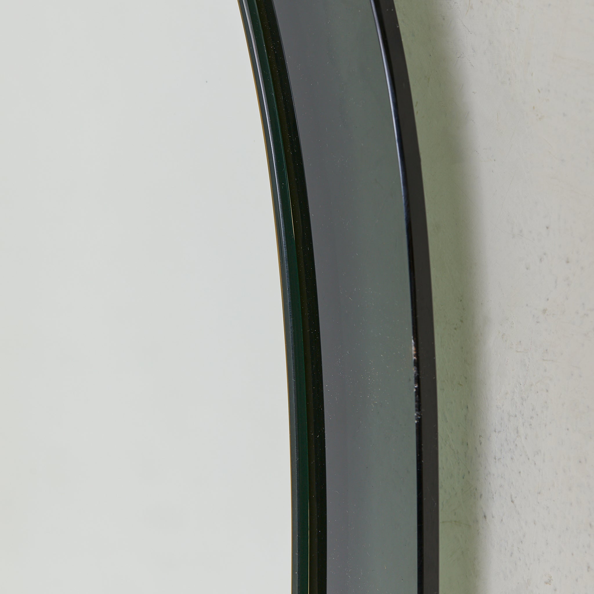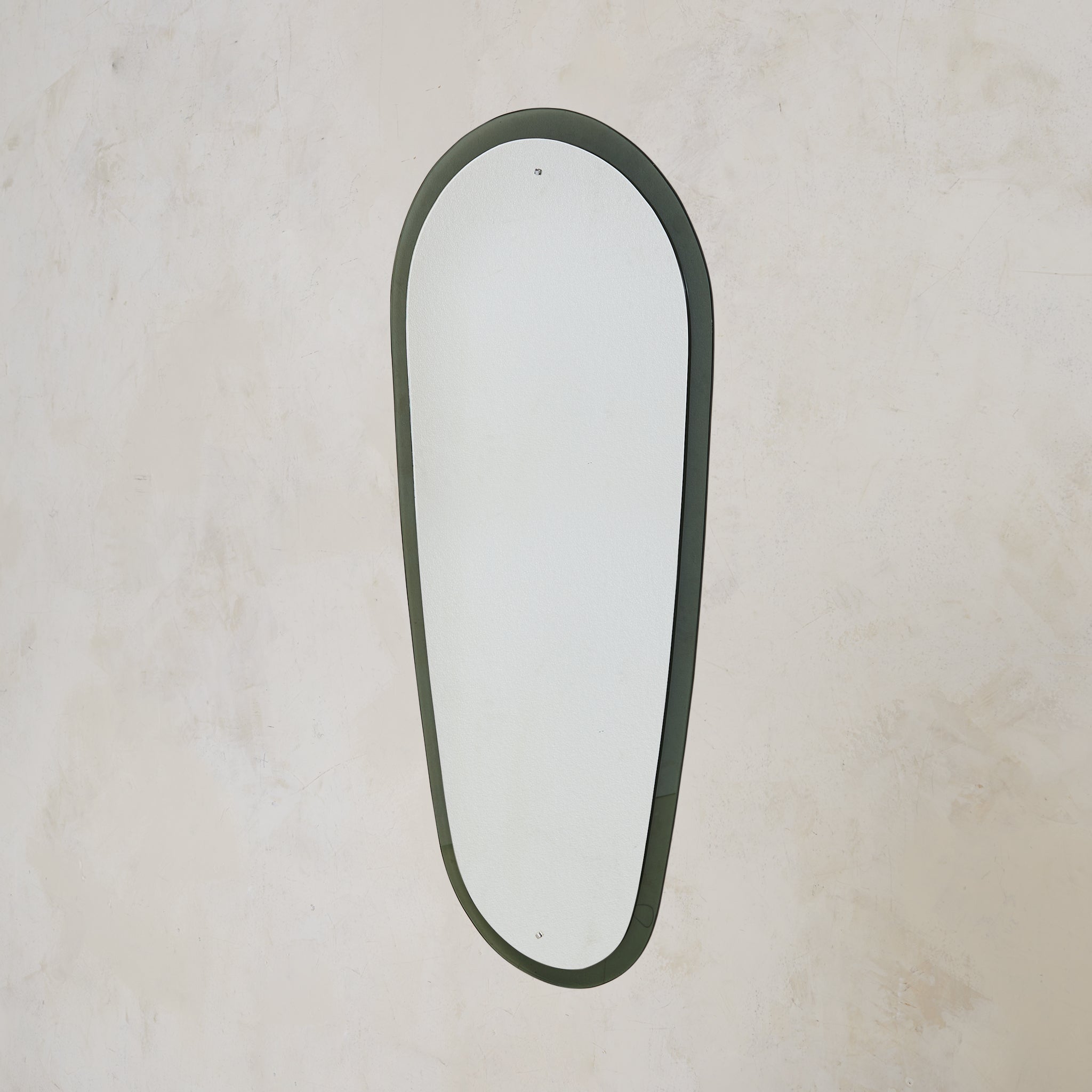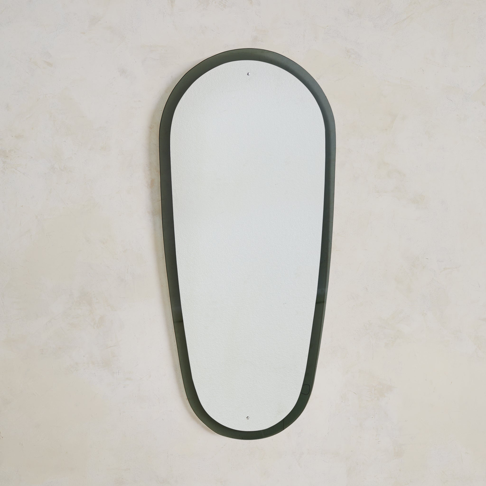A 1960s Italian wall mirror rendered in smoked glass. The floor-length silhouette stretches over five feet tall, its elongated frame gently rounded at the top and tapering to a soft curve below. Thick, smoky glass borders the mirror plate, catching shadow and light along the edges. Subtle metal hardware complements the sculptural form.