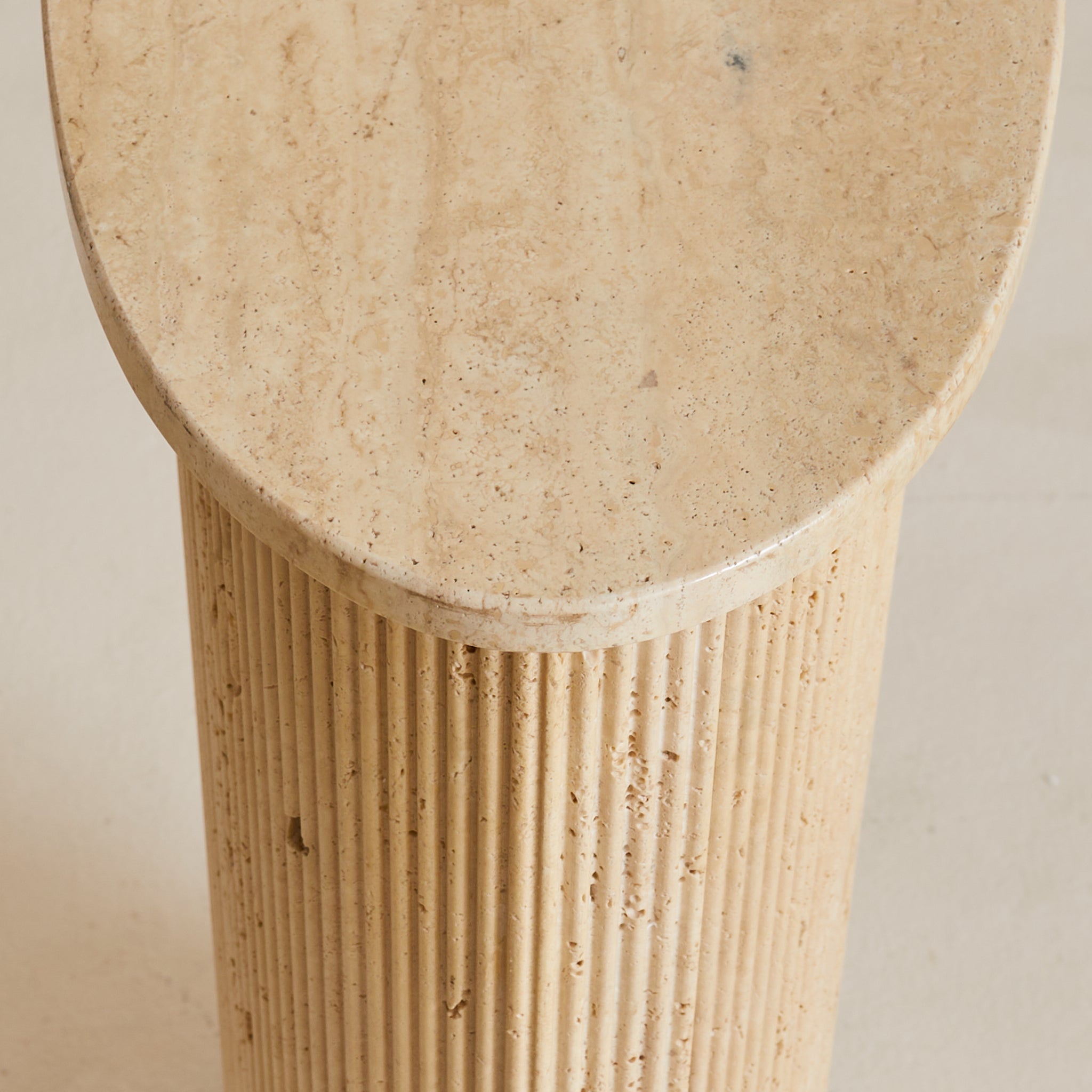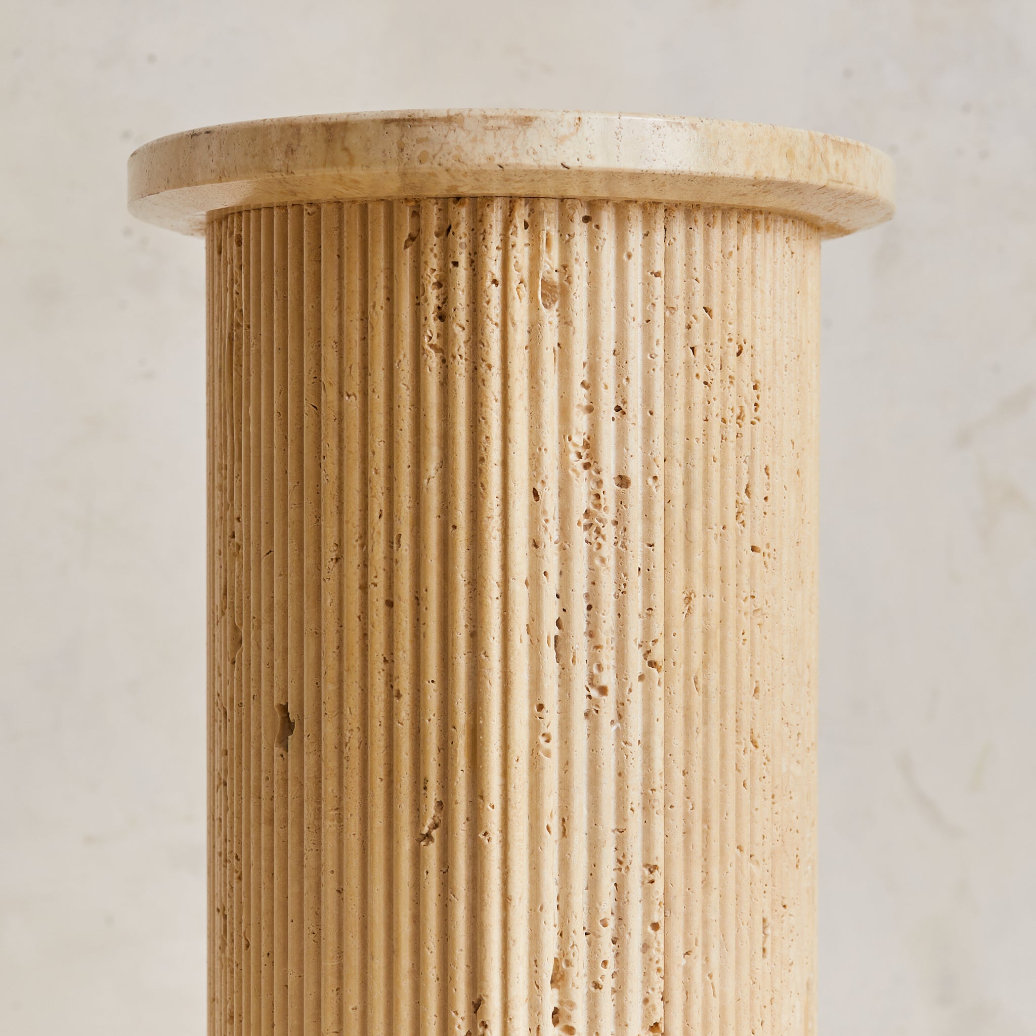 A 1970s Italian pedestal carved from honed porous travertine. The column is deeply fluted and capped with a softly rounded oval top. Its base rests on stacked travertine and black marble, an elegant contrast of tone and finish. At just under 30 inches high, it serves effortlessly as a plinth for sculpture or vessel.