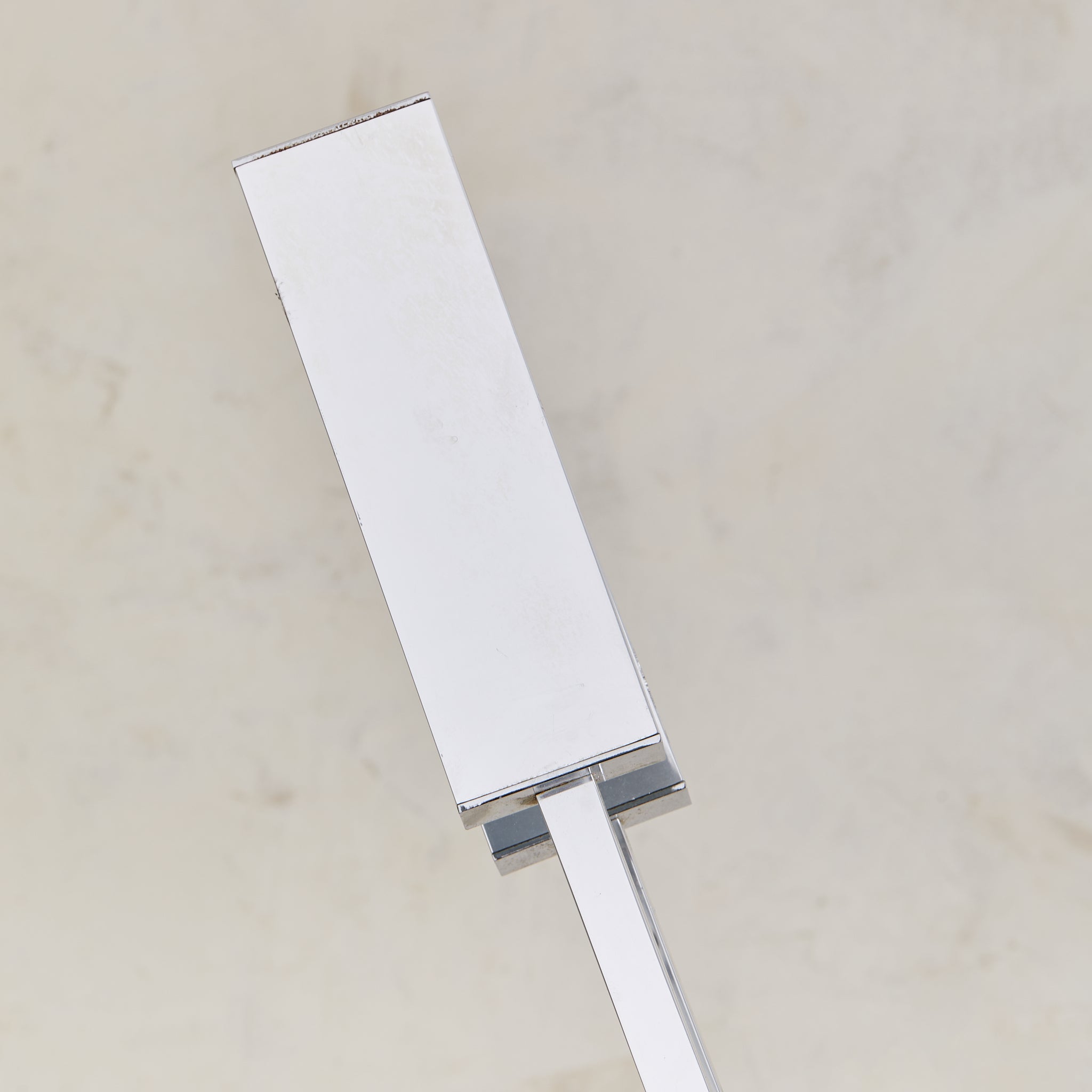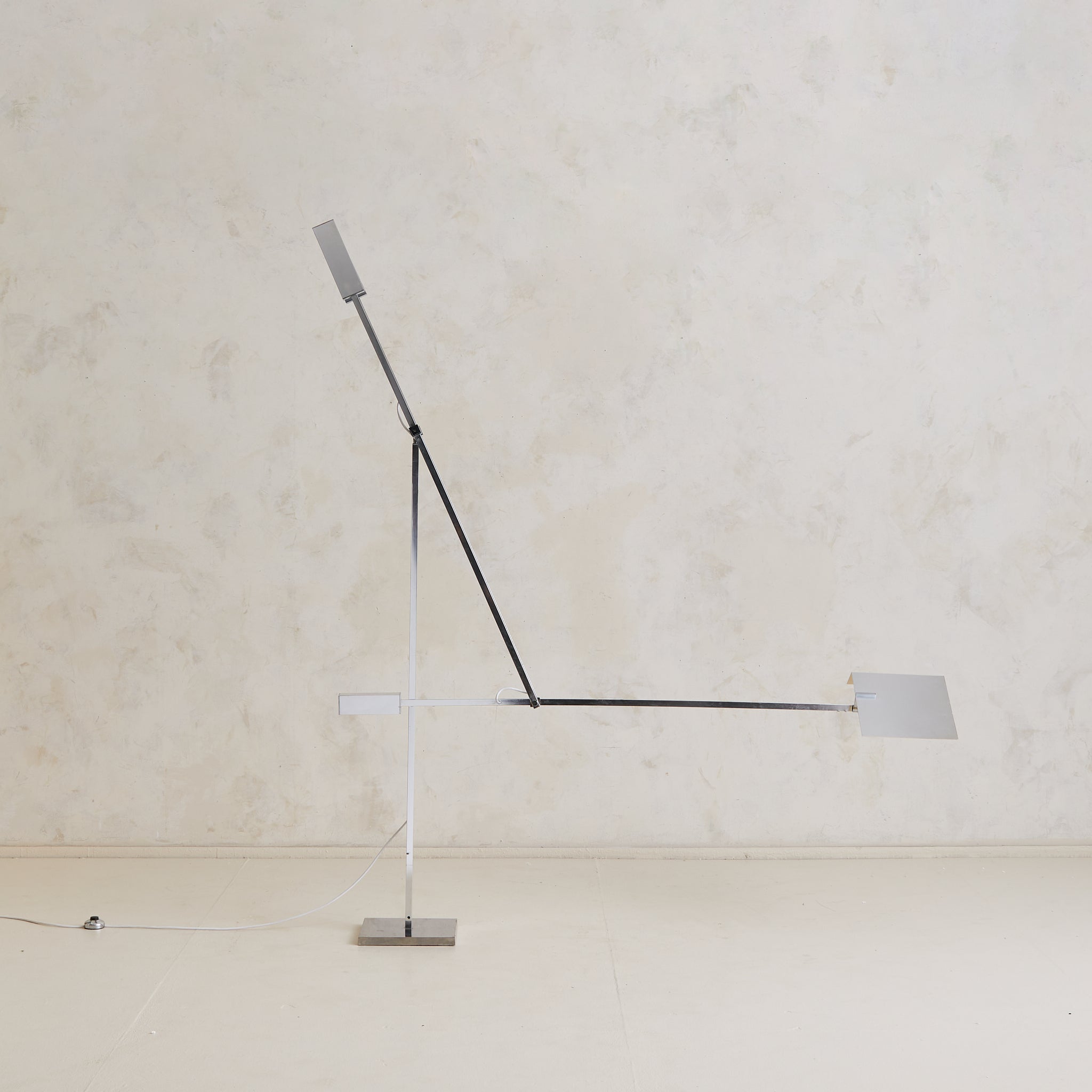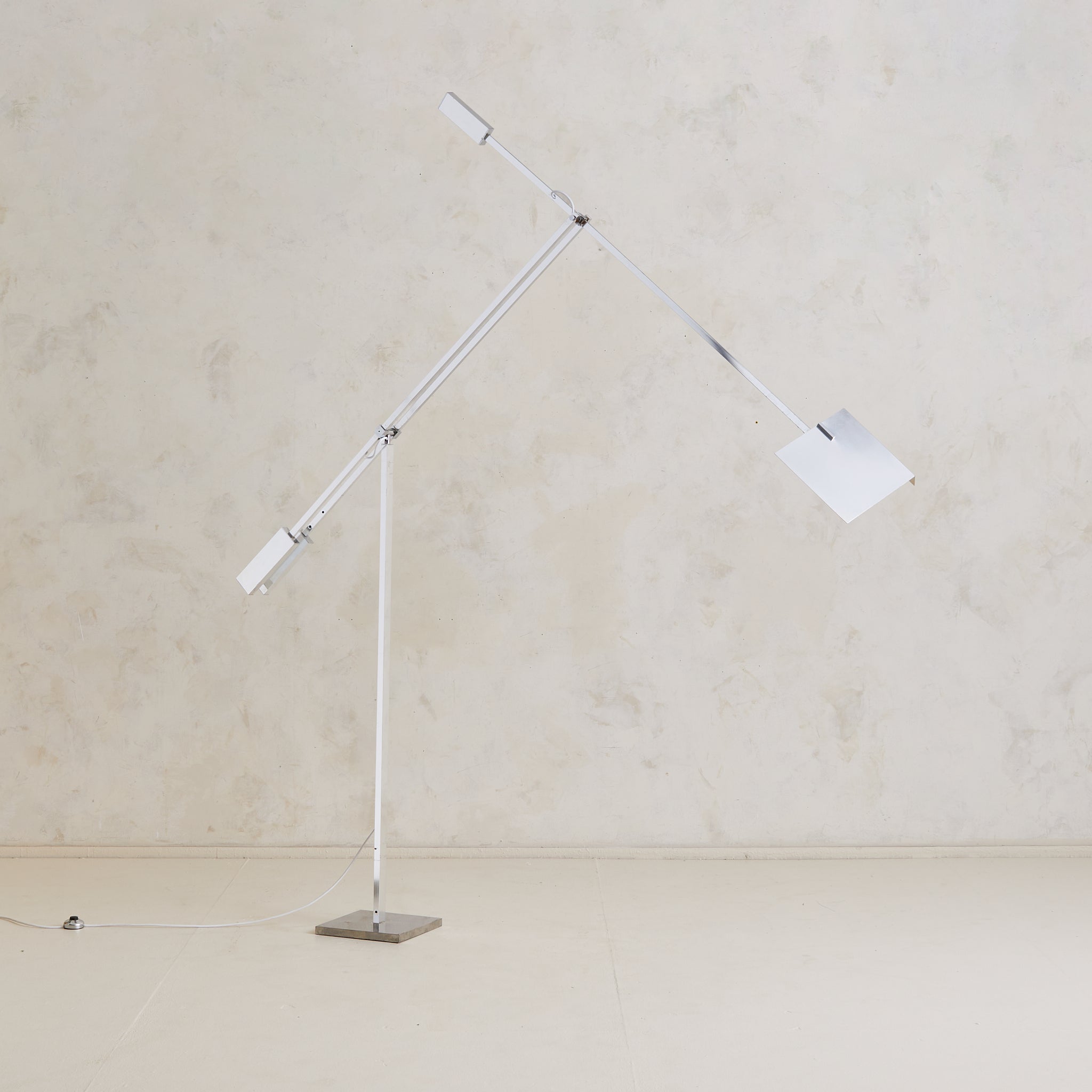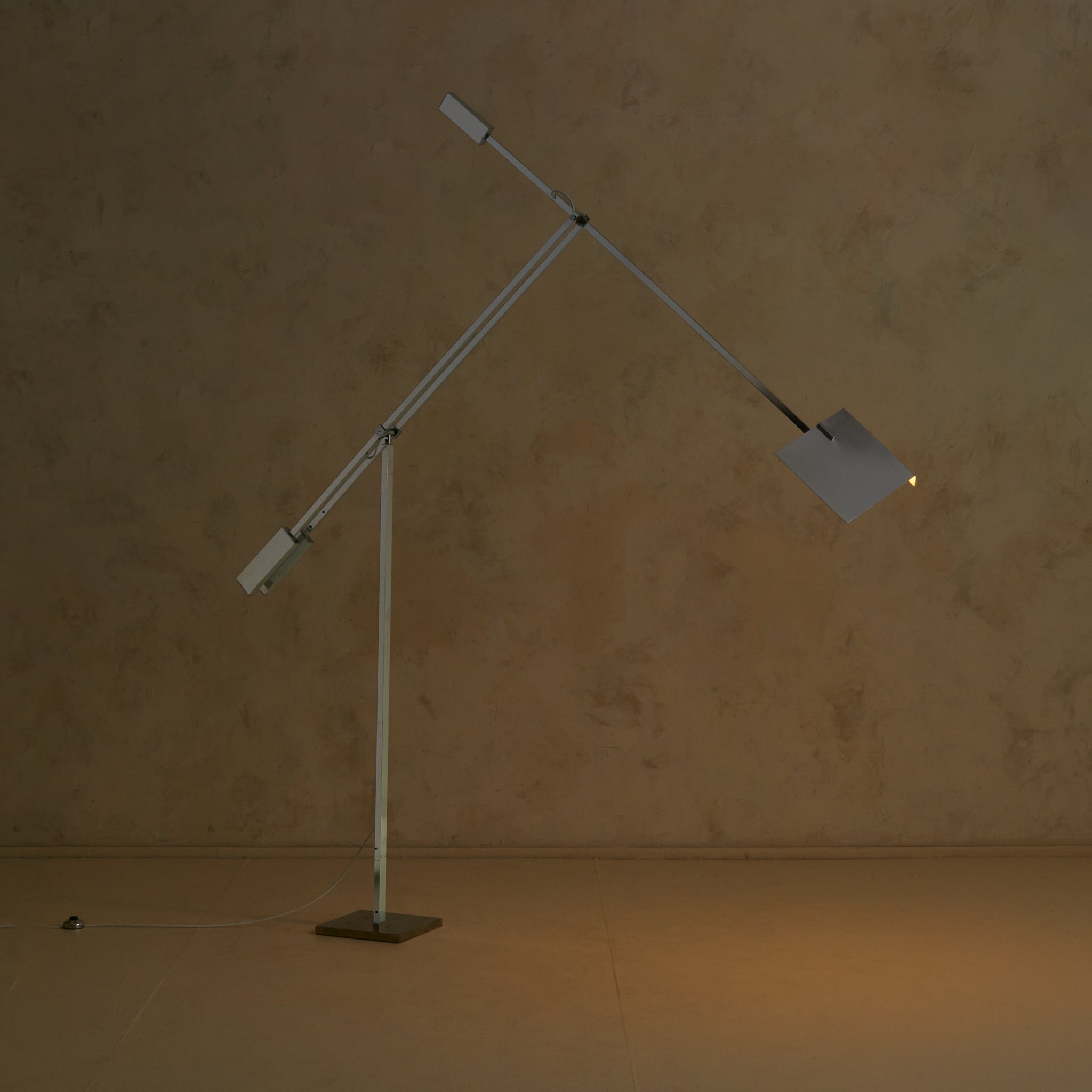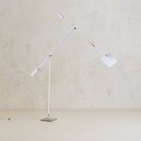 Designed by Angelo Brotto for Esperia in the 1970s, the Giraffa floor lamp pairs Italian minimalism with precise engineering. Linear and architectural in form, it’s constructed of satin-finished aluminum with chromed brass accents and a counterweight system that allows for fluid, gravity-balanced adjustment. Both arm and shade can be extended, tilted, or rotated.