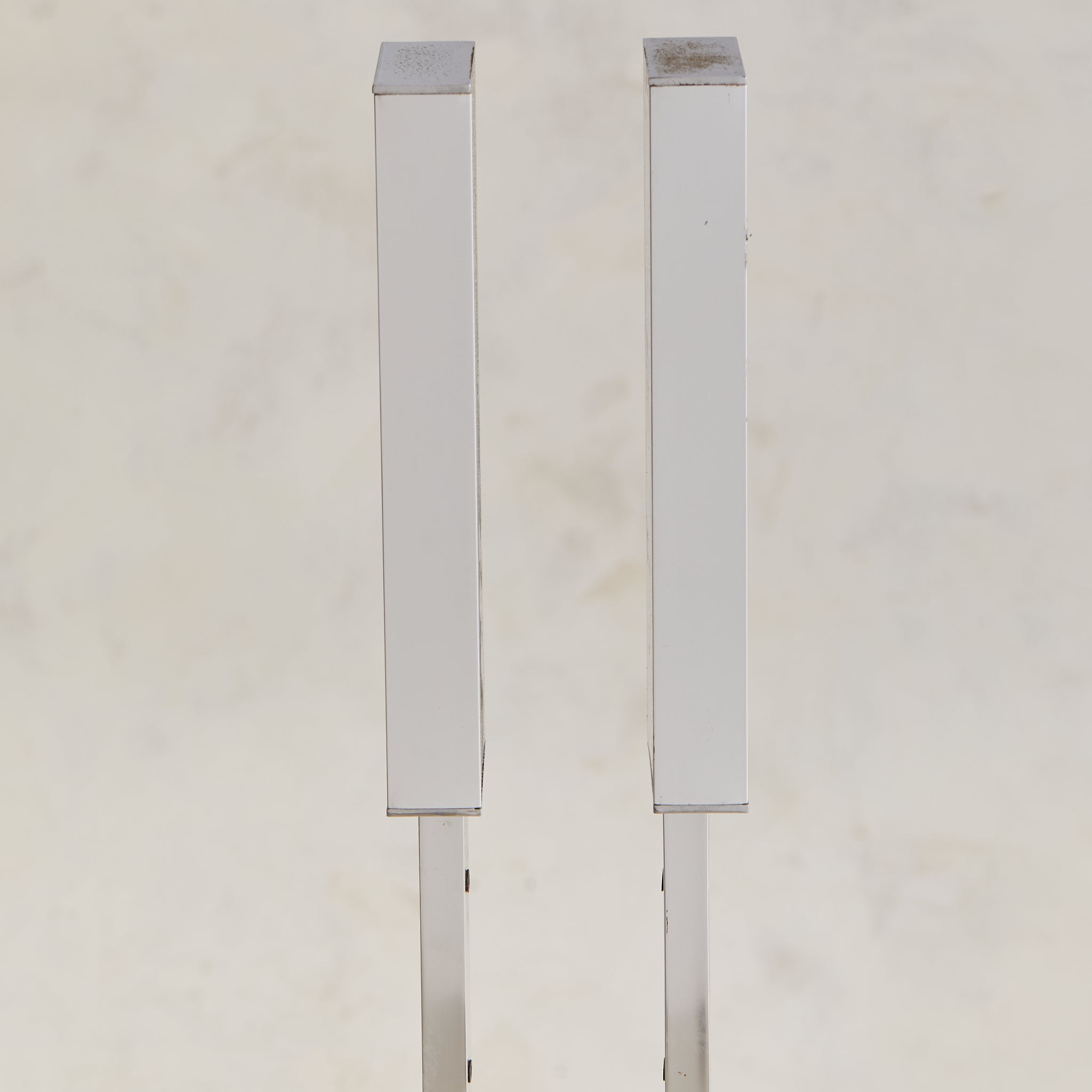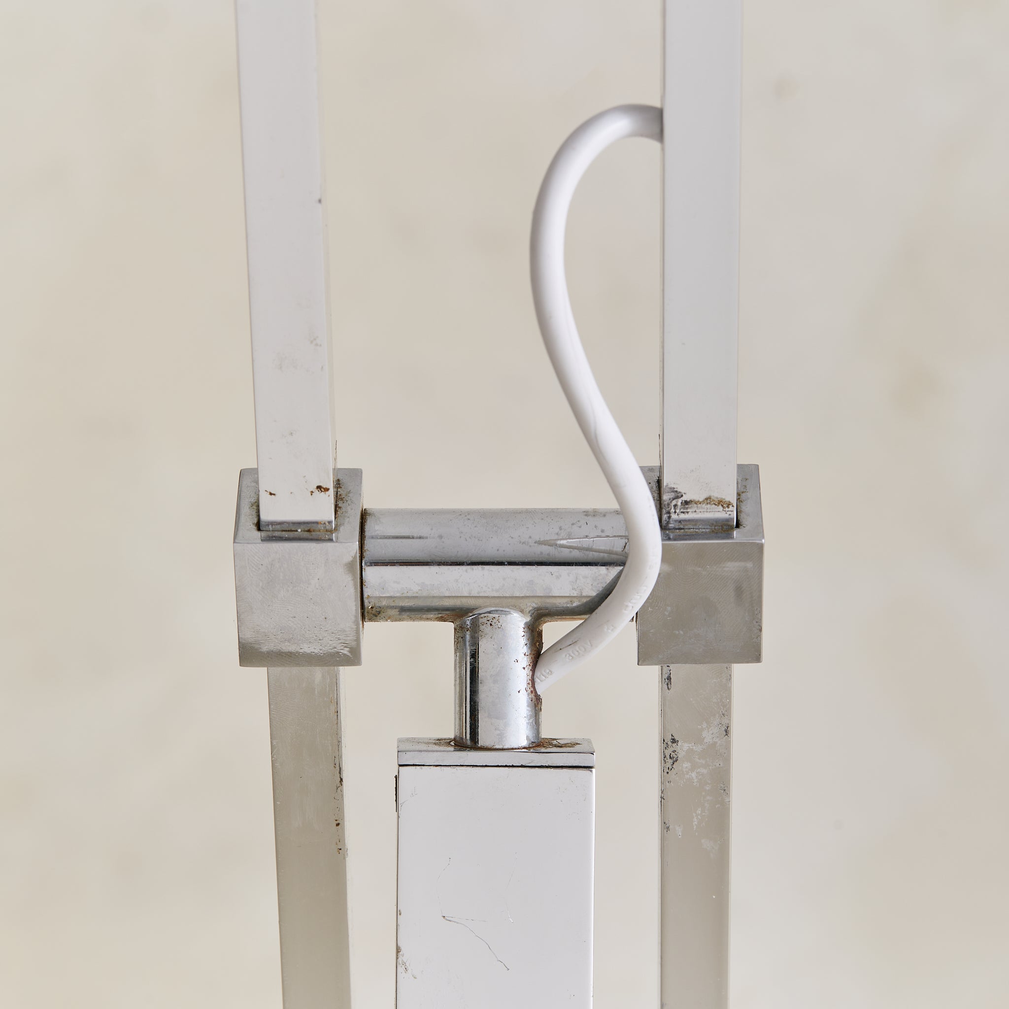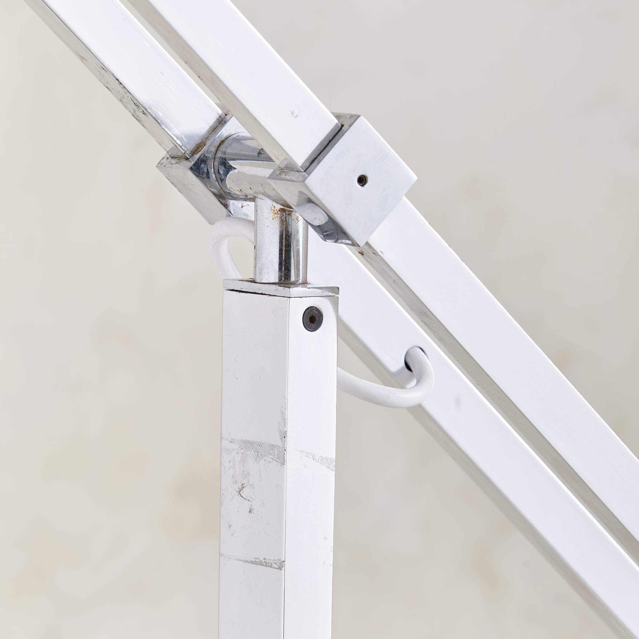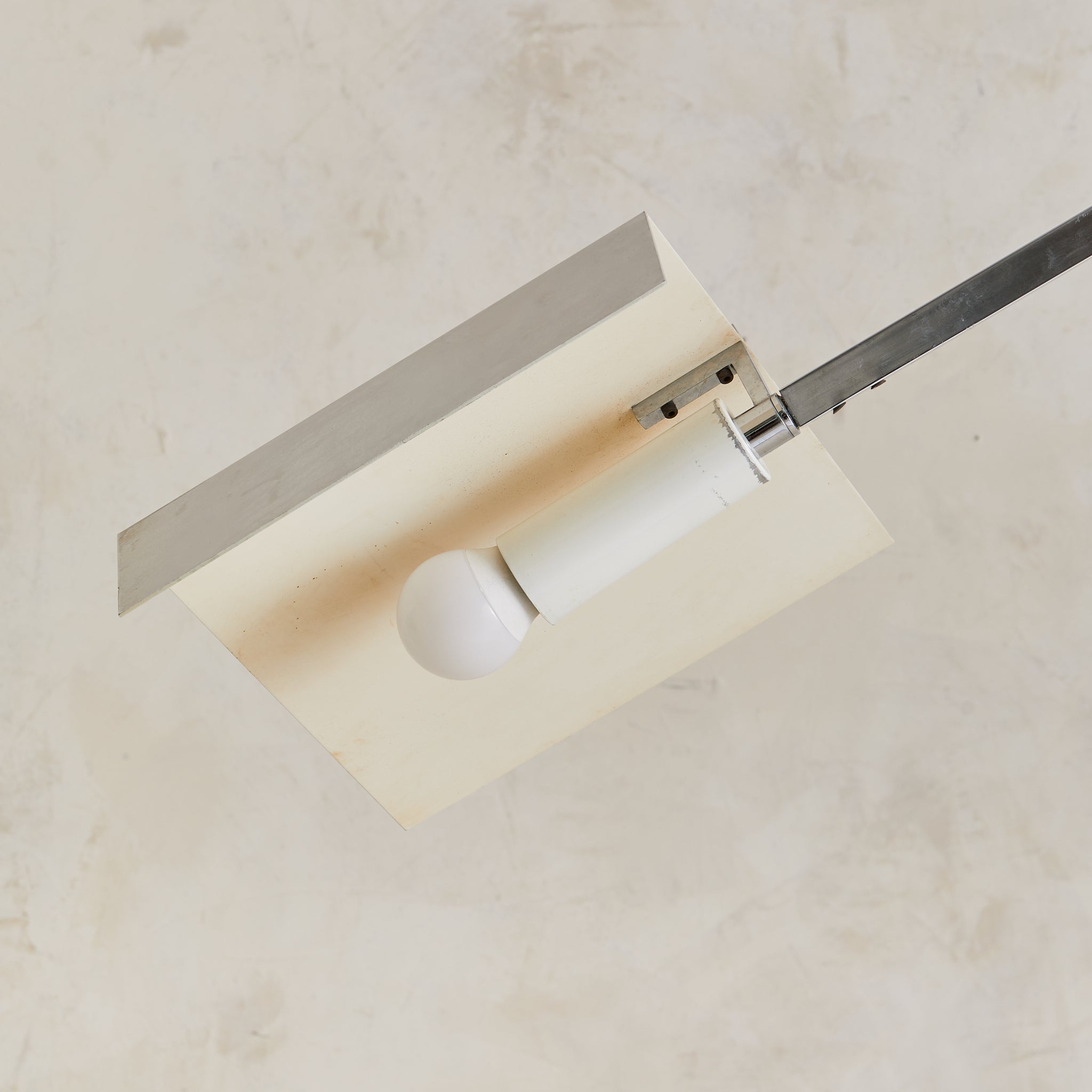 Designed by Angelo Brotto for Esperia in the 1970s, the Giraffa floor lamp pairs Italian minimalism with precise engineering. Linear and architectural in form, it’s constructed of satin-finished aluminum with chromed brass accents and a counterweight system that allows for fluid, gravity-balanced adjustment. Both arm and shade can be extended, tilted, or rotated.