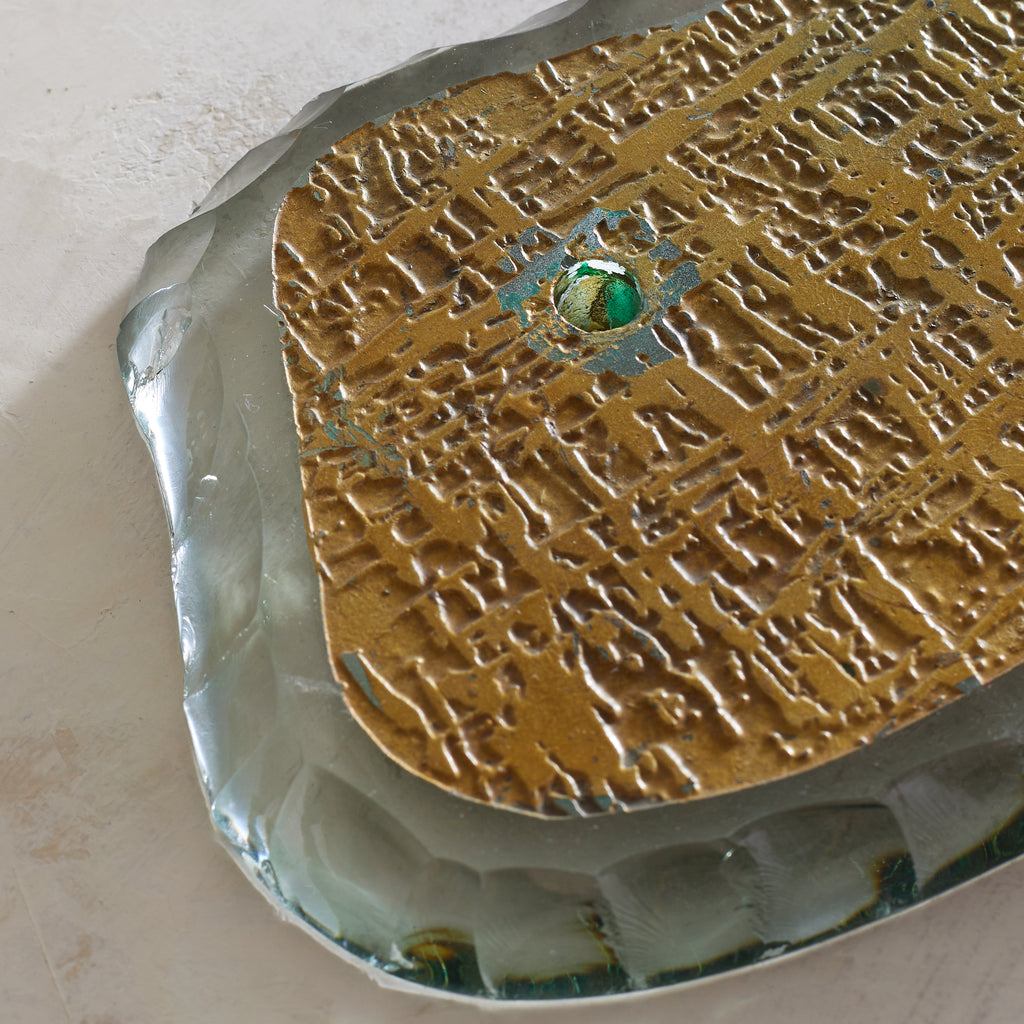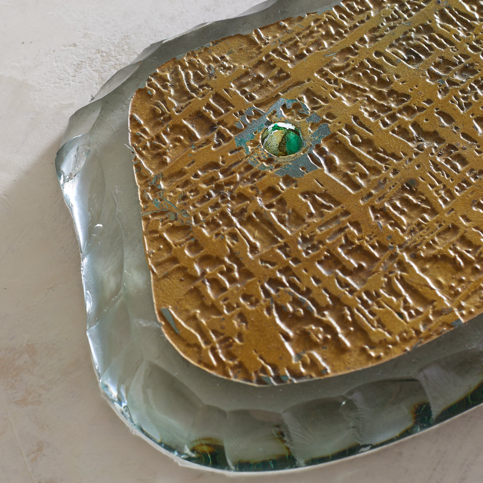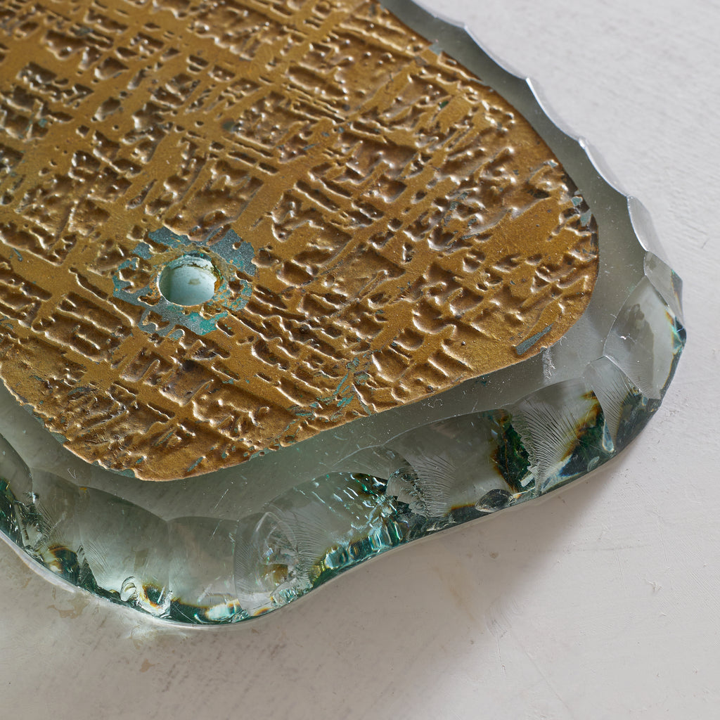 An oversized Italian furniture handle, in the manner of Fontana Arte, crafted from thick chiseled cut glass. It features a gilt finish at the center with an abstract motif. Likely from the 1950s, its generous proportions and substantial presence make it the perfect statement piece for cabinetry or casegoods.