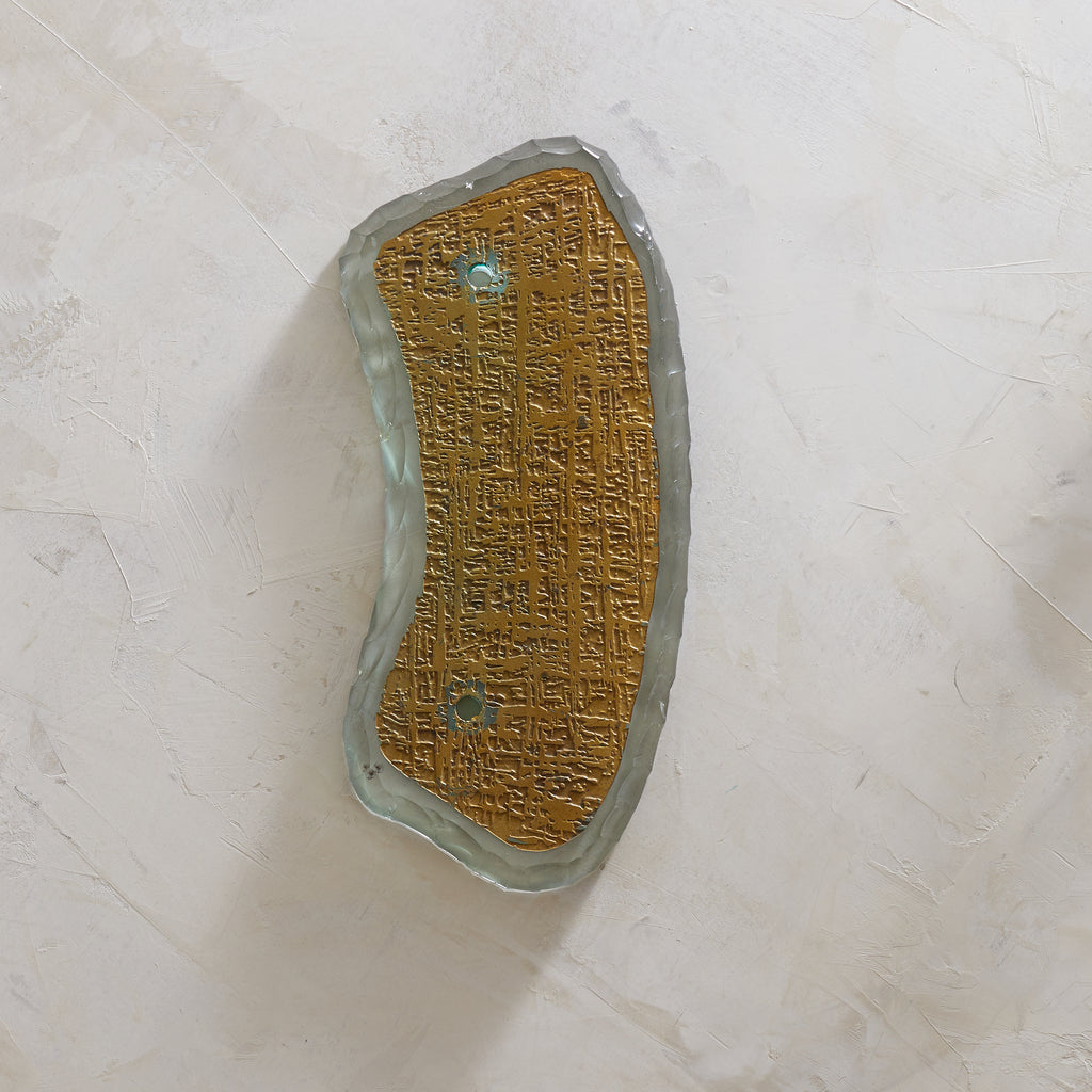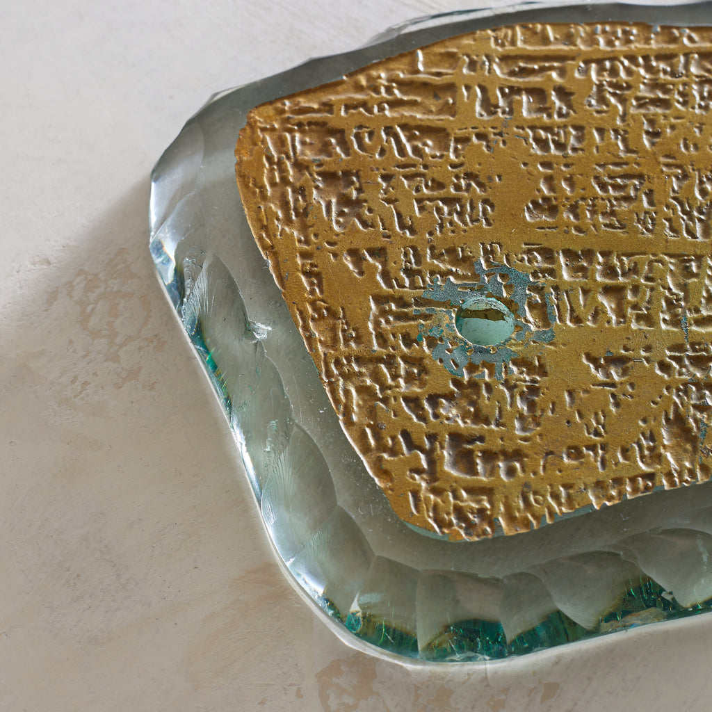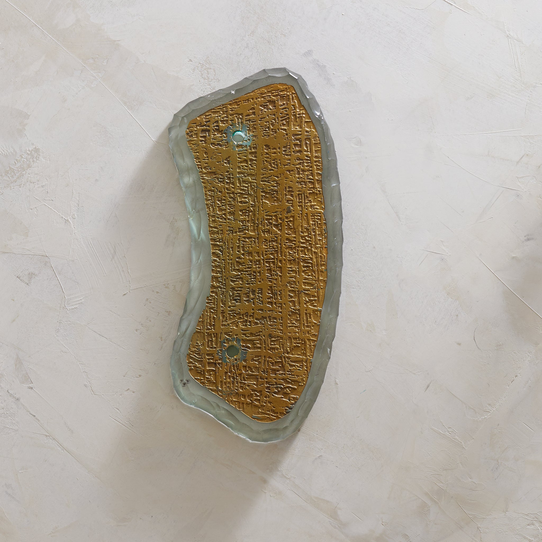 An oversized Italian furniture handle, in the manner of Fontana Arte, crafted from thick chiseled cut glass. It features a gilt finish at the center with an abstract motif. Likely from the 1950s, its generous proportions and substantial presence make it the perfect statement piece for cabinetry or casegoods.