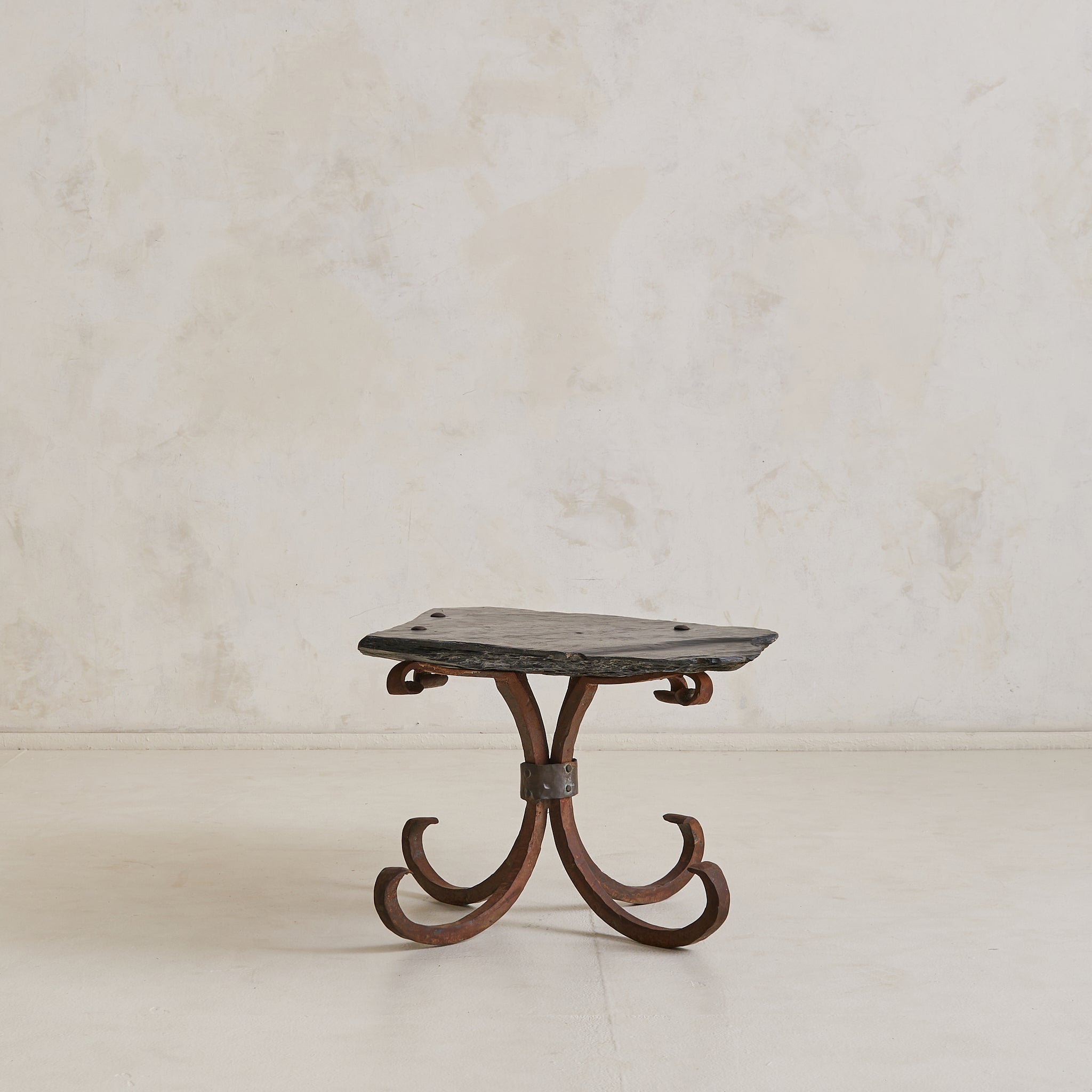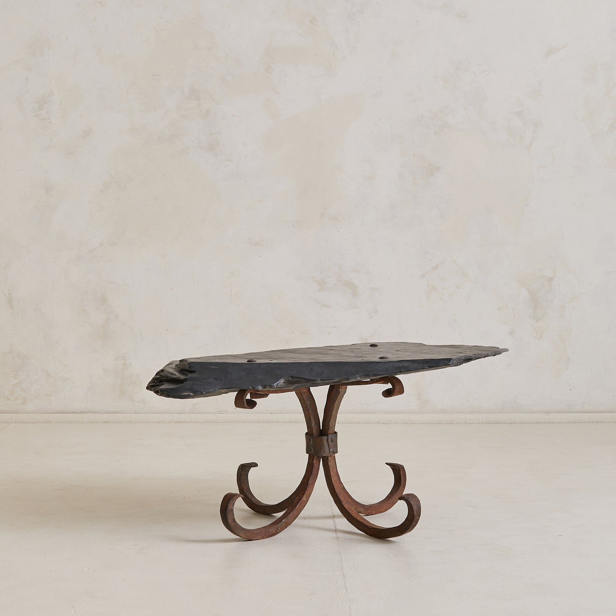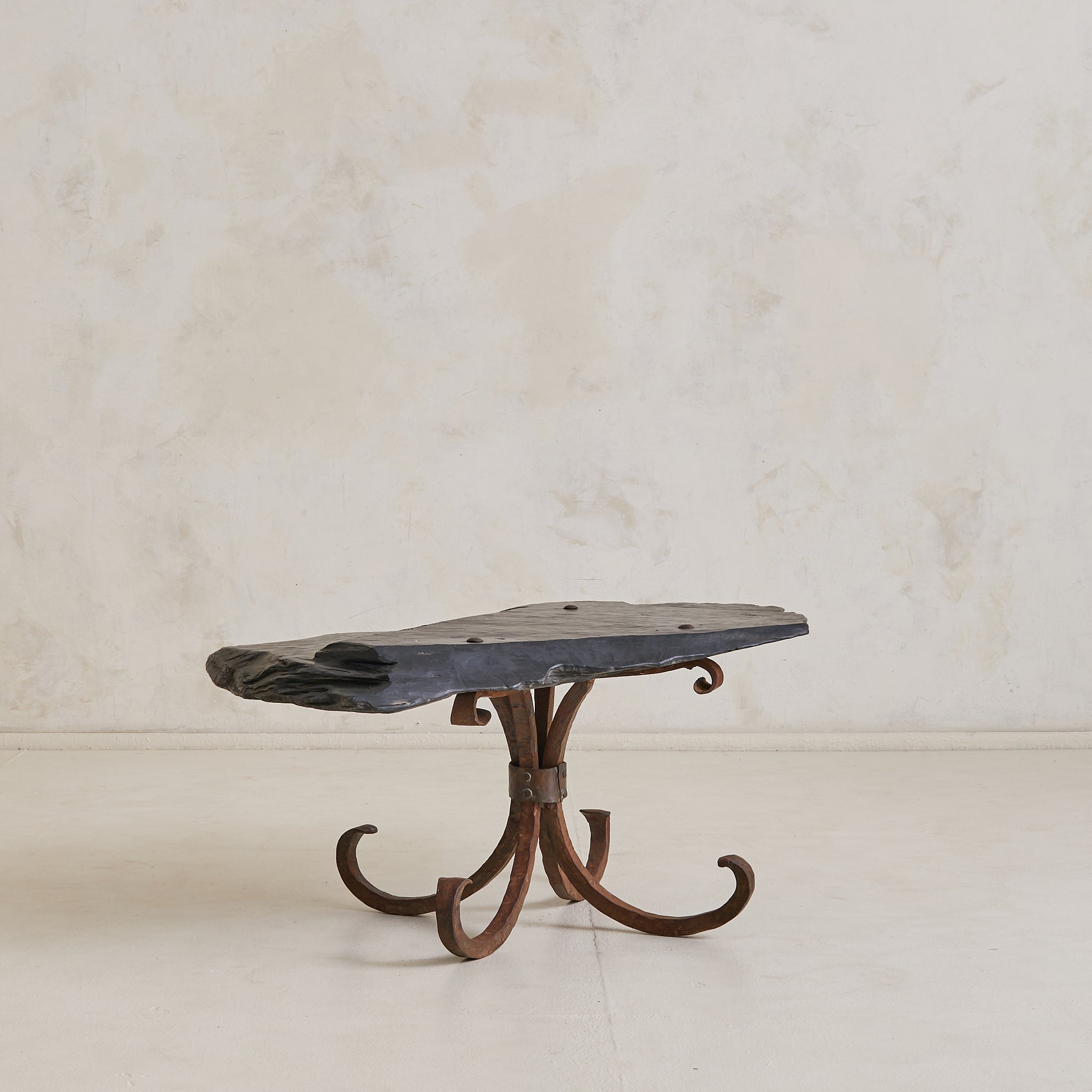 Sourced in Parma, Italy, this coffee table reads as both artifact and furniture—crafted with intention, shaped by time. The organic top is hand-hewn from a solid slab of slate, its surface deeply textured and edge left raw. Anchored by a hand-forged iron base with curled legs, the table carries the presence of a sculptural relic.