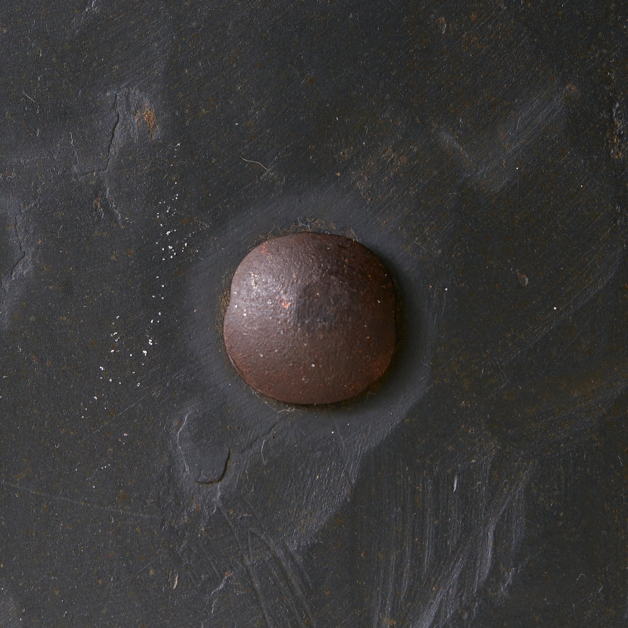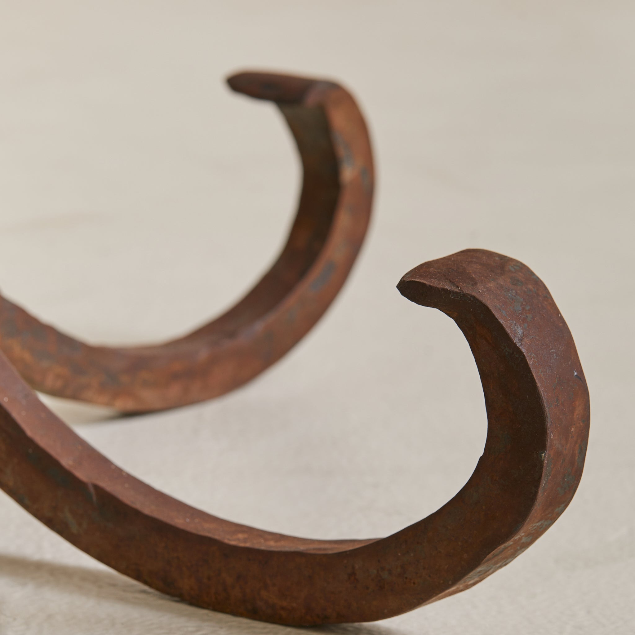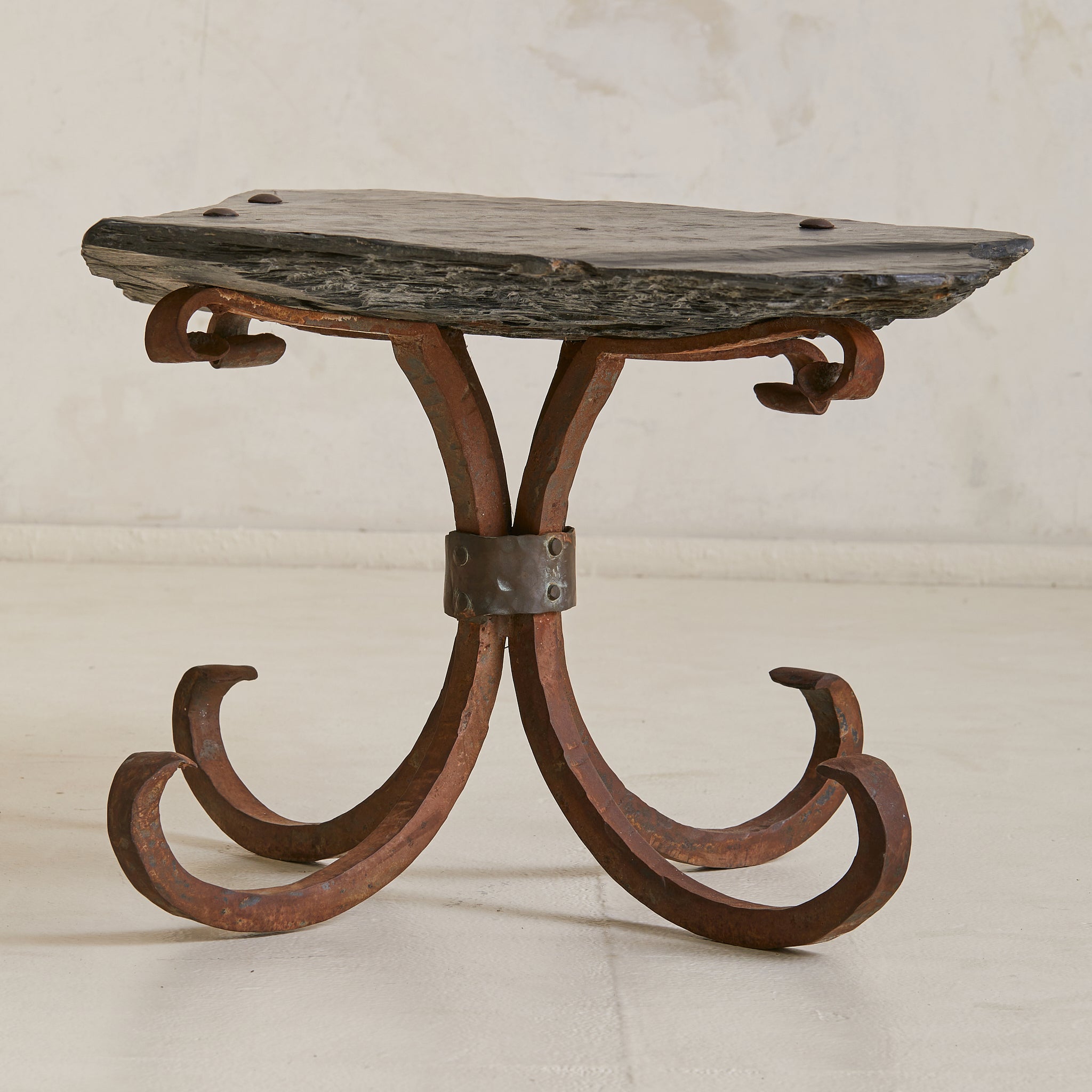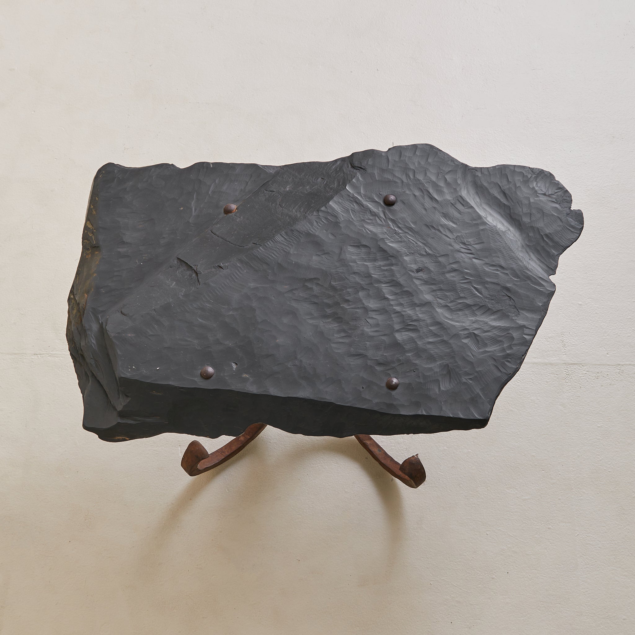 Sourced in Parma, Italy, this coffee table reads as both artifact and furniture—crafted with intention, shaped by time. The organic top is hand-hewn from a solid slab of slate, its surface deeply textured and edge left raw. Anchored by a hand-forged iron base with curled legs, the table carries the presence of a sculptural relic.