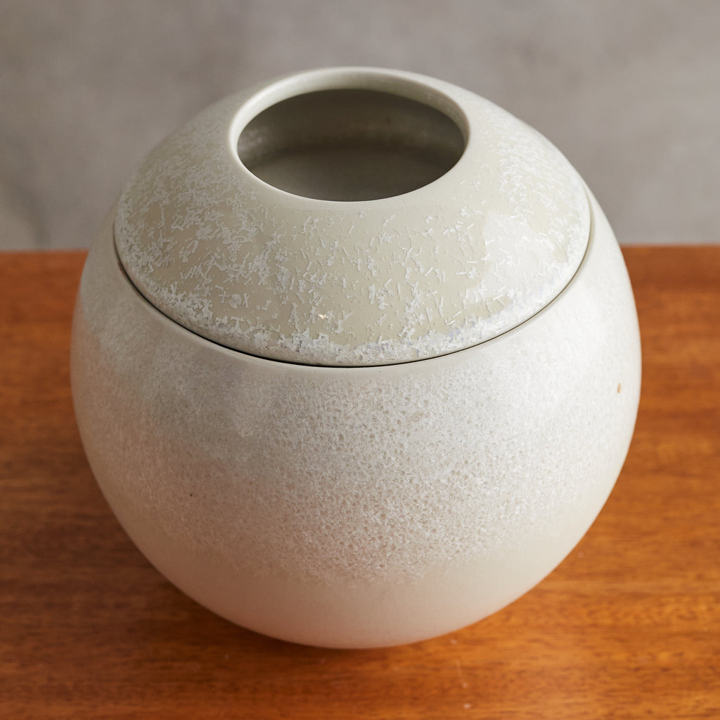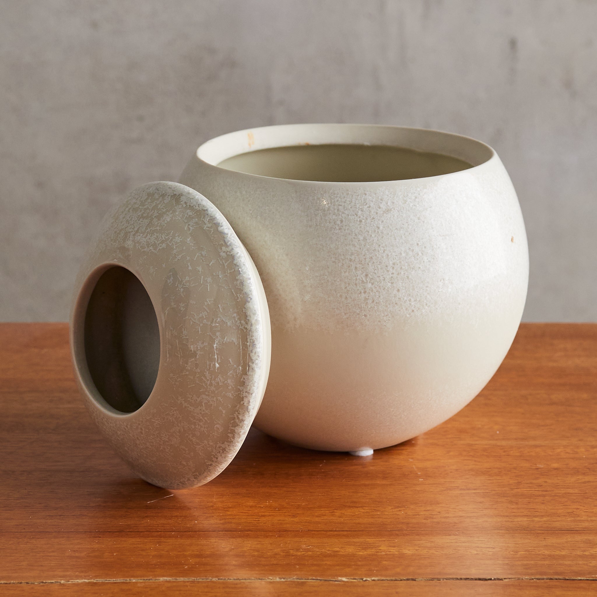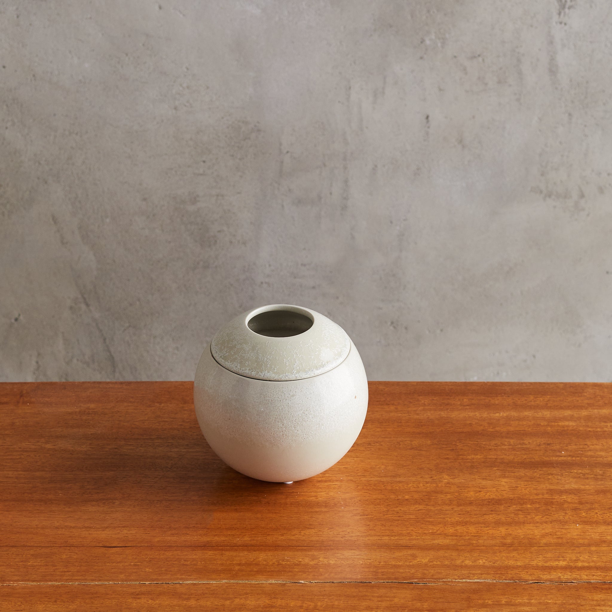 An Italian orb vase designed by Franco Bucci for Laboratorio Pesaro in the 1970s. This sculptural ceramic lidded vase features a spherical form and recessed opening. Its smooth glaze shifts from a muted ivory base to a delicate, crackled finish on the lid, creating a subtle interplay of texture and tone. Signed on the underside.