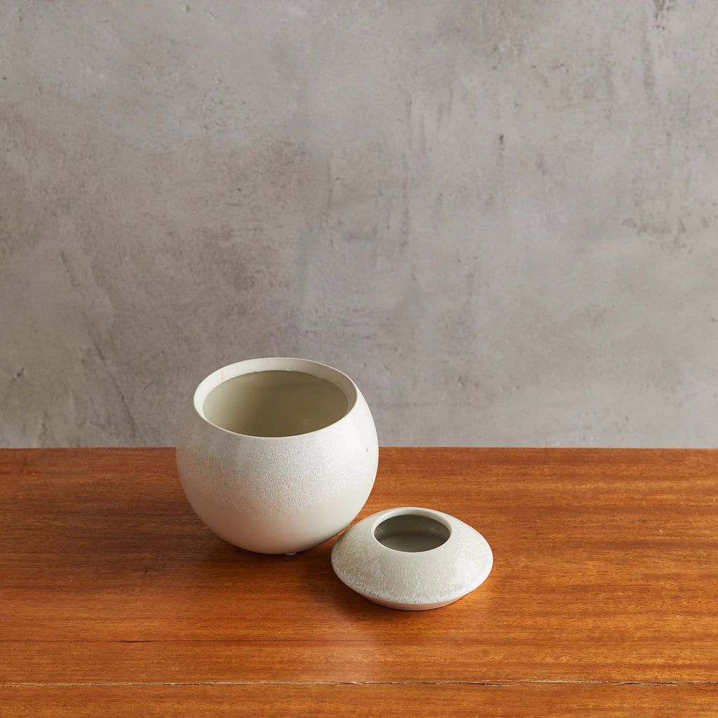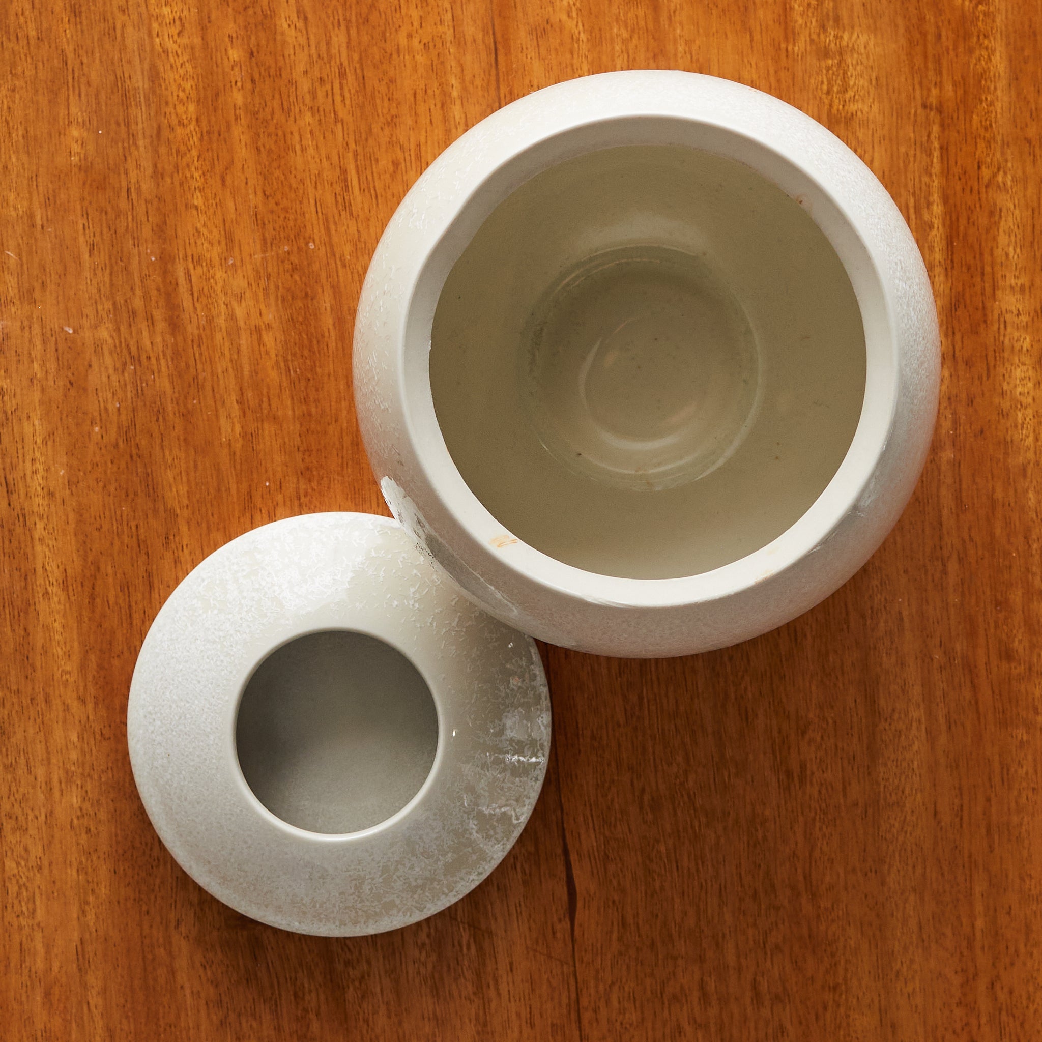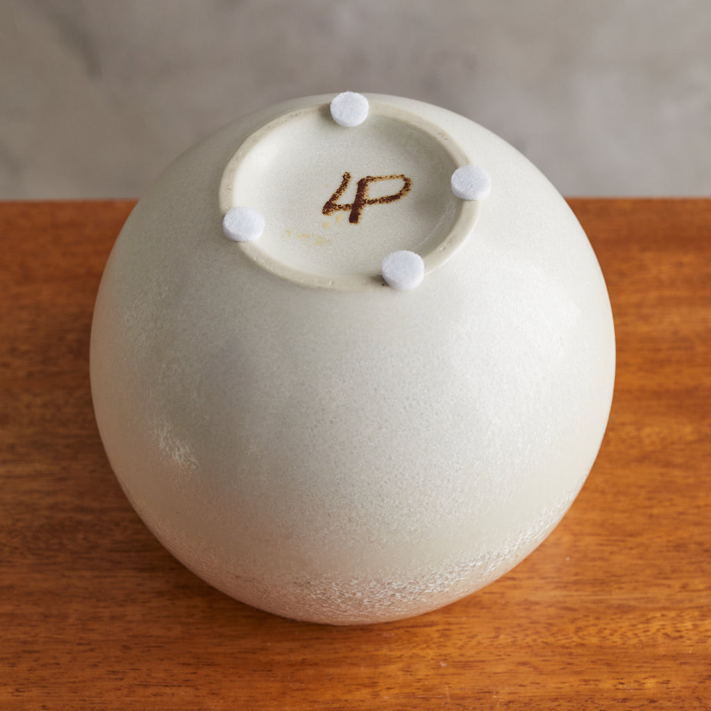 An Italian orb vase designed by Franco Bucci for Laboratorio Pesaro in the 1970s. This sculptural ceramic lidded vase features a spherical form and recessed opening. Its smooth glaze shifts from a muted ivory base to a delicate, crackled finish on the lid, creating a subtle interplay of texture and tone. Signed on the underside.