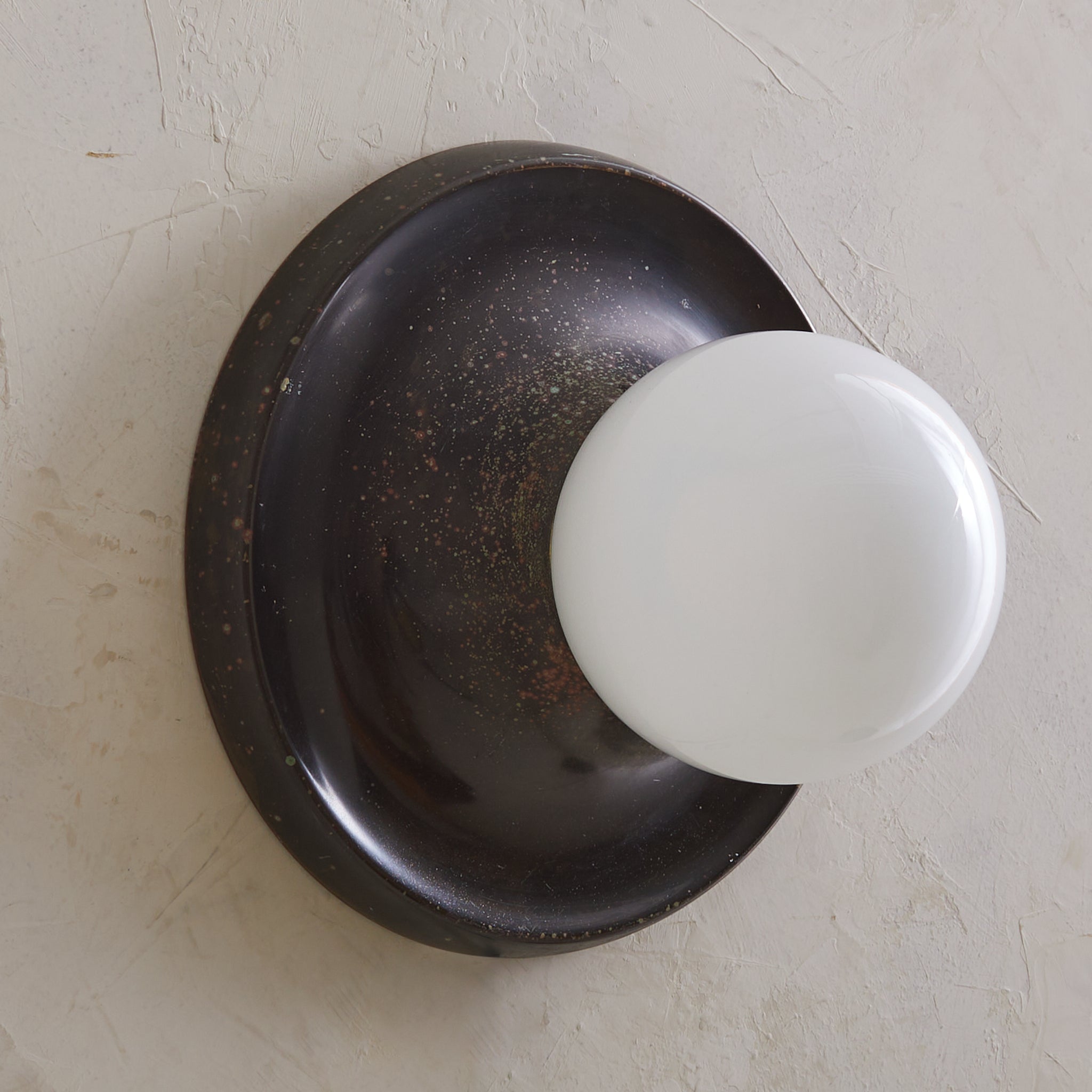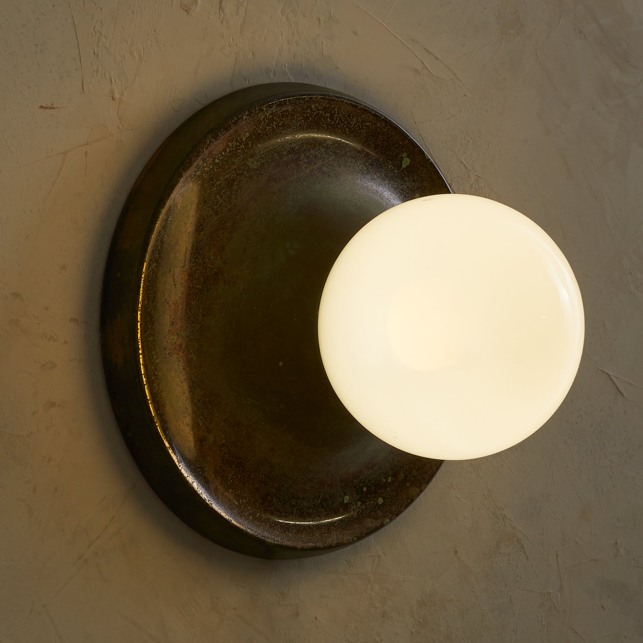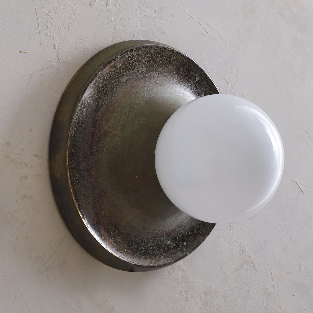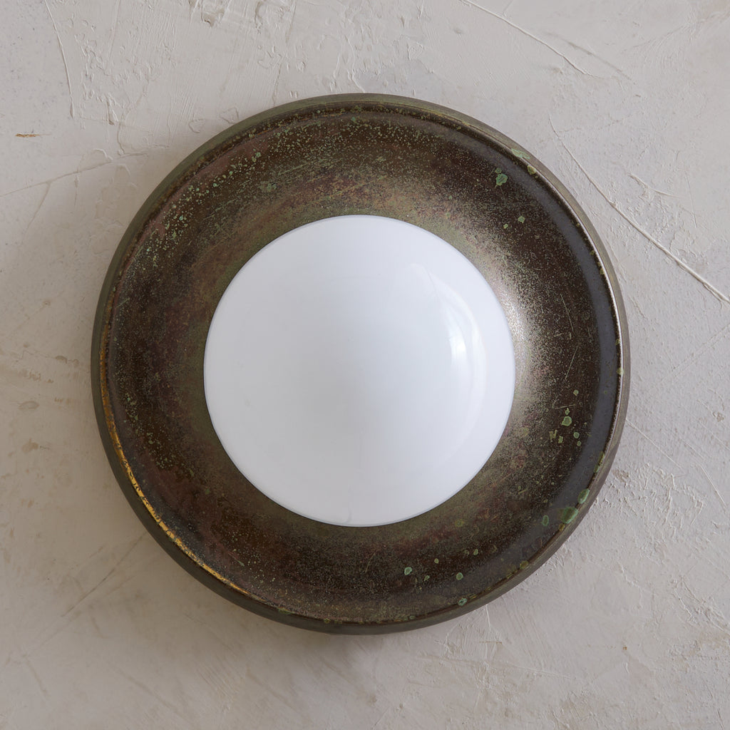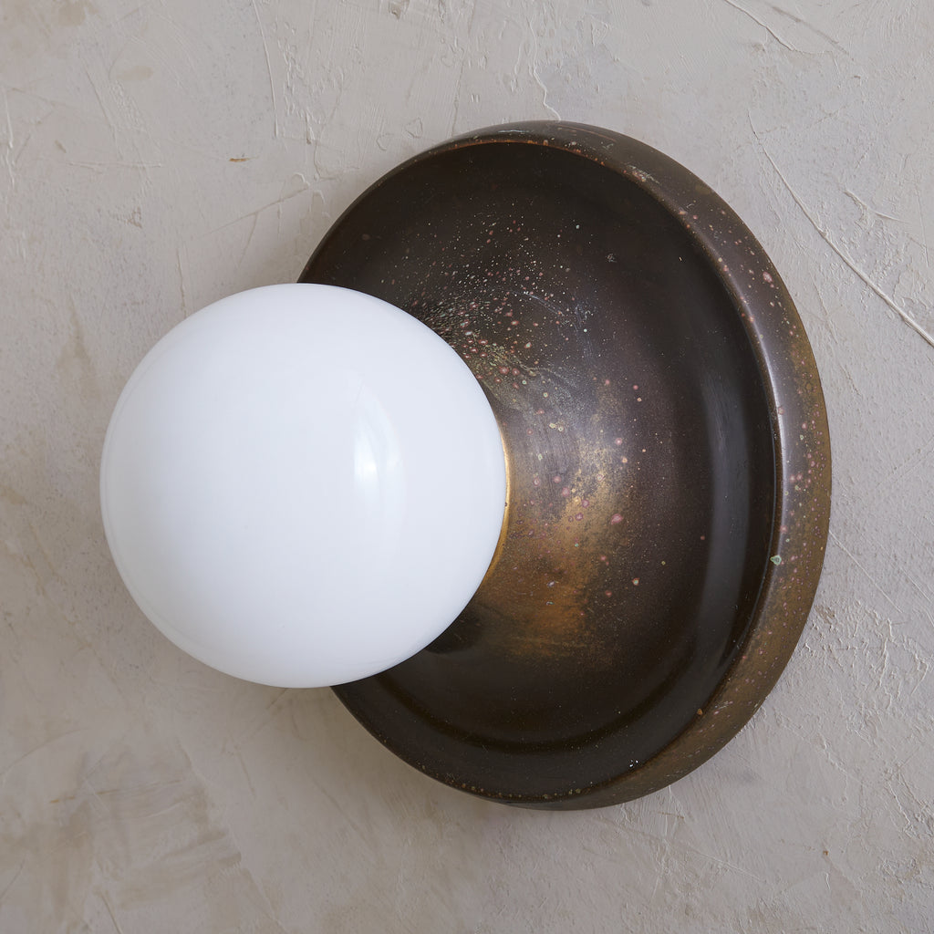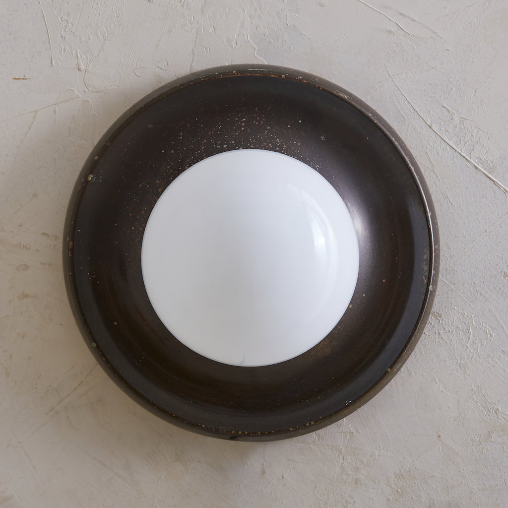 Achille Castiglioni’s ‘Light Ball’ sconce for Flos, designed in 1965, is a study in pure form and materiality. A bronze dish—its surface richly patinated with time—anchors a luminous opaline glass globe, creating a striking interplay of shadow and diffusion. Engineered for versatility, it can be mounted on either wall or ceiling, casting a warm, atmospheric glow. A refined expression of Italian modernism, this piece exemplifies Castiglioni’s ability to elevate the everyday into the iconic.