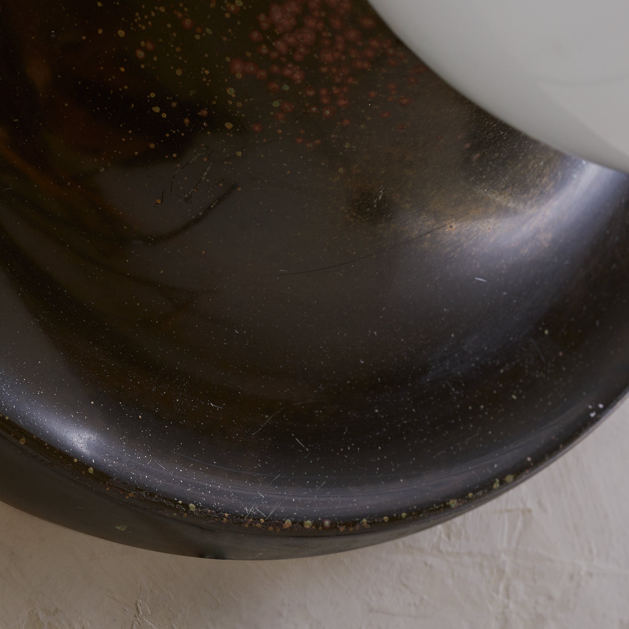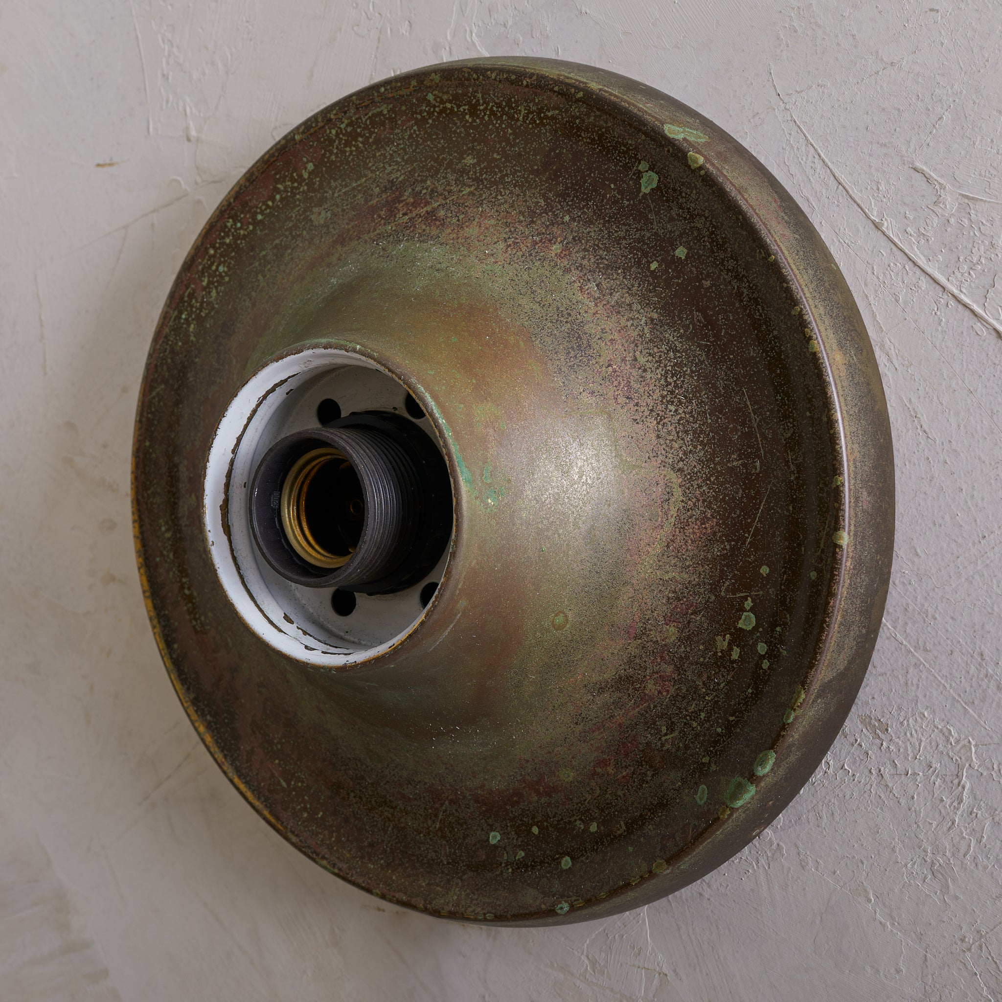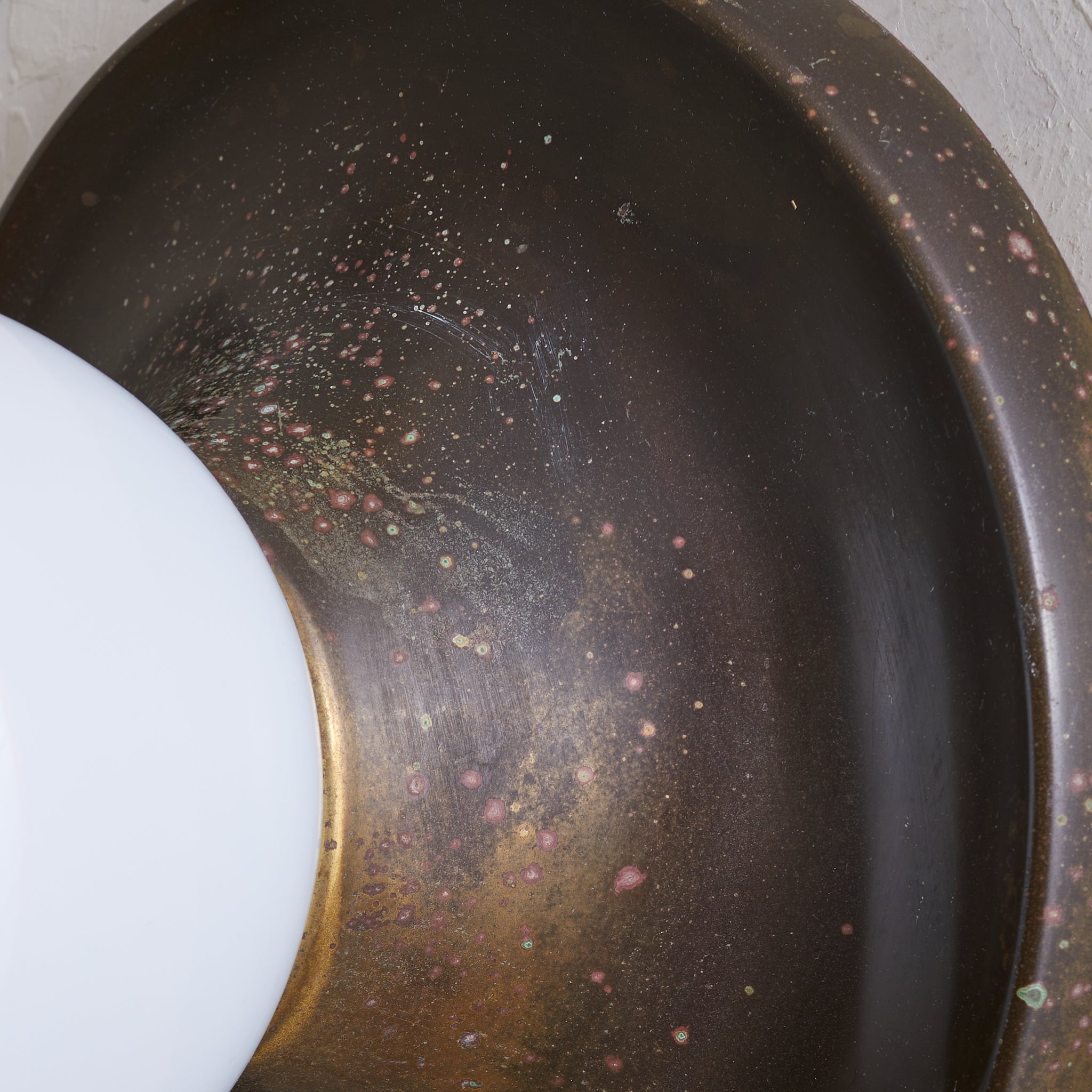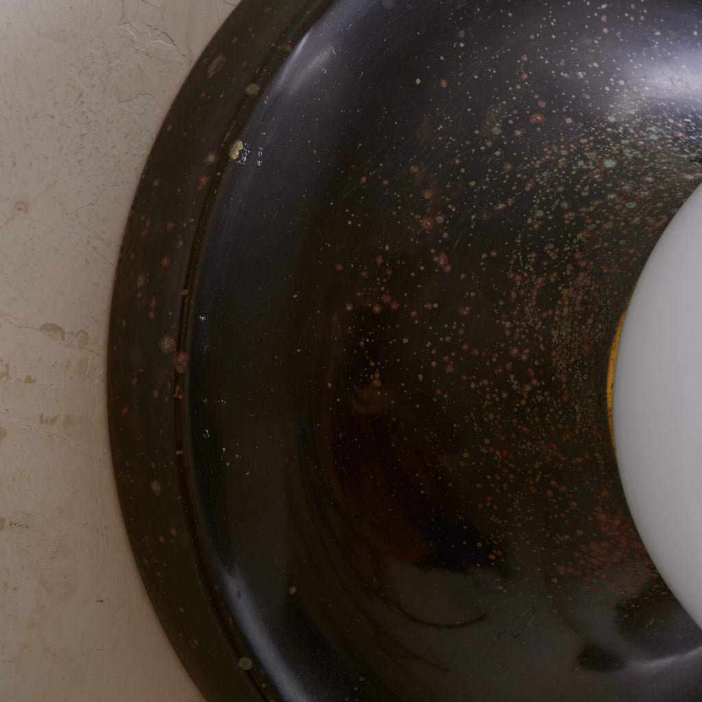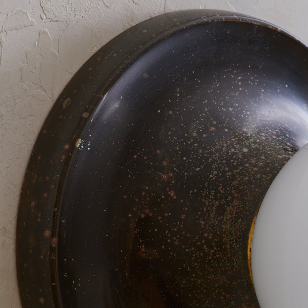 Achille Castiglioni’s ‘Light Ball’ sconce for Flos, designed in 1965, is a study in pure form and materiality. A bronze dish—its surface richly patinated with time—anchors a luminous opaline glass globe, creating a striking interplay of shadow and diffusion. Engineered for versatility, it can be mounted on either wall or ceiling, casting a warm, atmospheric glow. A refined expression of Italian modernism, this piece exemplifies Castiglioni’s ability to elevate the everyday into the iconic.