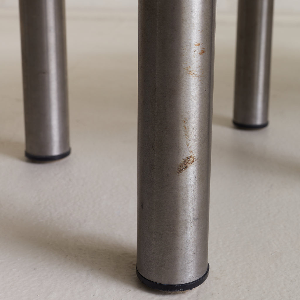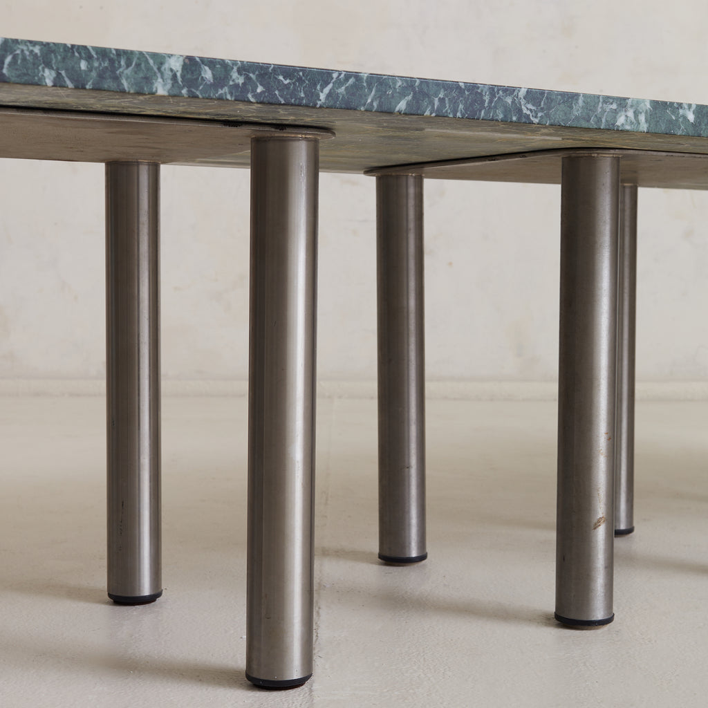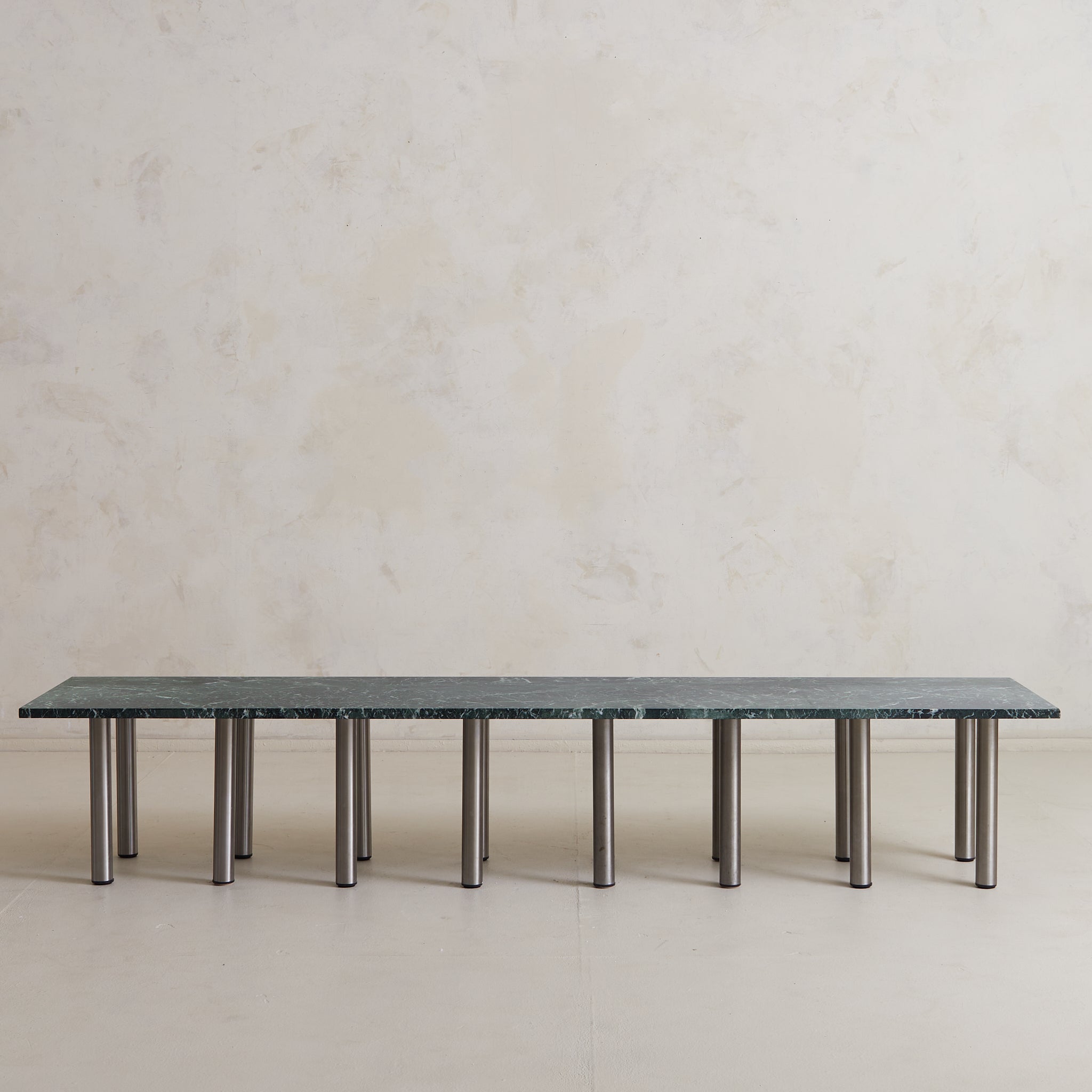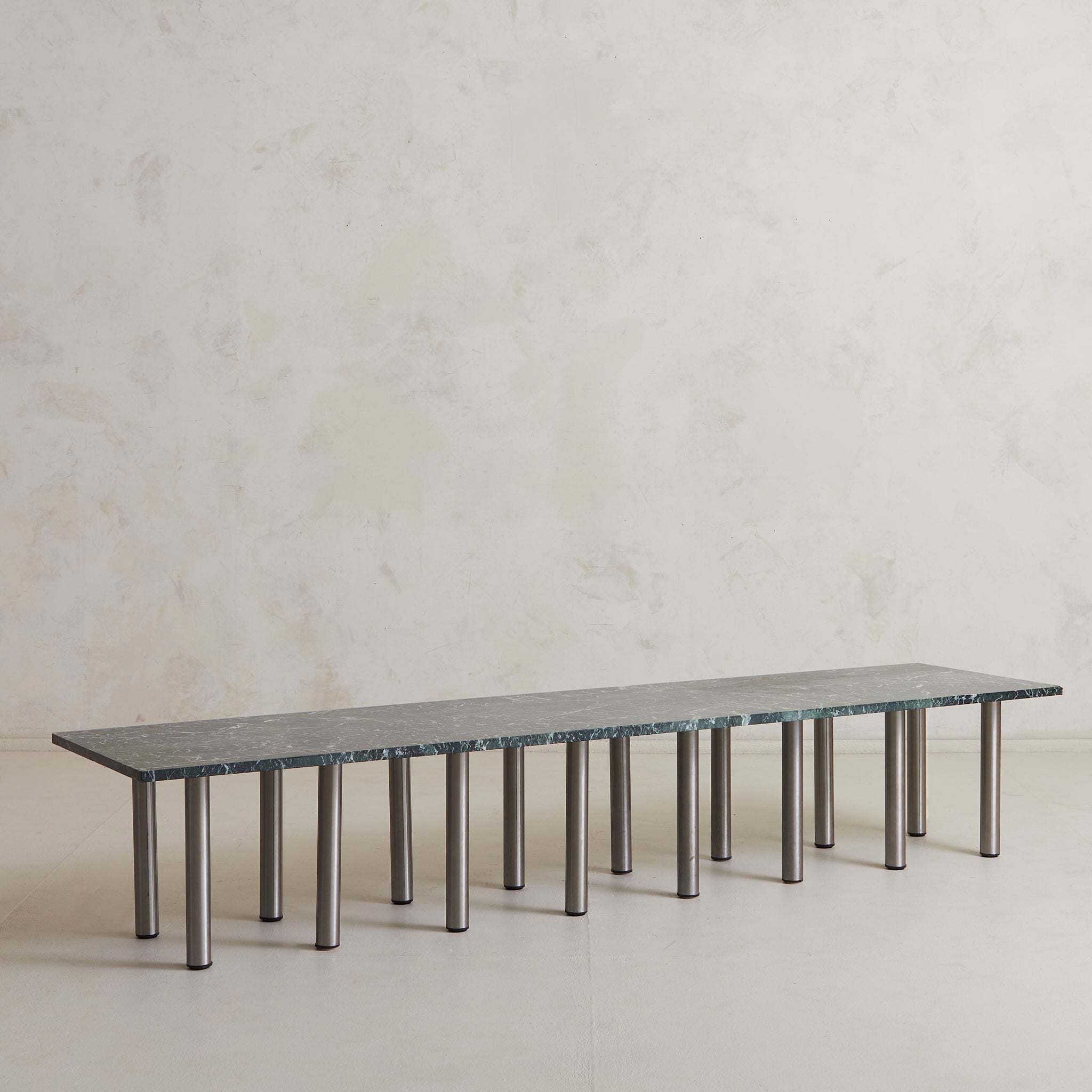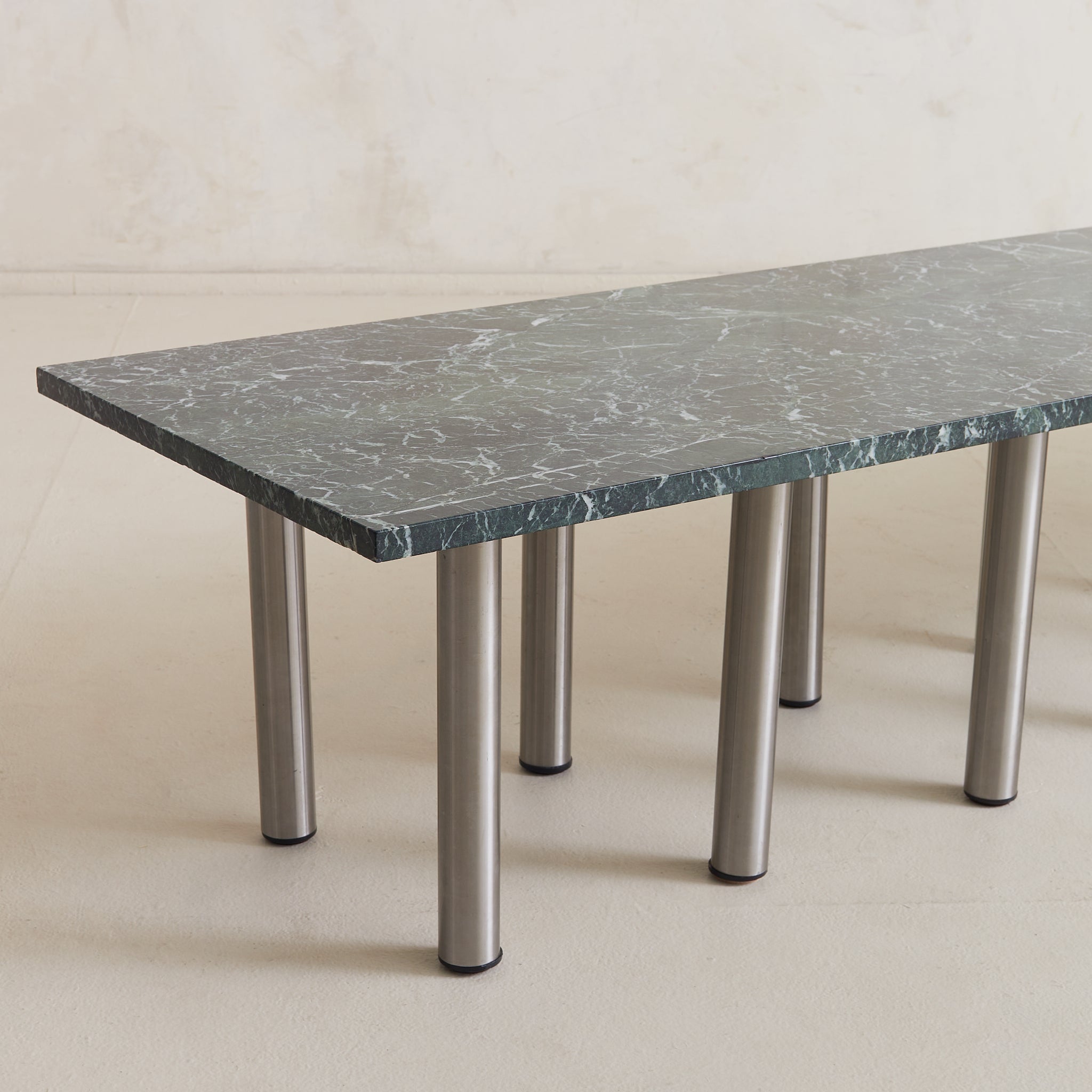 This generously proportioned table captures the bold experimentation of 1970s Italian design. A slab of richly veined verde marble rests atop a rhythmic procession of brushed tubular steel legs—an architectural interplay of weight and lightness. It's height, at 19", allows for a low console table, a tall coffee table, or a well proportioned display table.