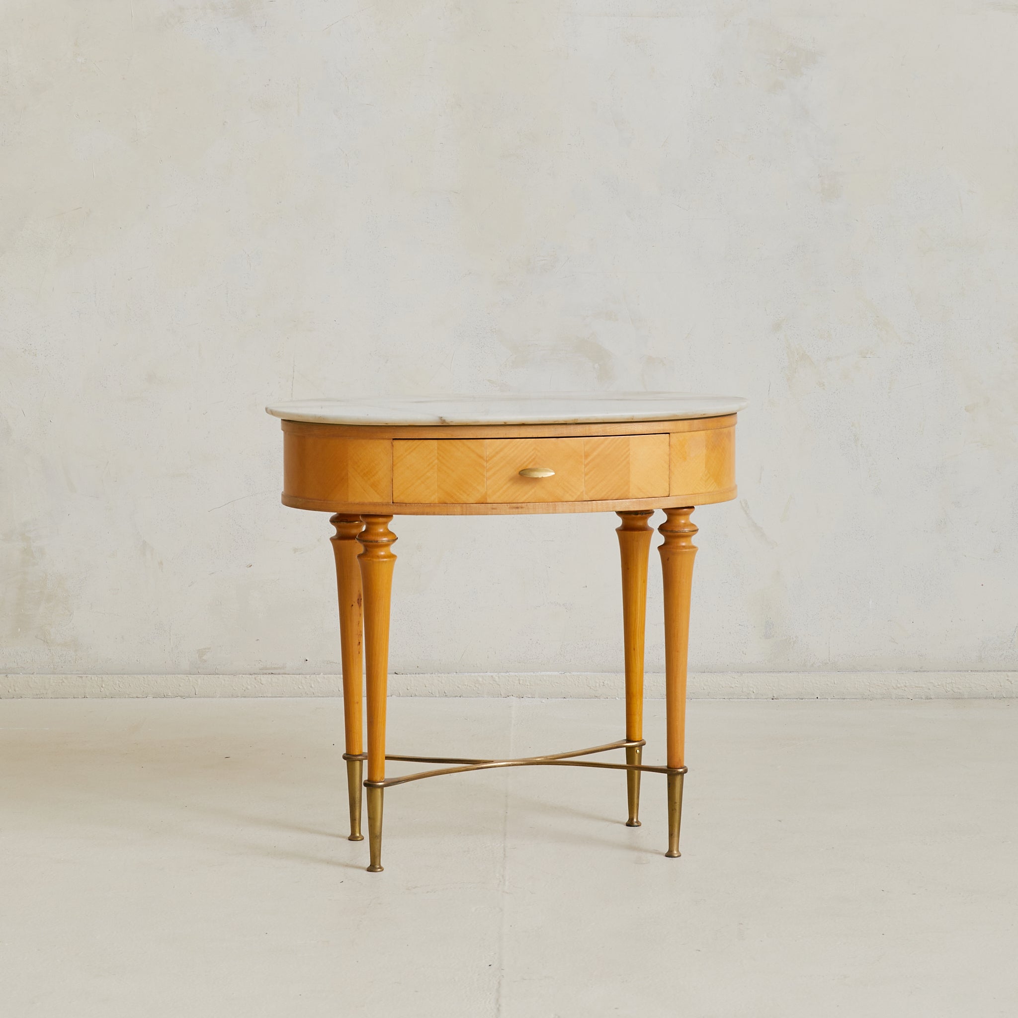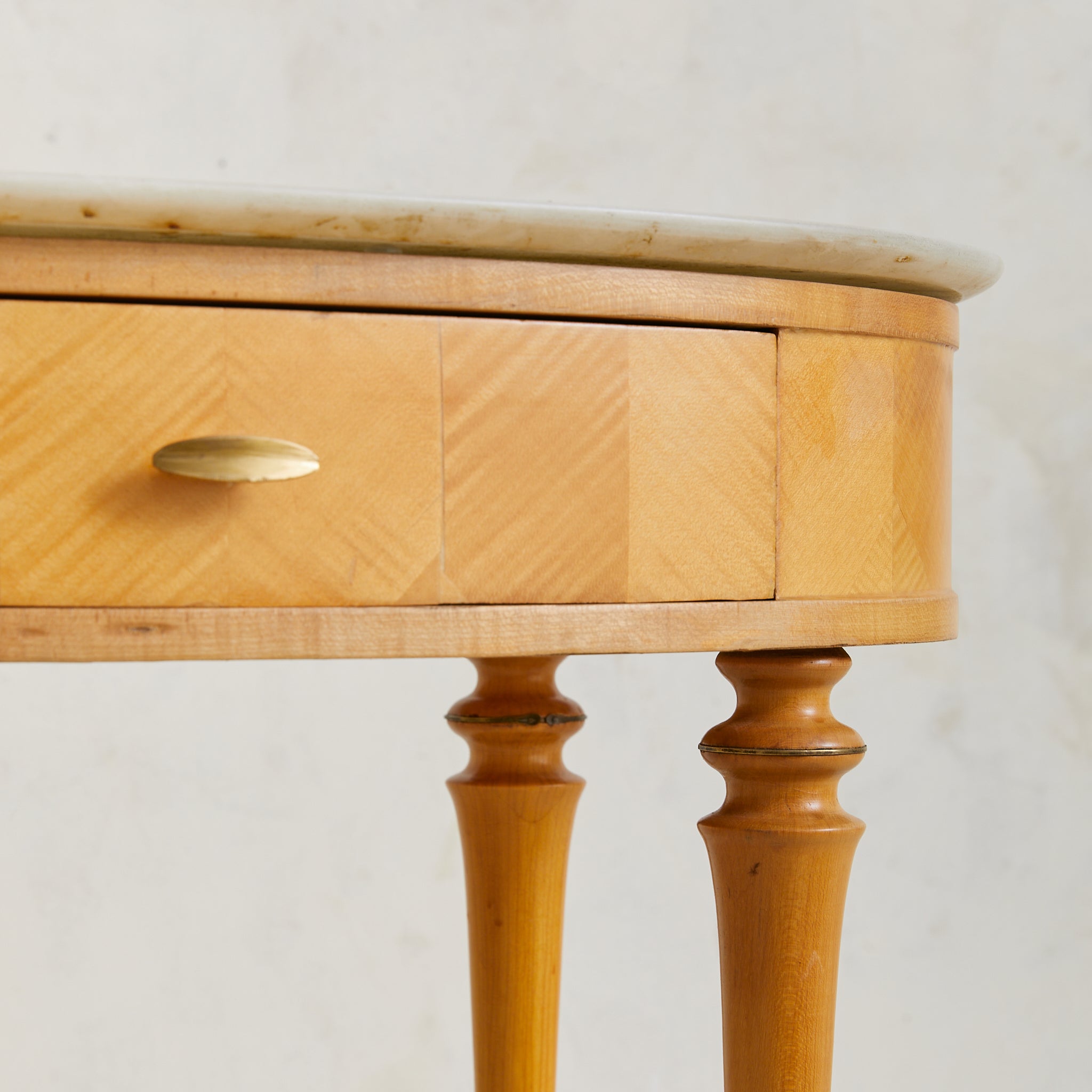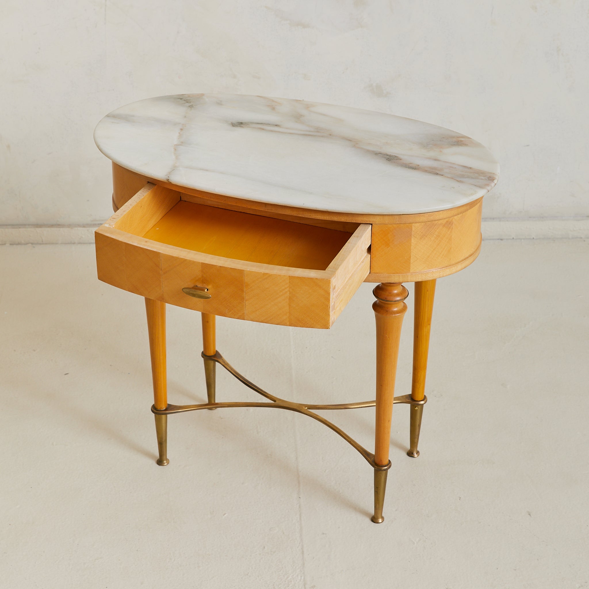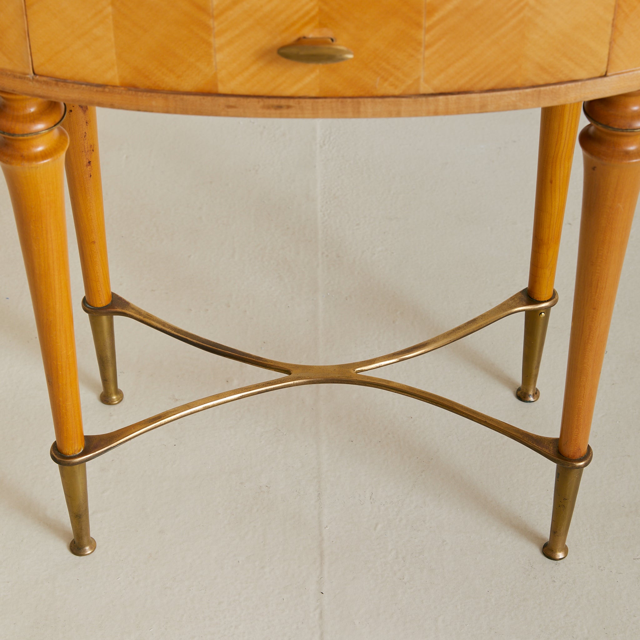 An Italian bedside table in maple wood, crafted in the 1950s. The oval body rests lightly on turned legs capped in brass, connected by an elegant stretcher. A central drawer with a brass pull is joined using precision-cut finger joints—a mark of quality craftsmanship.