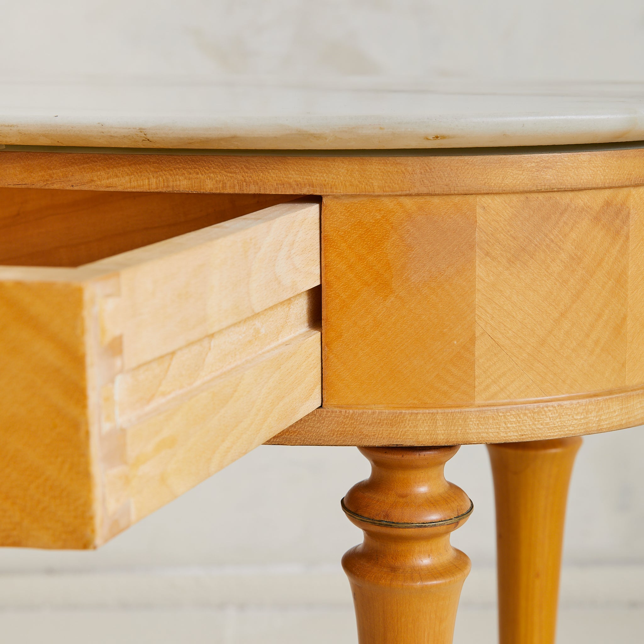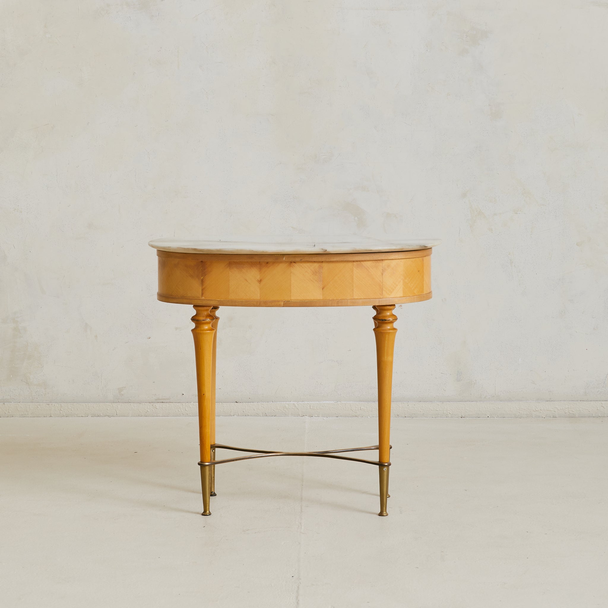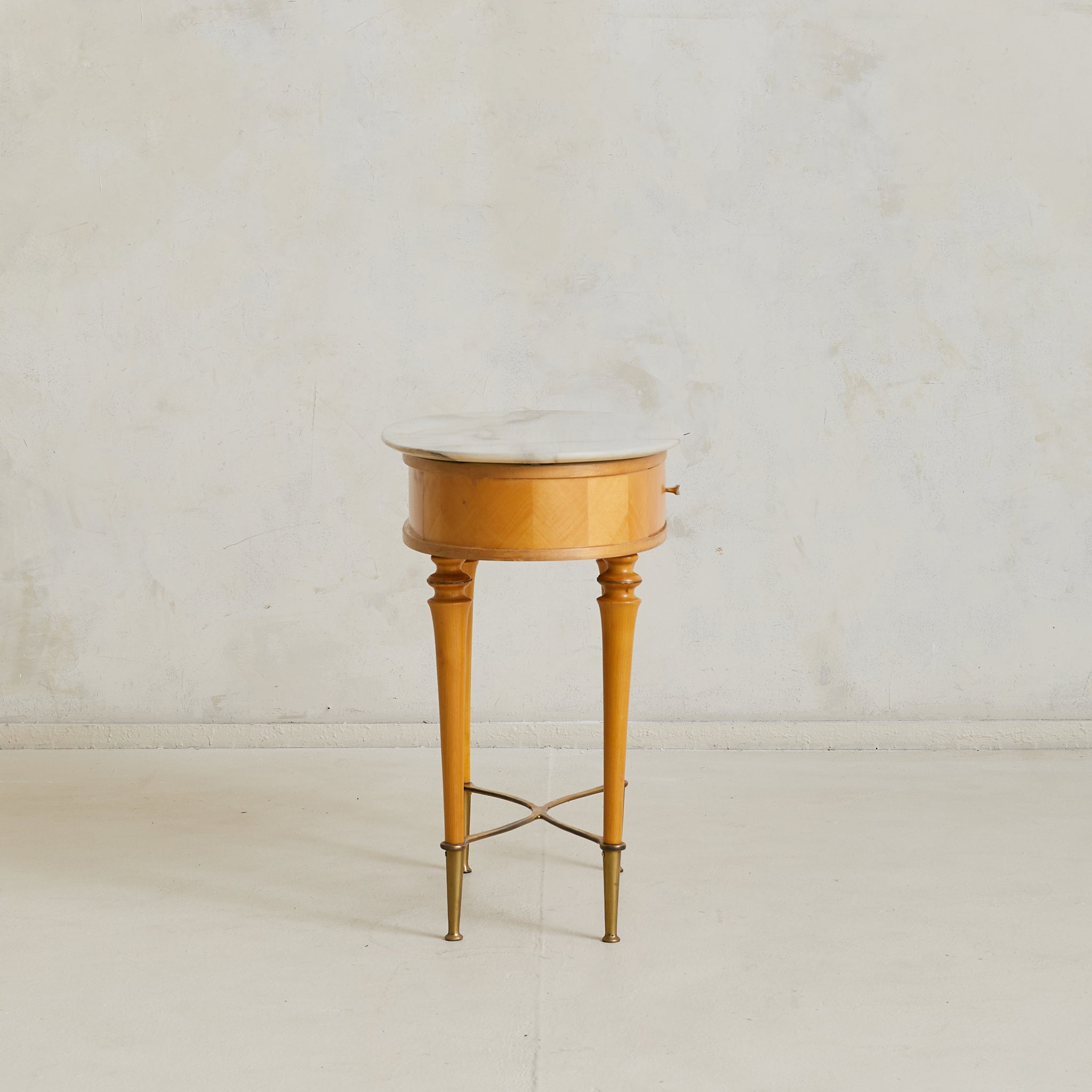 An Italian bedside table in maple wood, crafted in the 1950s. The oval body rests lightly on turned legs capped in brass, connected by an elegant stretcher. A central drawer with a brass pull is joined using precision-cut finger joints—a mark of quality craftsmanship.