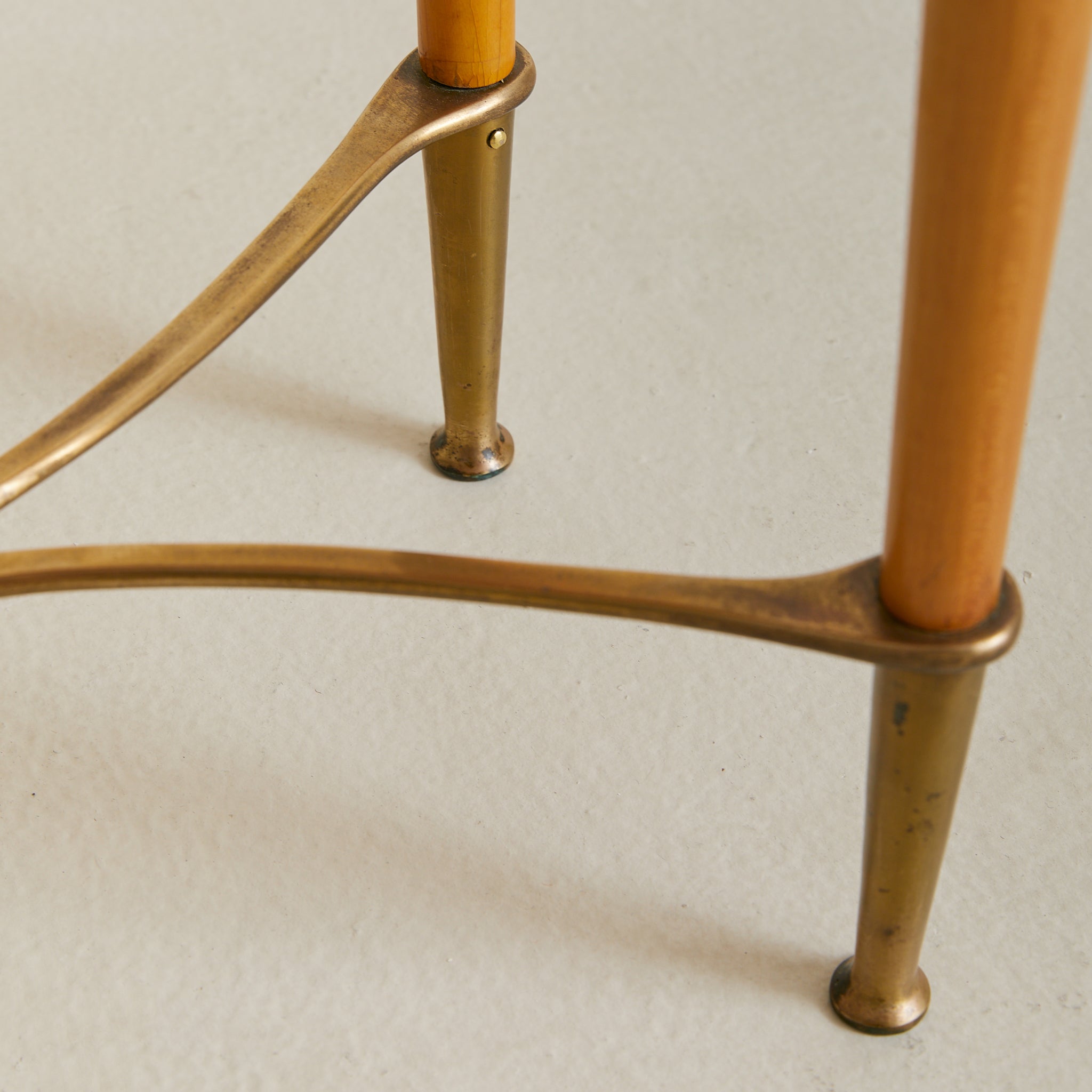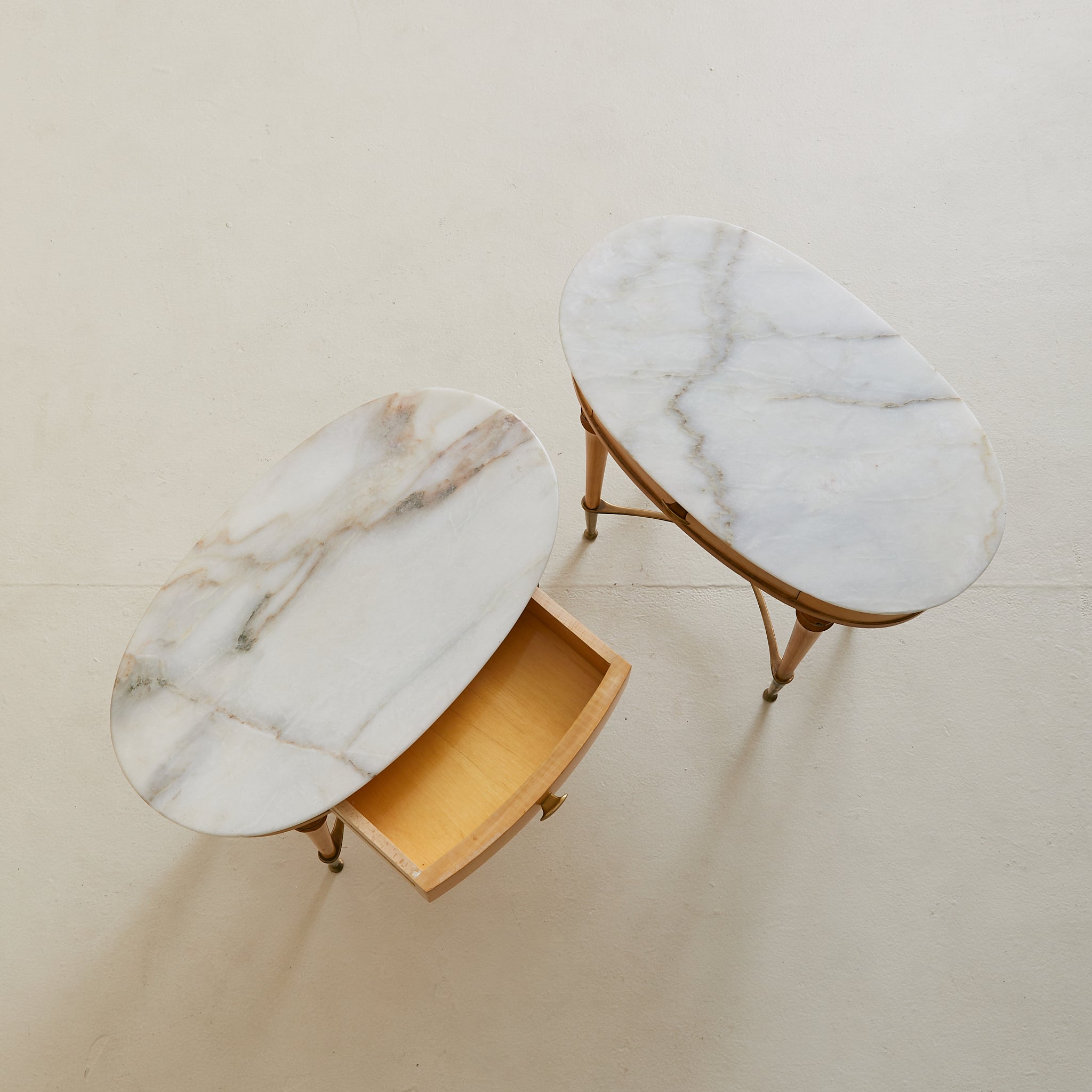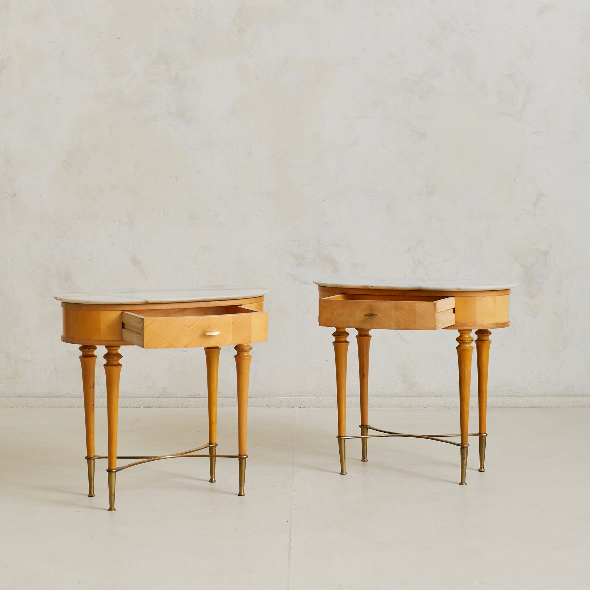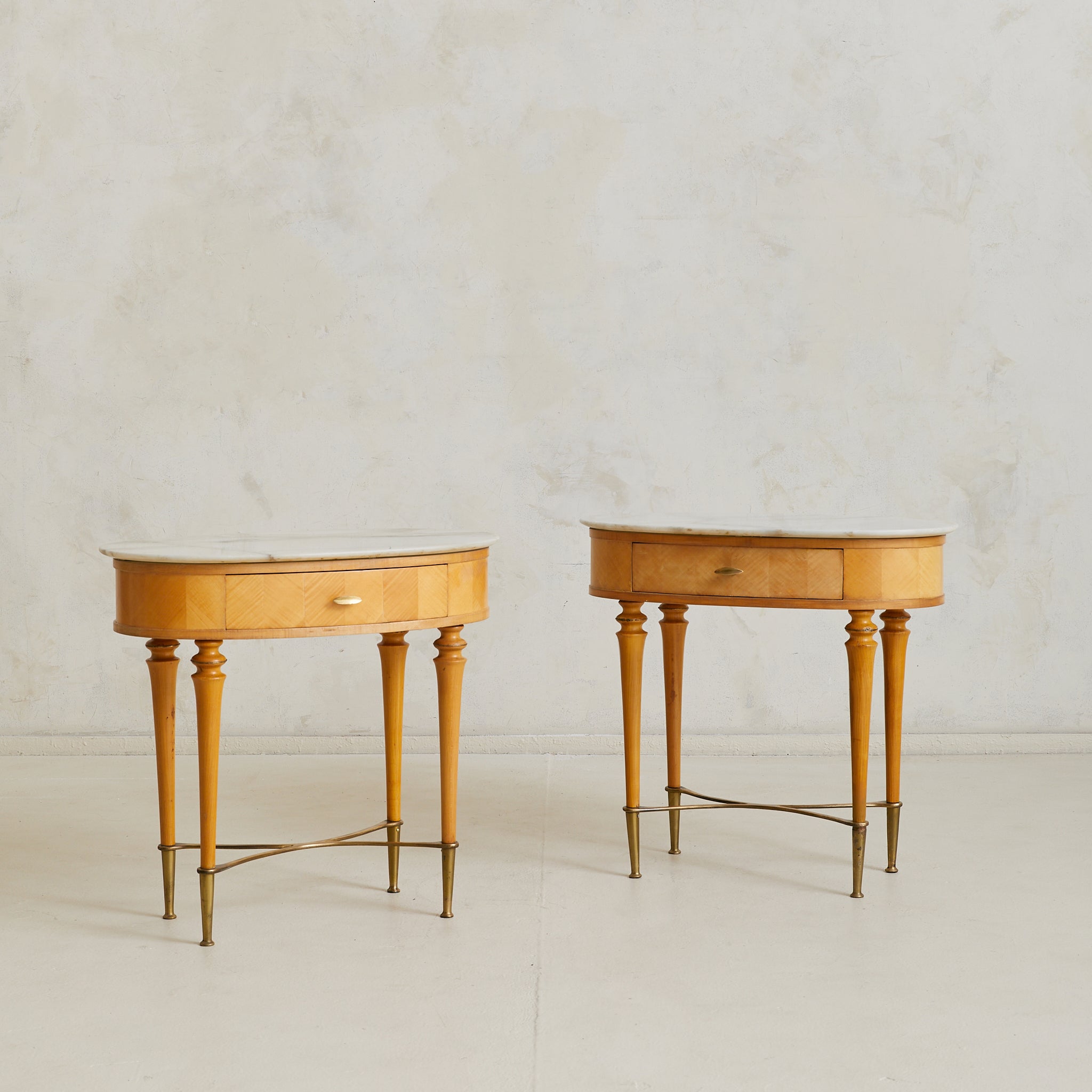 An Italian bedside table in maple wood, crafted in the 1950s. The oval body rests lightly on turned legs capped in brass, connected by an elegant stretcher. A central drawer with a brass pull is joined using precision-cut finger joints—a mark of quality craftsmanship.