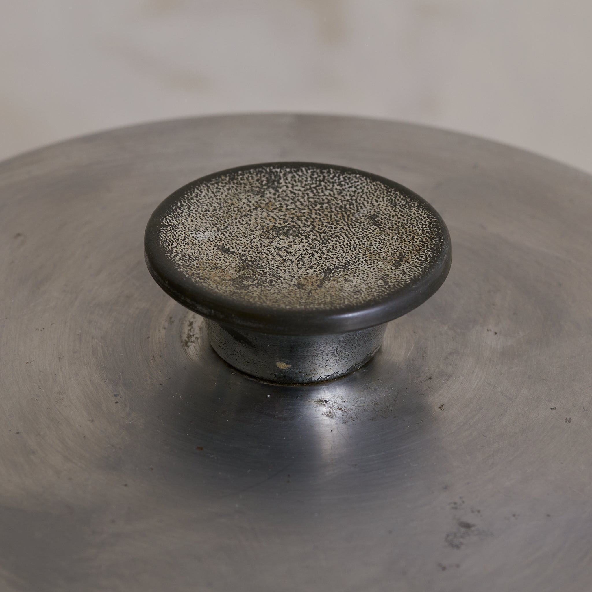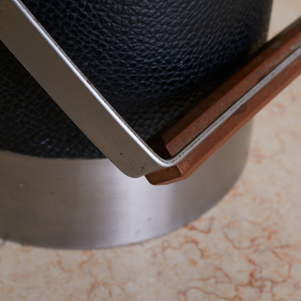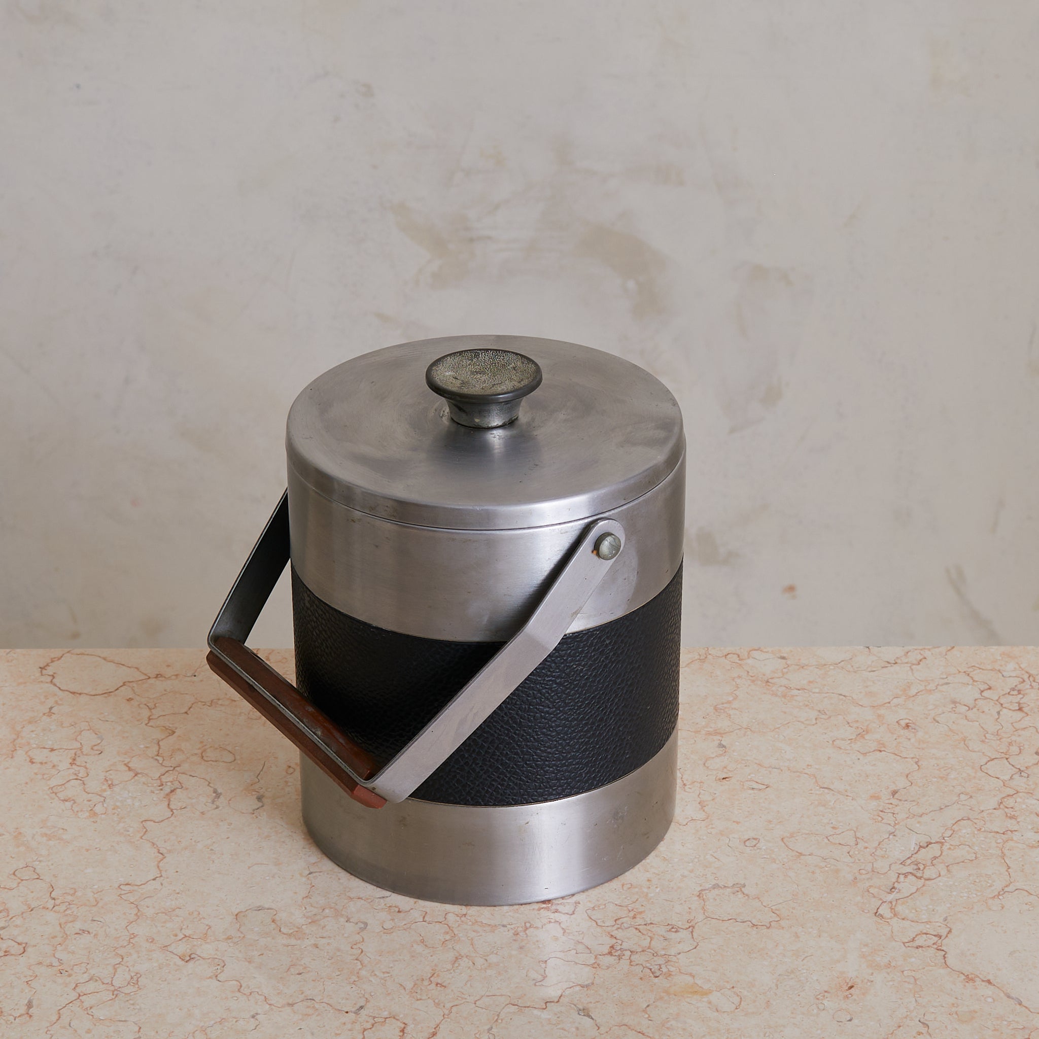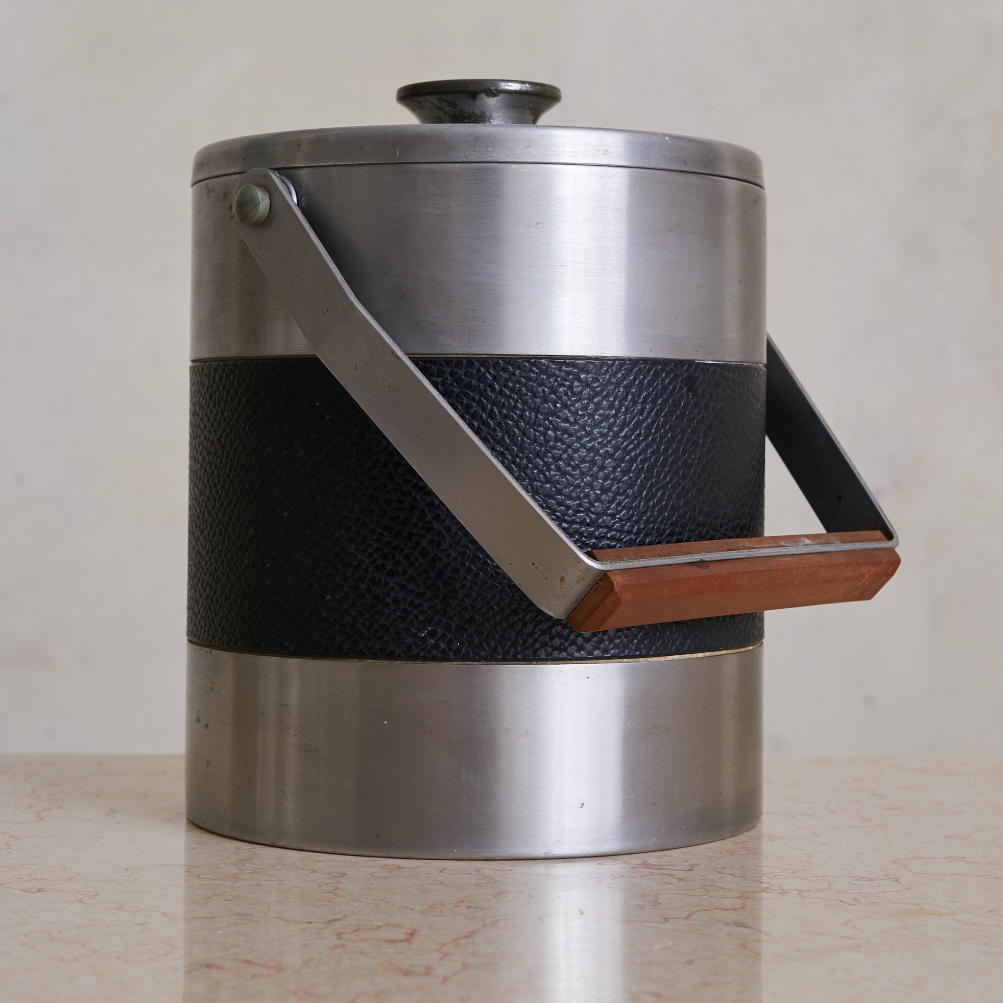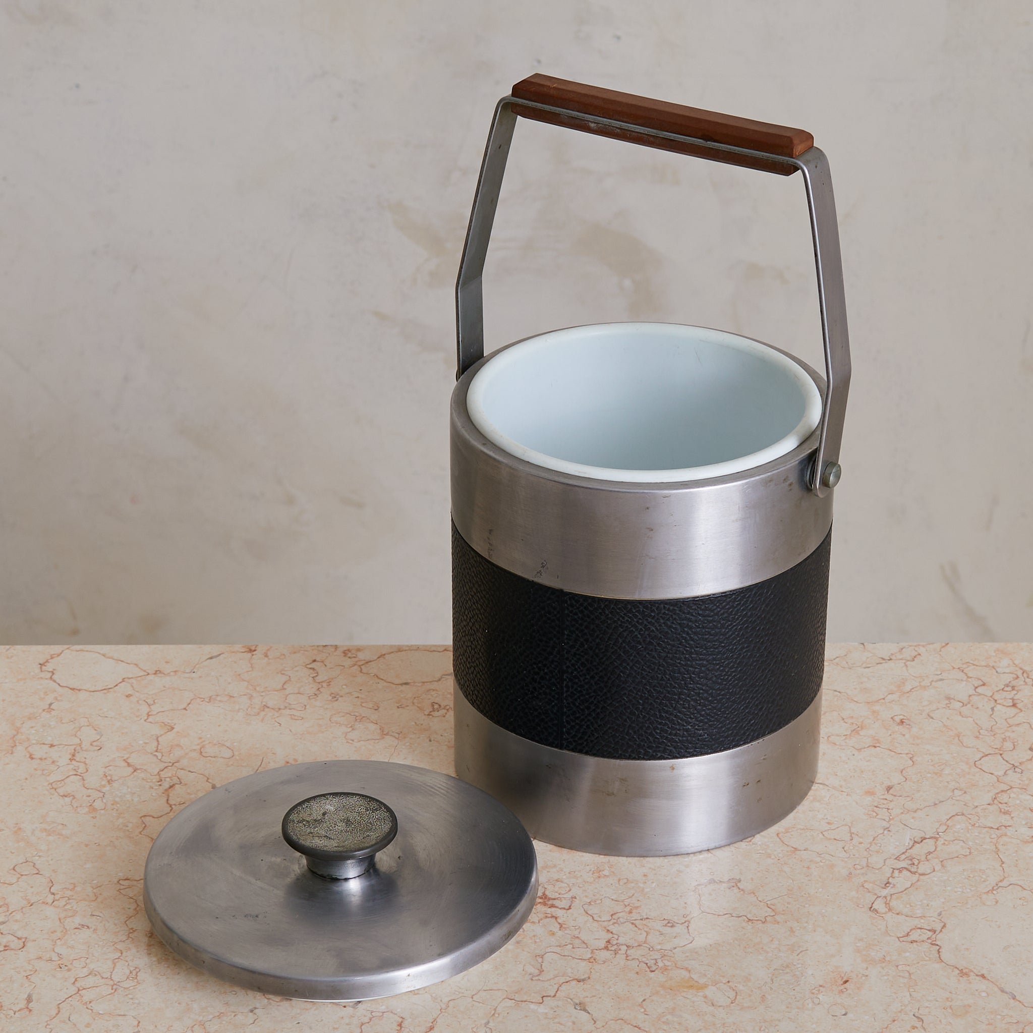 A 1960s Italian insulated ice bucket with a cylindrical form. Crafted from brushed metal, it features a textured black faux leather wrap for a bold contrast and secure grip. A sculptural handle with wood detailing and a domed lid with a refined knob complete the design, making it a striking addition to any barware collection.