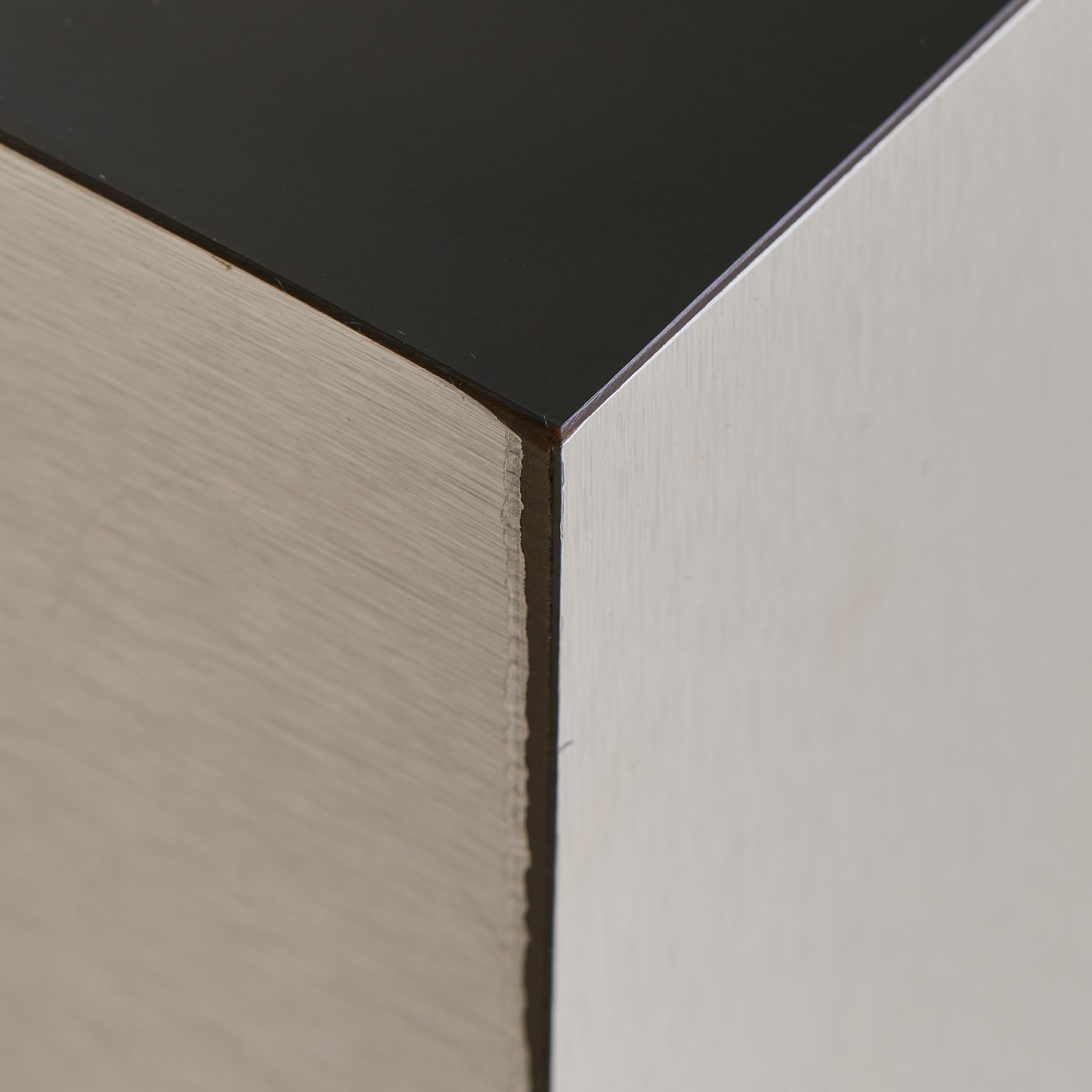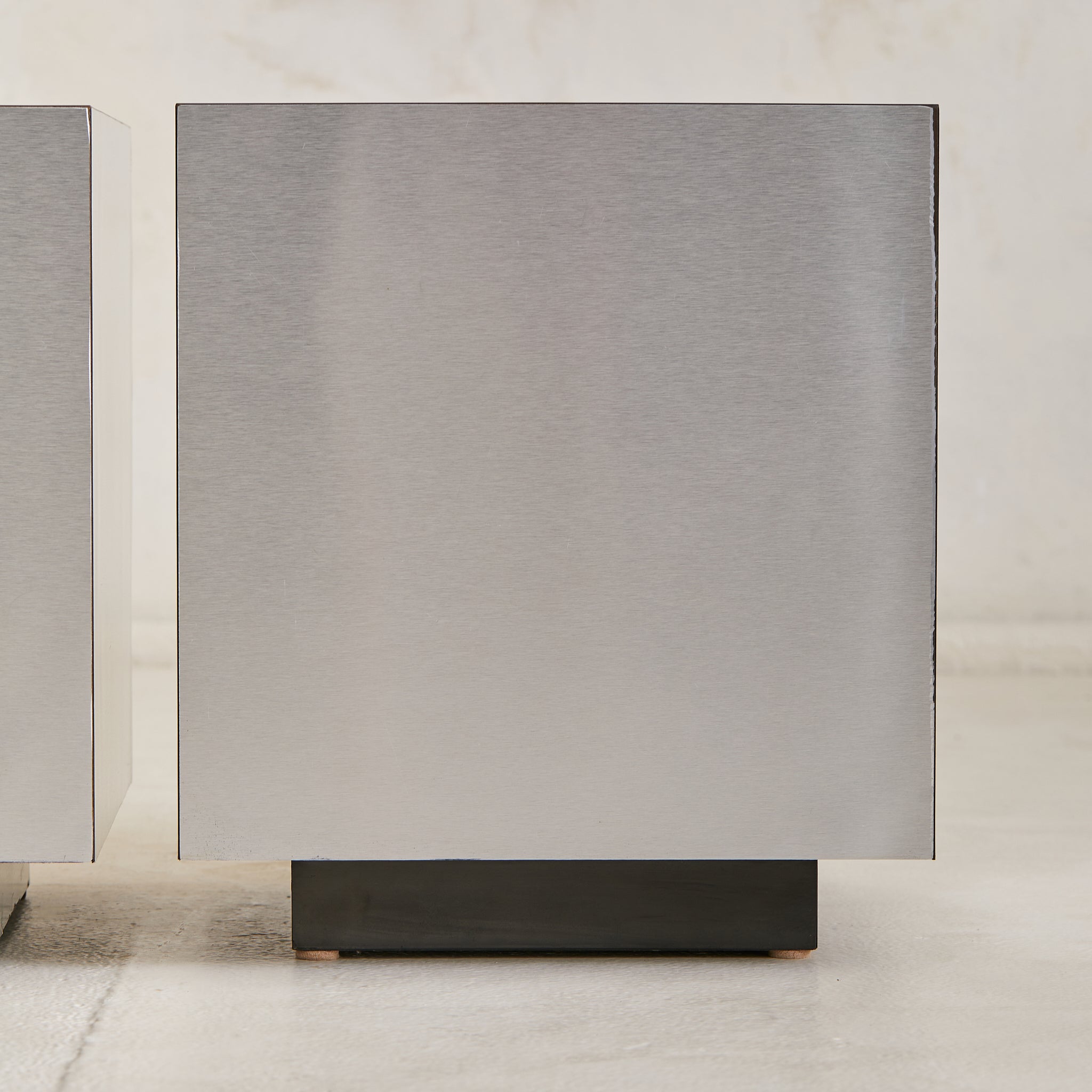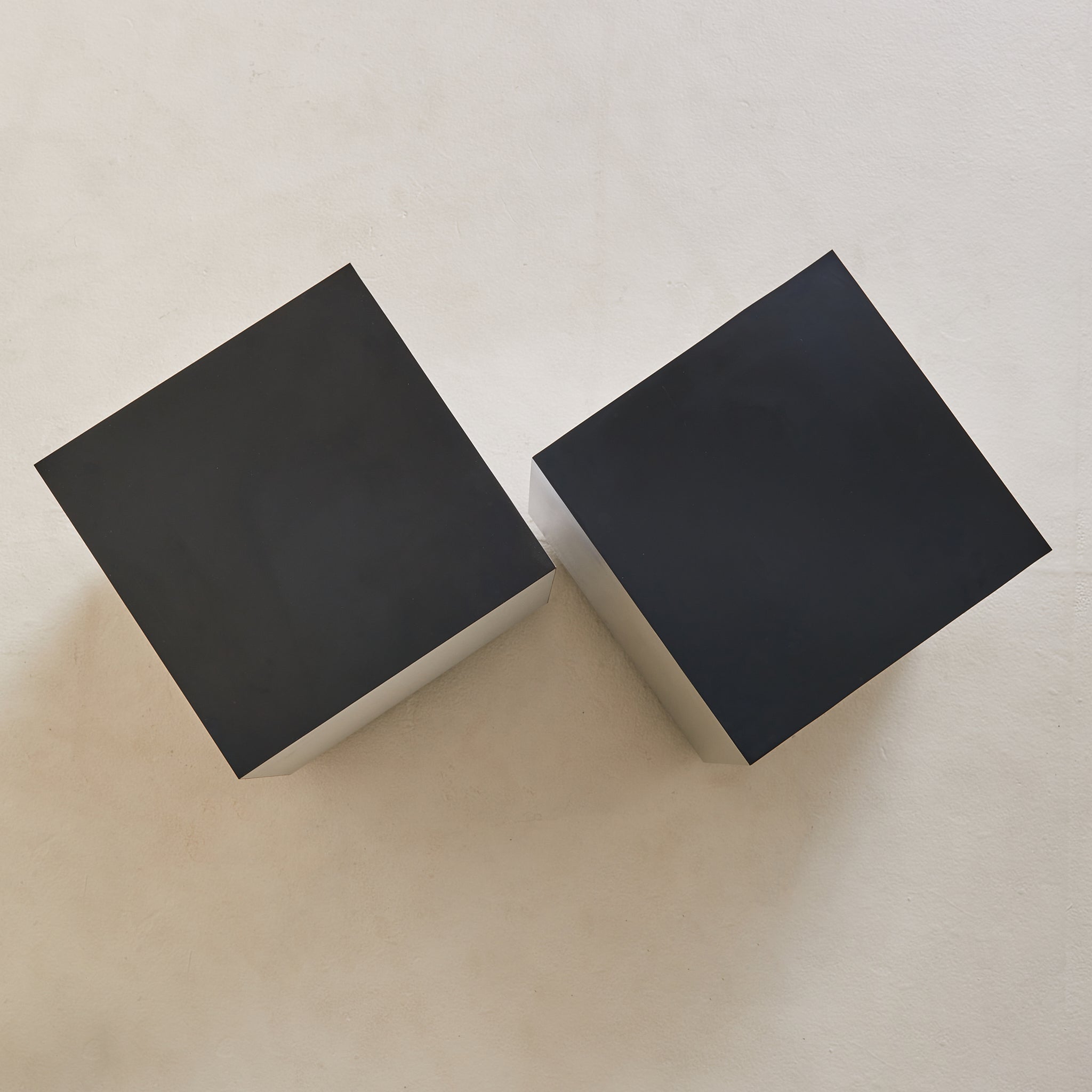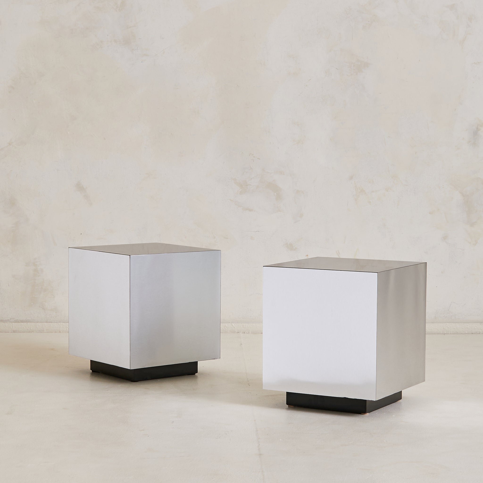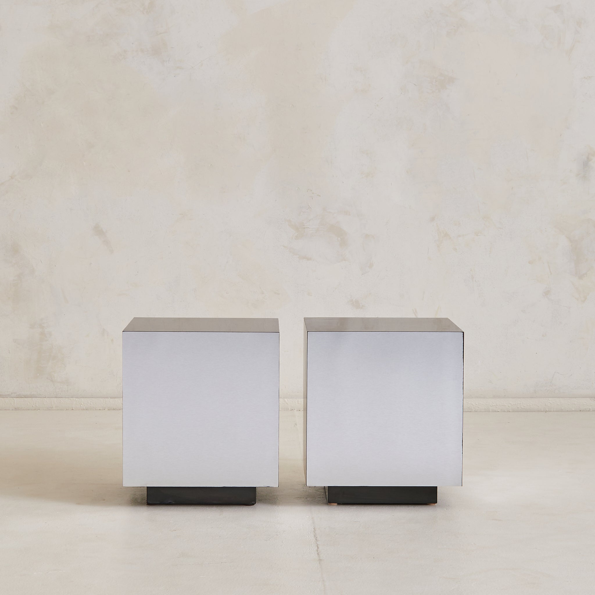 This Italian cube side table is an evocative example of 1970s modernist design, defined by its crisp silhouette and mirror-like metallic finish. The seamless cube form, constructed of wood, rests atop a recessed black plinth, giving the piece a weightless quality. Reflective yet minimal, it channels the era’s fascination with geometry and material experimentation.