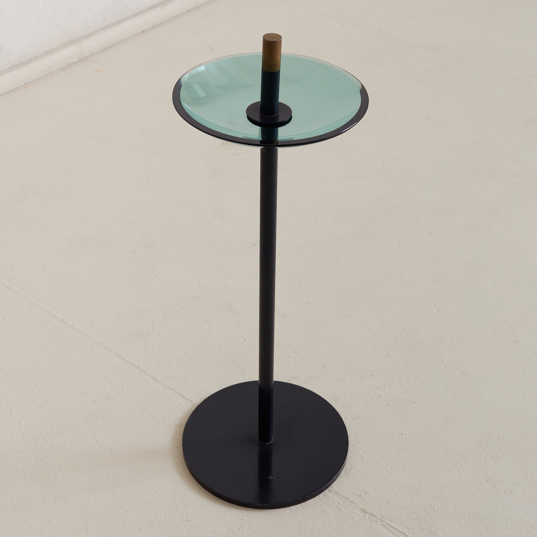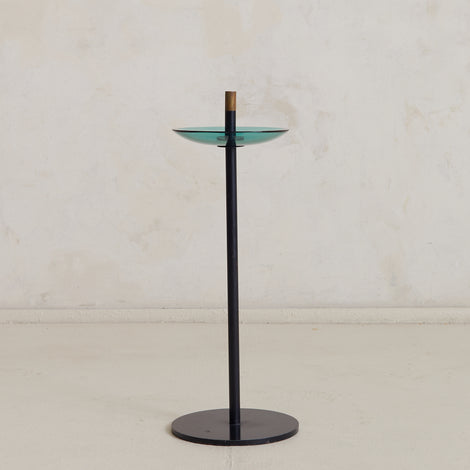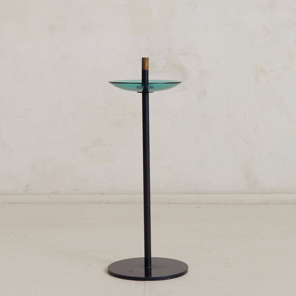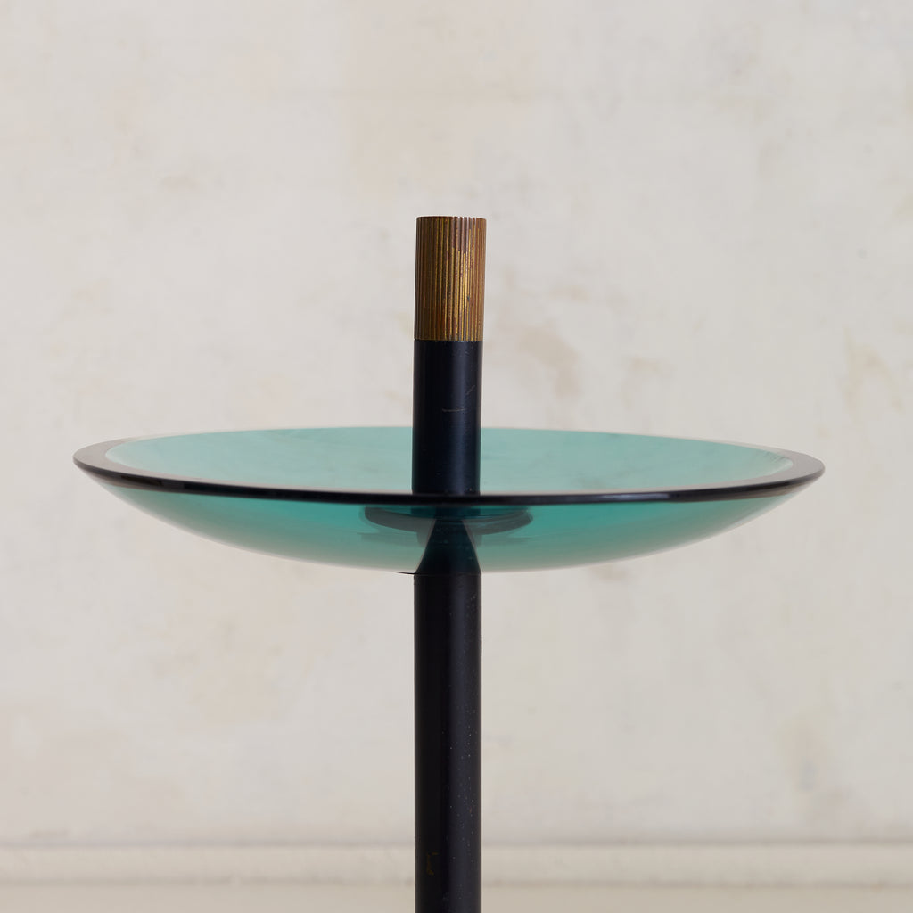 A rare Italian 'Model 2087' floor-standing catchall by Max Ingrand for Fontana Arte from the 1950s. Its refined silhouette features a single black lacquered metal stem rising from a weighted base. A thick crystal glass plate with bevelled edges hovers like a lens, anchored by a finely knurled brass tip.