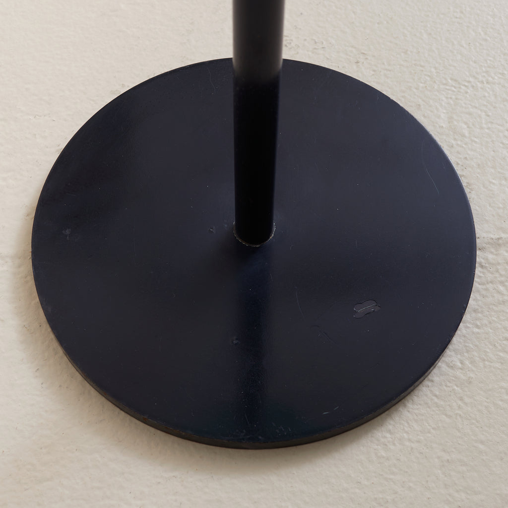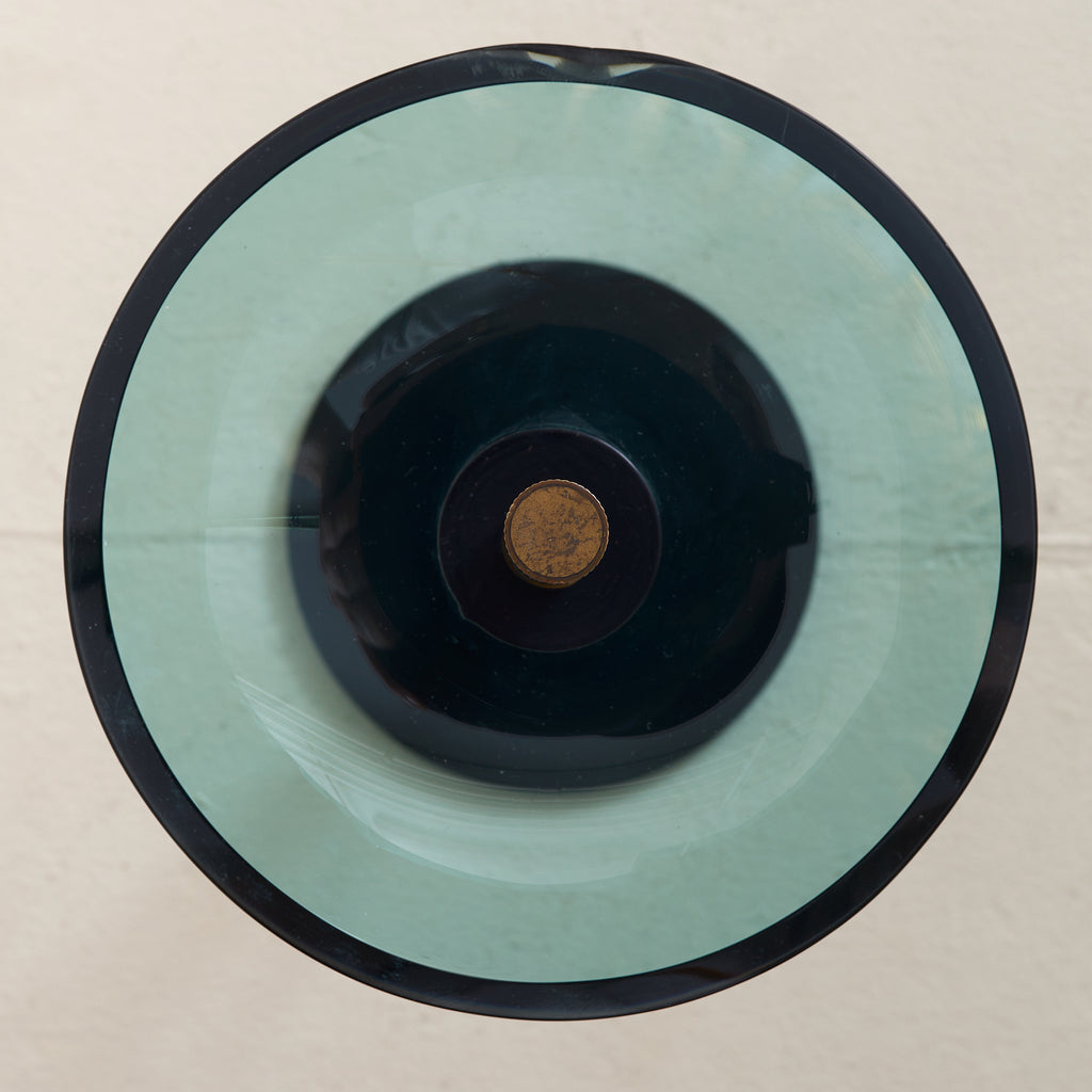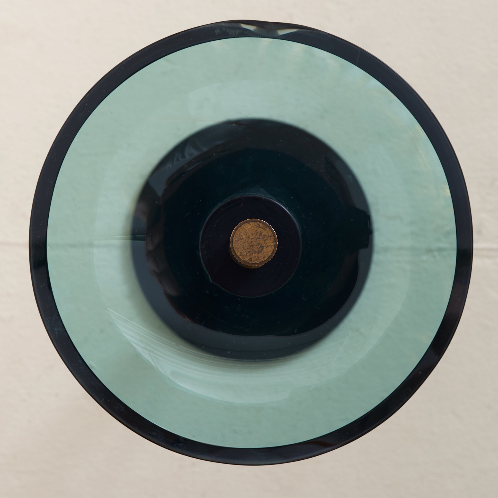A rare Italian 'Model 2087' floor-standing catchall by Max Ingrand for Fontana Arte from the 1950s. Its refined silhouette features a single black lacquered metal stem rising from a weighted base. A thick crystal glass plate with bevelled edges hovers like a lens, anchored by a finely knurled brass tip.