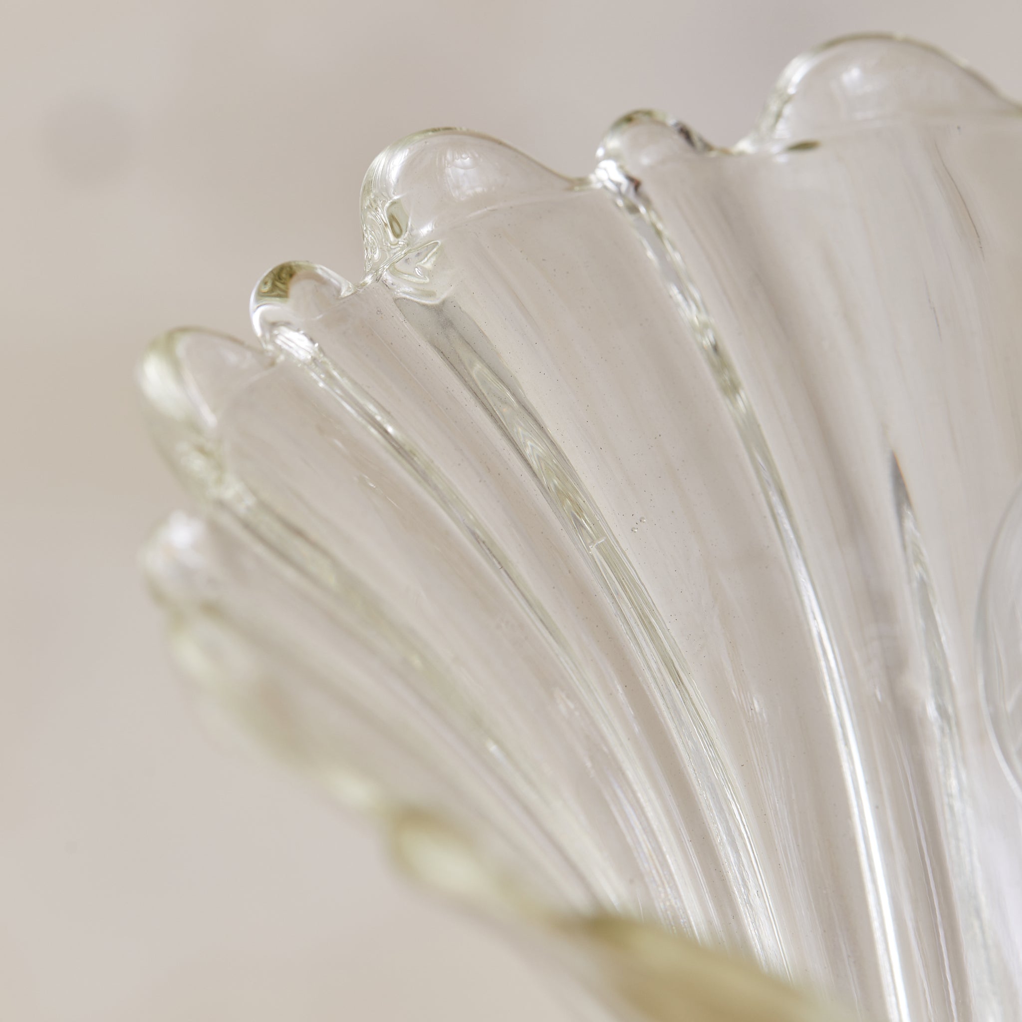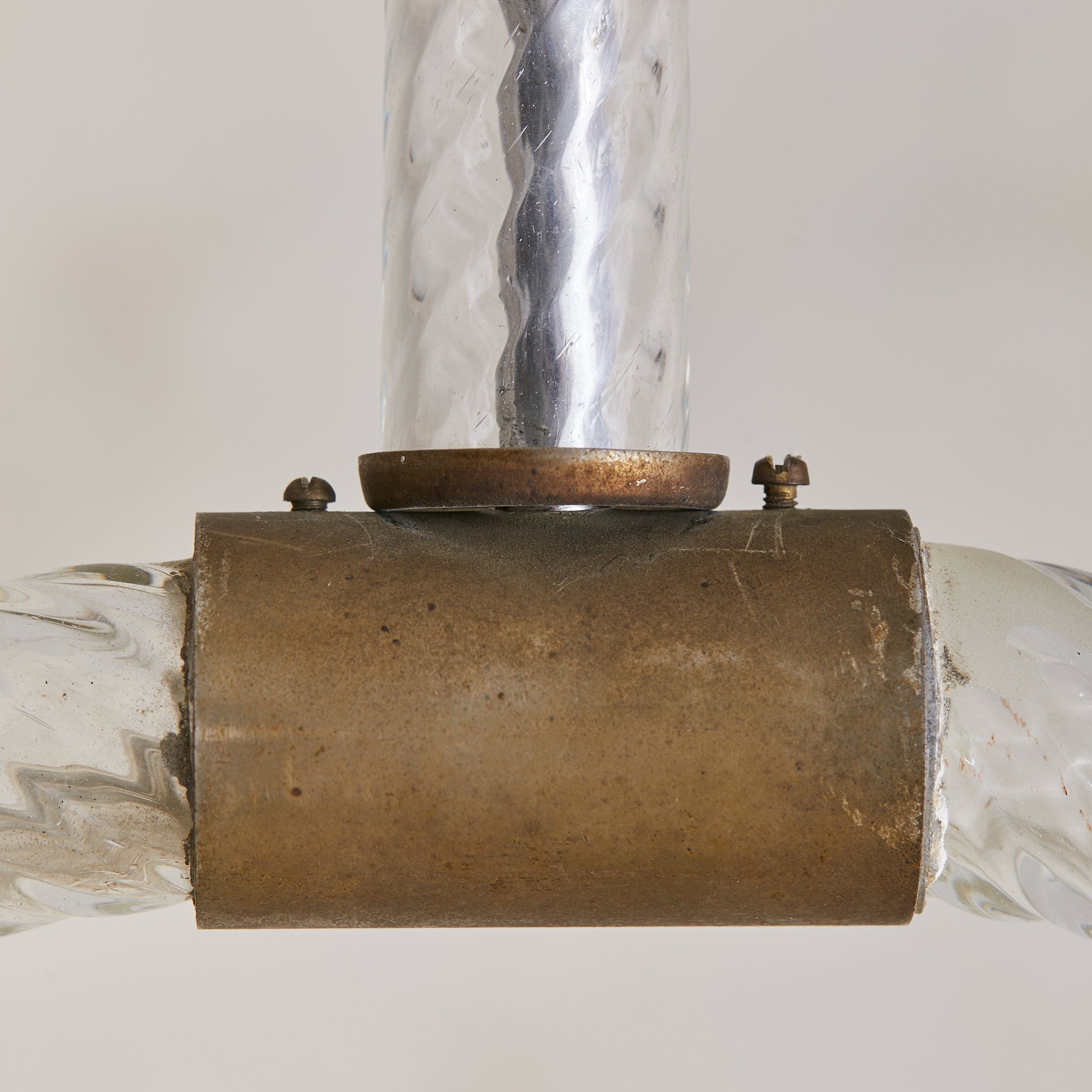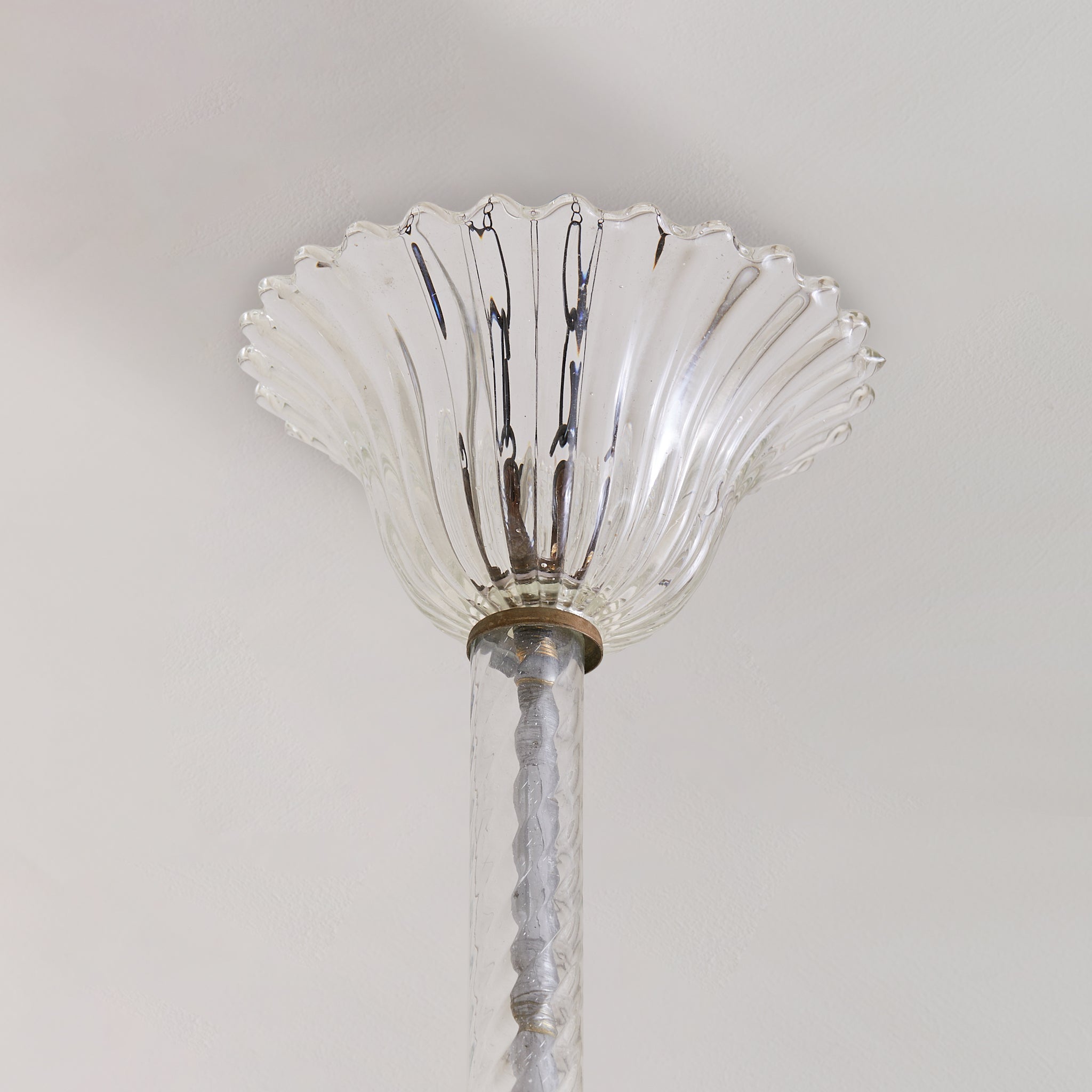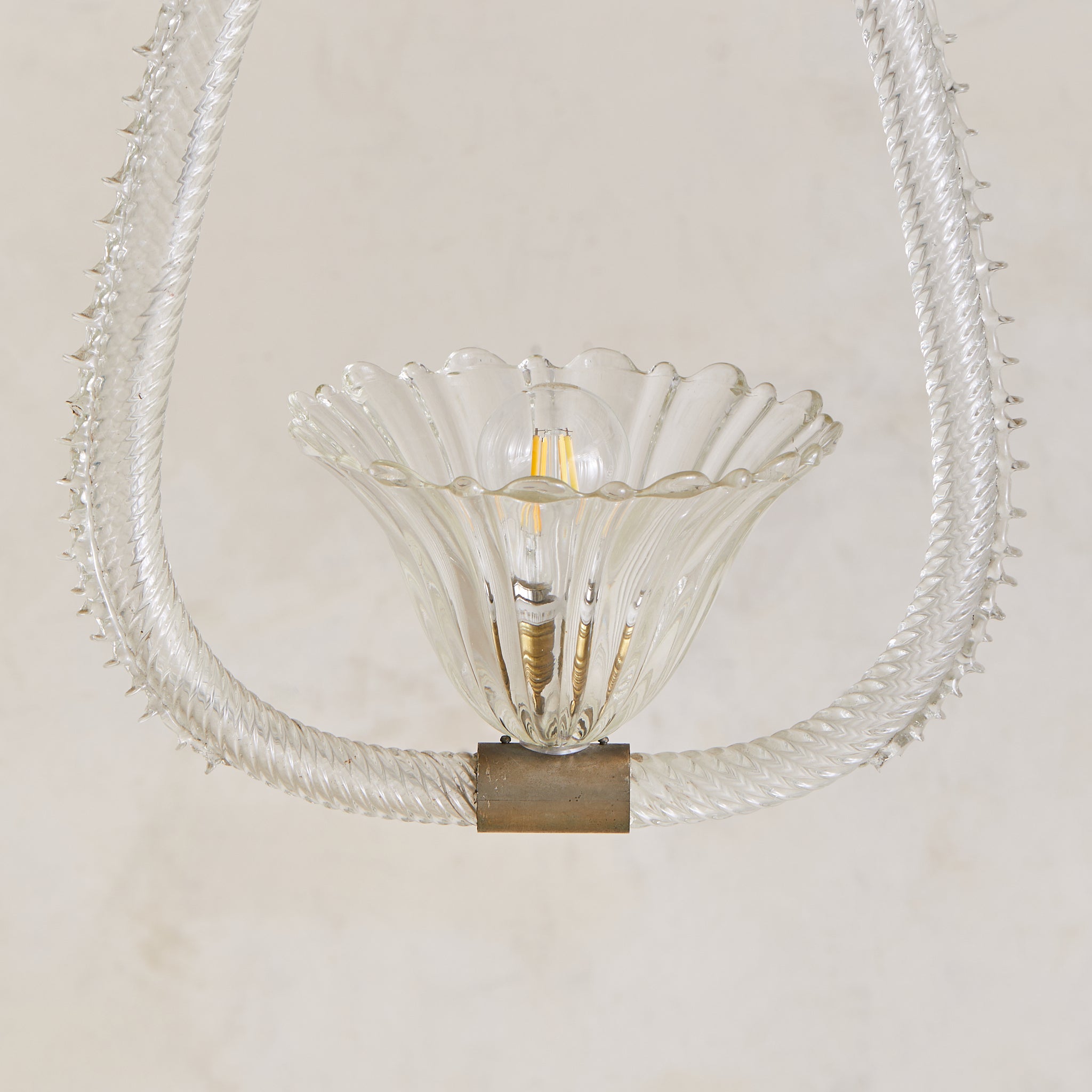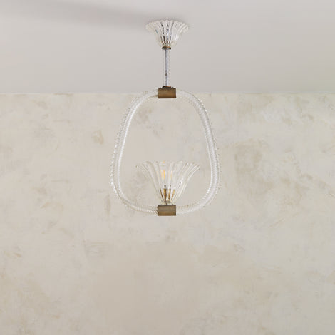 A rare Art Deco Murano glass pendant attributed to the esteemed Barovier & Toso atelier in the 1930s. The ruffled shade, crafted from clear, textured glass, glistens like frozen lace—its organic, rippling form shaped entirely by hand. Framed by a gracefully twisted glass loop and suspended from a twisted brass stem with a matching glass canopy, this piece emits a luminous, ambient warmth that feels both ethereal and inviting.