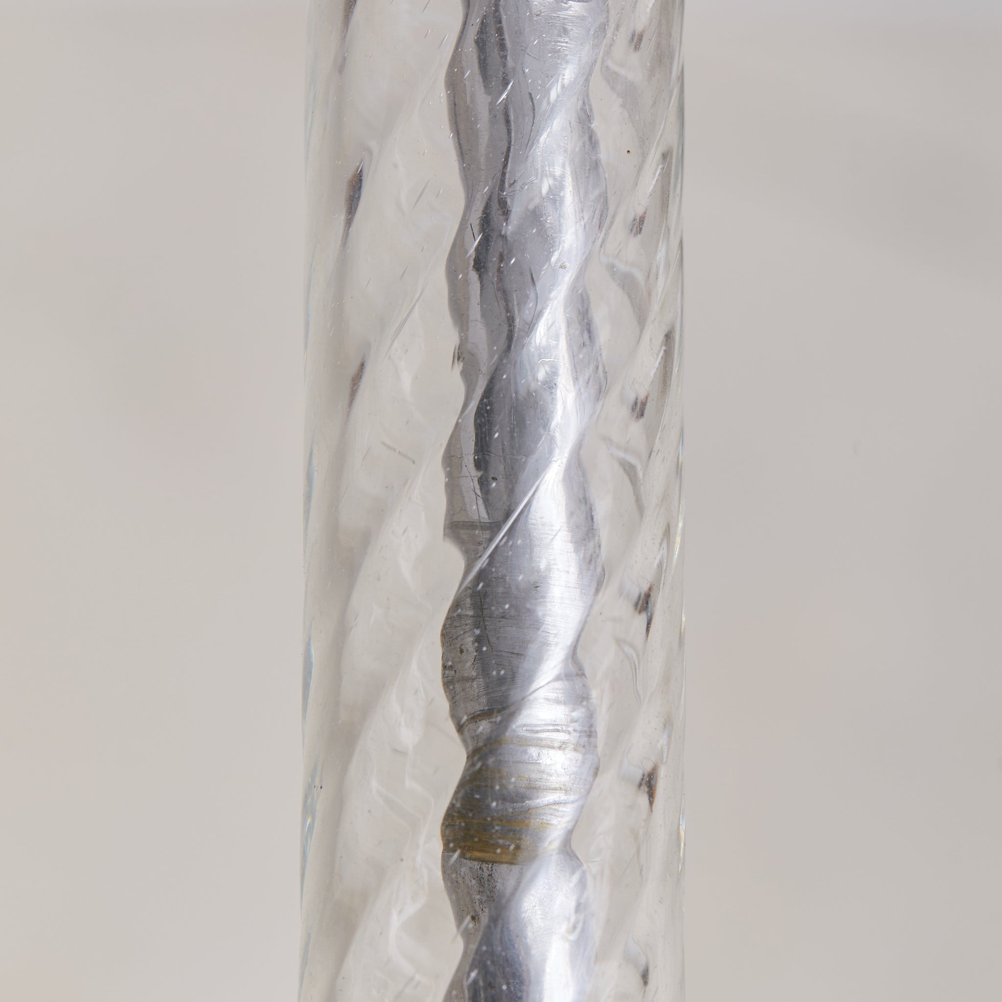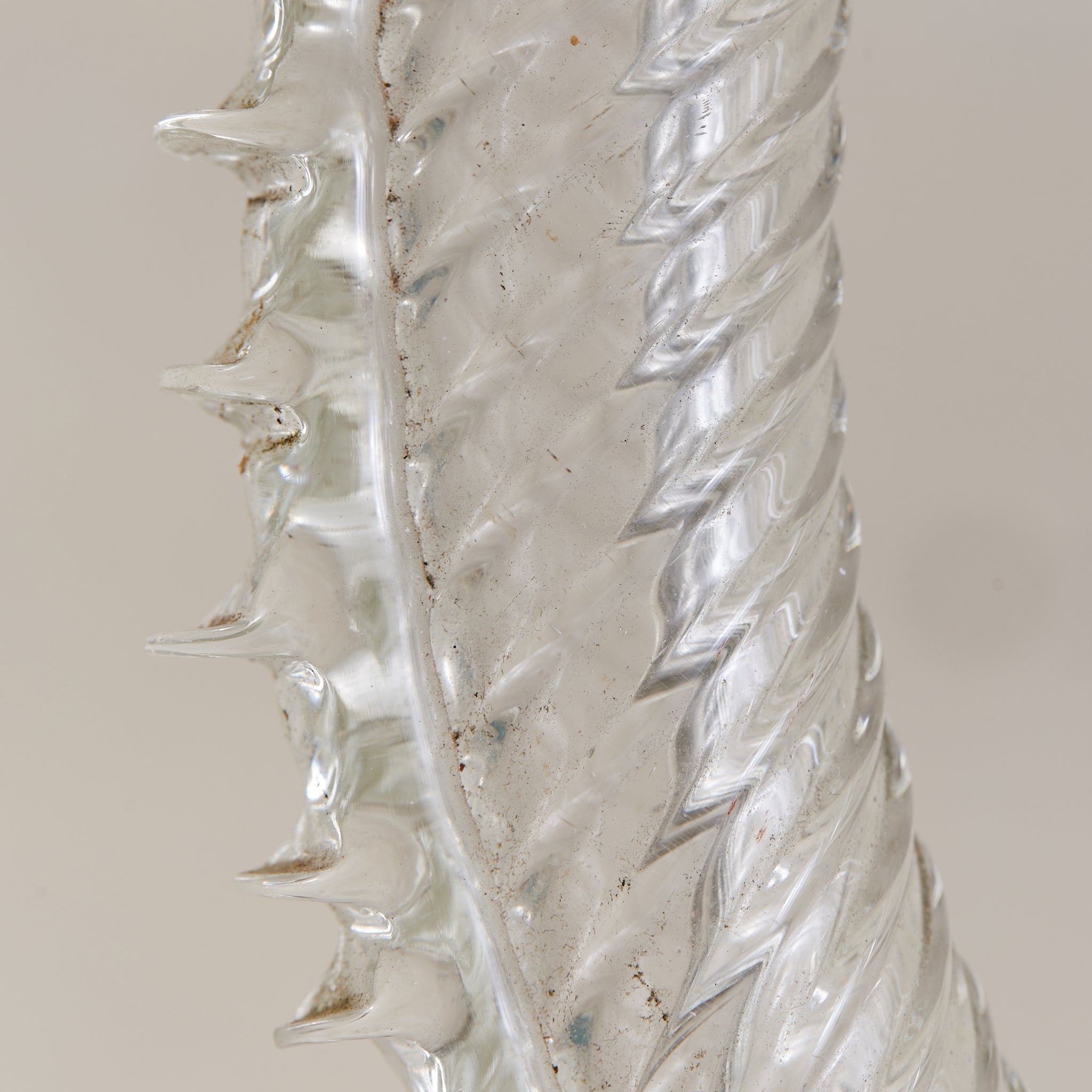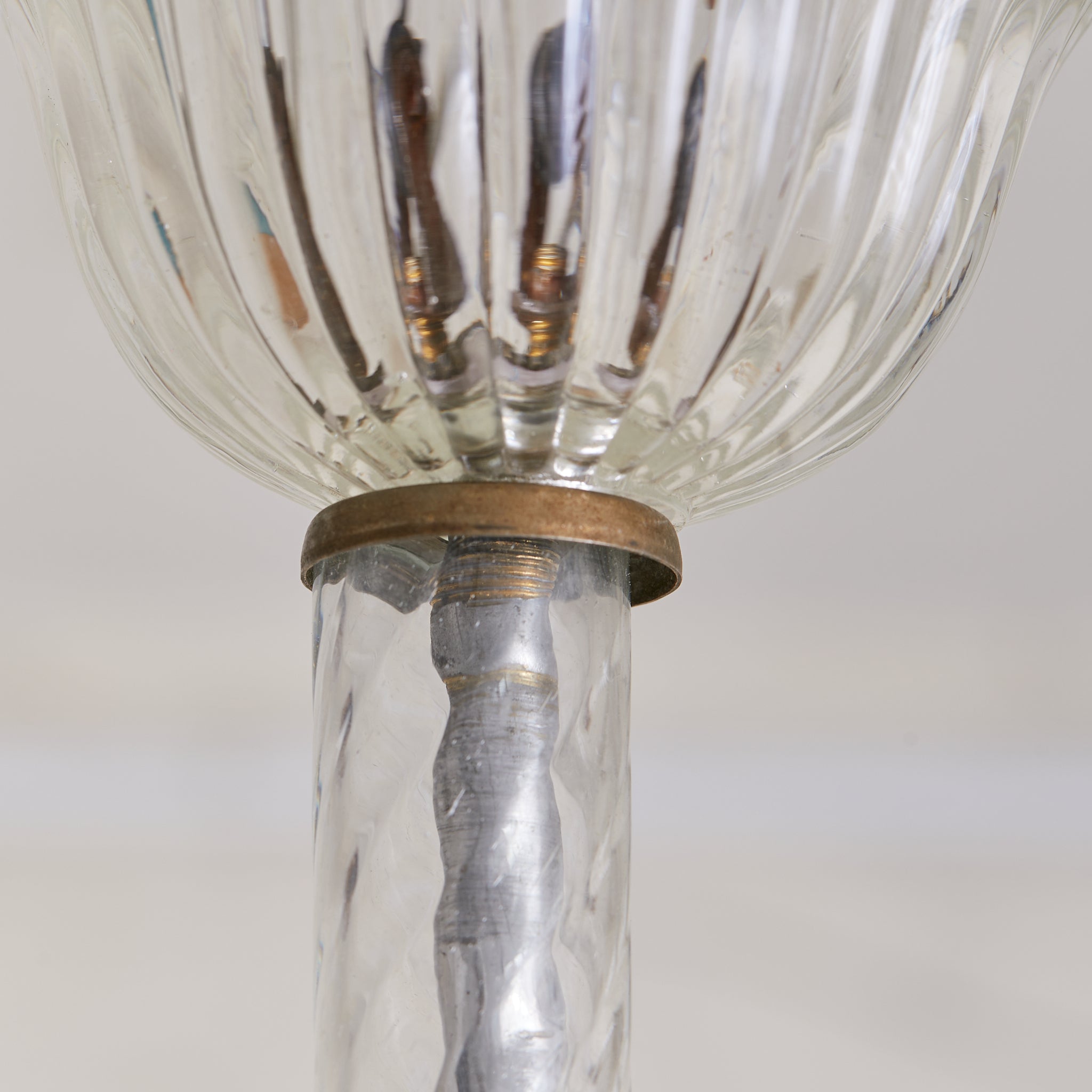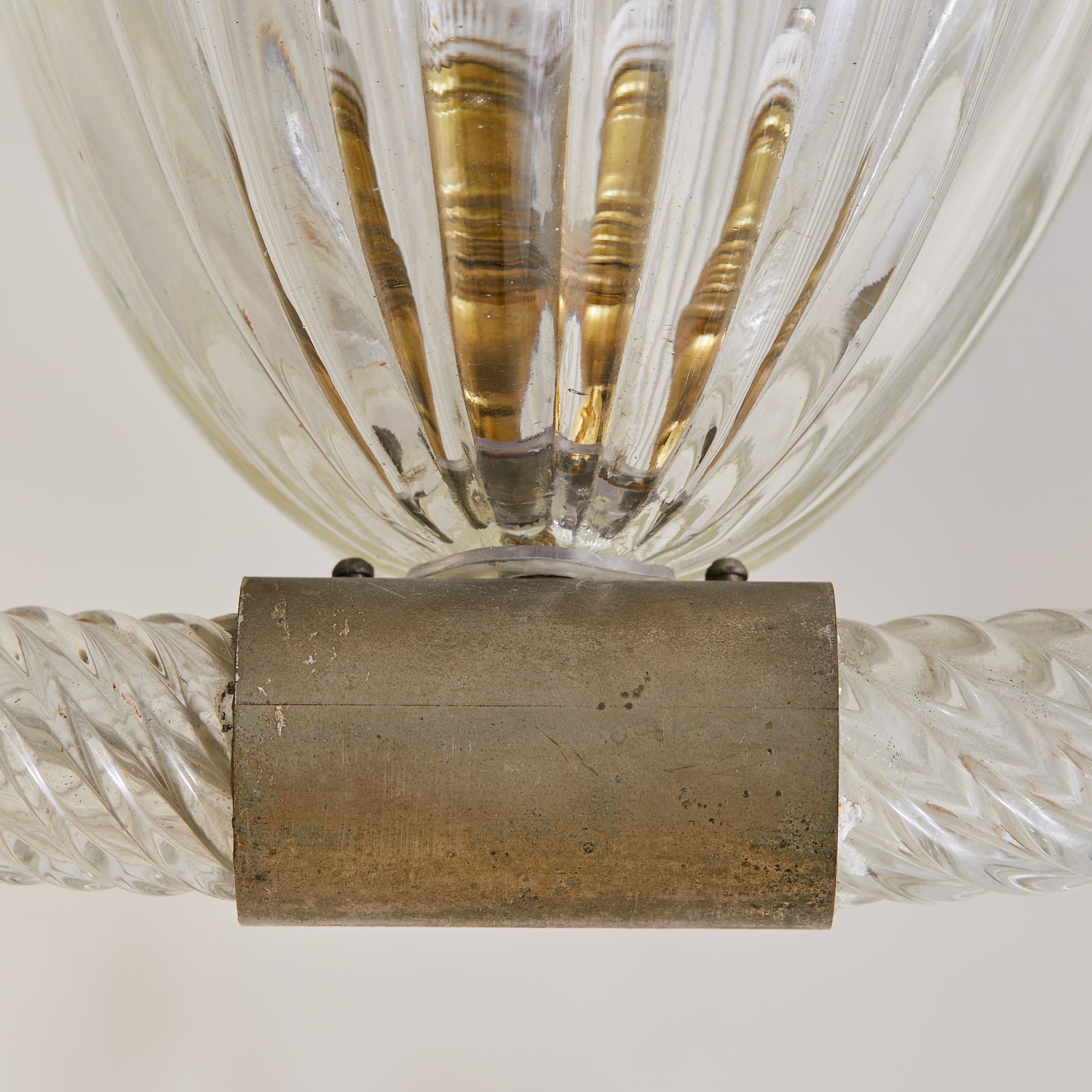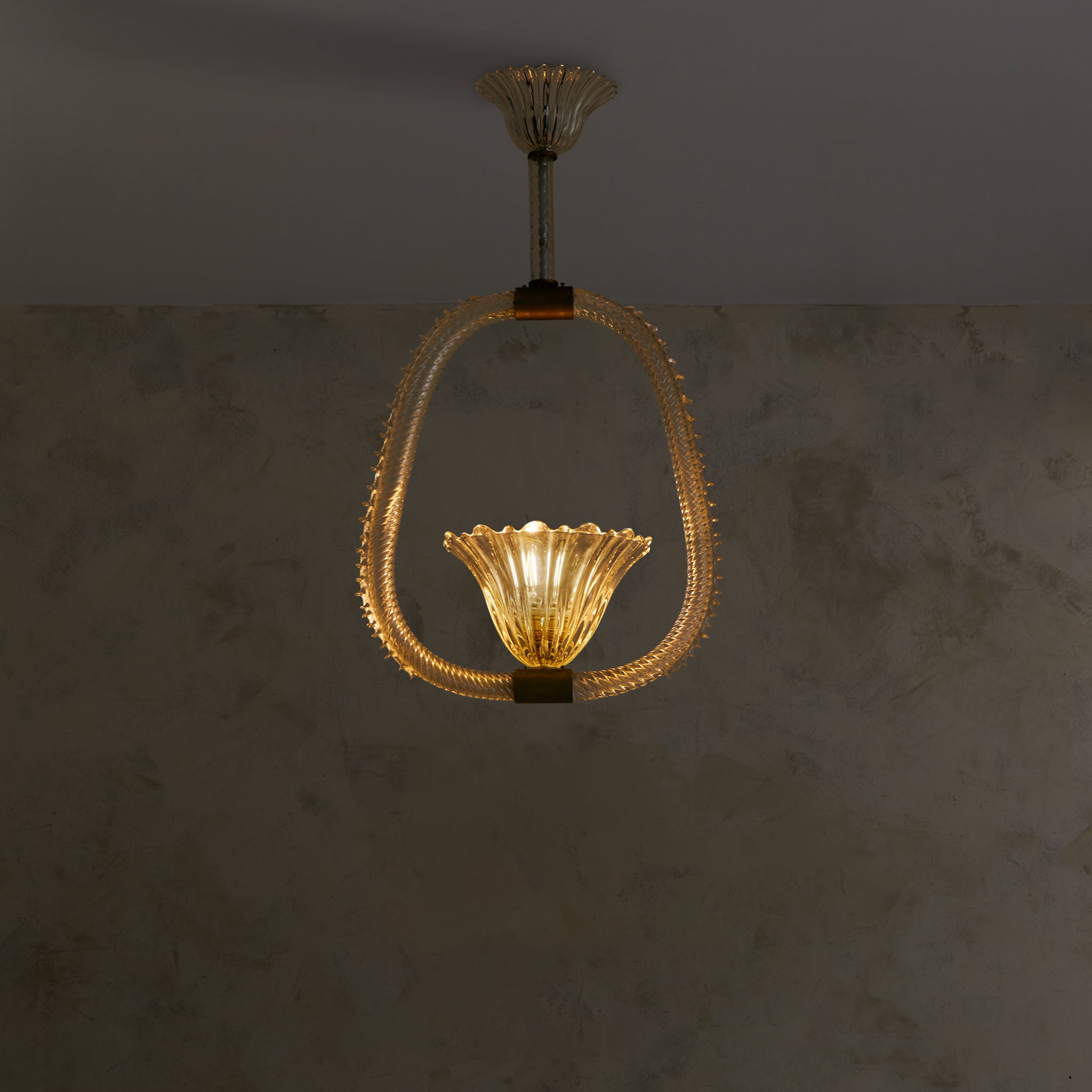 A rare Art Deco Murano glass pendant attributed to the esteemed Barovier & Toso atelier in the 1930s. The ruffled shade, crafted from clear, textured glass, glistens like frozen lace—its organic, rippling form shaped entirely by hand. Framed by a gracefully twisted glass loop and suspended from a twisted brass stem with a matching glass canopy, this piece emits a luminous, ambient warmth that feels both ethereal and inviting.