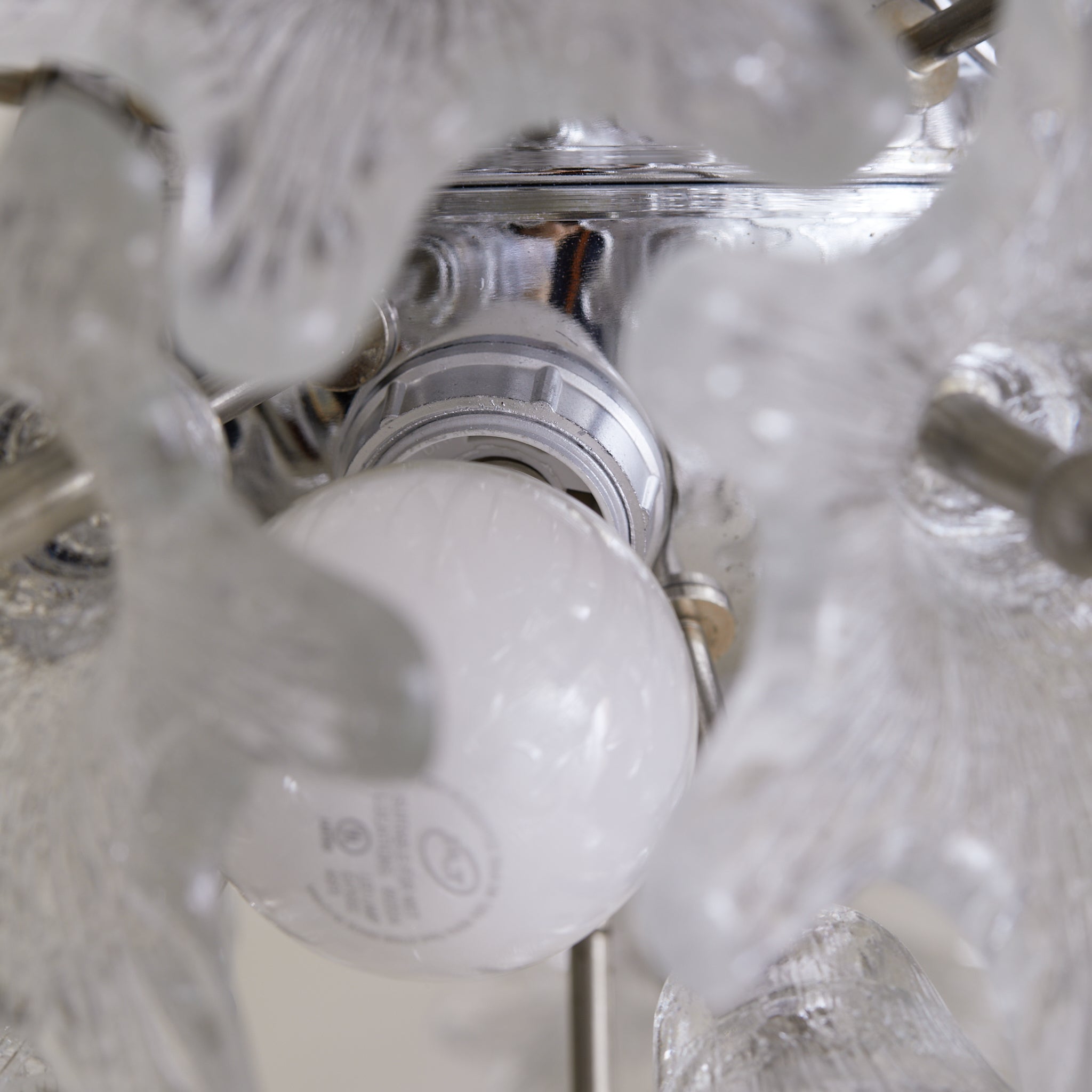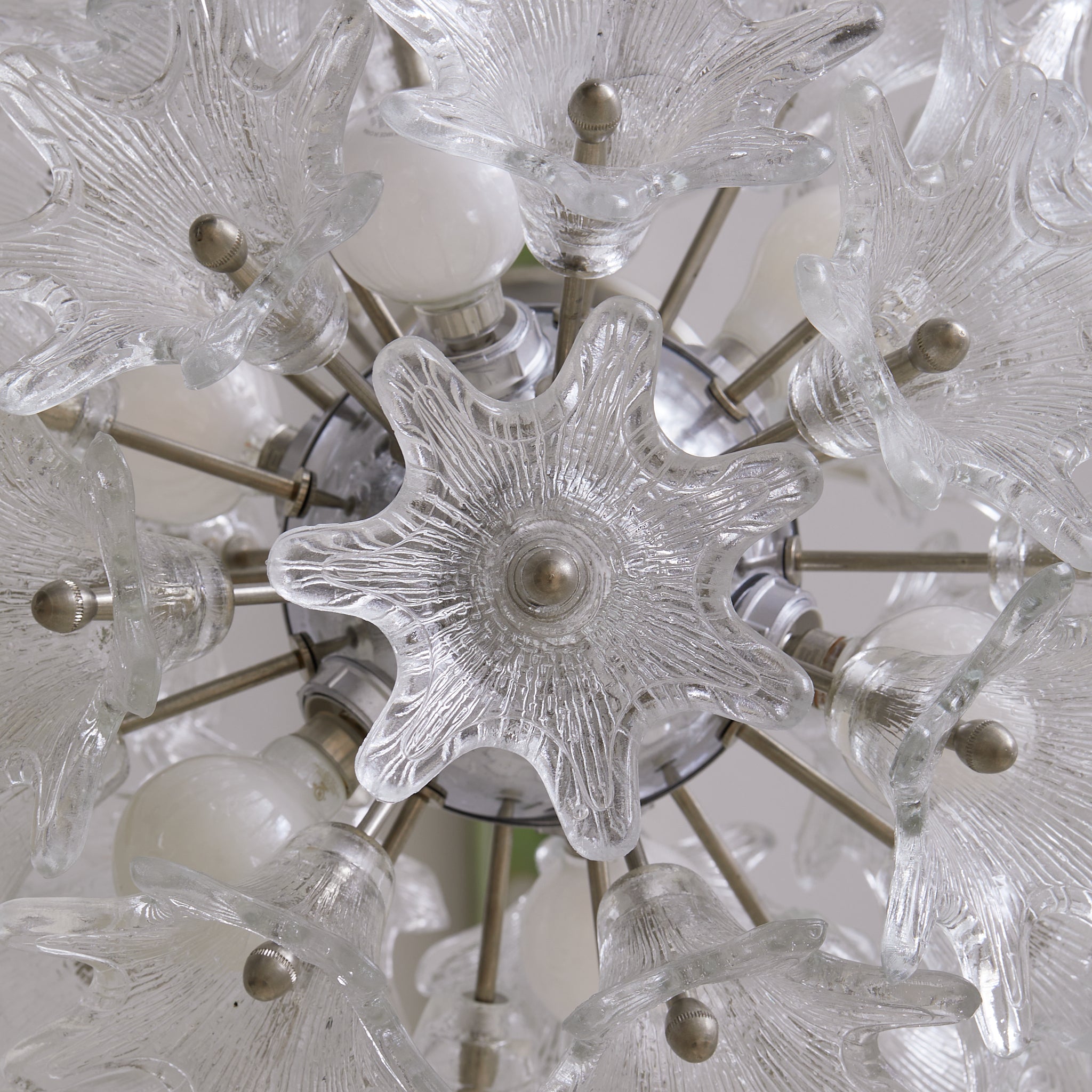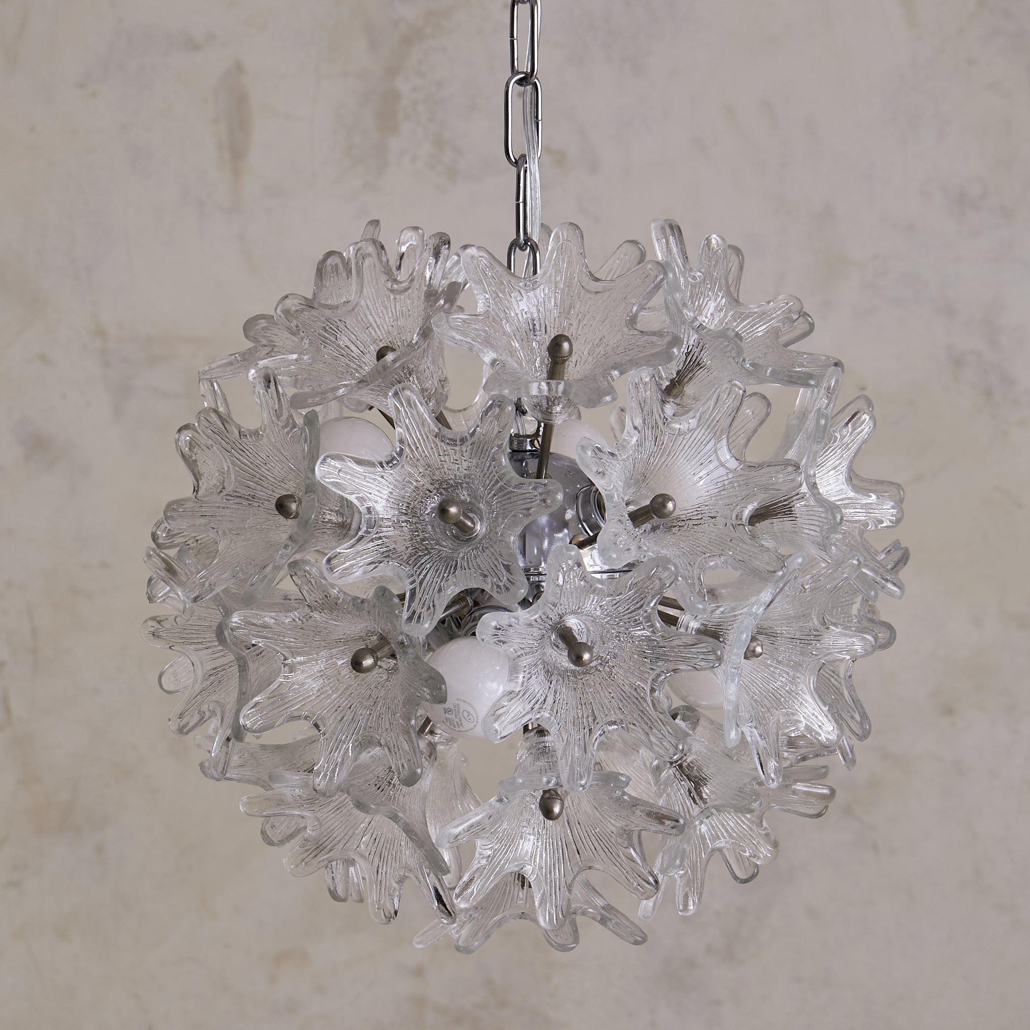 A blooming sputnik from 1960s Italy, attributed to Paolo Venini for VeArt. Murano glass flowers extend from a central chrome structure, the tubular rods tipped with petals hand-pressed in fine striations that catch and scatter the light.