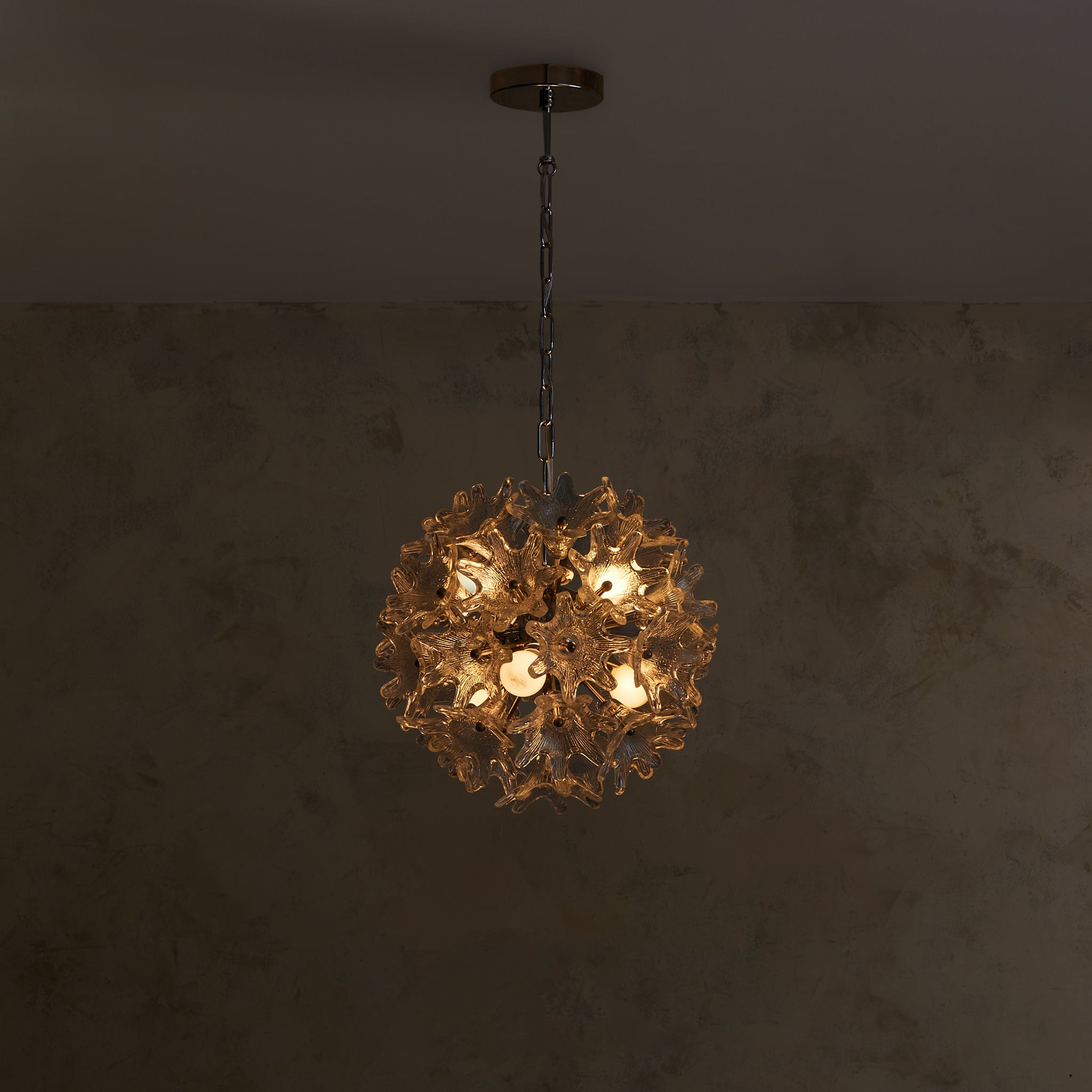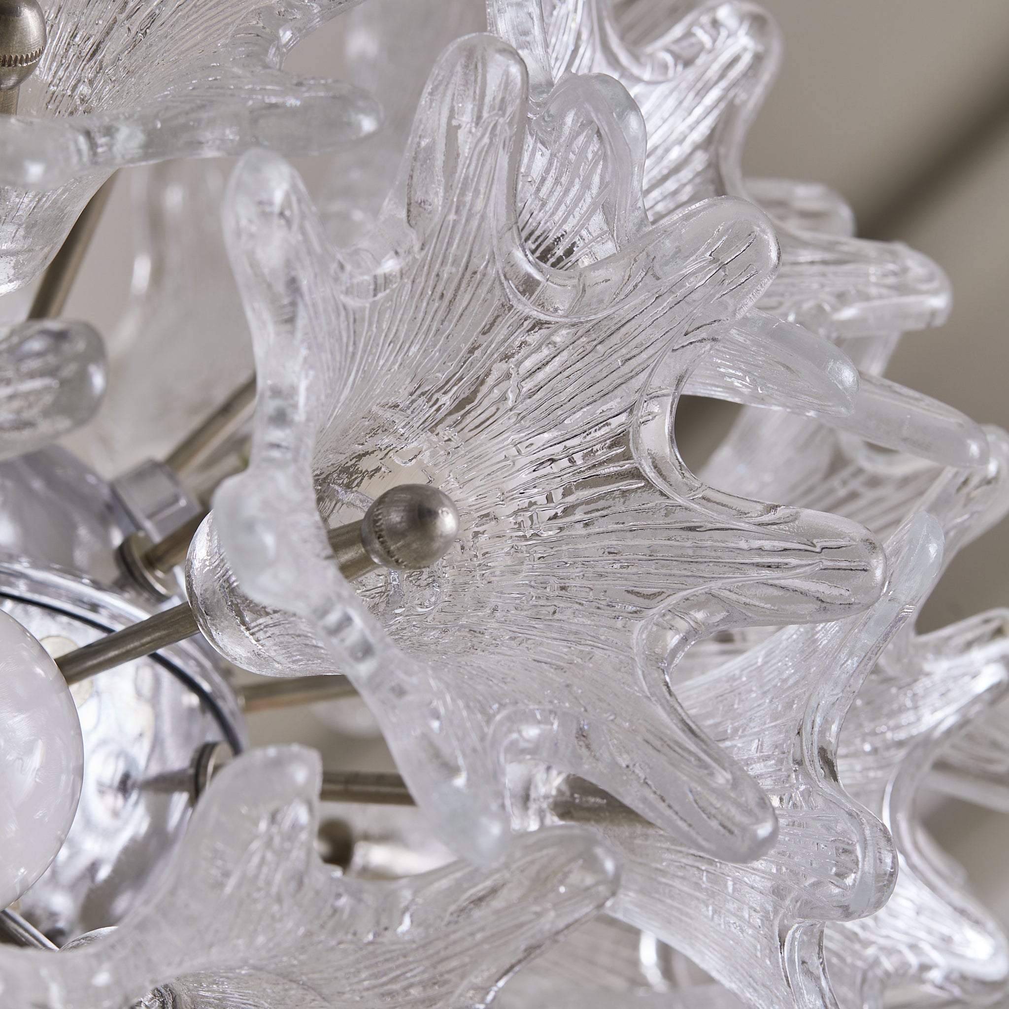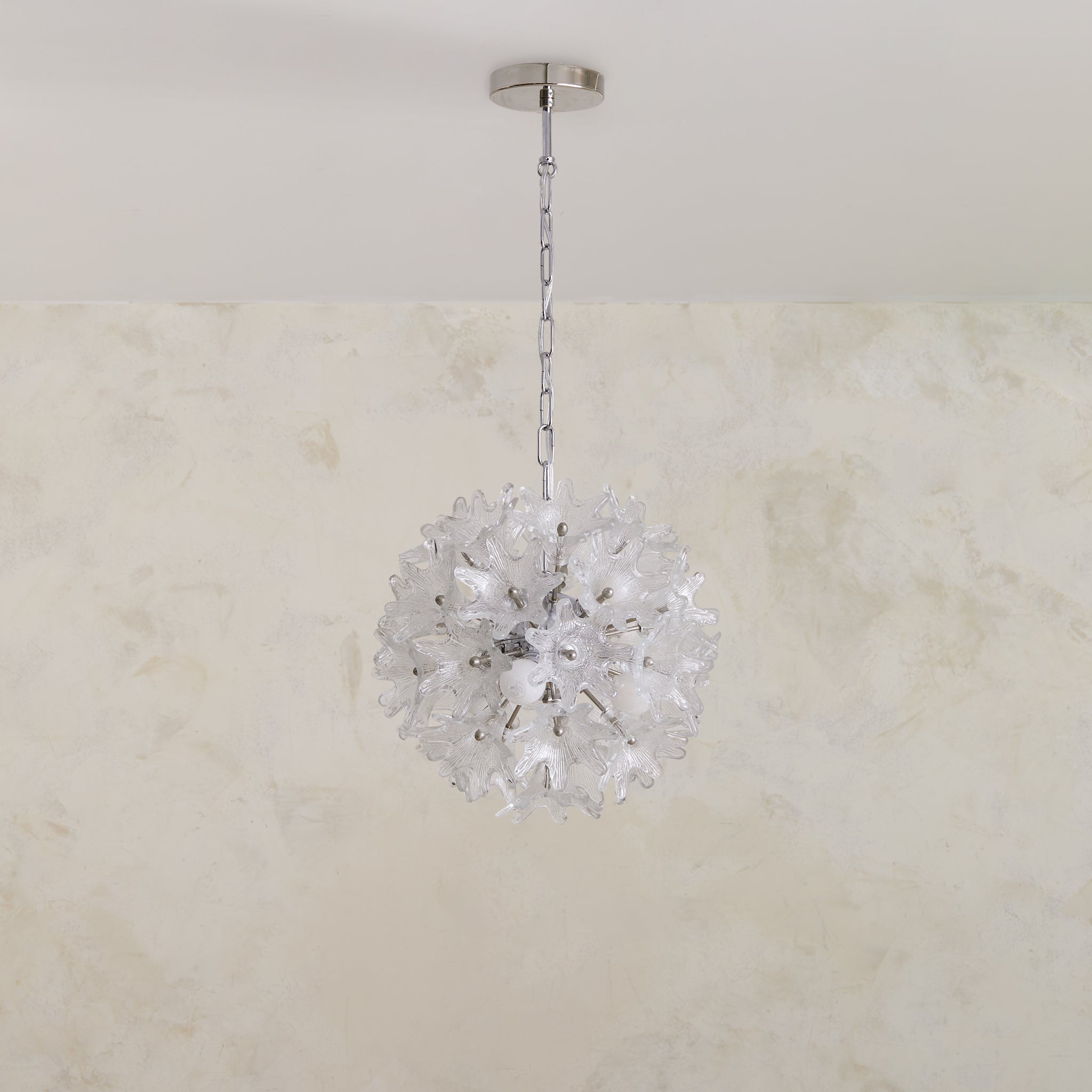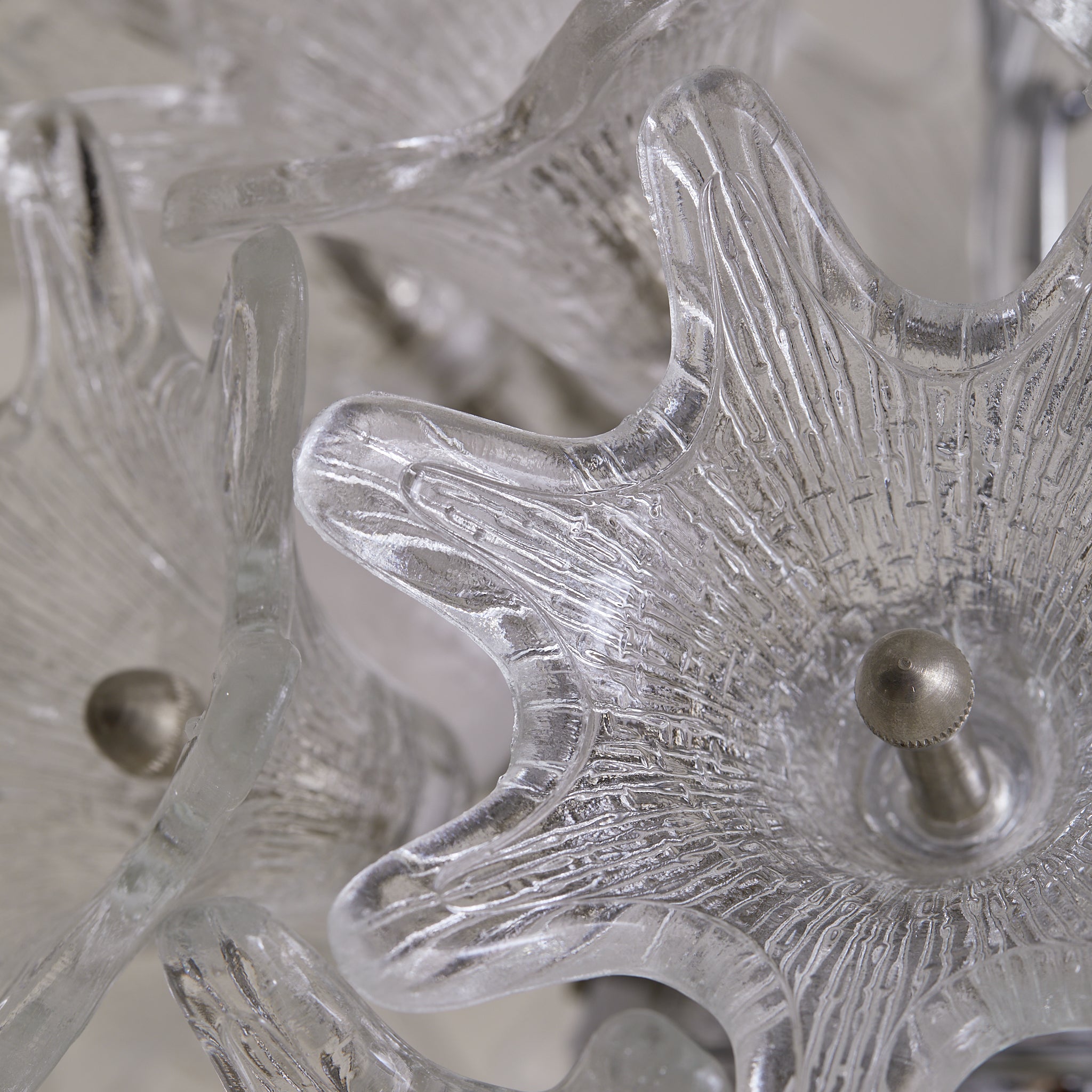 A blooming sputnik from 1960s Italy, attributed to Paolo Venini for VeArt. Murano glass flowers extend from a central chrome structure, the tubular rods tipped with petals hand-pressed in fine striations that catch and scatter the light.