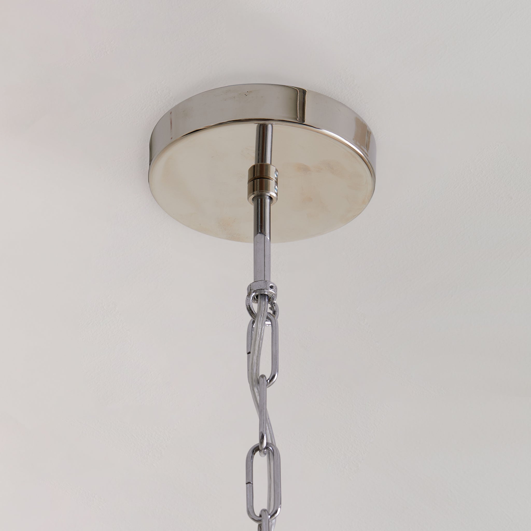 Suspended from its matching chain and canopy, it glows warmly when lit—equally at home over a dining table or in an entry.
