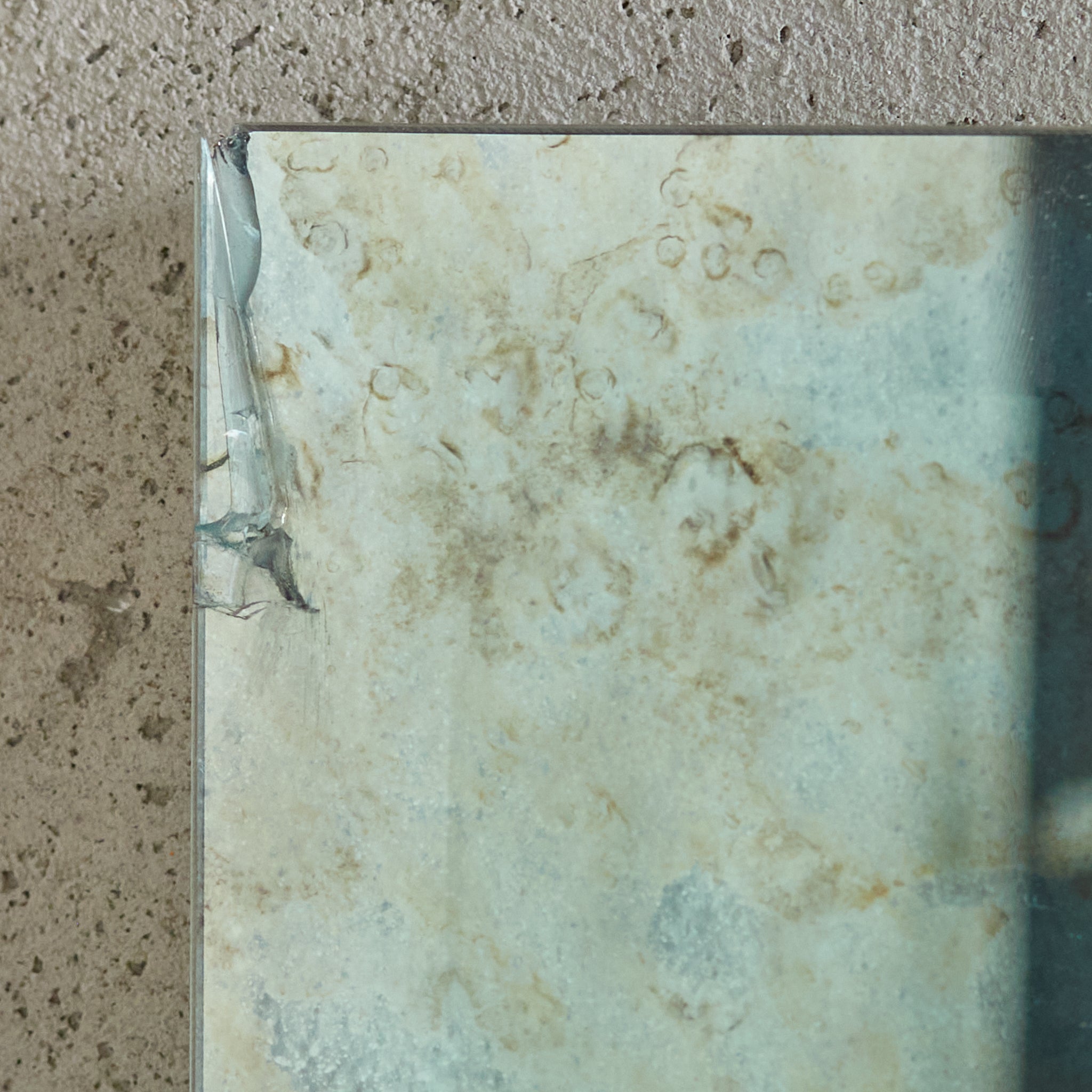 A 1970s Italian rectangular wall mirror framed with panels of exquisite aqua-tinted Murano glass. Four sculptural hooks appear to float upon the mirror, allowing the piece to double as a coat rack. A striking statement for an entryway, it embodies Italian artistry and utility.
