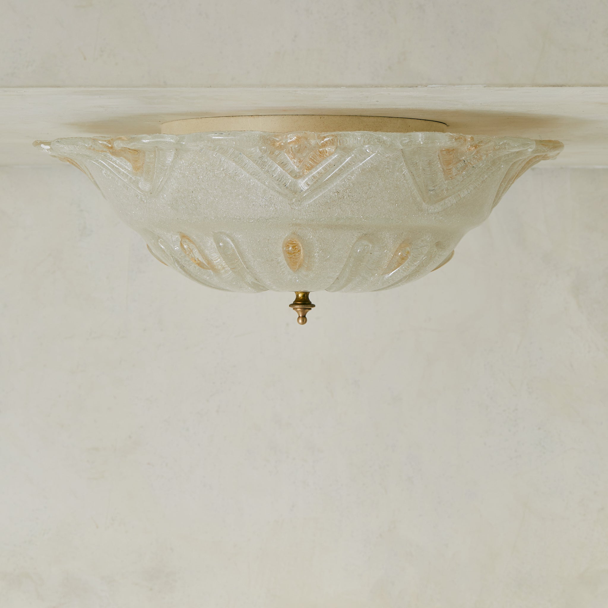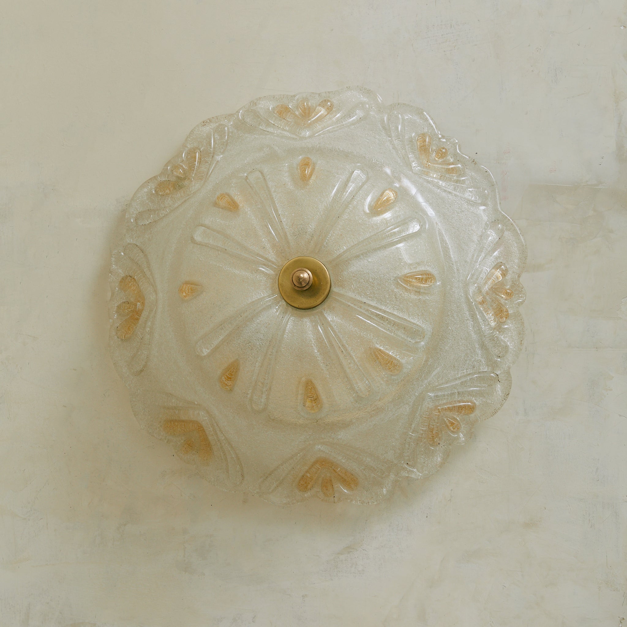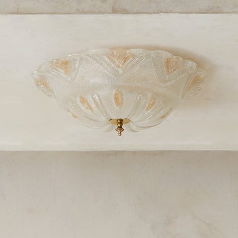 Mouth-blown in clear Murano glass with warm gold highlights, this Italian flush mount dates to the 1970s. Its textured surface was achieved using the Rugiadoso technique—fine particles scattered across the interior to create a misted, crystalline effect. The form is richly dimensional, with scalloped edges and radiating patterns that catch the light in layered relief. A warm brass finial anchors the base.